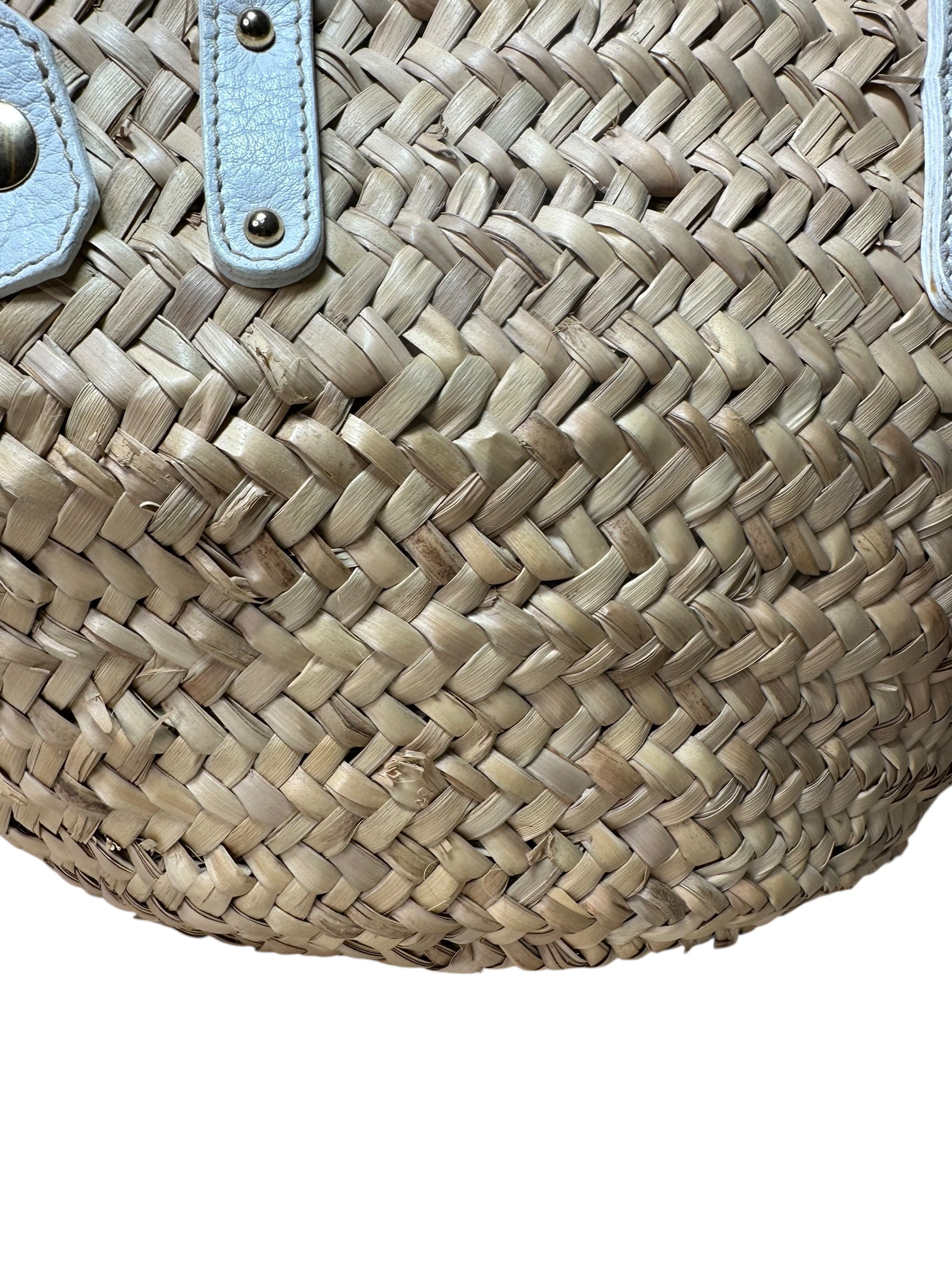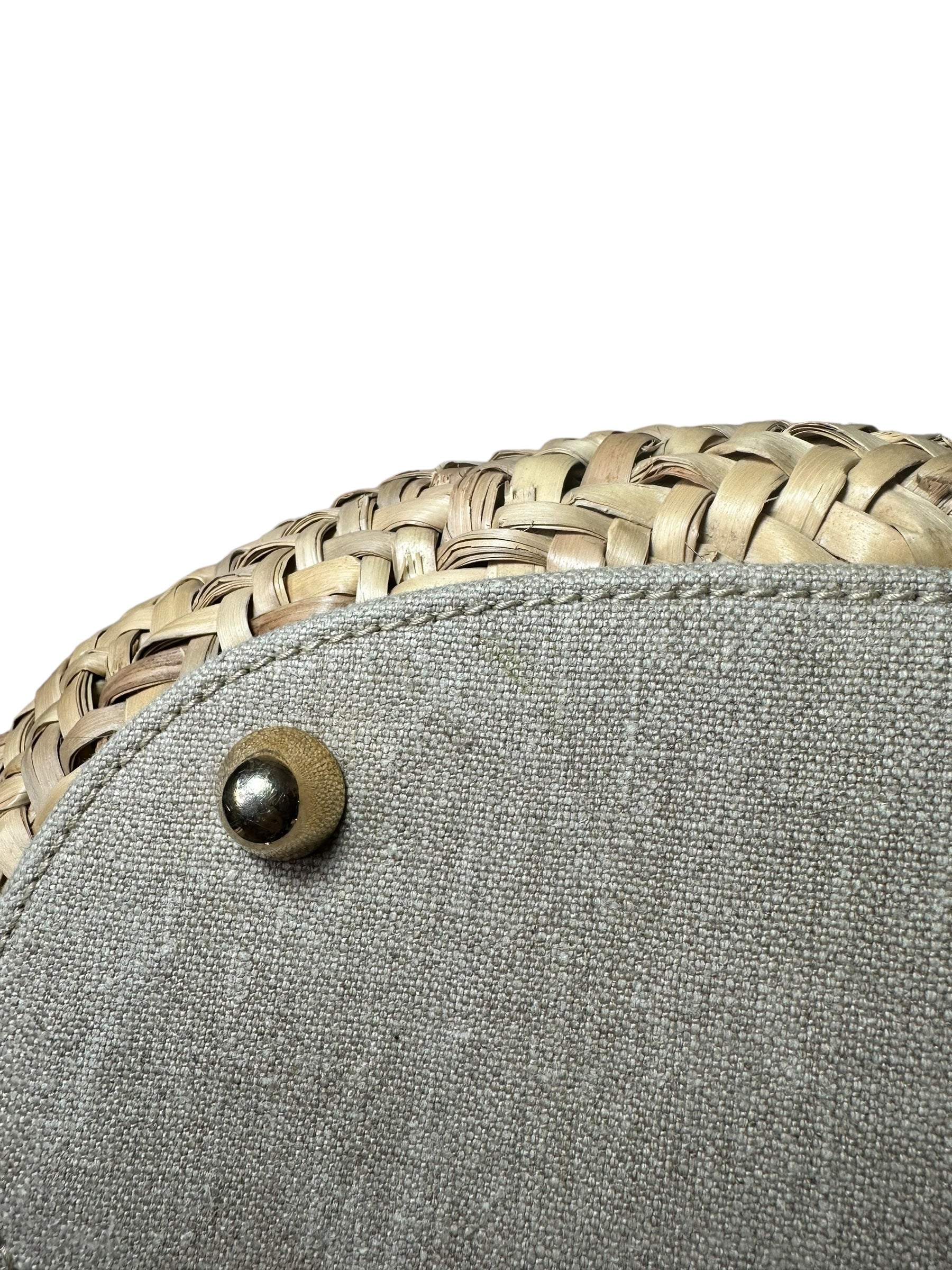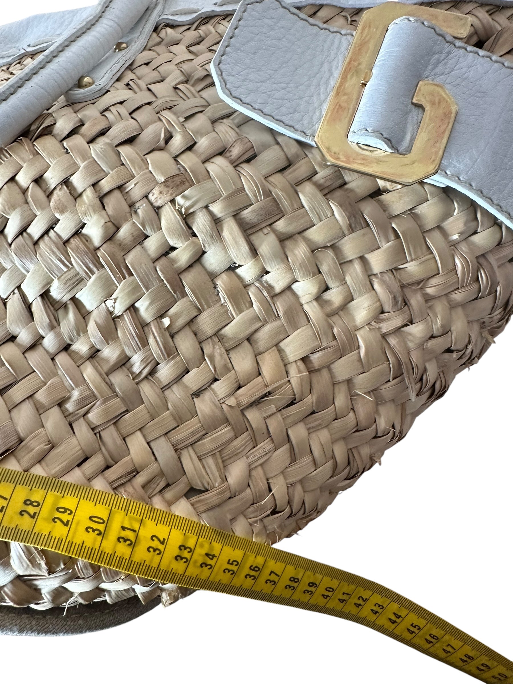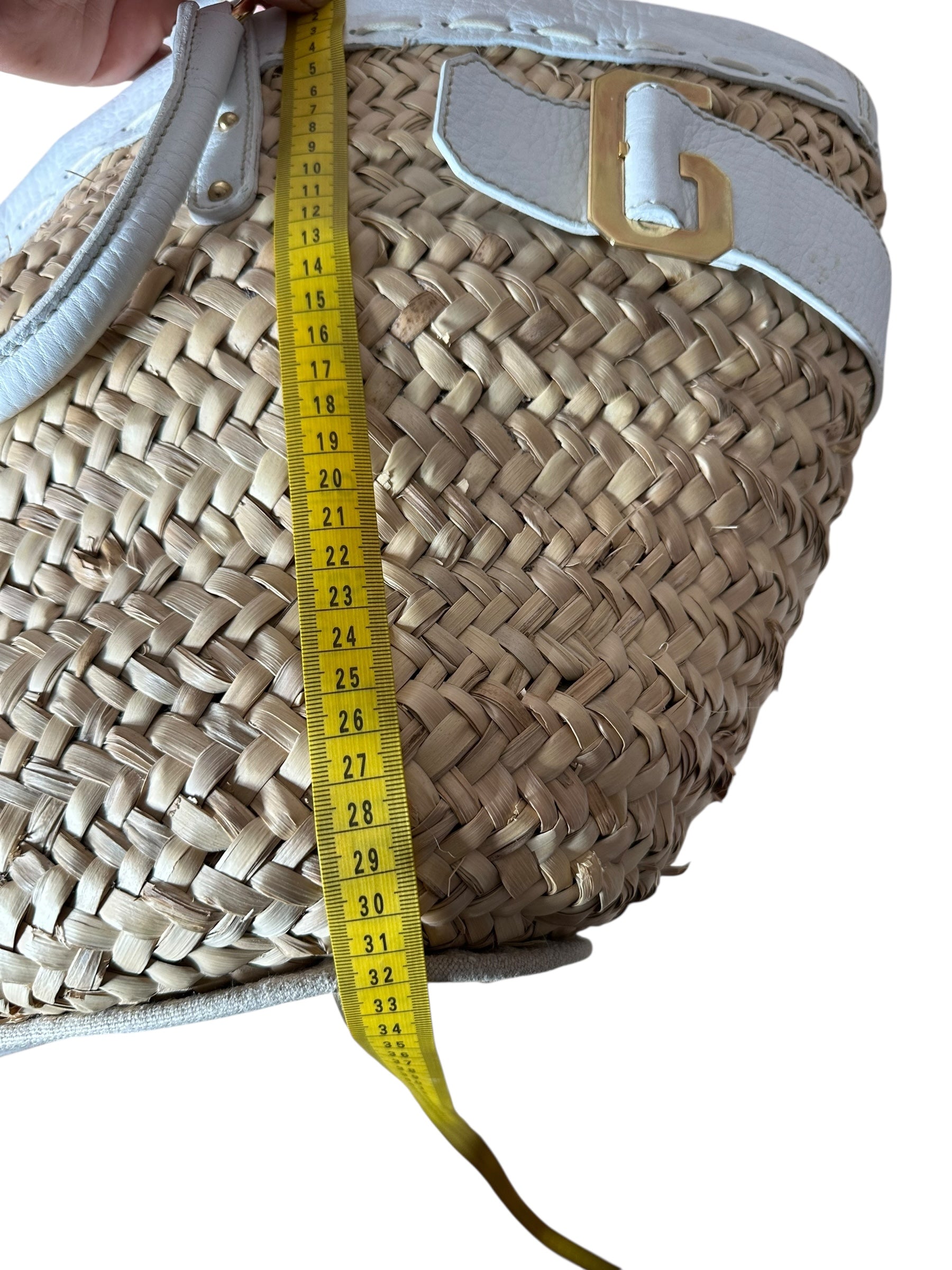 - Materiali: corpo in raffia intrecciata, inserti e manici in pelle bianca, fodera interna in tessuto stampato.