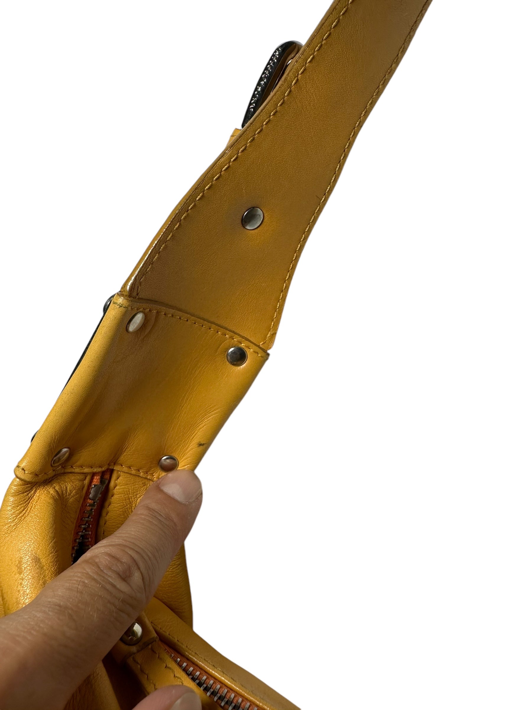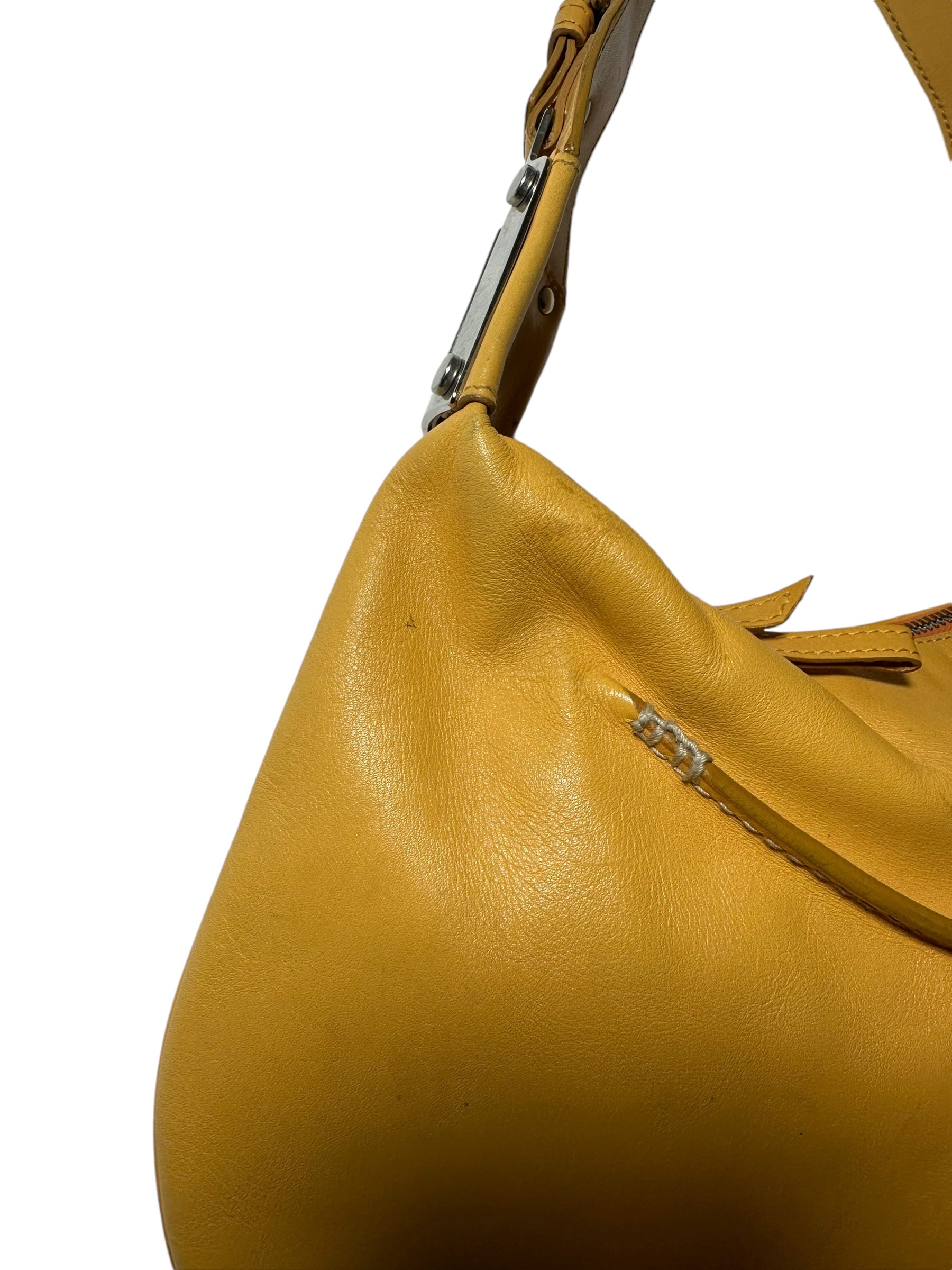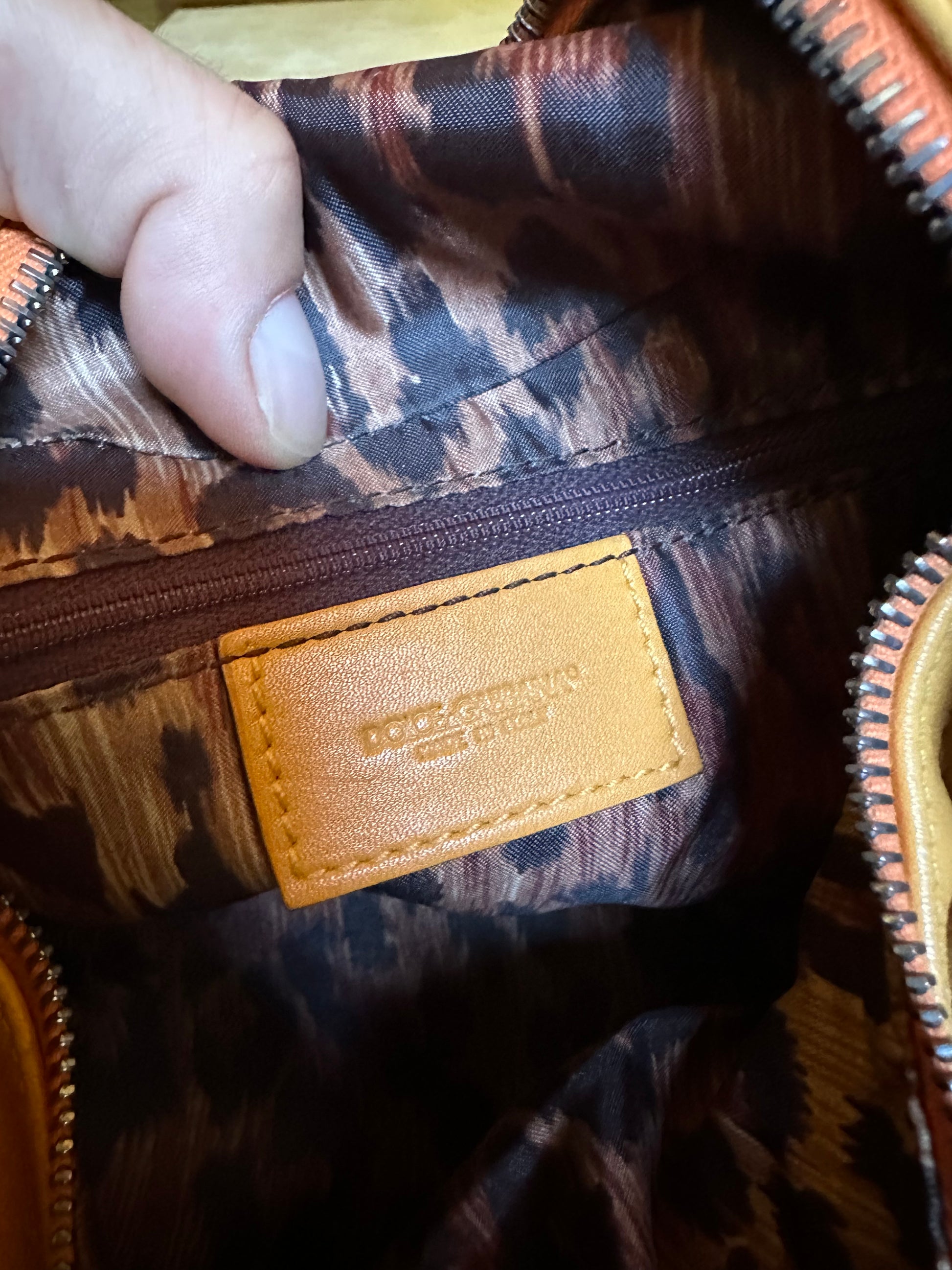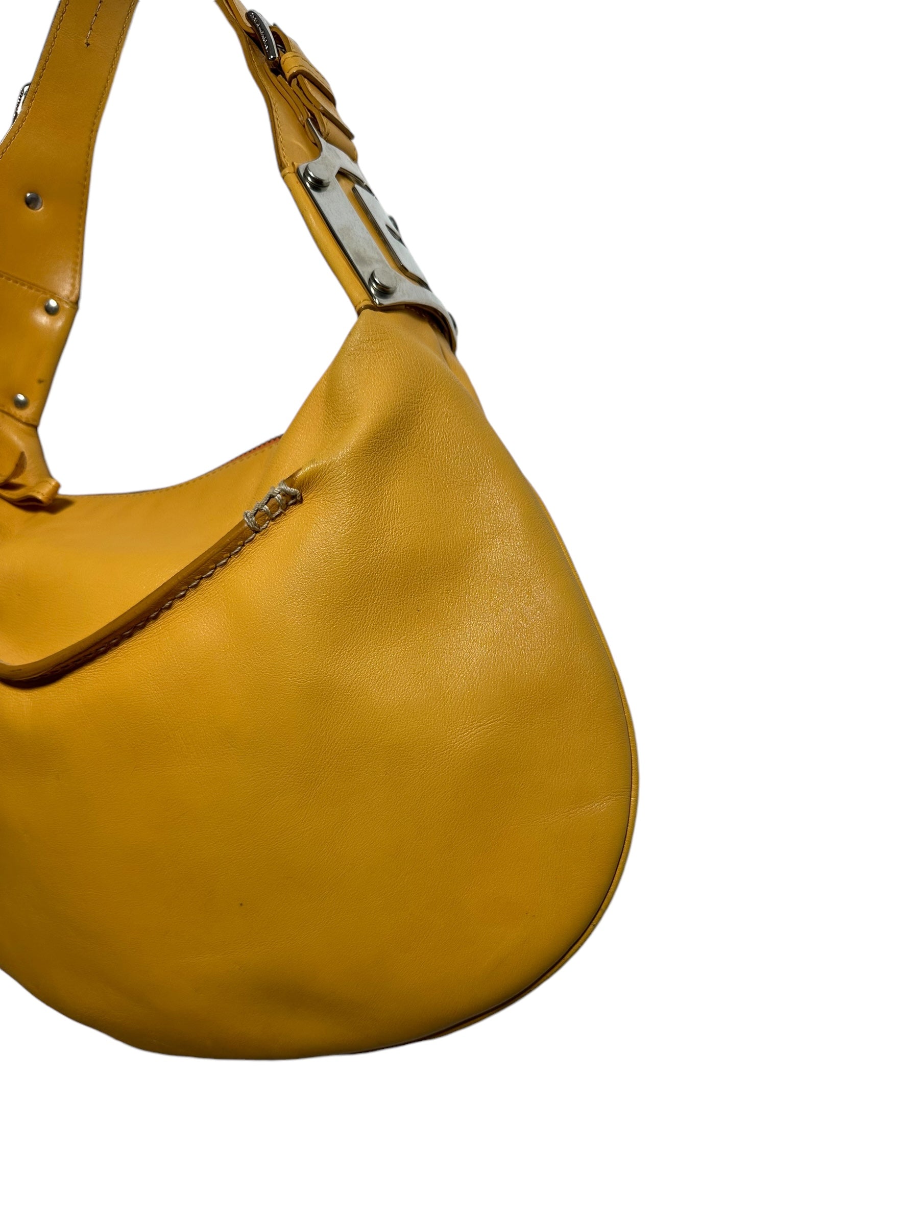 Dolce & Gabbana borsa vintage in pelle giallo ocra con cucitura in rilievo nelle parti superiori, manico morbido con inserti in metallo a logo e chiusura a zip. Interno foderato maculato. Presenta alcuni segni di usura visibili in foto, non viene spedita con dust bag originale.