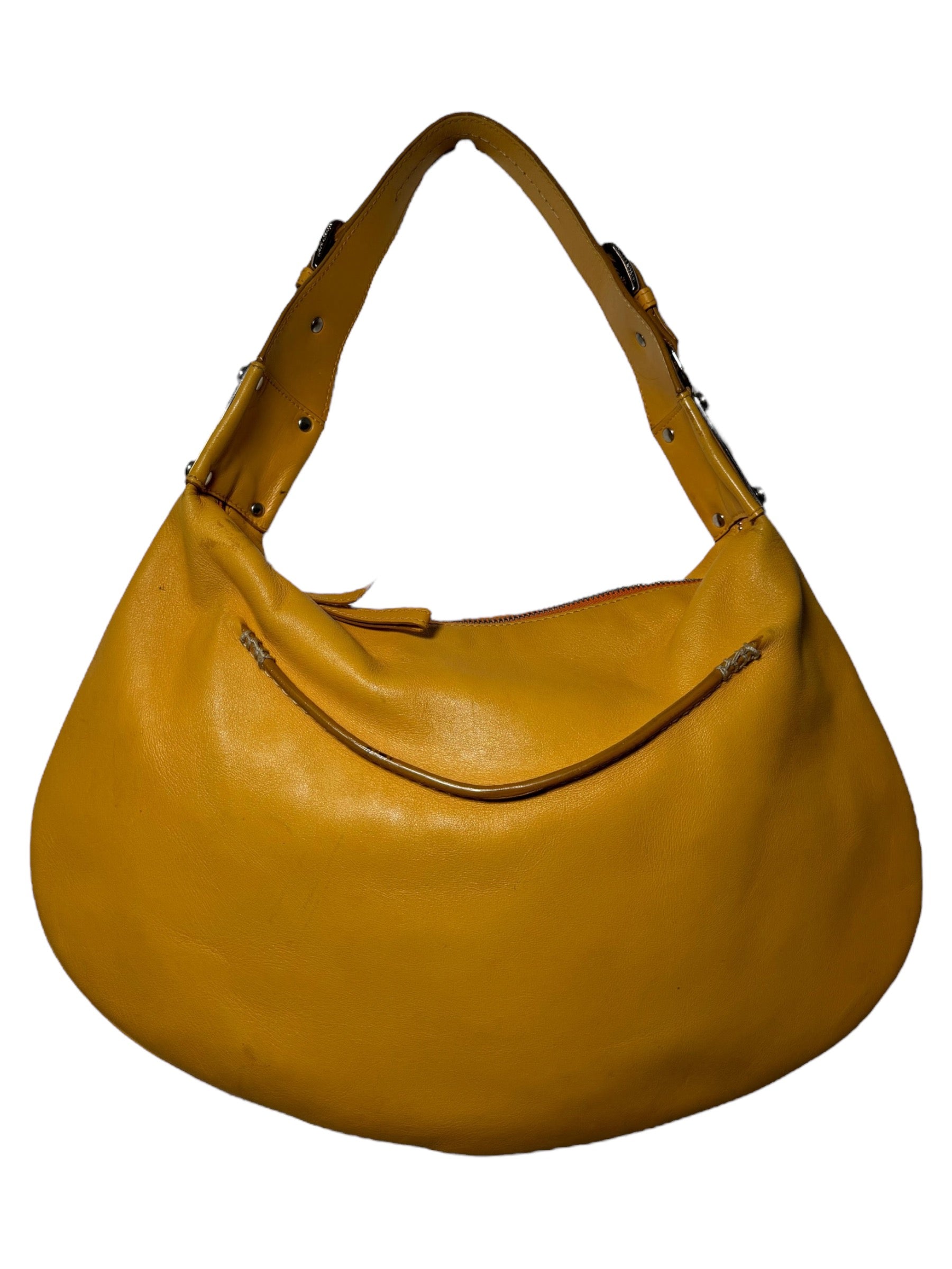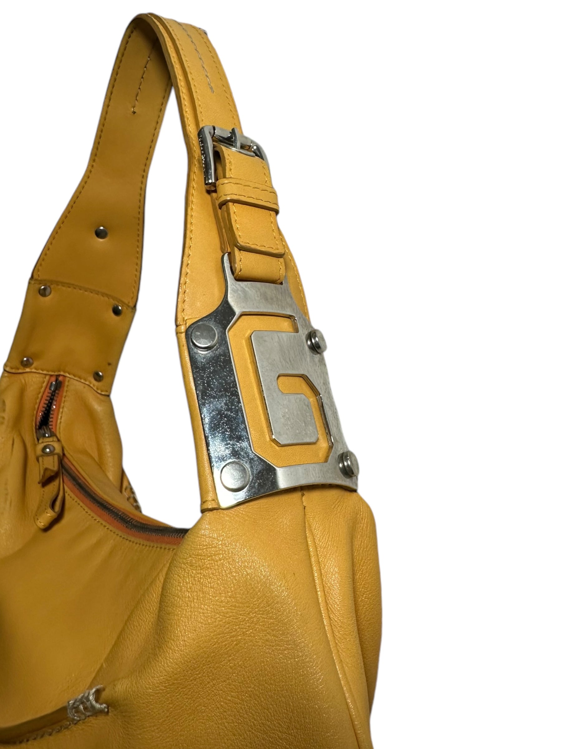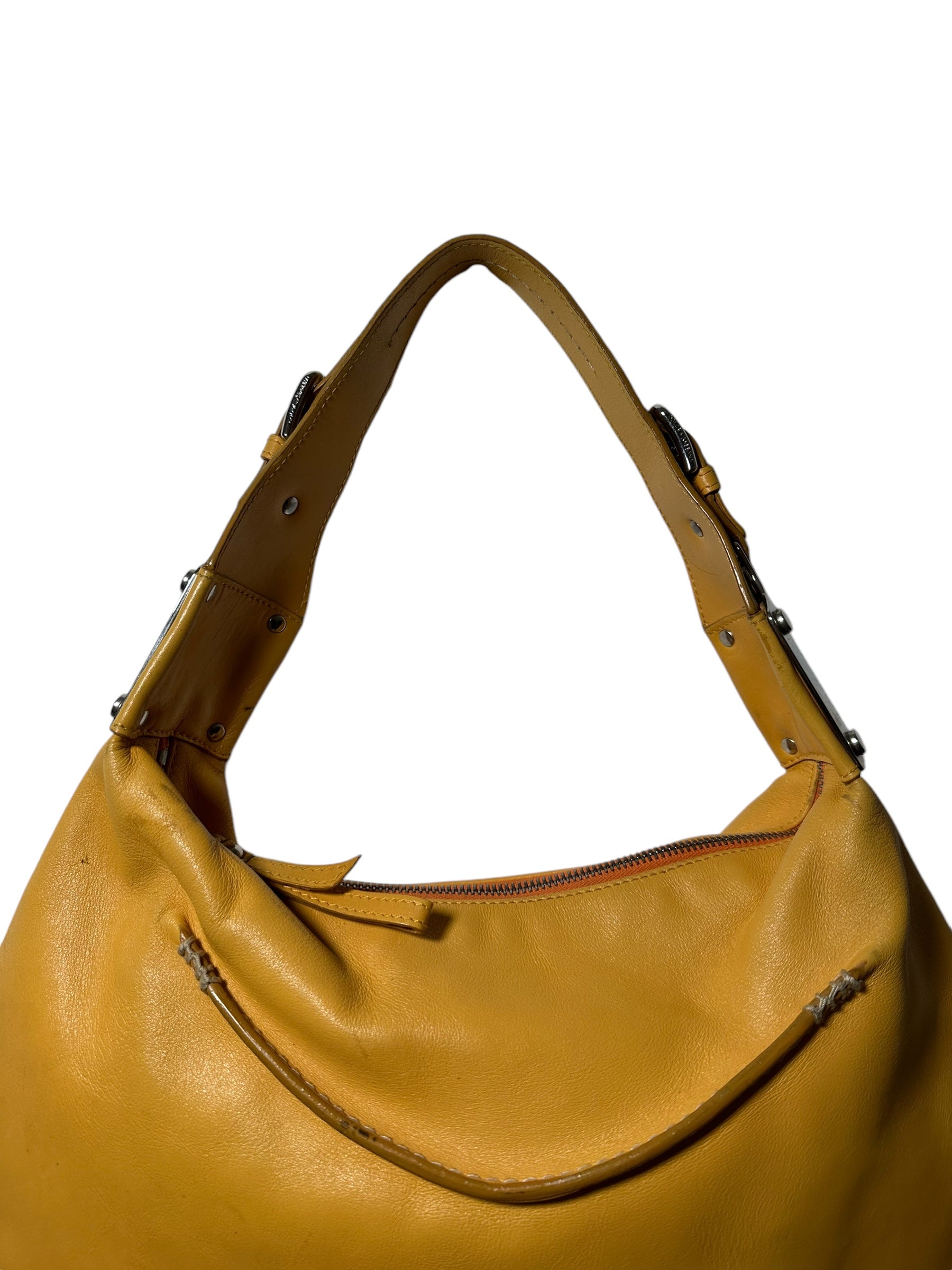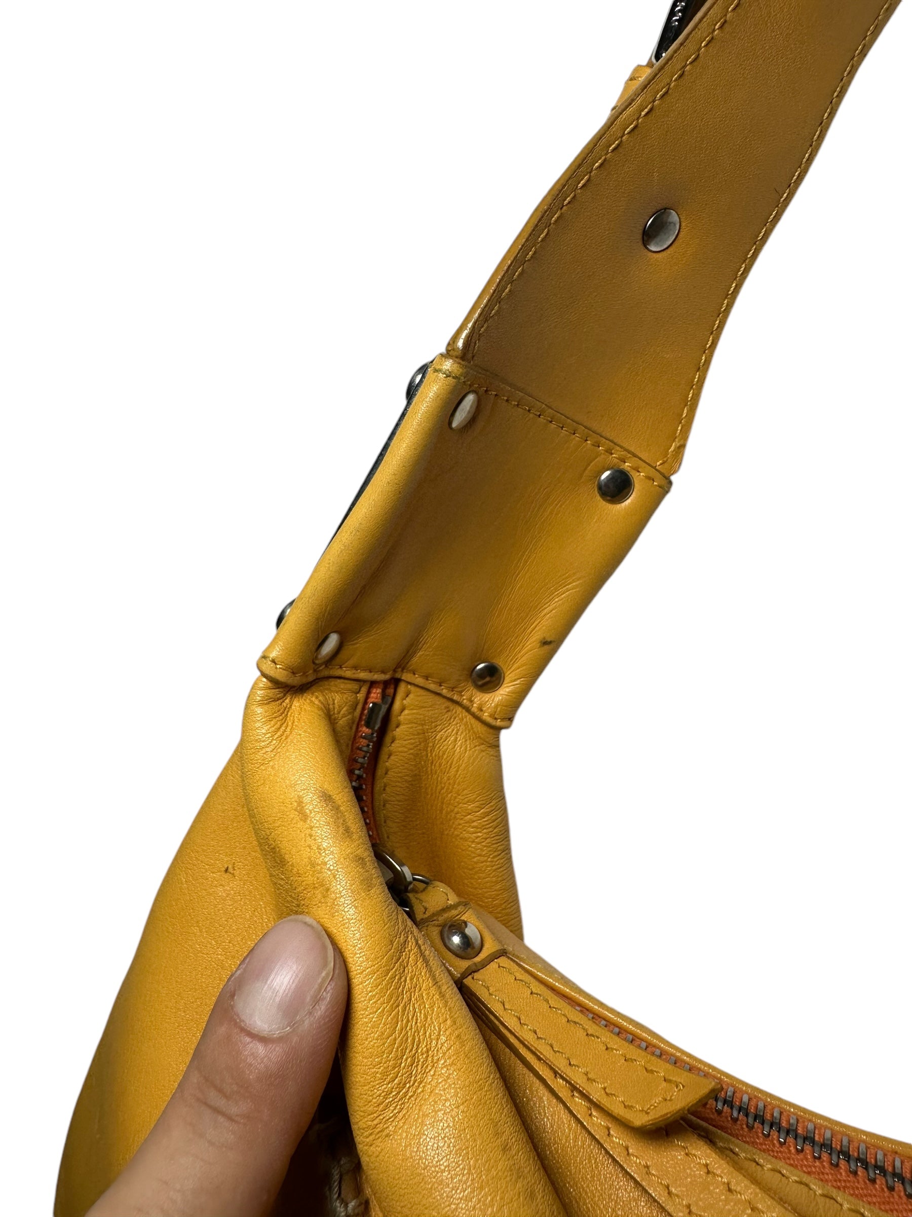 Dolce & Gabbana borsa vintage in pelle giallo ocra con cucitura in rilievo nelle parti superiori, manico morbido con inserti in metallo a logo e chiusura a zip. Interno foderato maculato. Presenta alcuni segni di usura visibili in foto, non viene spedita con dust bag originale.