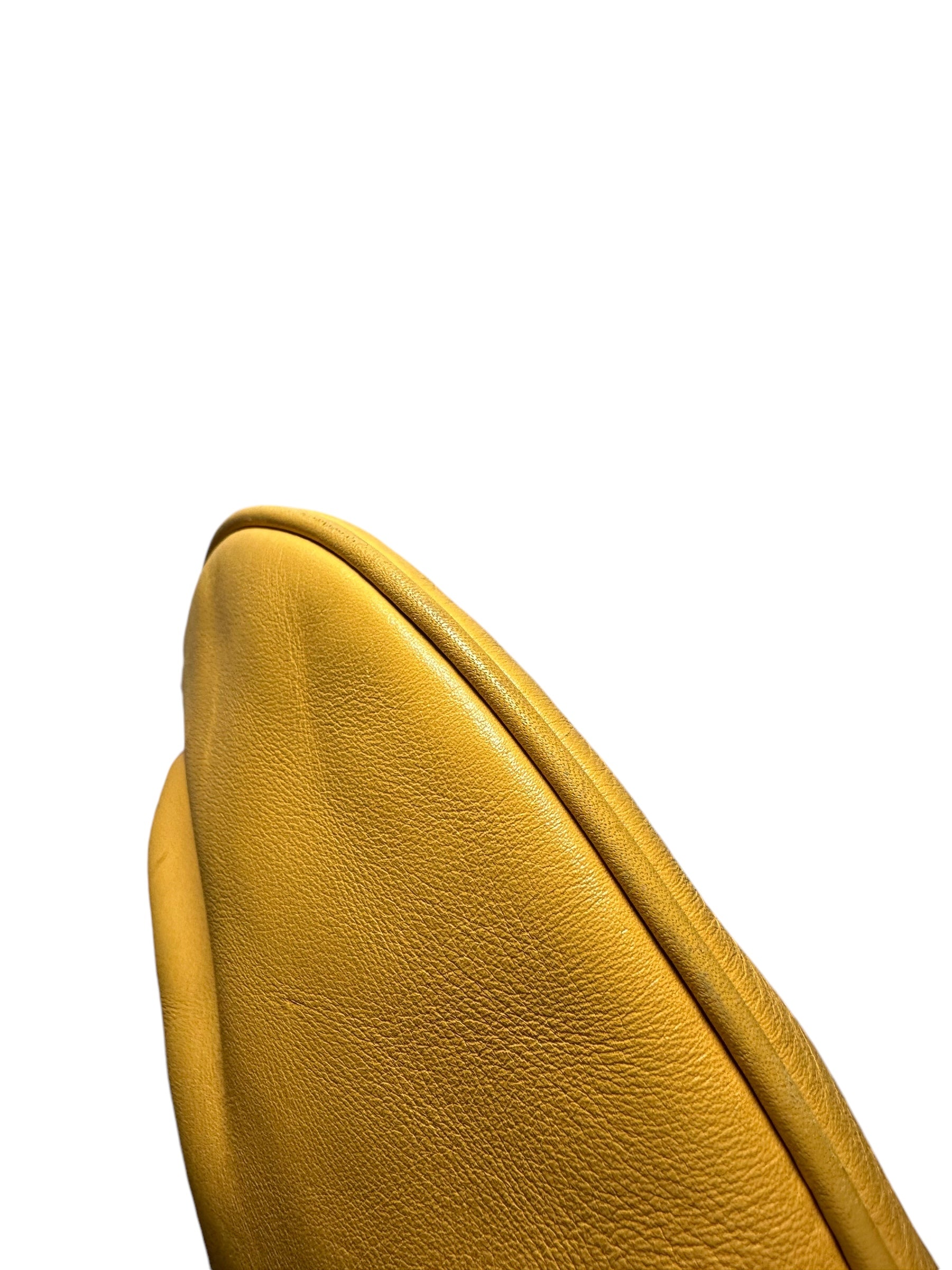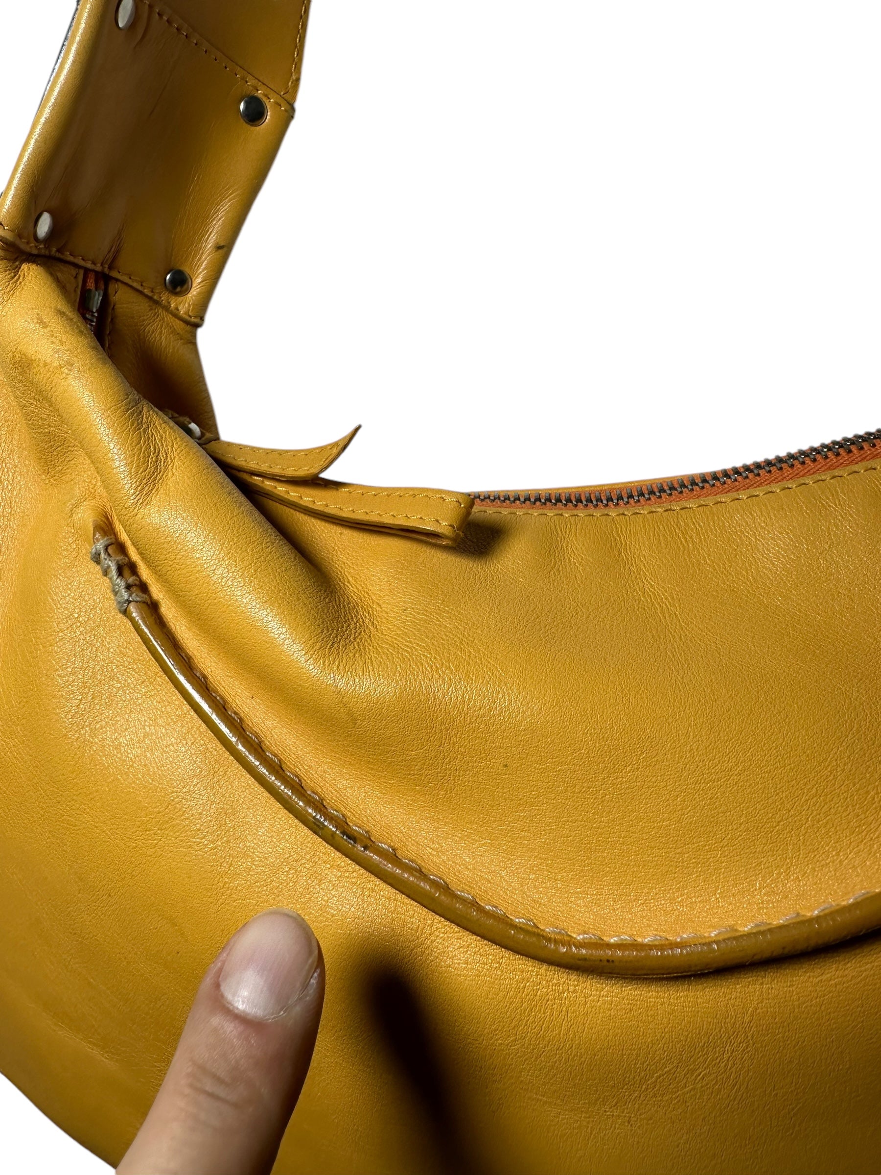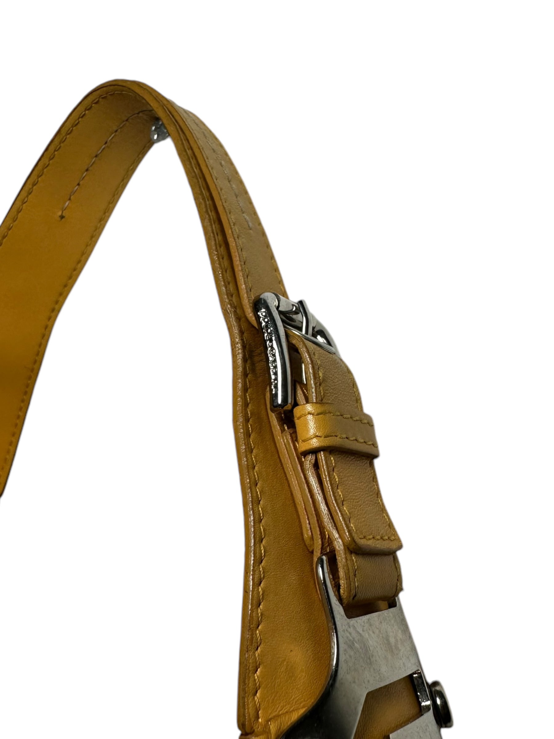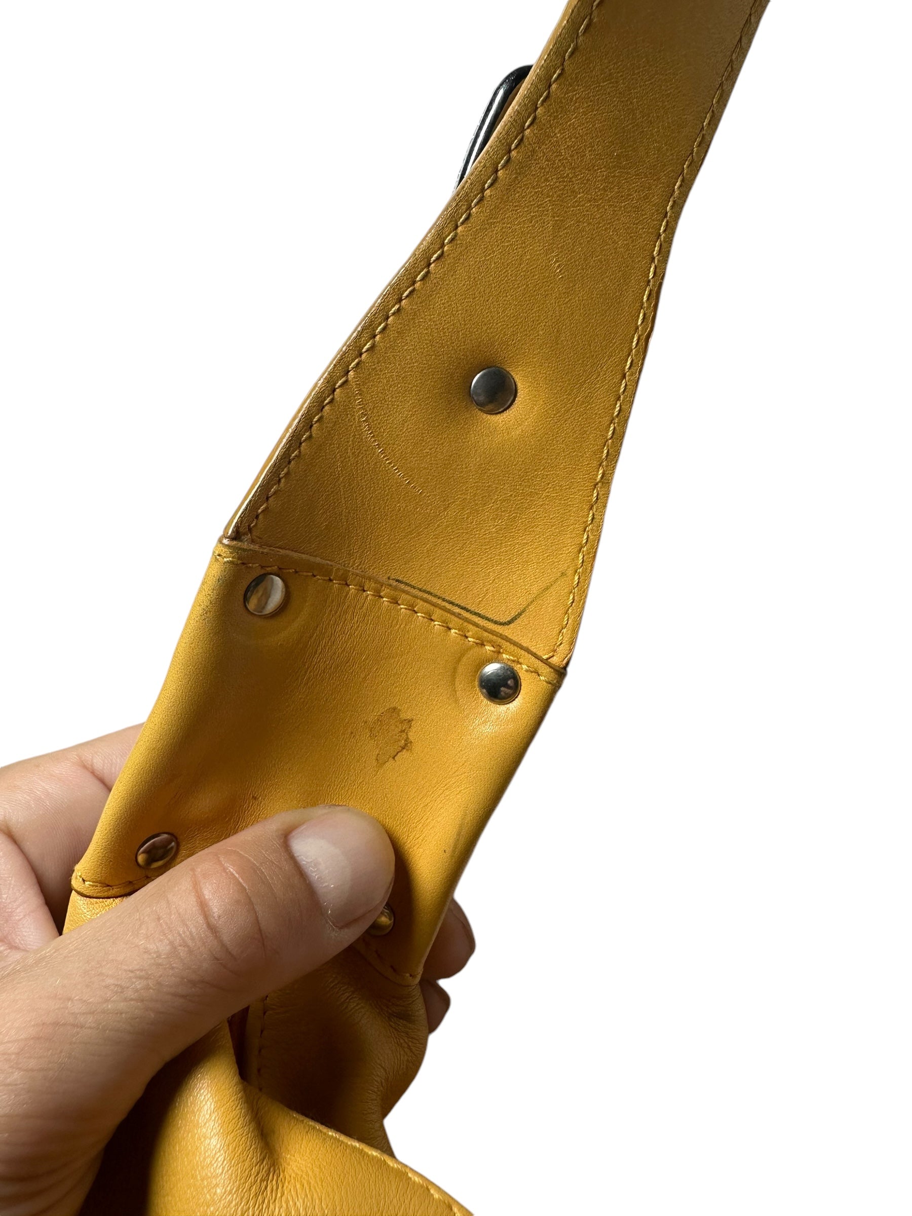 Dolce & Gabbana borsa vintage in pelle giallo ocra con cucitura in rilievo nelle parti superiori, manico morbido con inserti in metallo a logo e chiusura a zip. Interno foderato maculato. Presenta alcuni segni di usura visibili in foto, non viene spedita con dust bag originale.