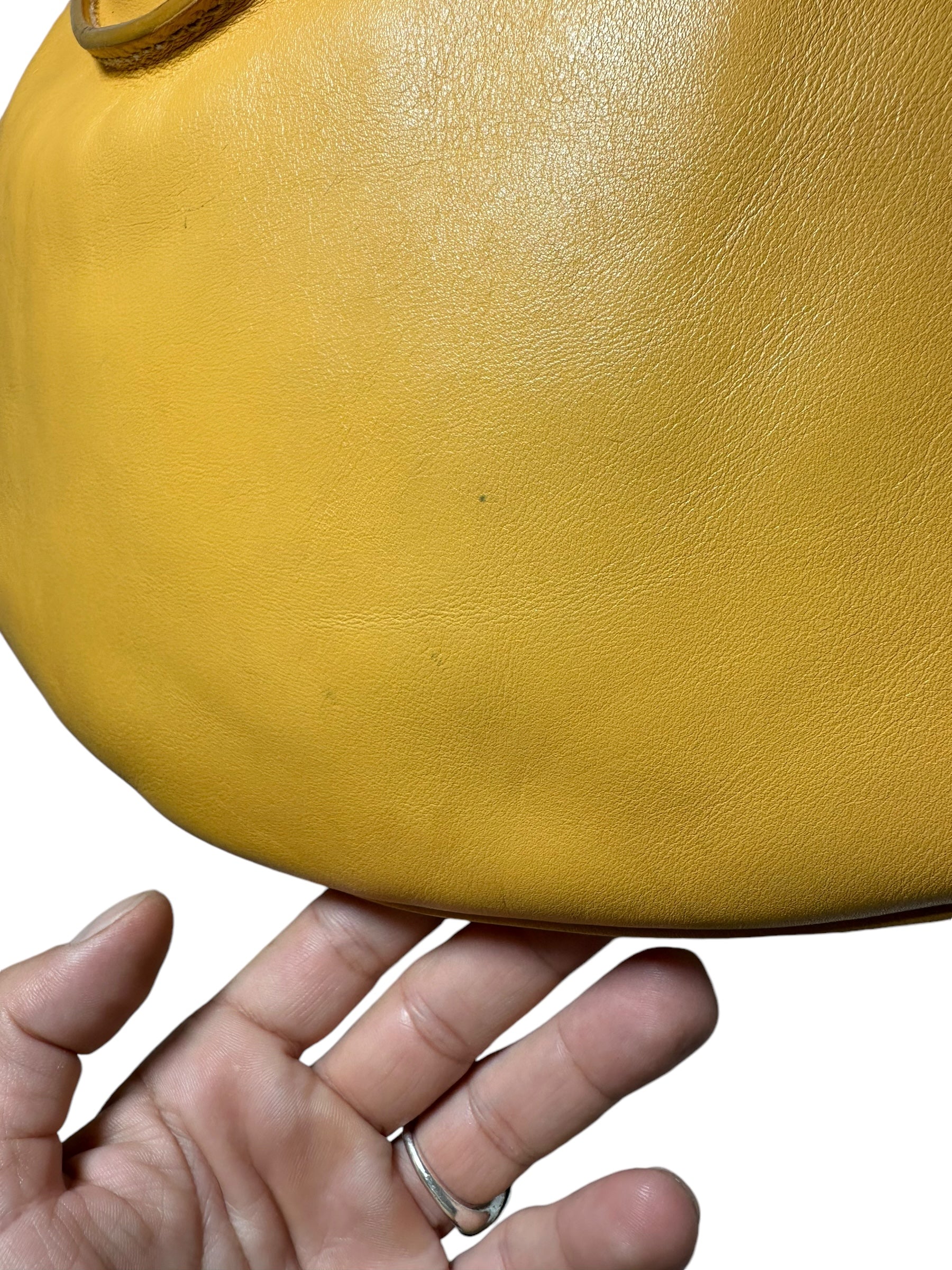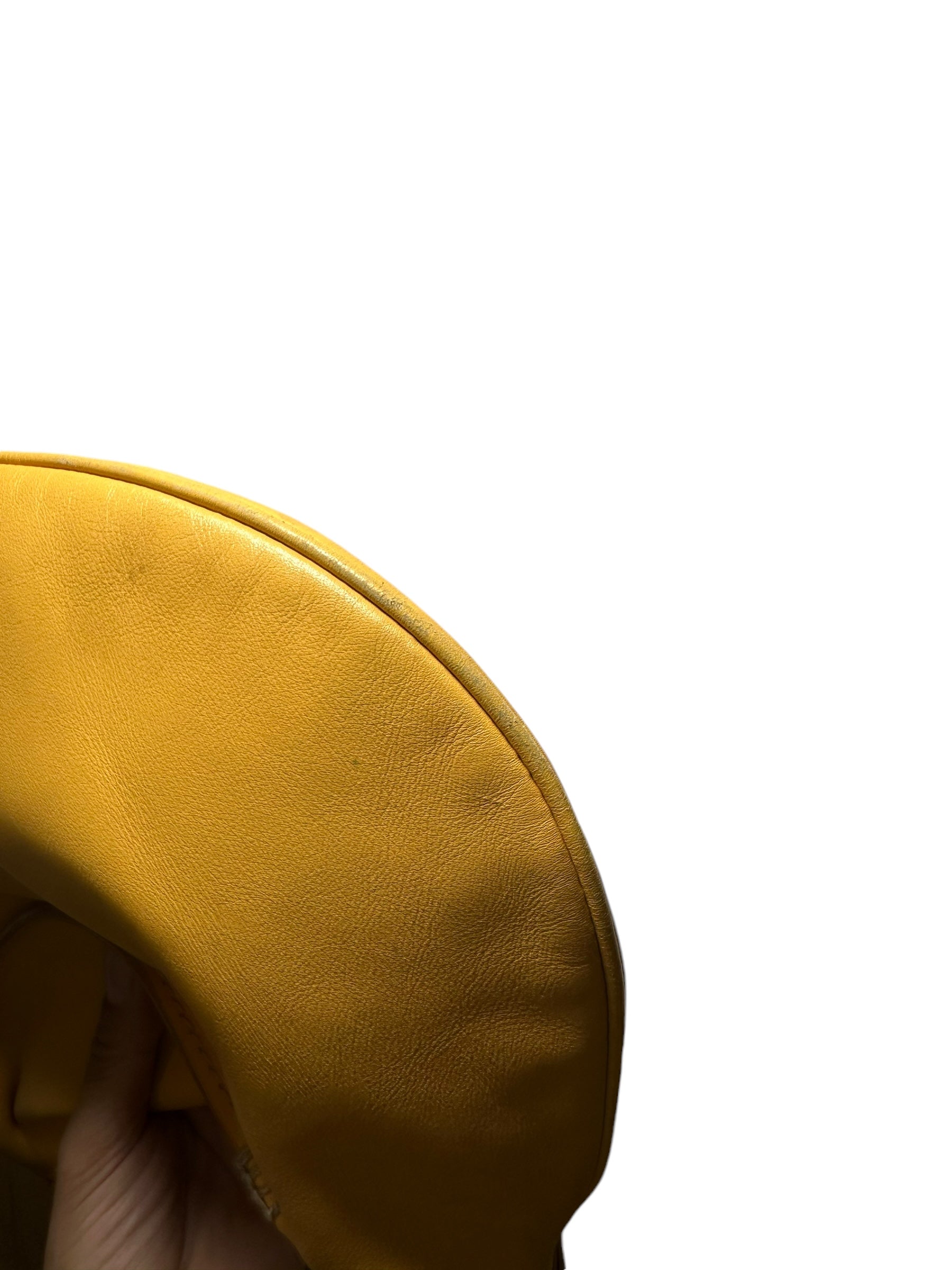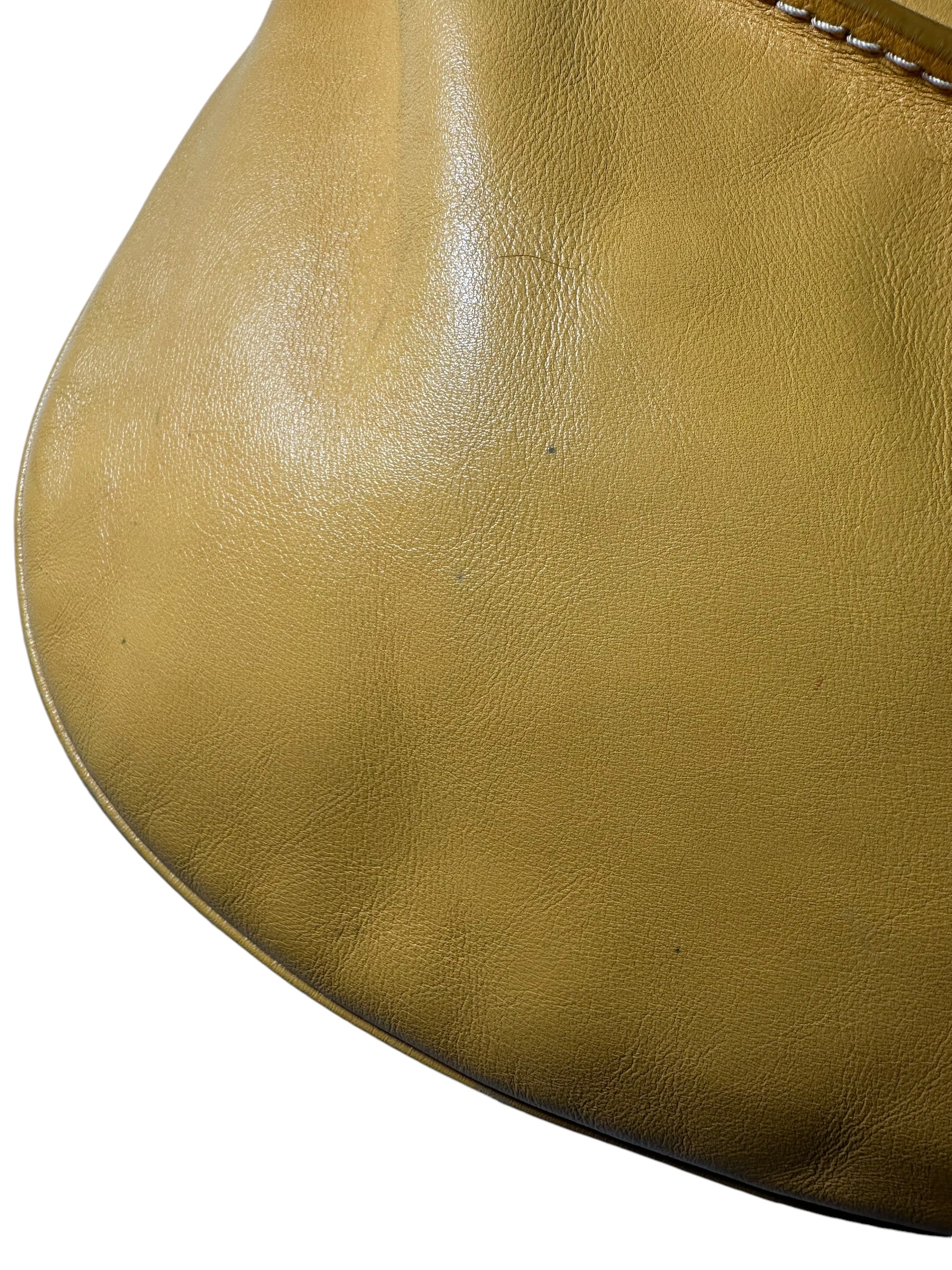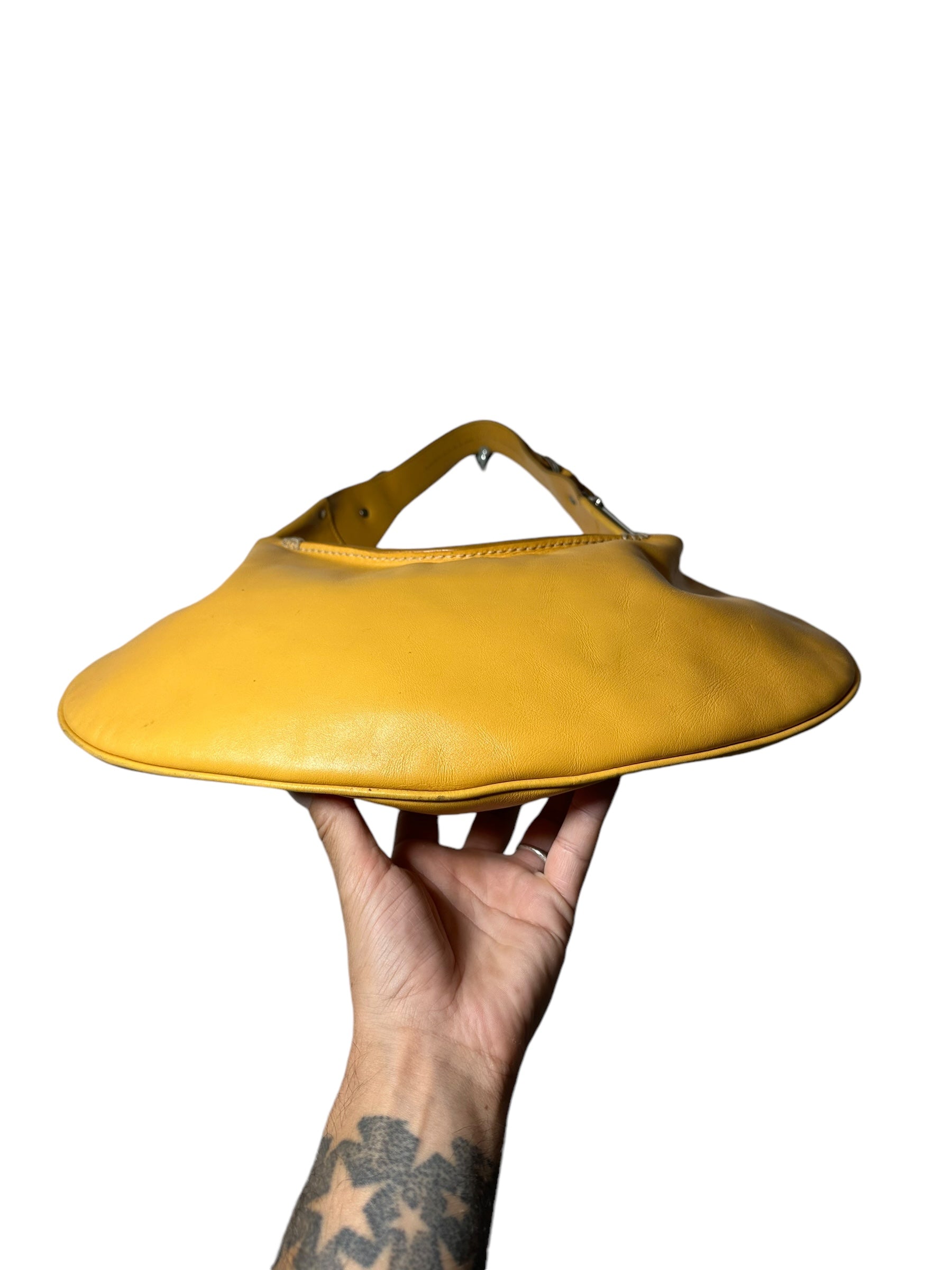 Dolce & Gabbana borsa vintage in pelle giallo ocra con cucitura in rilievo nelle parti superiori, manico morbido con inserti in metallo a logo e chiusura a zip. Interno foderato maculato. Presenta alcuni segni di usura visibili in foto, non viene spedita con dust bag originale.