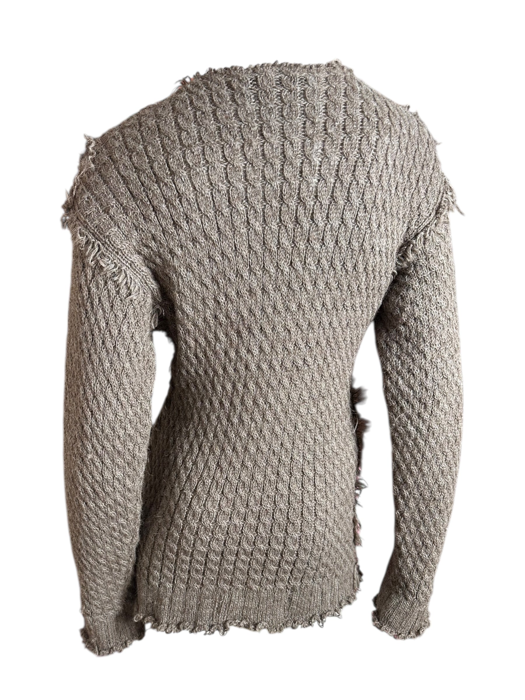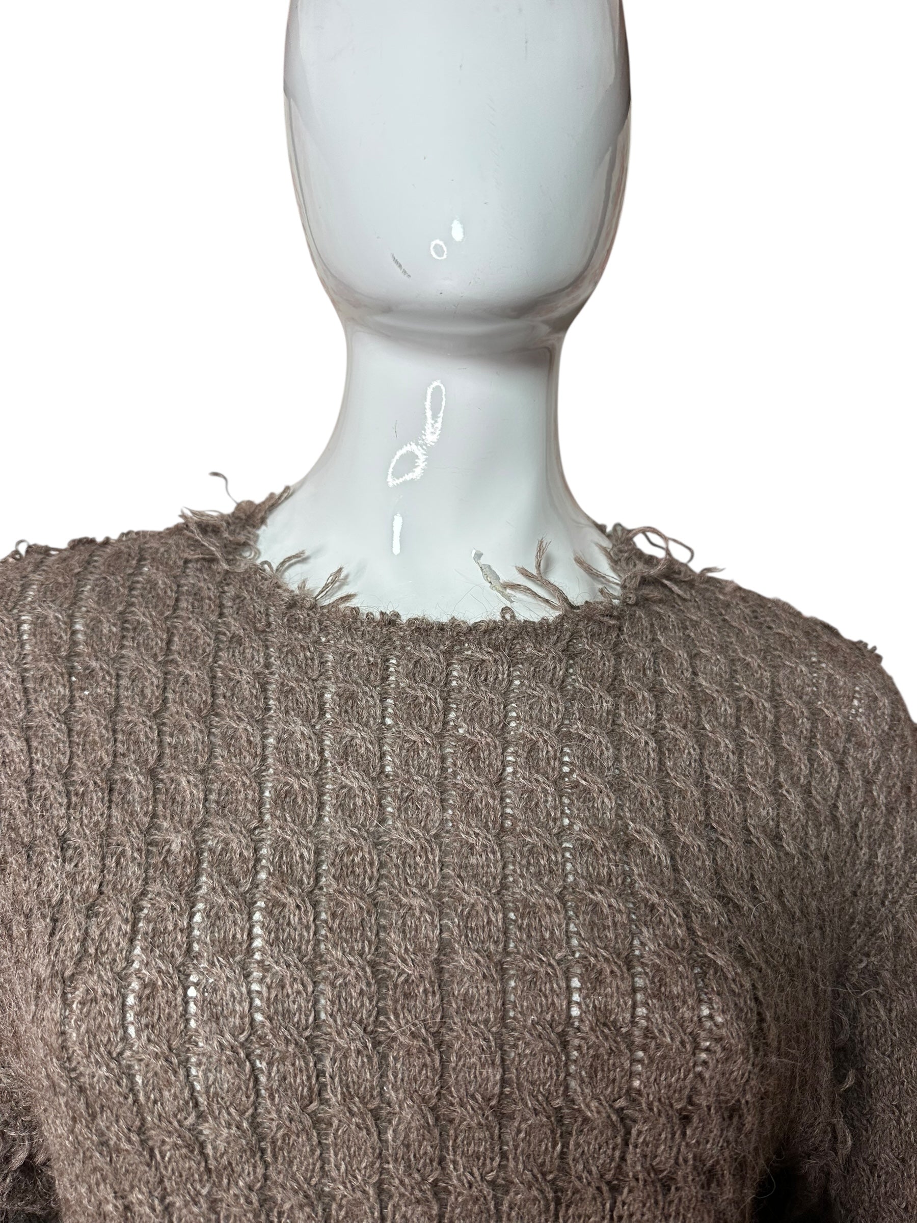 Maglione vintage Dolce & Gabbana dalla linea dritta e vestibilità morbida, realizzato in un filato misto (composizione non riportata, ma al tatto riconducibile a lana e mohair) con lavorazione a piccoli intrecci verticali. Il colore è un elegante tortora, una tonalità neutra e sofisticata che valorizza la texture del filato.