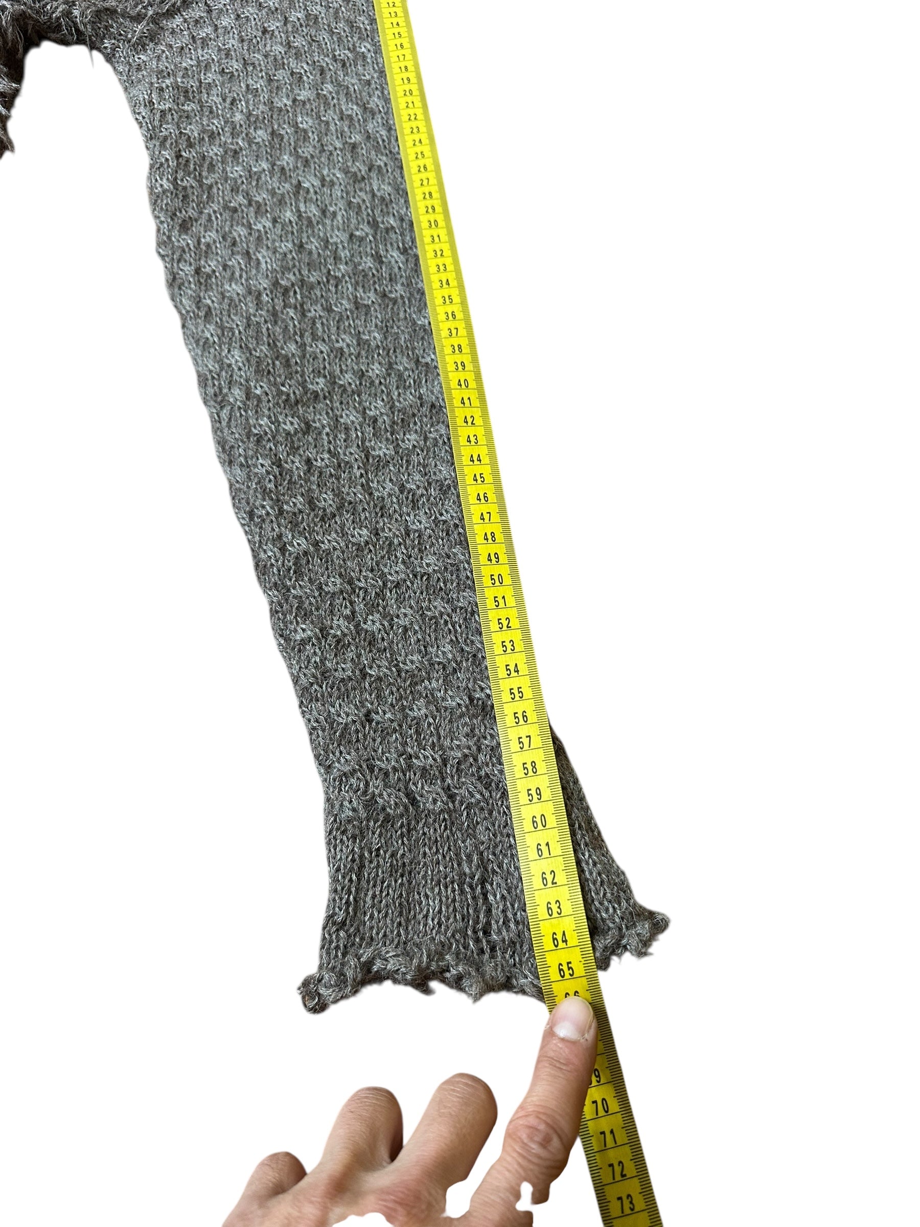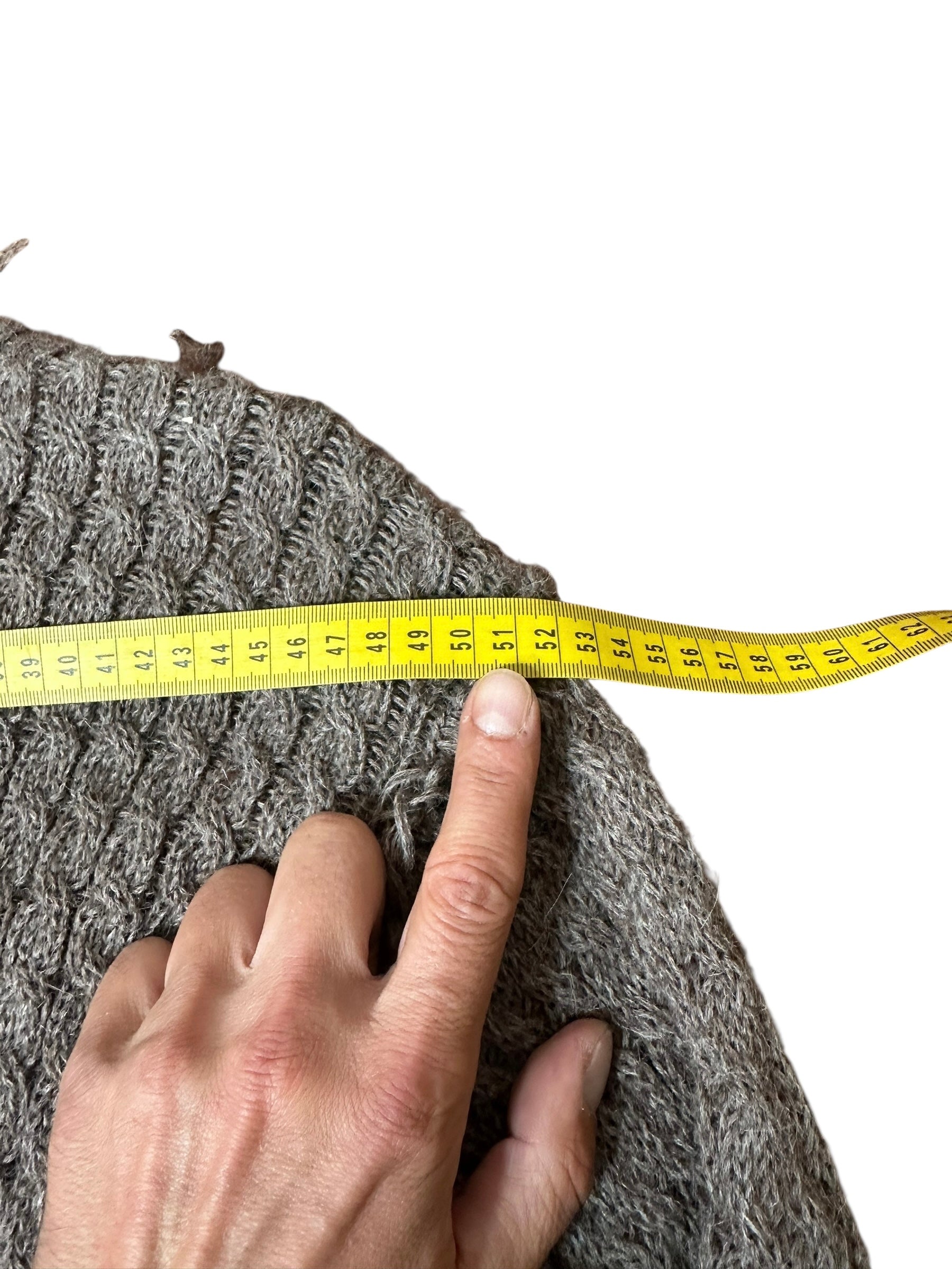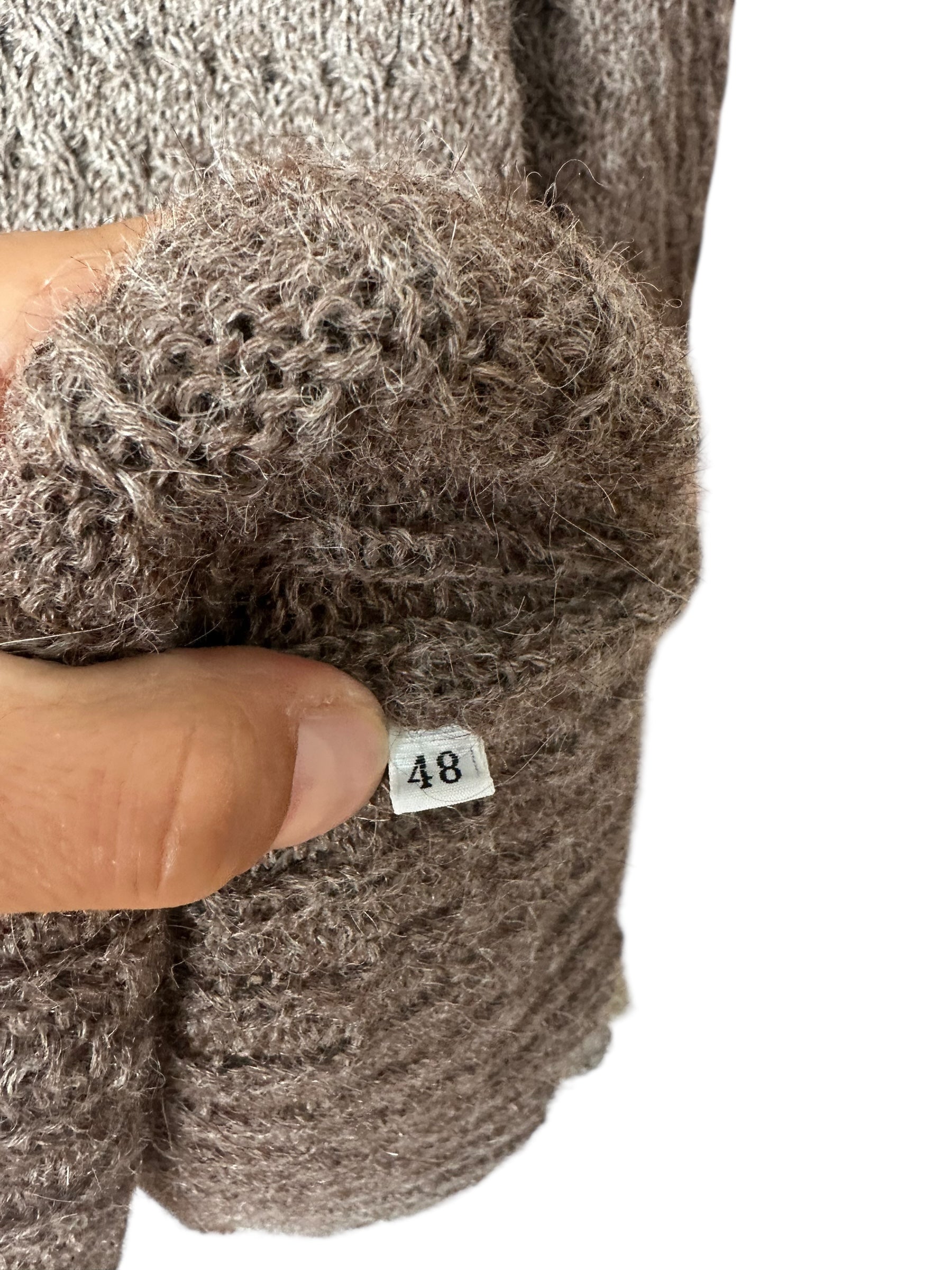 Scollo rotondo, maniche lunghe, bordi lavorati a coste. Non è presente l’etichetta interna di composizione o istruzioni di lavaggio, ma il filato è morbido e leggermente peloso, tipico del mohair misto lana.