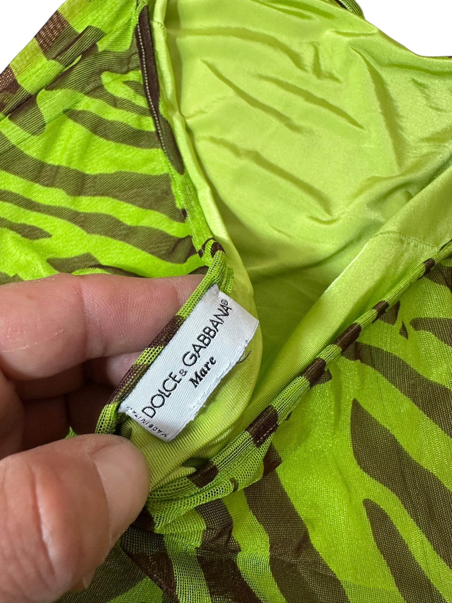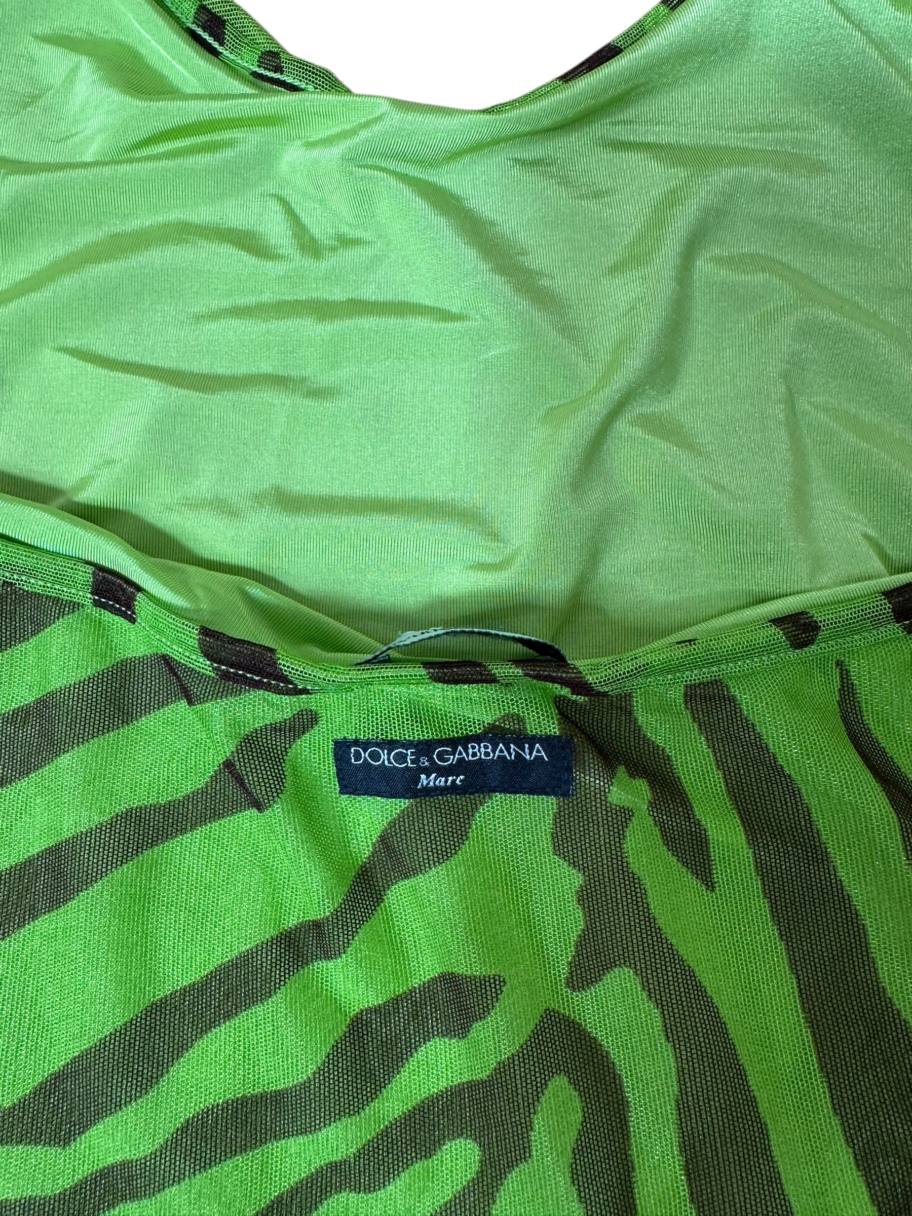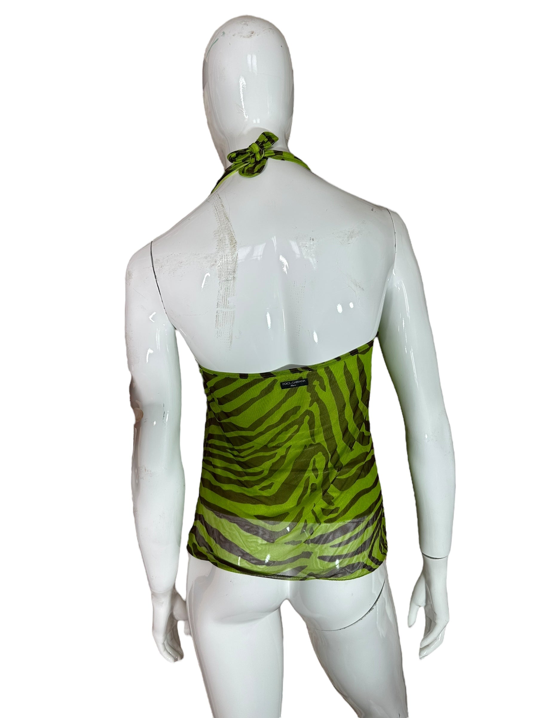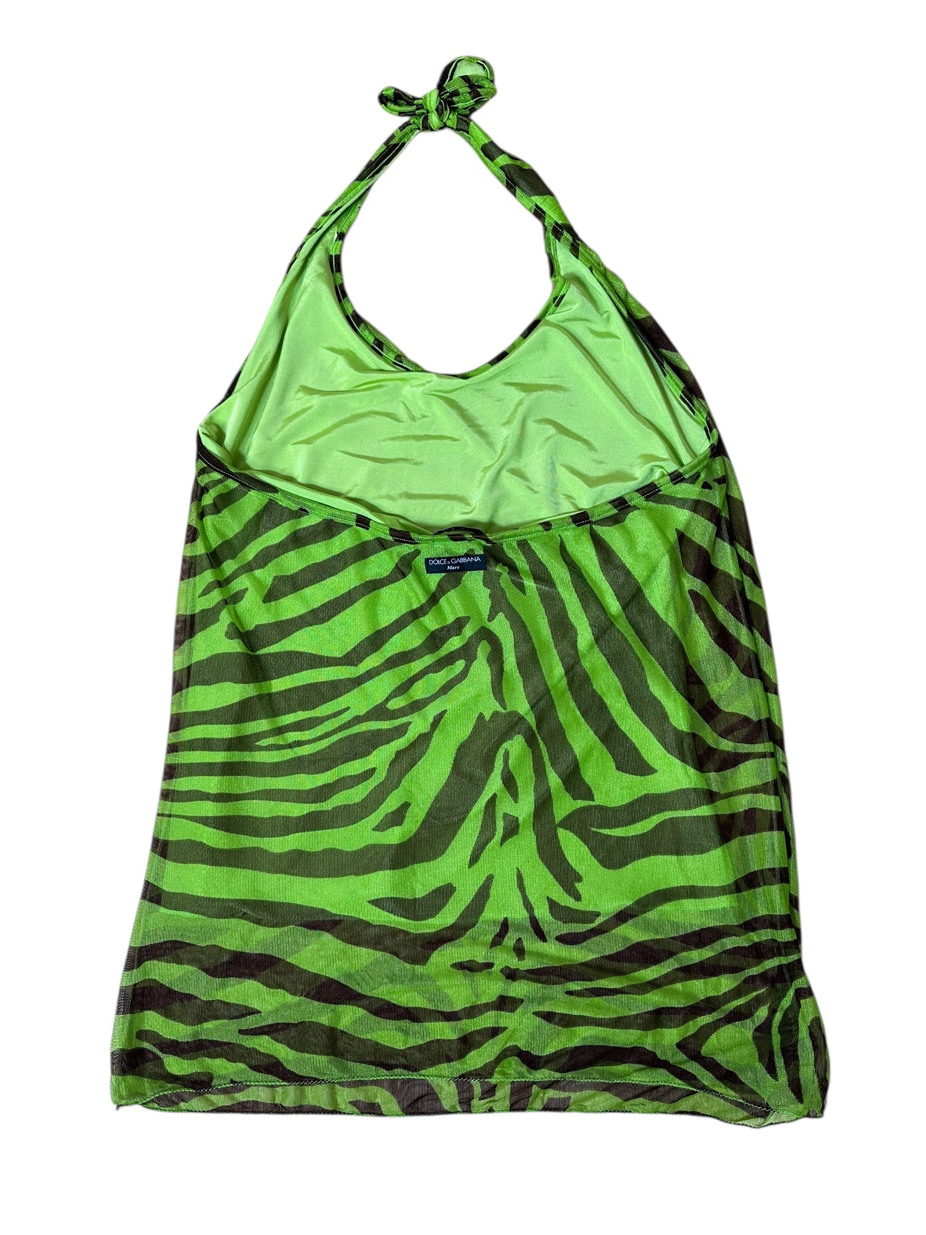 Top vintage Dolce & Gabbana Mare in tessuto stretch semi-trasparente, caratterizzato da stampa zebrata nei toni del verde e nero. Modello allacciato dietro al collo con scollo morbido e taglio dritto sul retro, foderato internamente nella parte del seno per maggiore coprenza. Il capo è leggero, aderente e perfetto da indossare sia come copricostume che come top estivo dallo stile audace.
