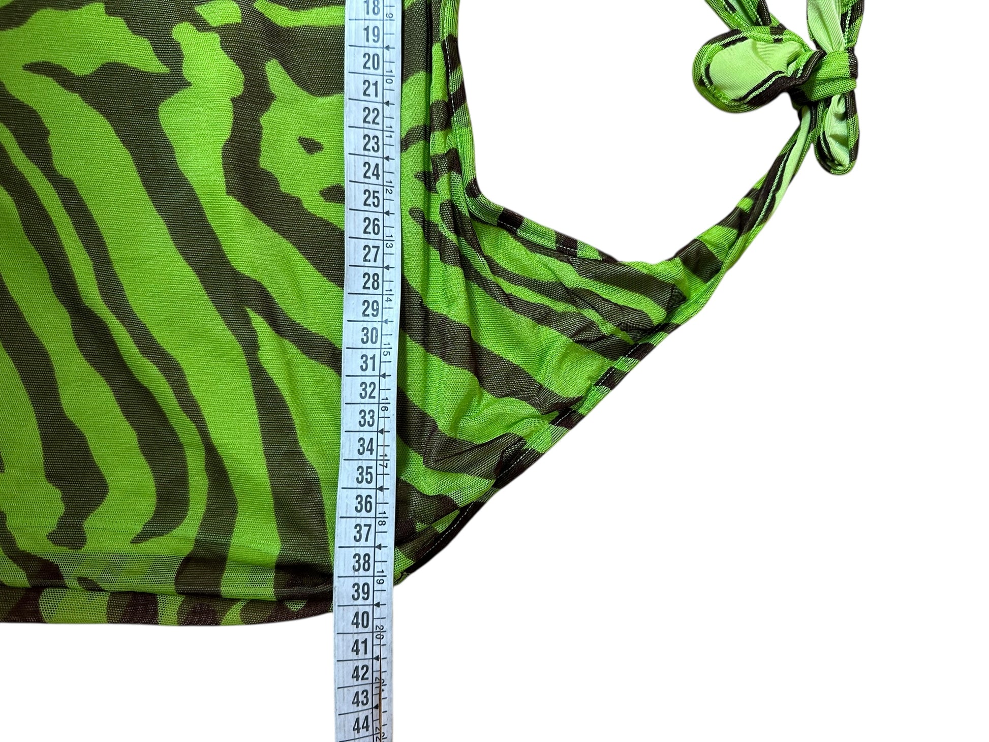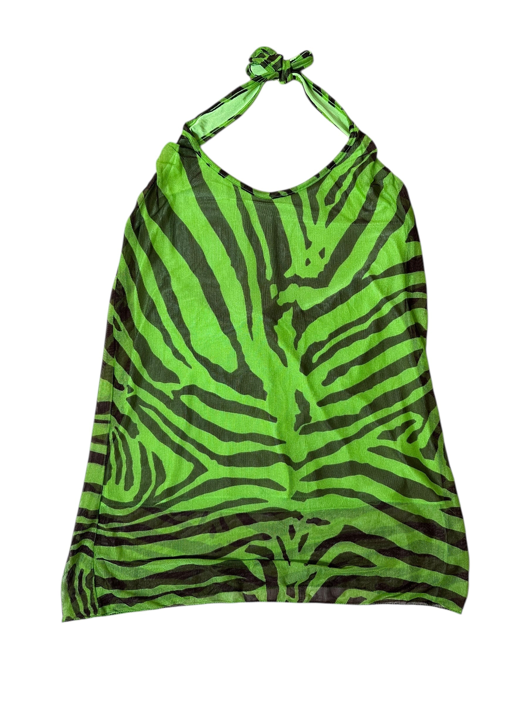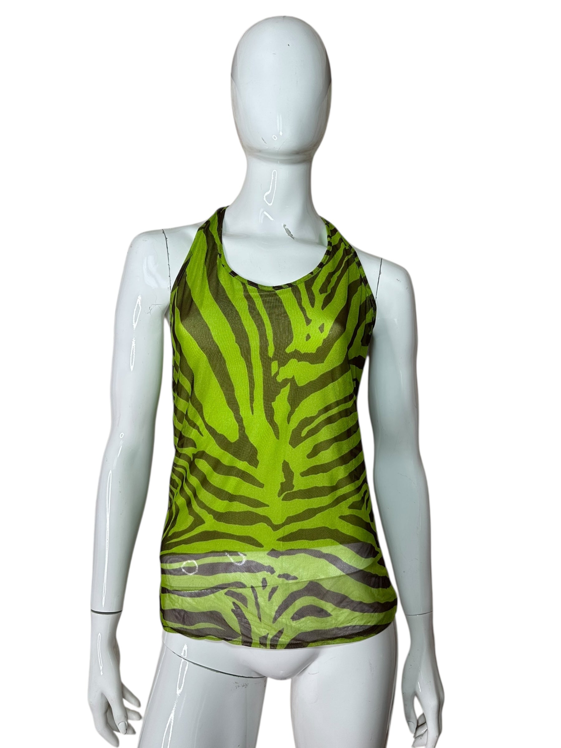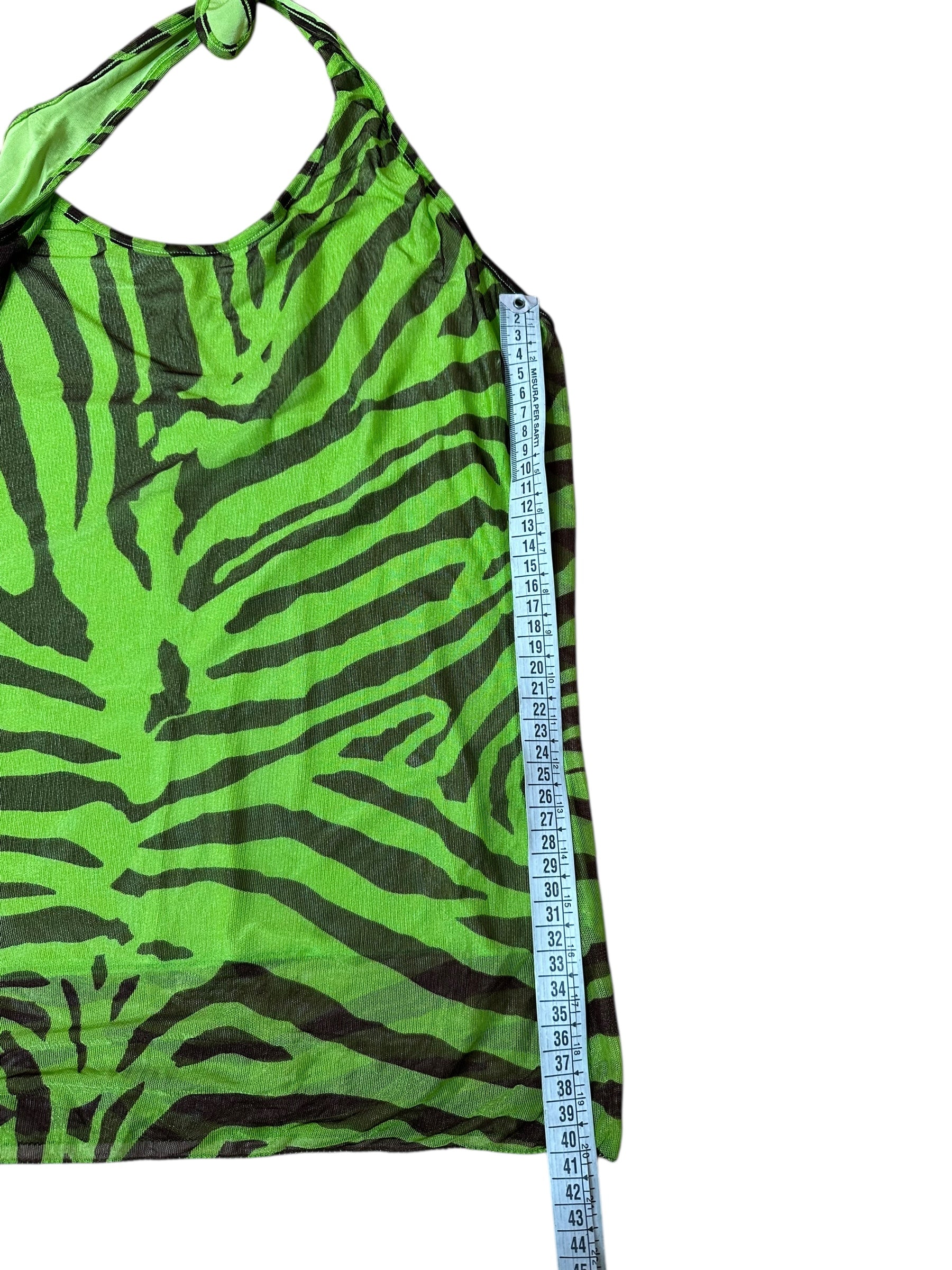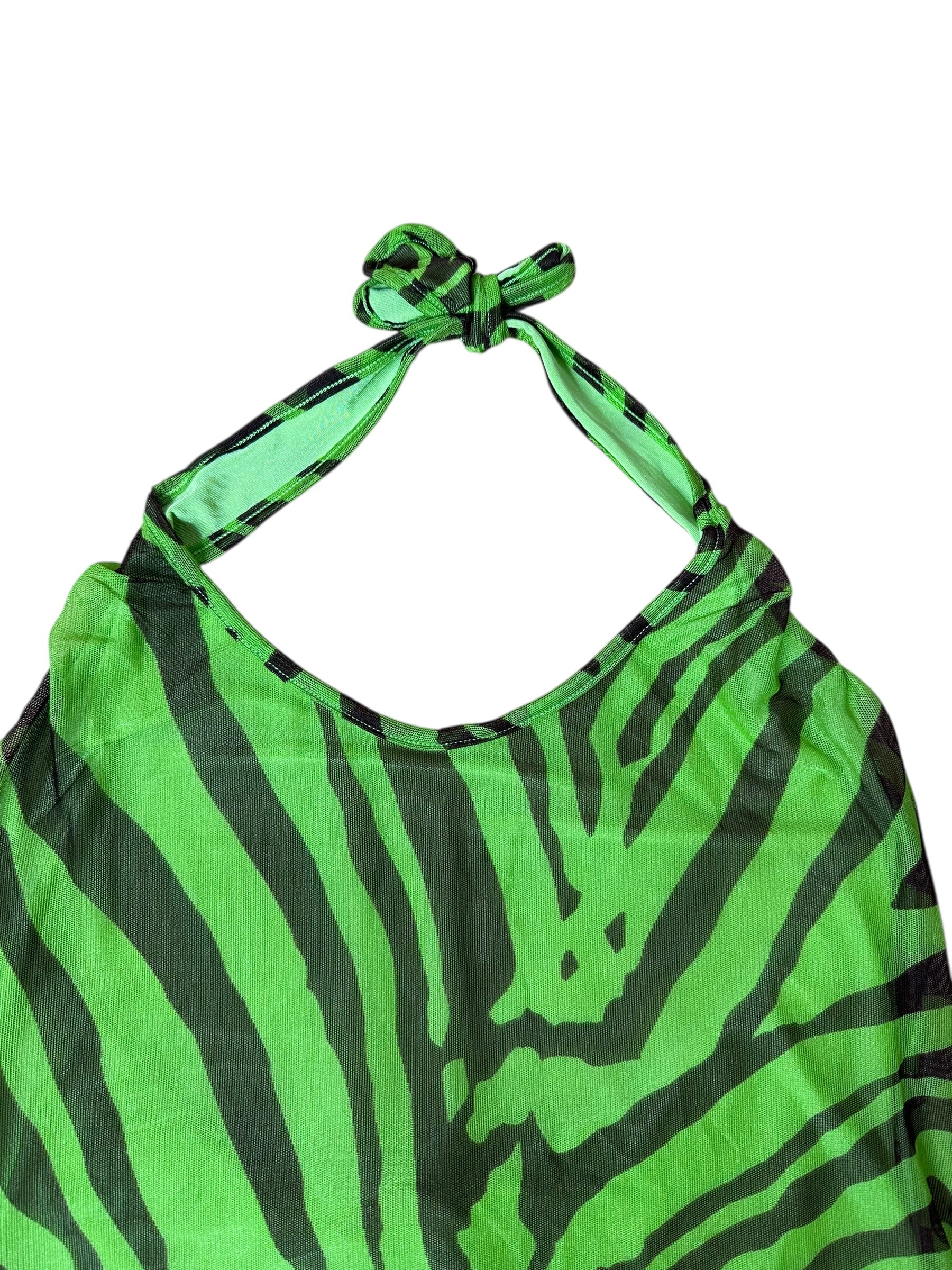 Top vintage Dolce & Gabbana Mare in tessuto stretch semi-trasparente, caratterizzato da stampa zebrata nei toni del verde e nero. Modello allacciato dietro al collo con scollo morbido e taglio dritto sul retro, foderato internamente nella parte del seno per maggiore coprenza. Il capo è leggero, aderente e perfetto da indossare sia come copricostume che come top estivo dallo stile audace.