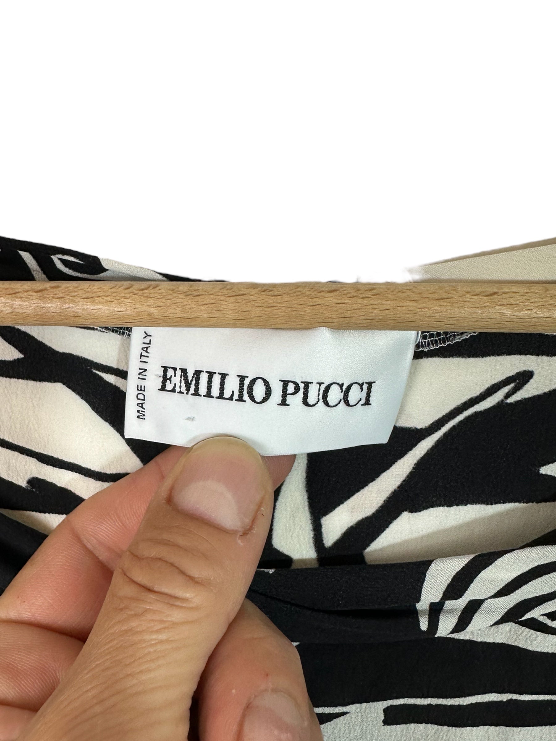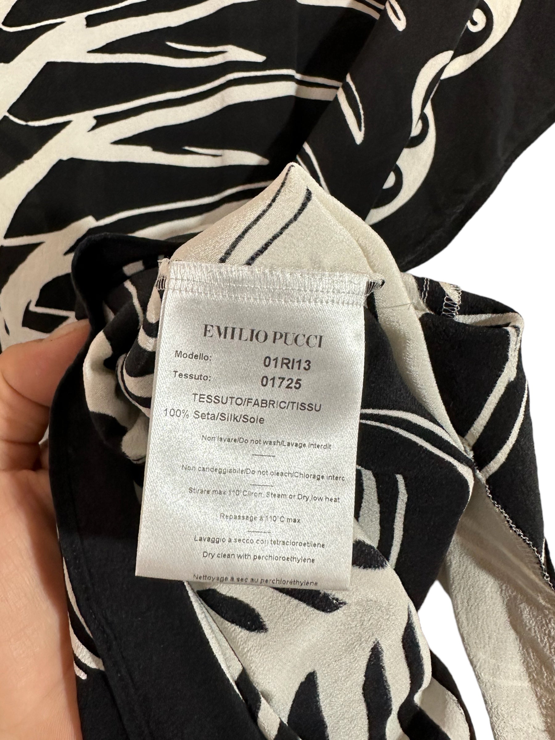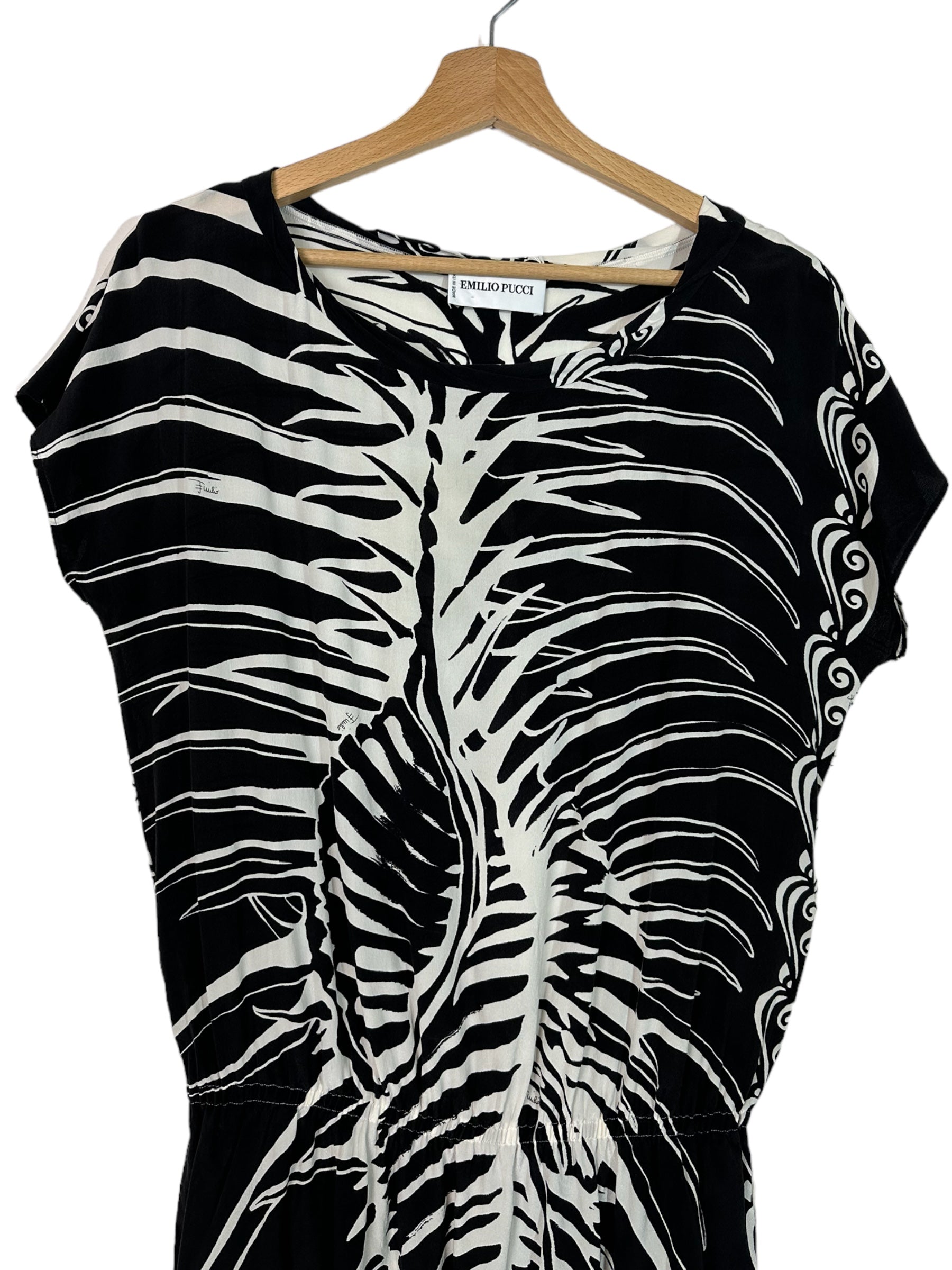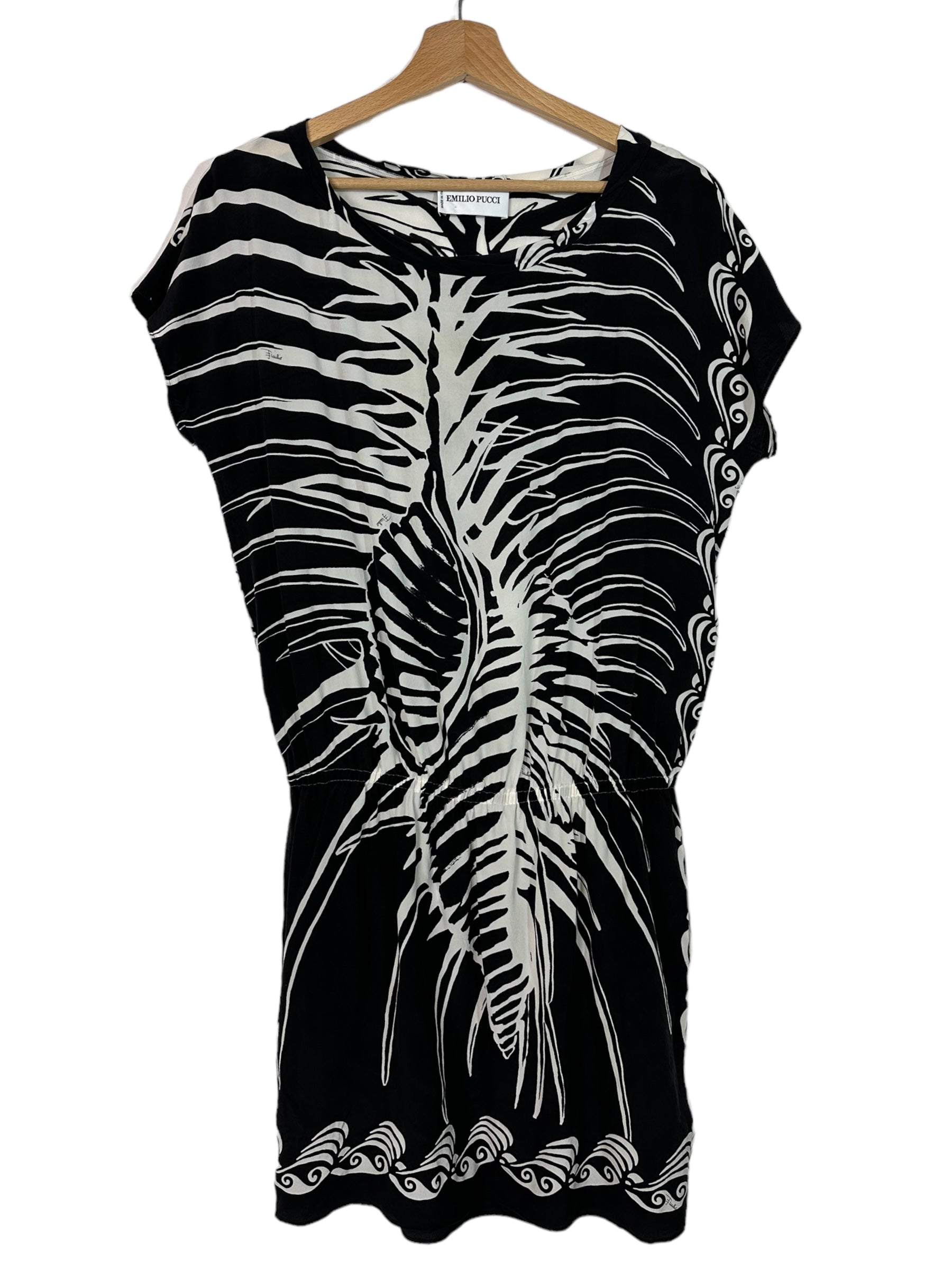 Emilio Pucci mini abito in seta a maniche corte con stampa in bianco e nero, elastico in vita e tasche laterali. Presenta due piccoli segni visibili in foto. Tg. 42