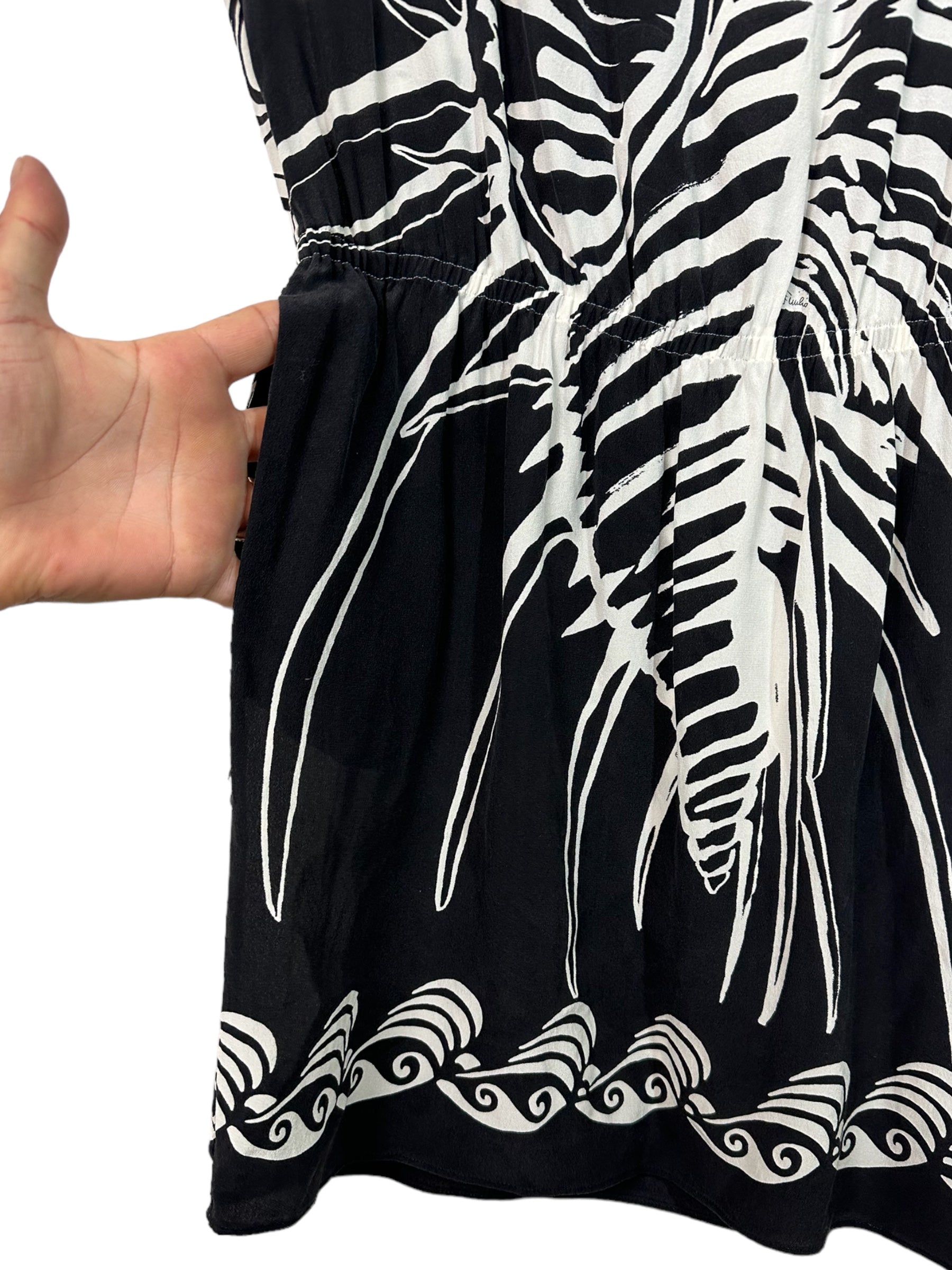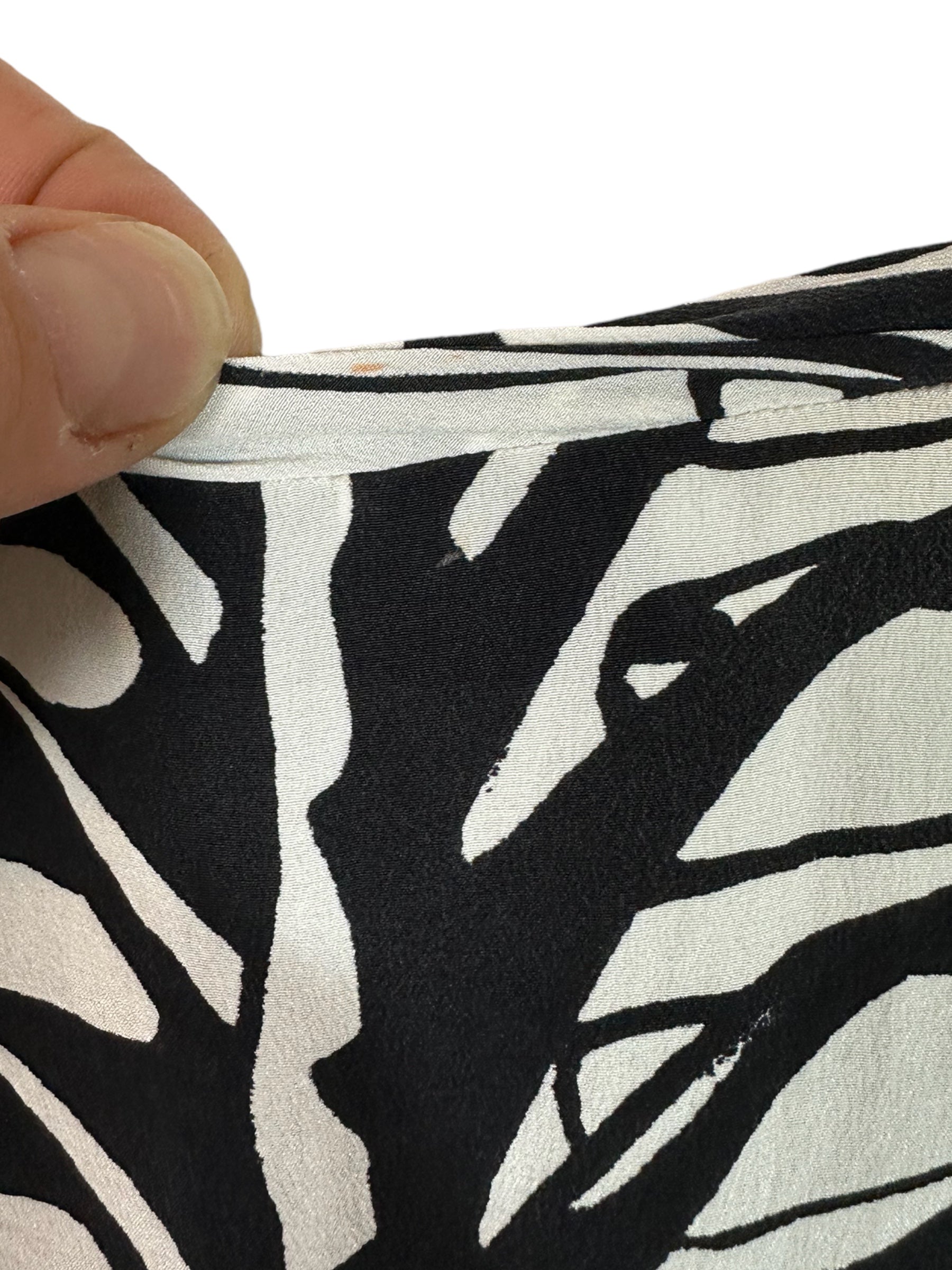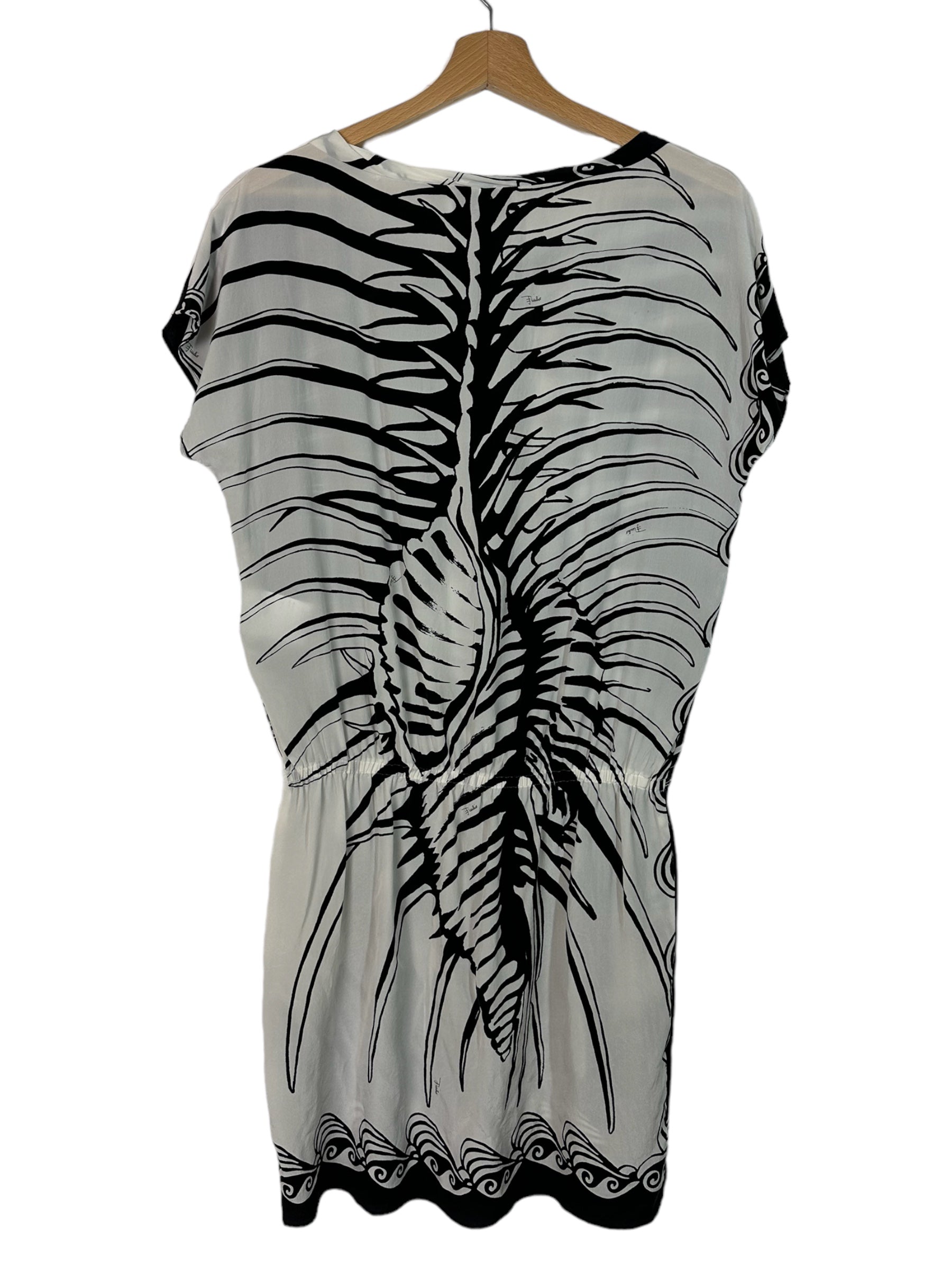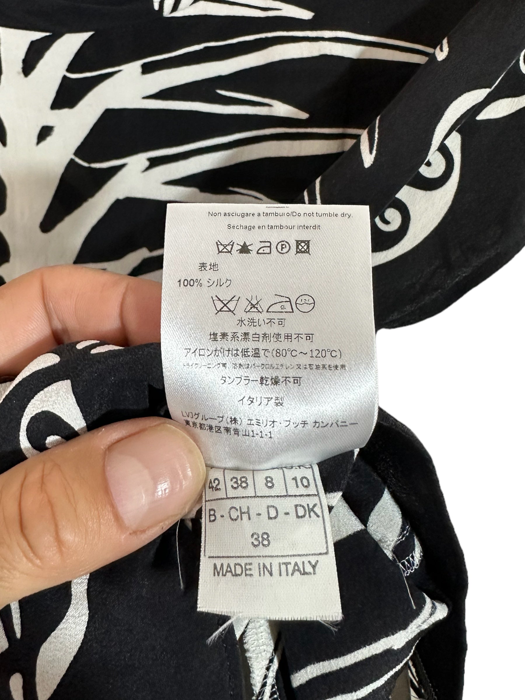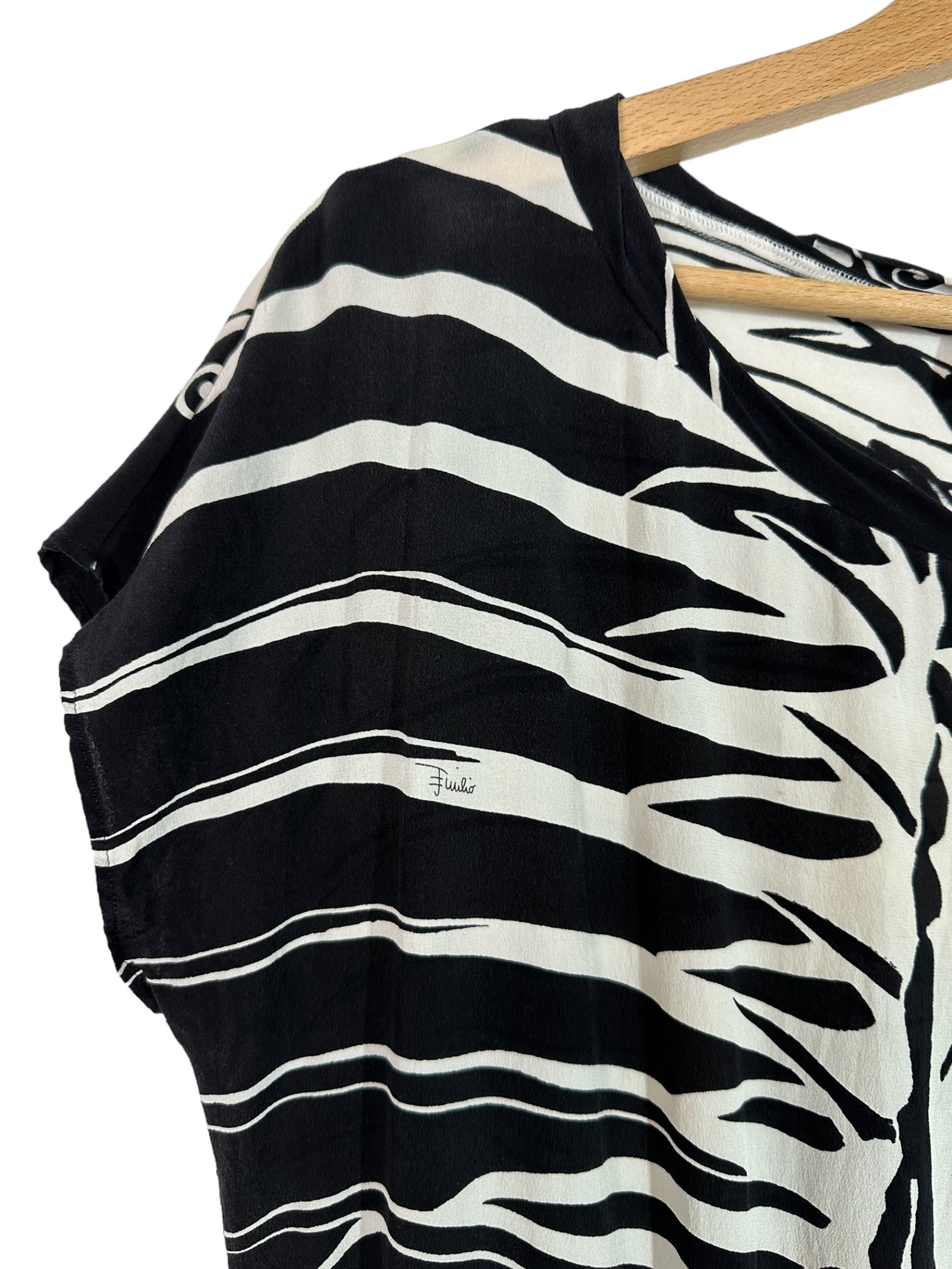 Emilio Pucci mini abito in seta a maniche corte con stampa in bianco e nero, elastico in vita e tasche laterali. Presenta due piccoli segni visibili in foto. Tg. 42