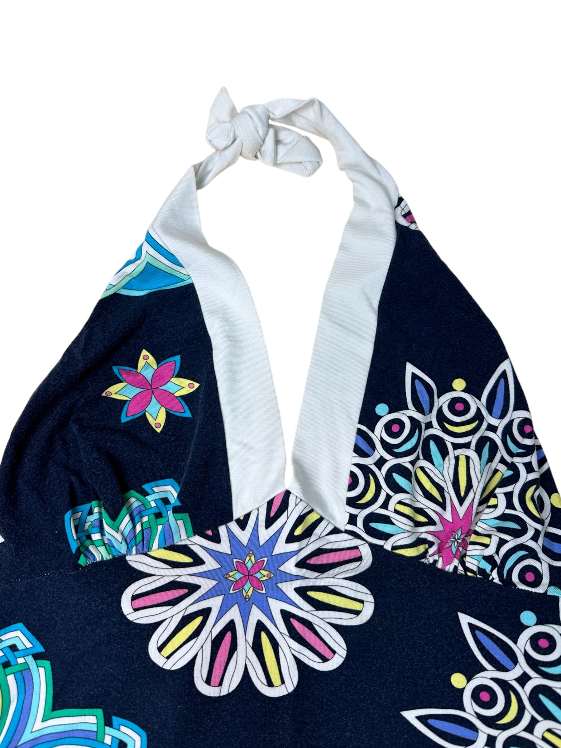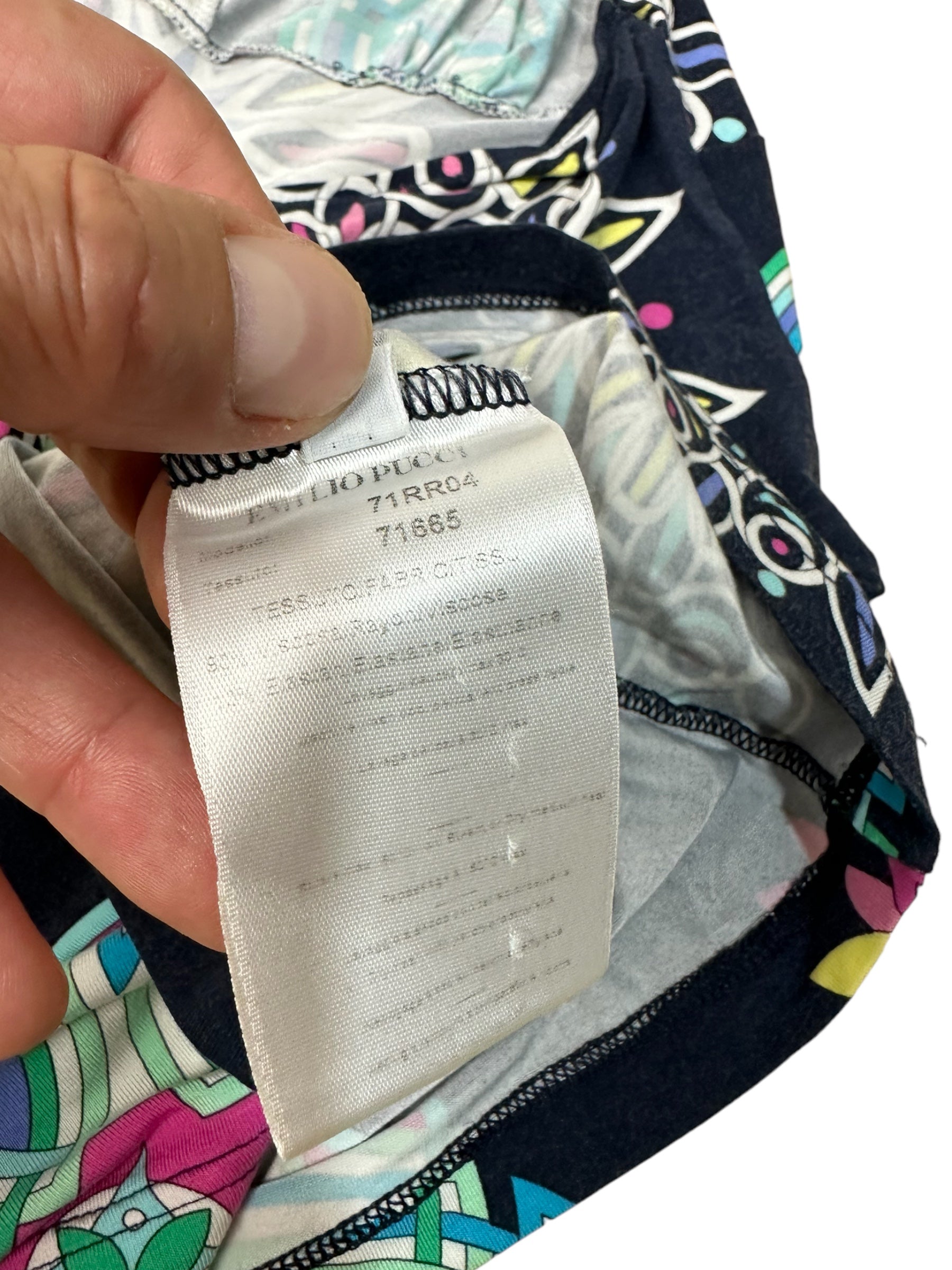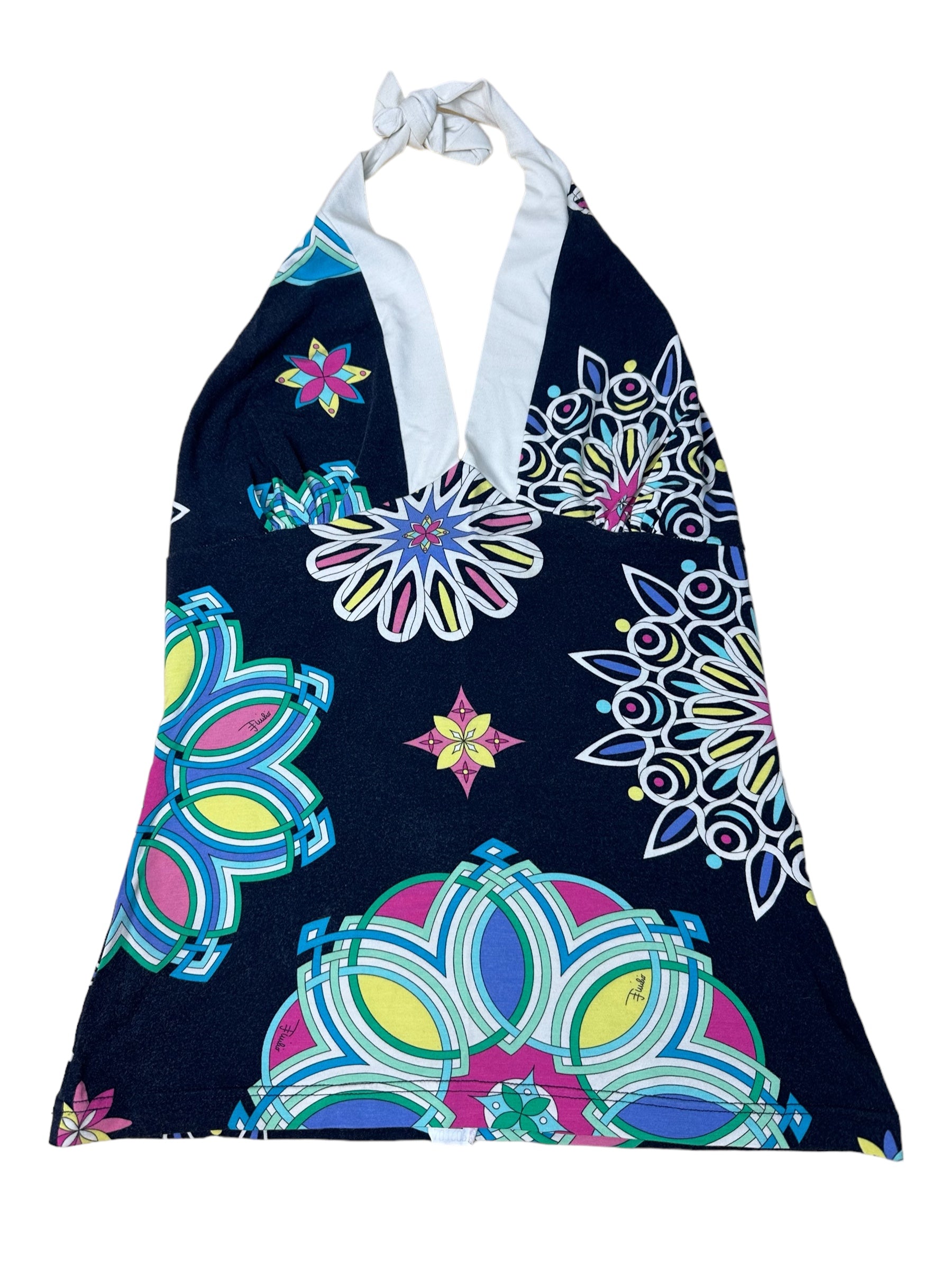 Emilio Pucci top vintage 90%viscosa e 10%elastano con stampa geometrica multicolor e piccoli loghi iconici. Chiusura con fiocco dietro al collo. Tg. S