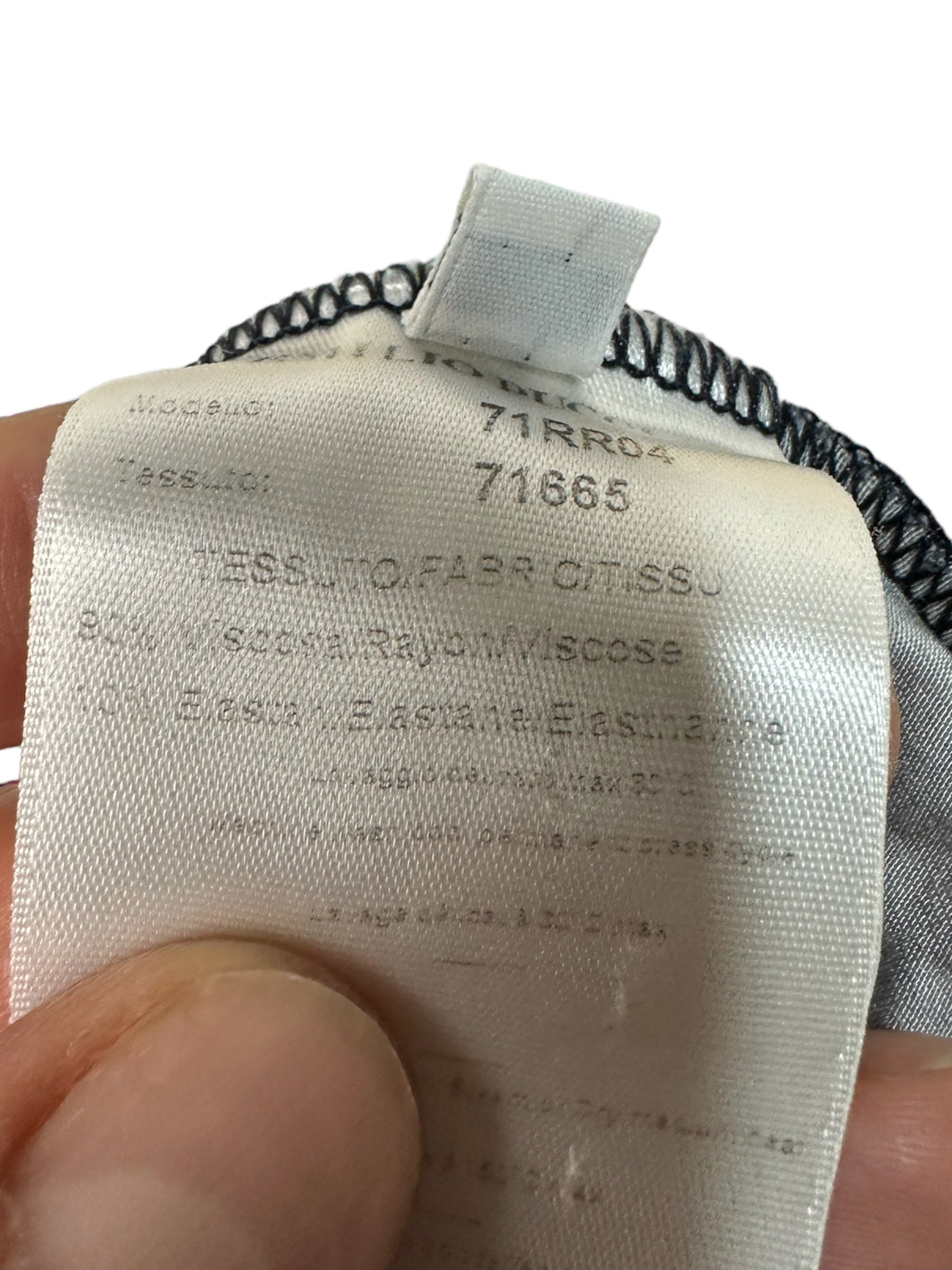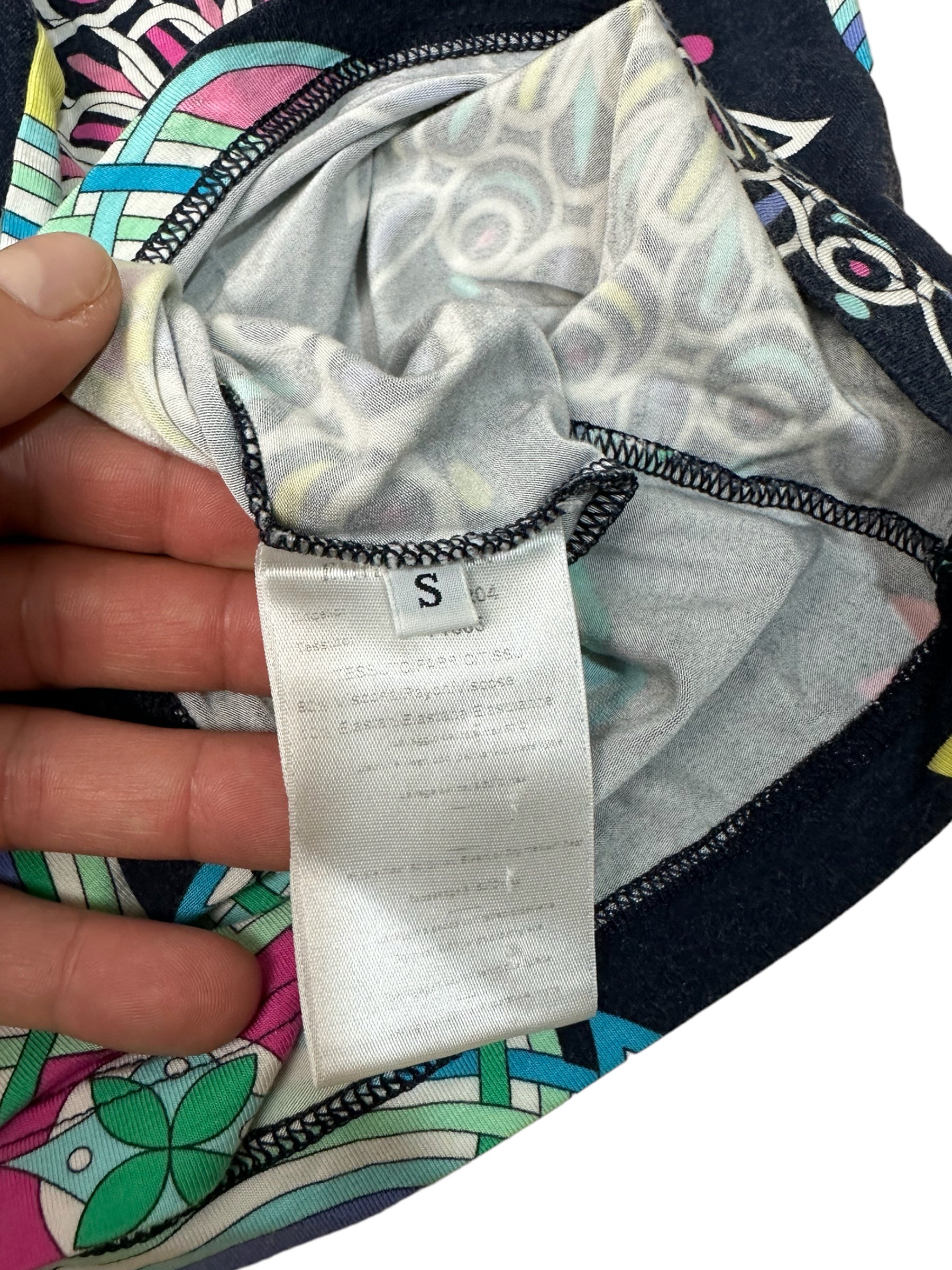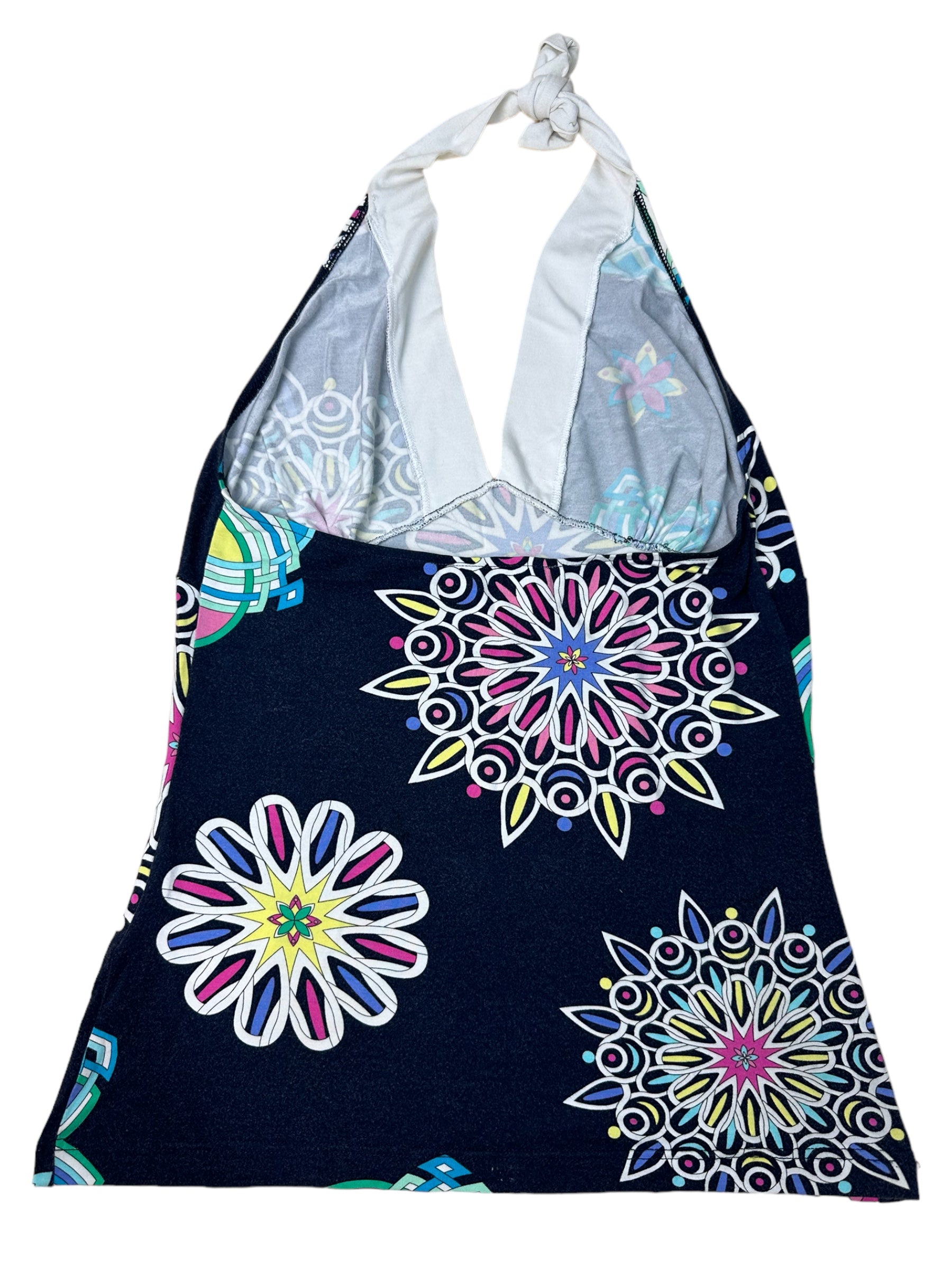 Emilio Pucci top vintage 90%viscosa e 10%elastano con stampa geometrica multicolor e piccoli loghi iconici. Chiusura con fiocco dietro al collo. Tg. S