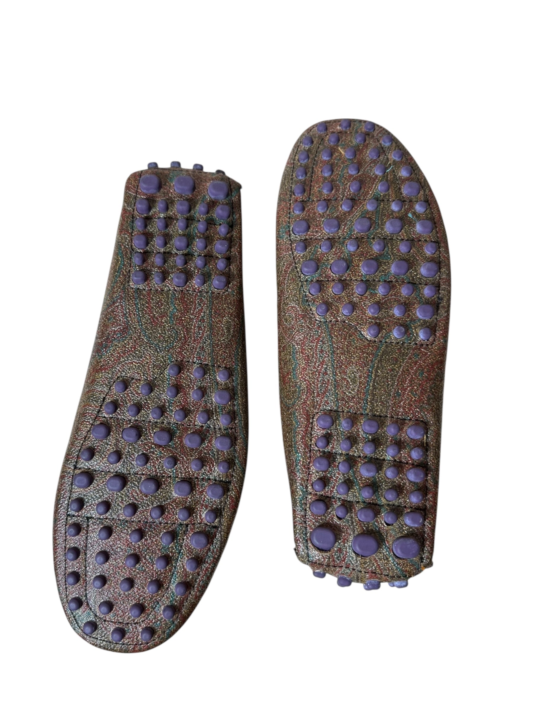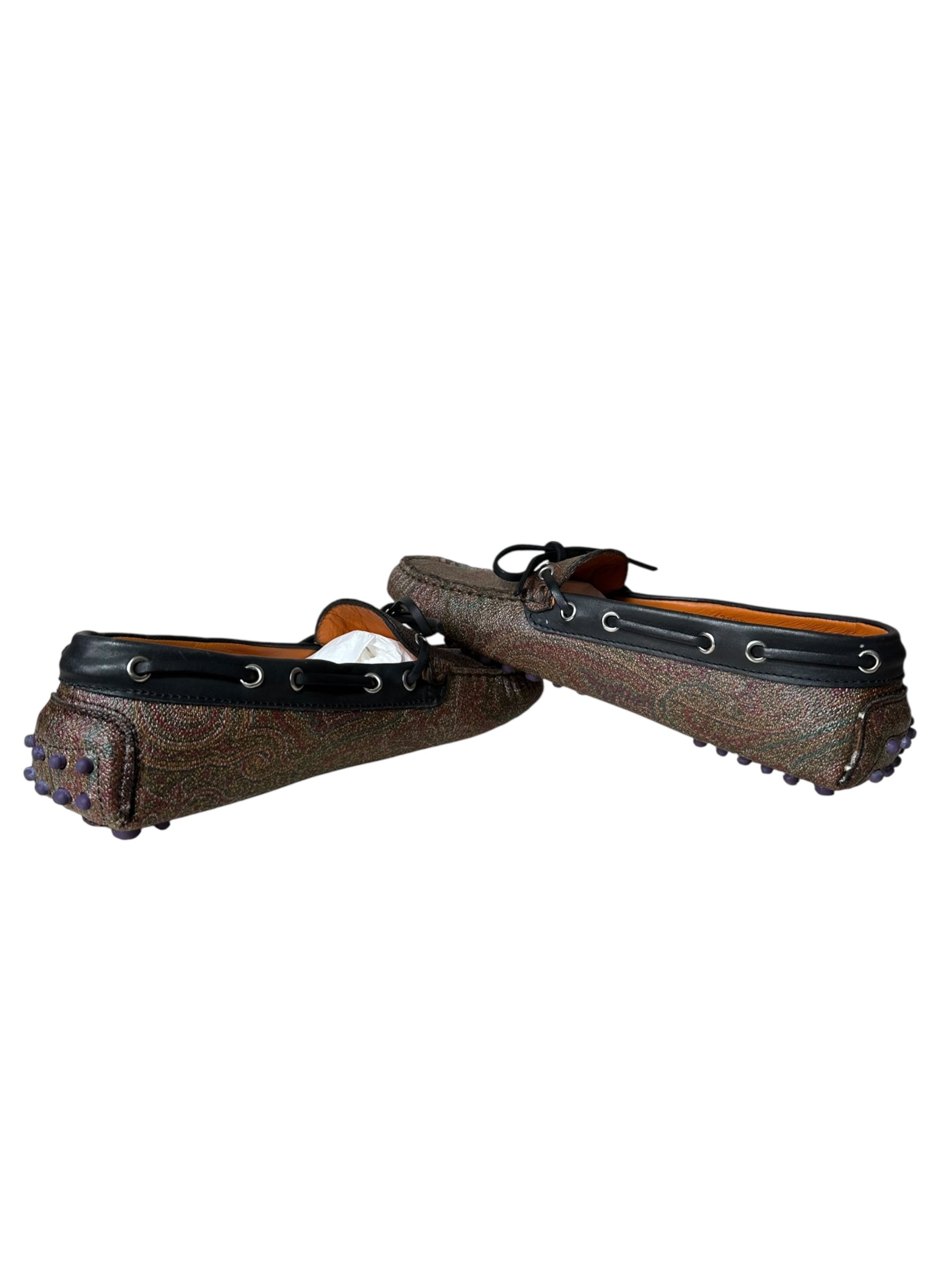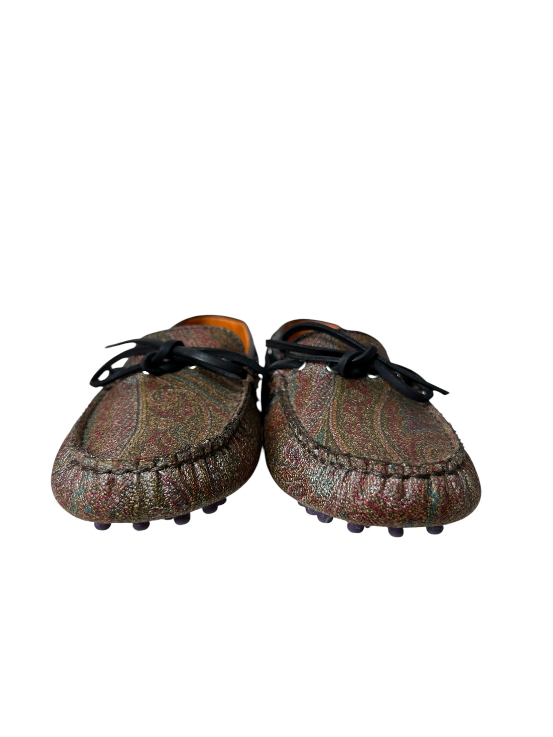 Mocassini femminili firmati Etro, realizzati in morbida pelle con motivo paisley nei toni del marrone, verde e arancio. Il design classico è arricchito da nappine frontali e profili in pelle a contrasto color cuoio, che donano un tocco distintivo ed elegante. Suola in cuoio e tacco basso, ideali per un utilizzo quotidiano comodo ma ricercato.