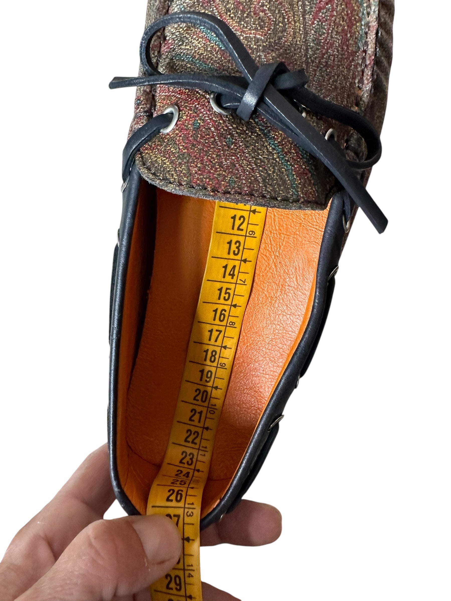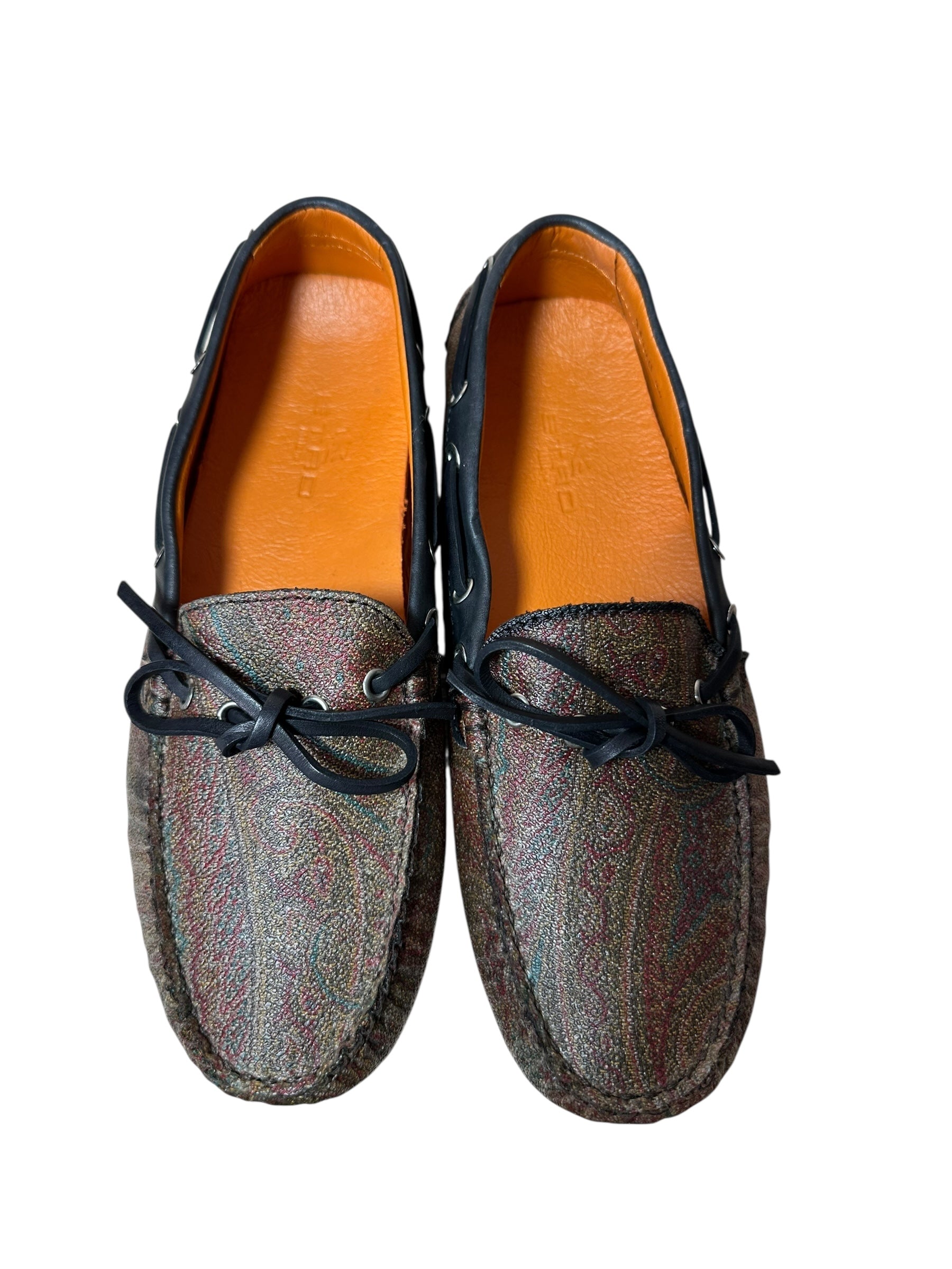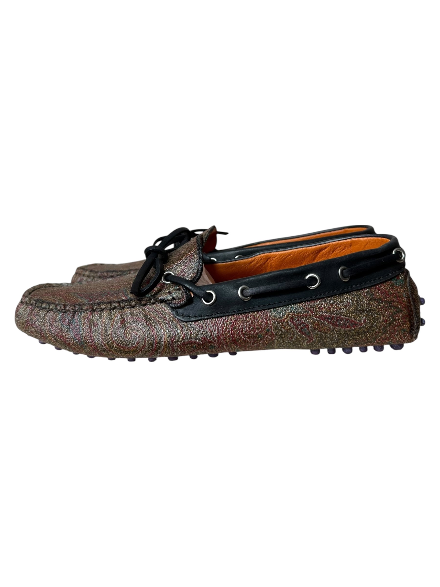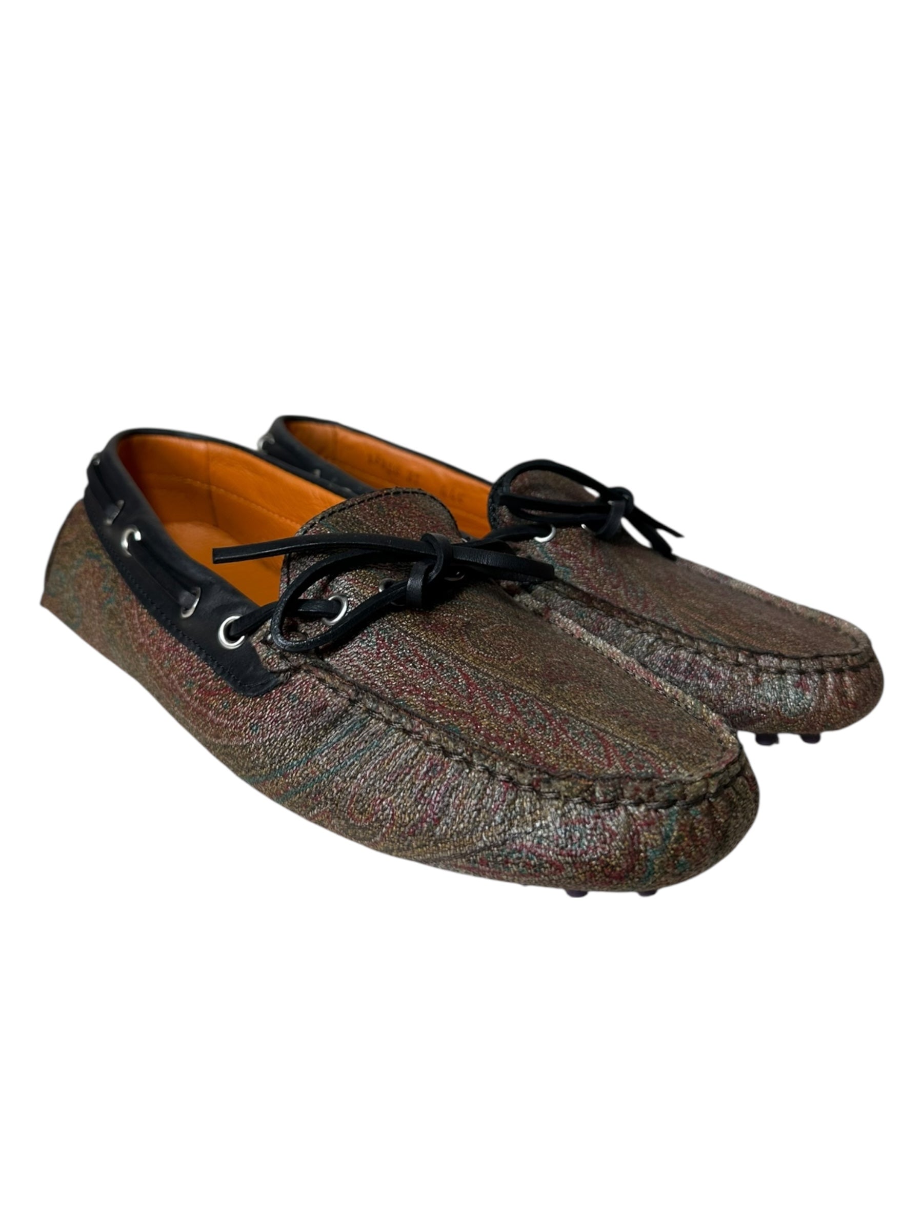 Mocassini femminili firmati Etro, realizzati in morbida pelle con motivo paisley nei toni del marrone, verde e arancio. Il design classico è arricchito da nappine frontali e profili in pelle a contrasto color cuoio, che donano un tocco distintivo ed elegante. Suola in cuoio e tacco basso, ideali per un utilizzo quotidiano comodo ma ricercato.