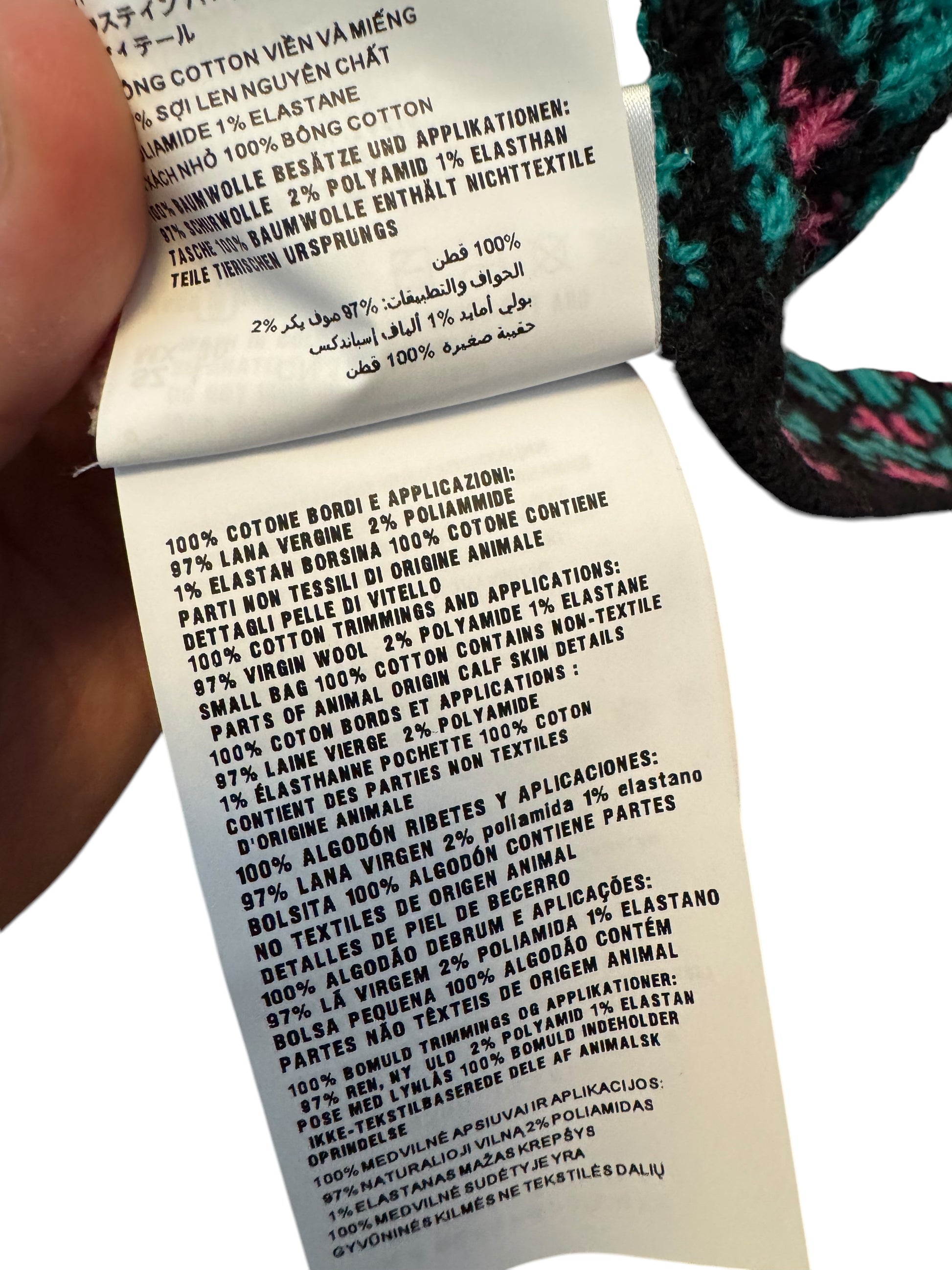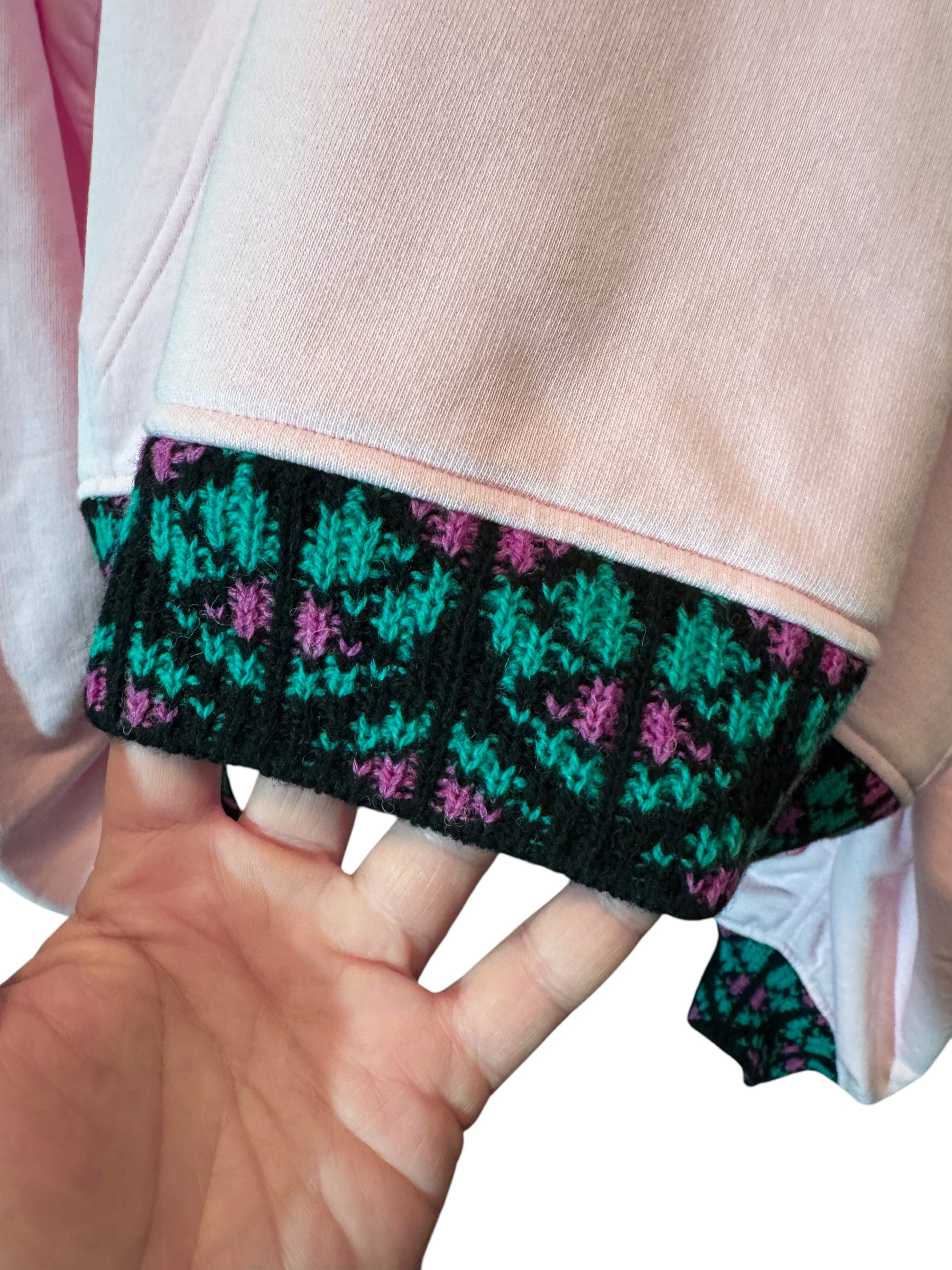 Modello con cappuccio regolabile tramite cordino nero e tasca frontale a marsupio. L’orlo e i polsini sono realizzati in maglia a costine jacquard nei toni del nero, verde e fucsia, che conferiscono un tocco distintivo.