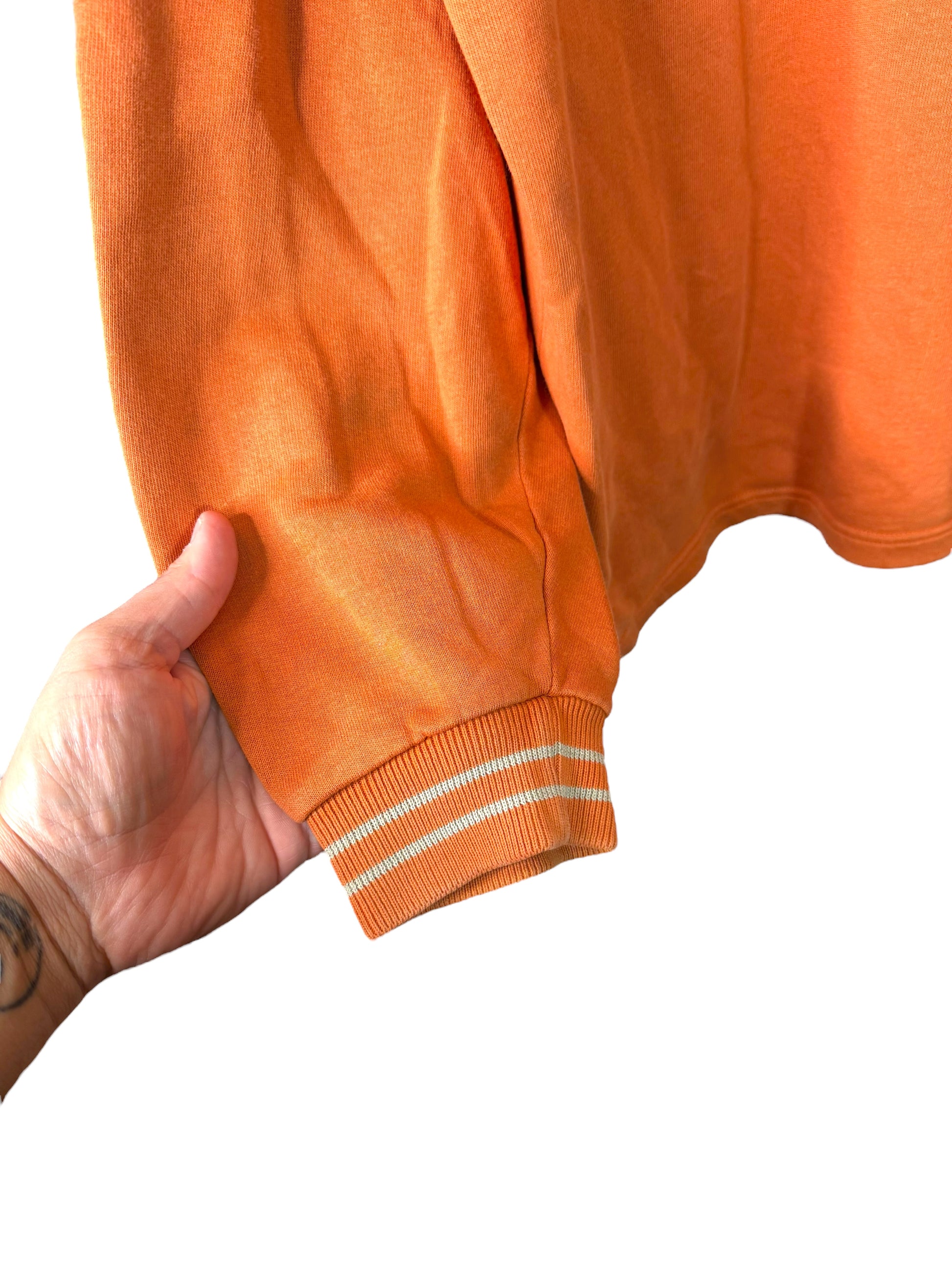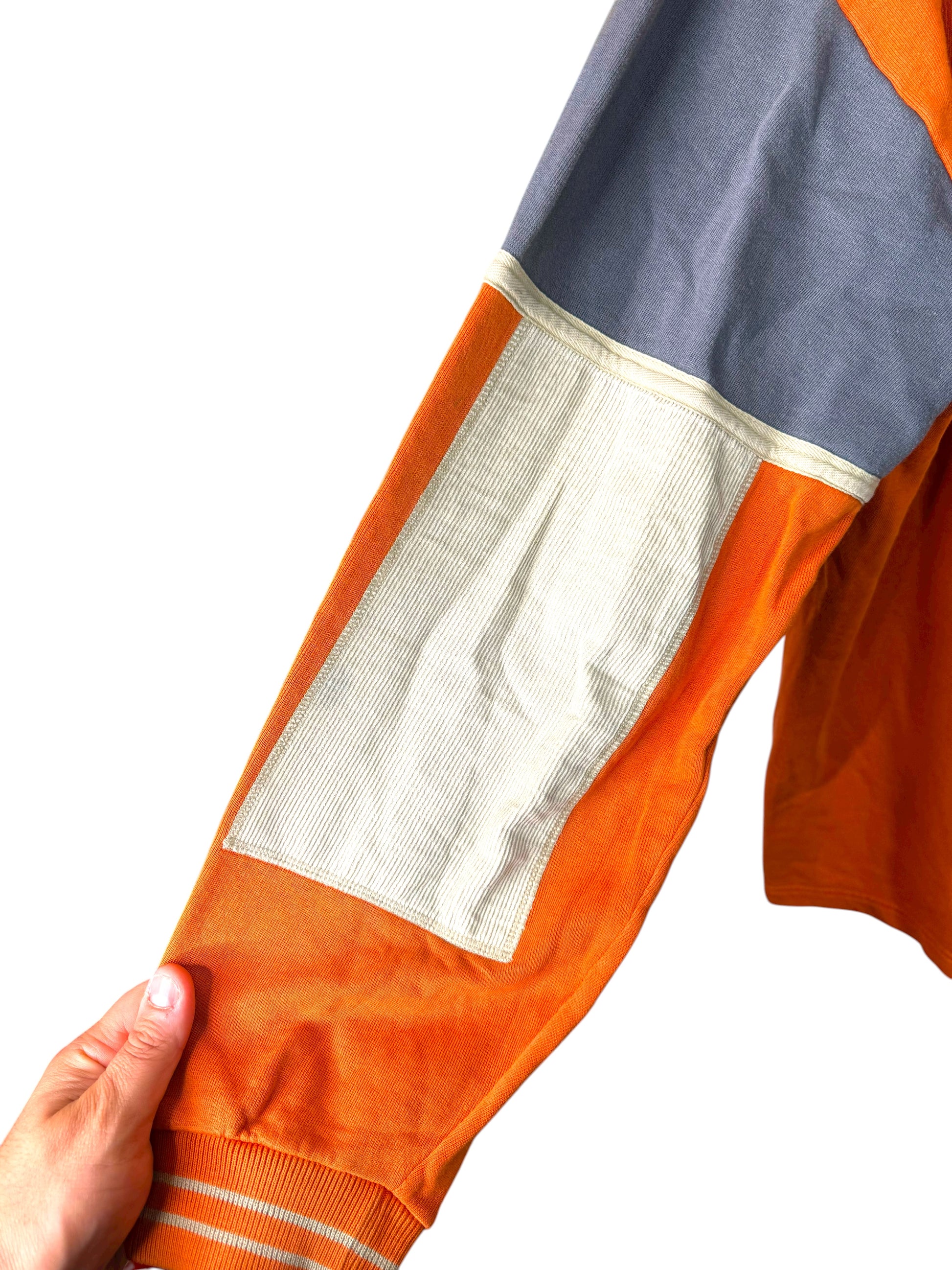 Realizzata in cotone pesante color arancione con inserto centrale grigio, presenta dettagli unici come la patch bandiera norvegese sulla manica e toppe rinforzate sui gomiti. Stile iconico anni ’90/2000, perfetta per collezionisti e amanti del vintage streetwear.