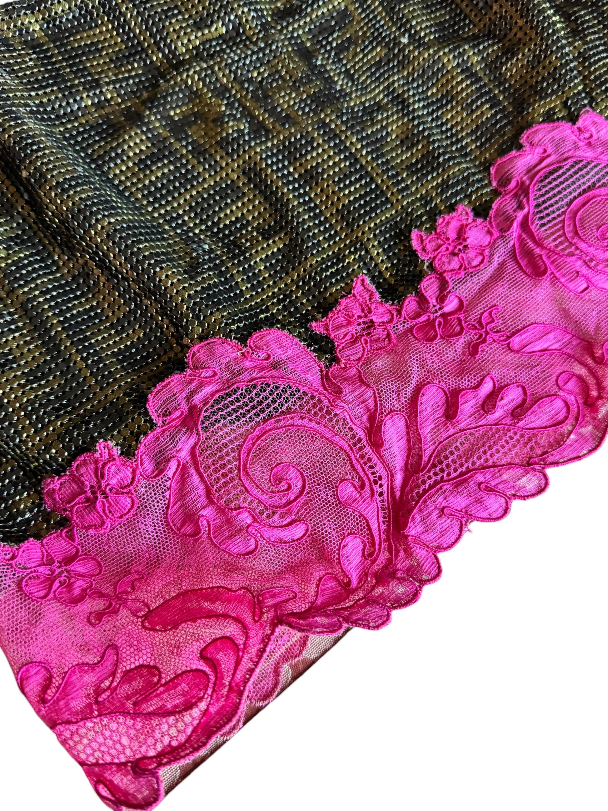 Un capo statement dal forte impatto visivo, caratterizzato da una superficie metallizzata con motivo geometrico e da una raffinata applicazione in pizzo rosa a contrasto sul fondo.