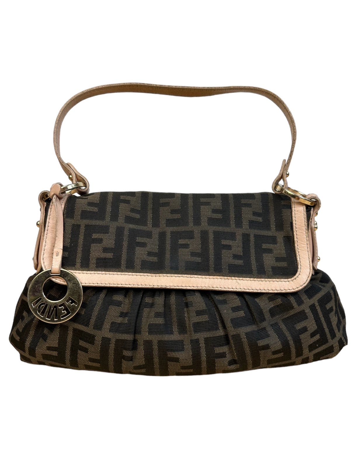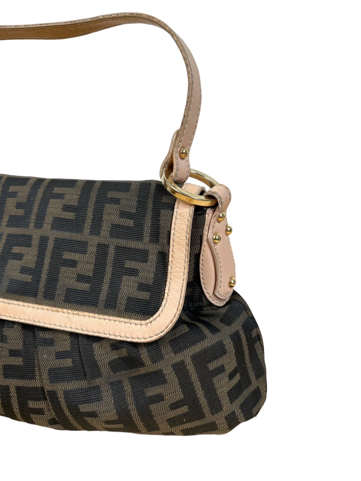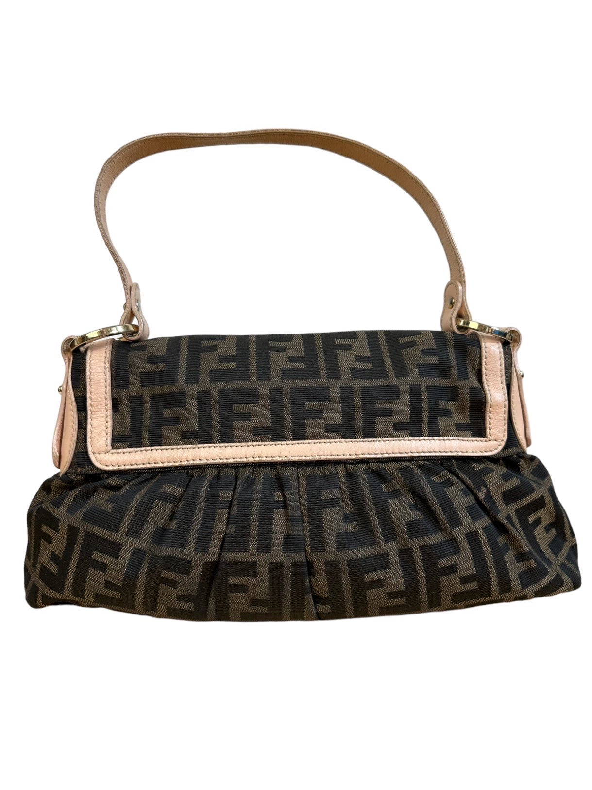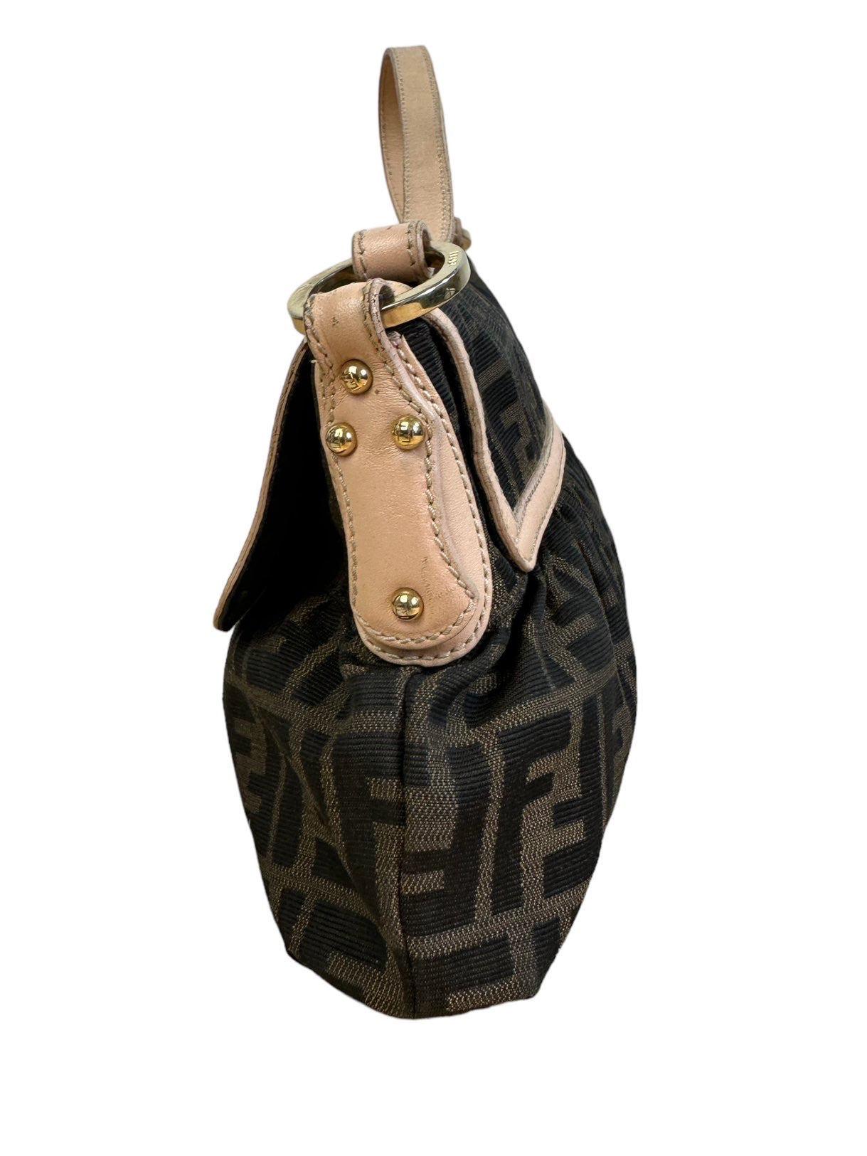 Fendi chef vintage in tela monogram con profili e manico in pelle rosa antico, hardware in metallo dorato e chiusura con bottone a pressione. Misura media. Riporta un lieve segno sulla tela nella parte posteriore e all’interno.
