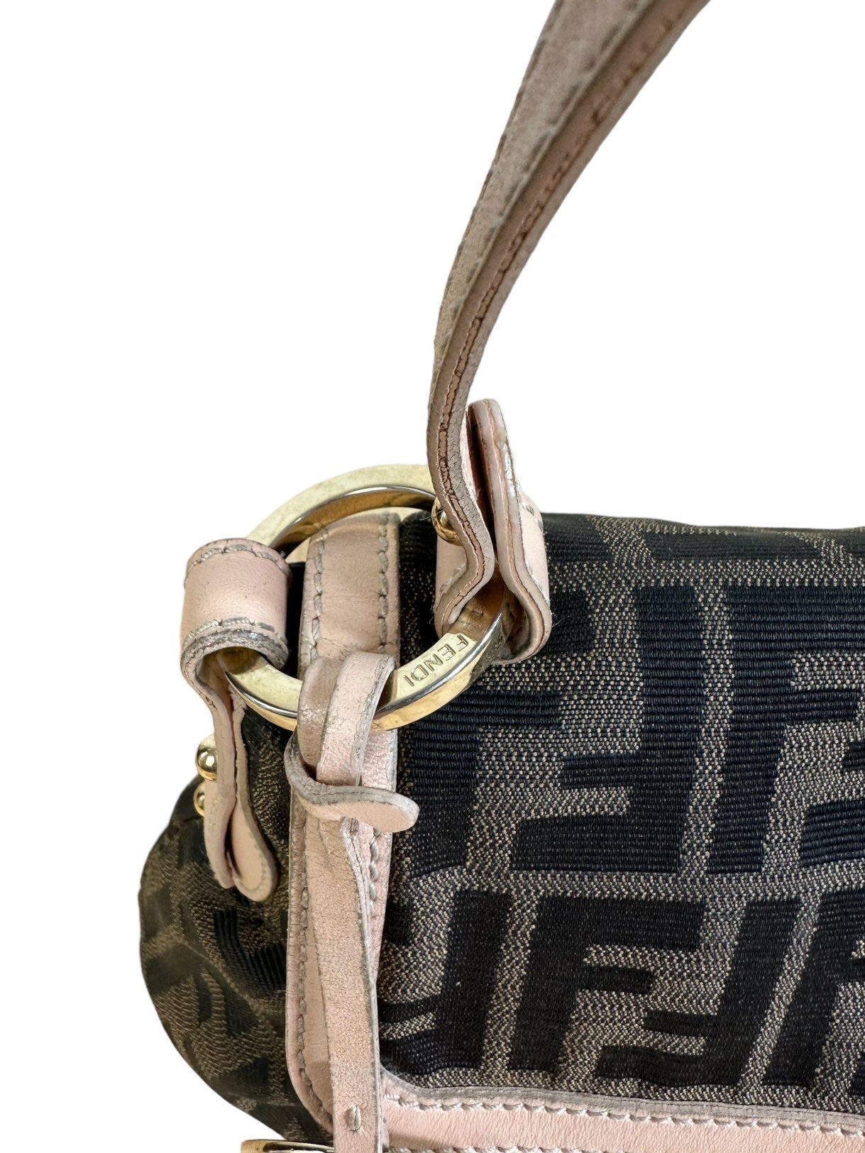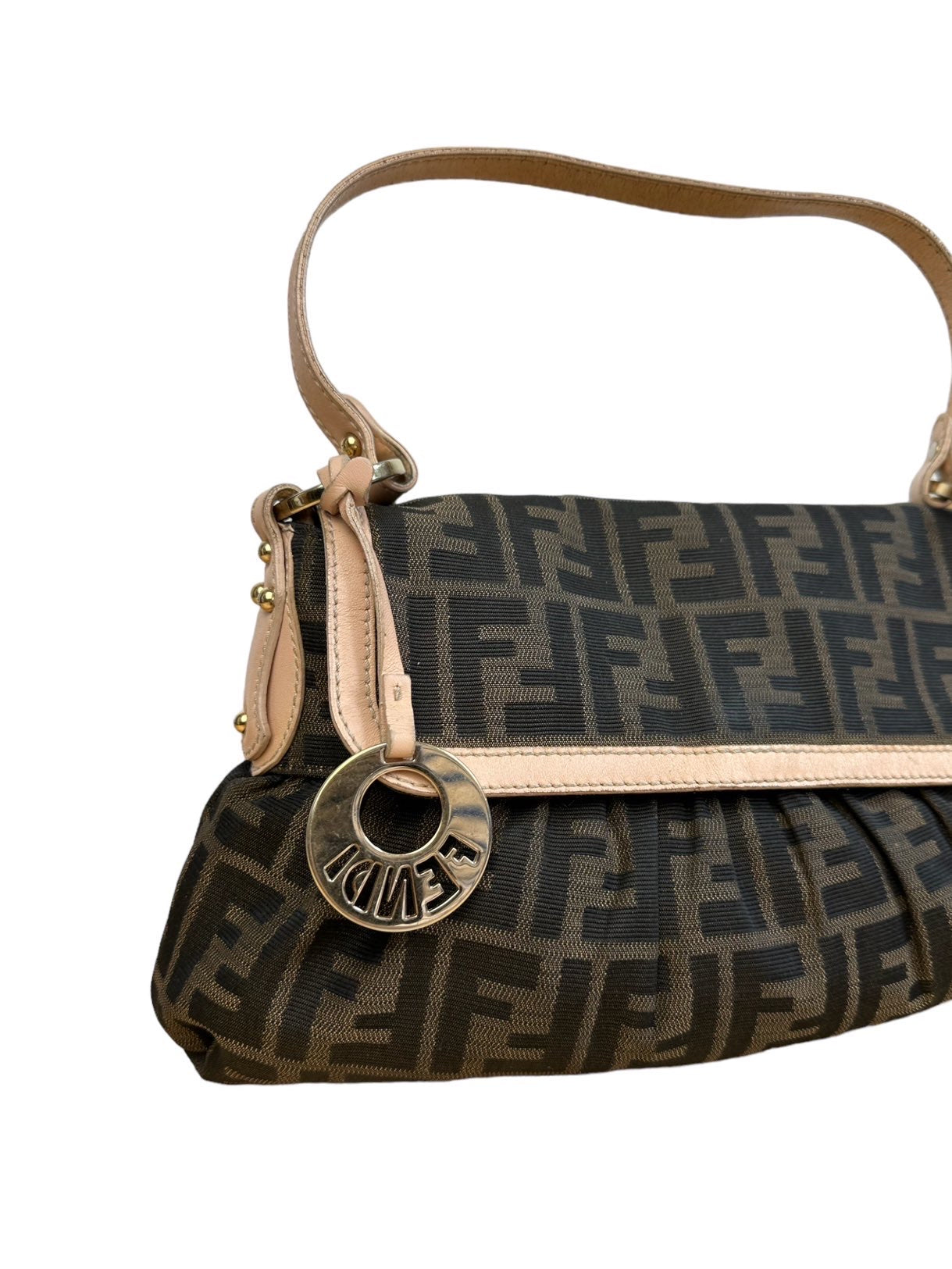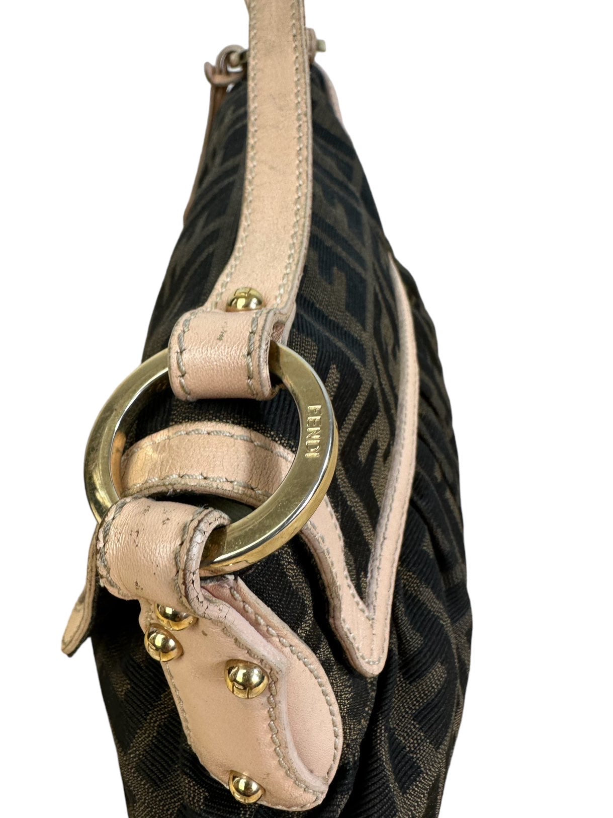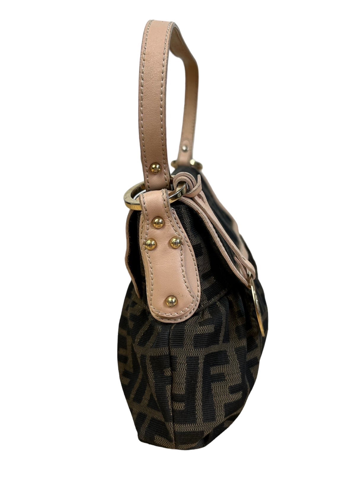 Fendi chef vintage in tela monogram con profili e manico in pelle rosa antico, hardware in metallo dorato e chiusura con bottone a pressione. Misura media. Riporta un lieve segno sulla tela nella parte posteriore e all’interno.
