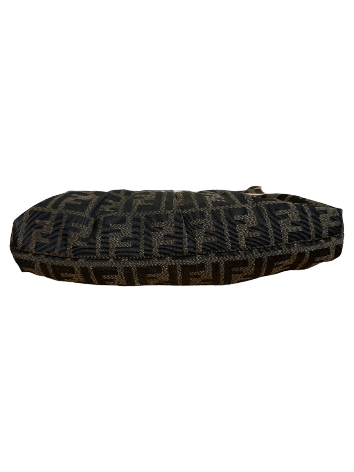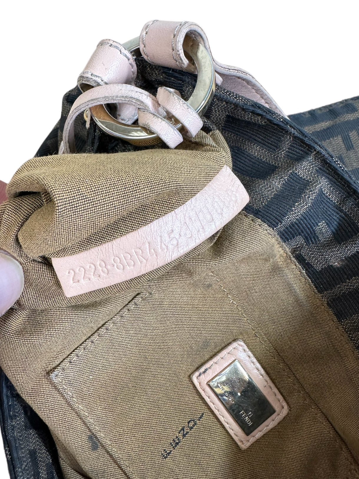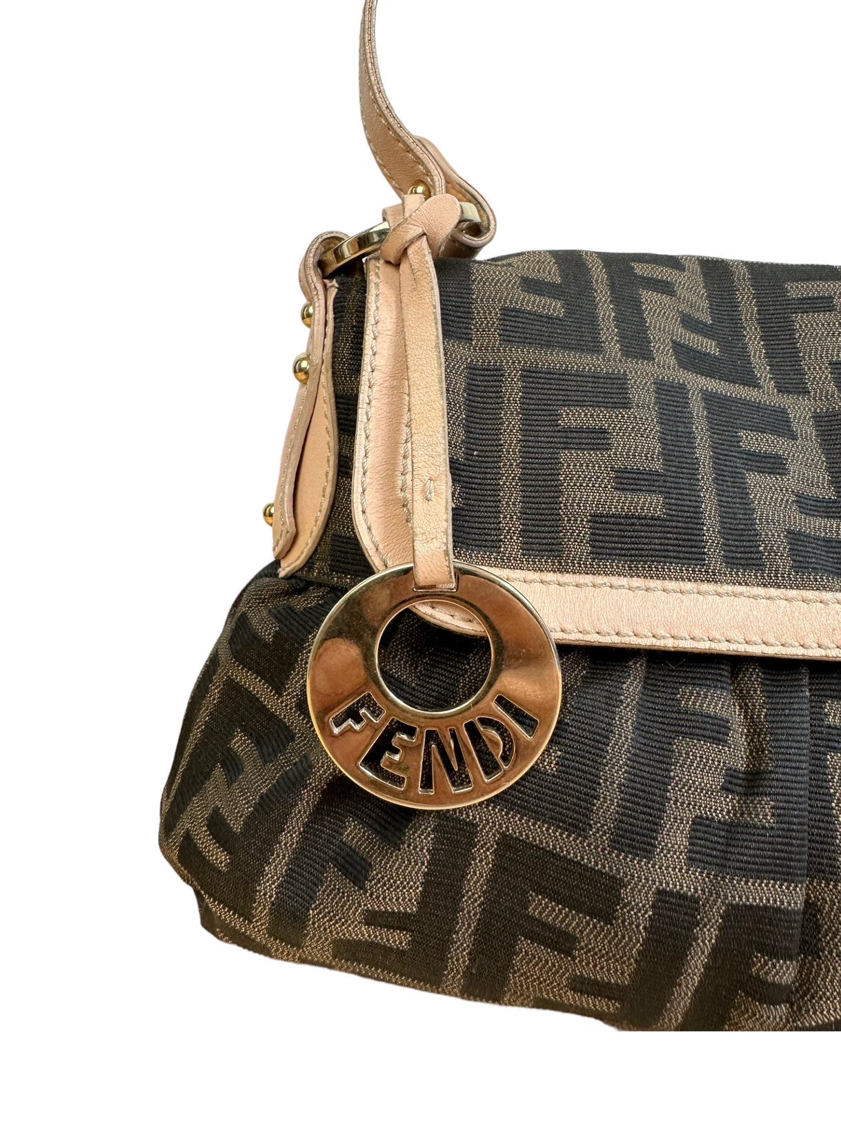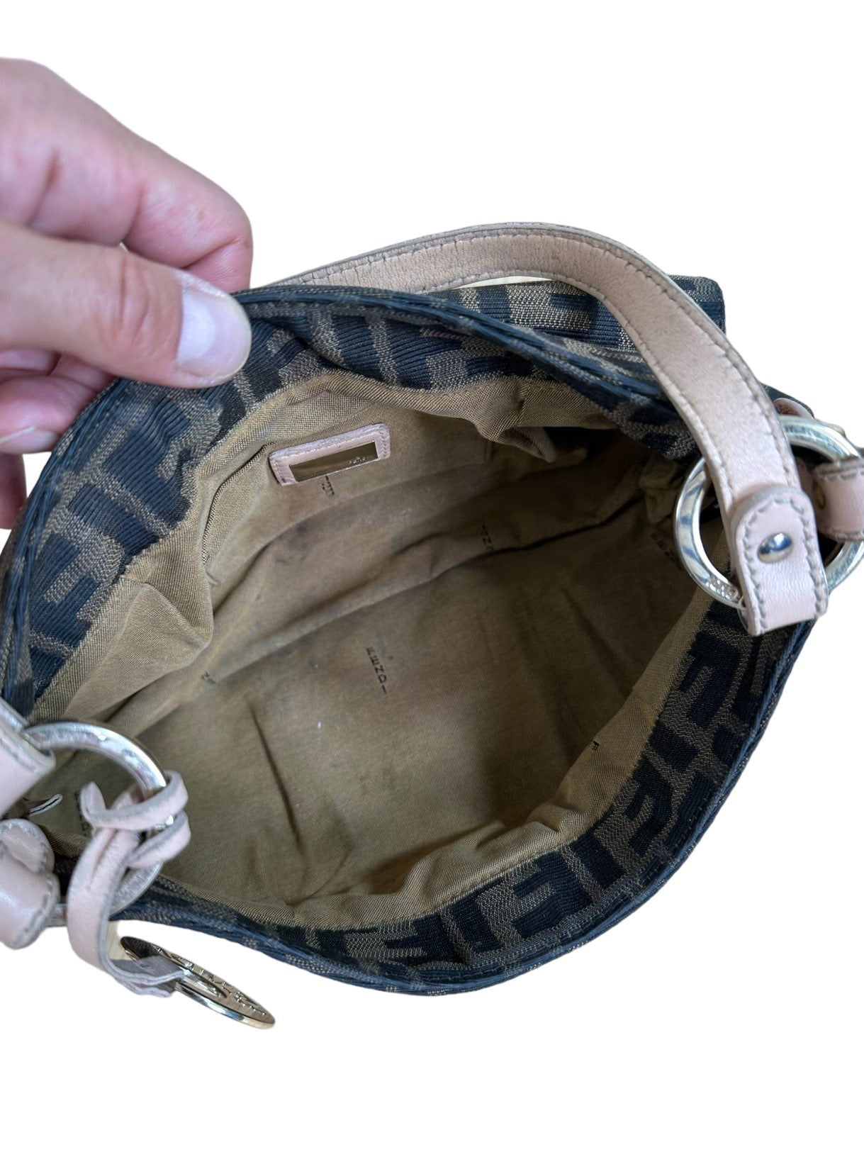 Fendi chef vintage in tela monogram con profili e manico in pelle rosa antico, hardware in metallo dorato e chiusura con bottone a pressione. Misura media. Riporta un lieve segno sulla tela nella parte posteriore e all’interno.