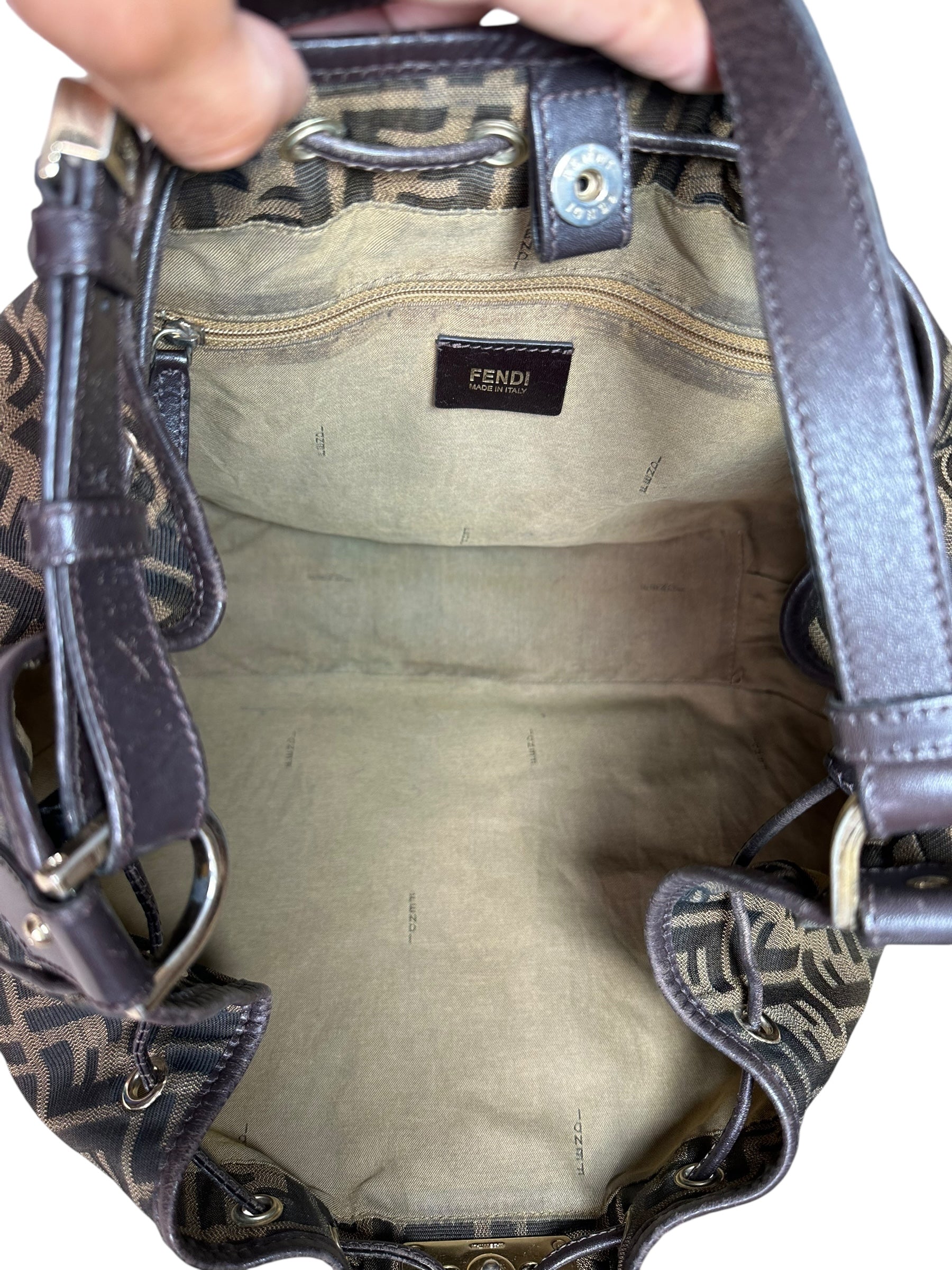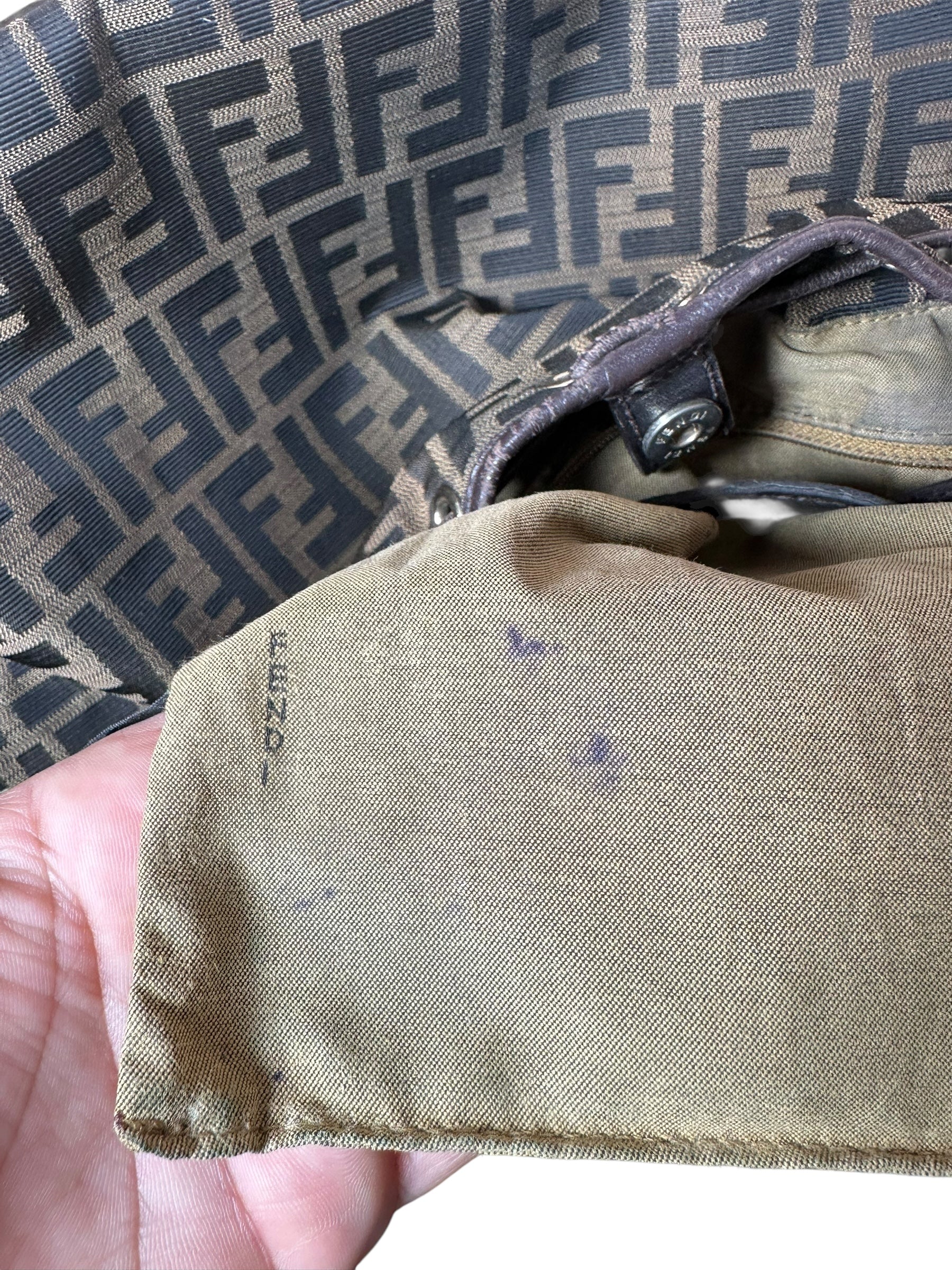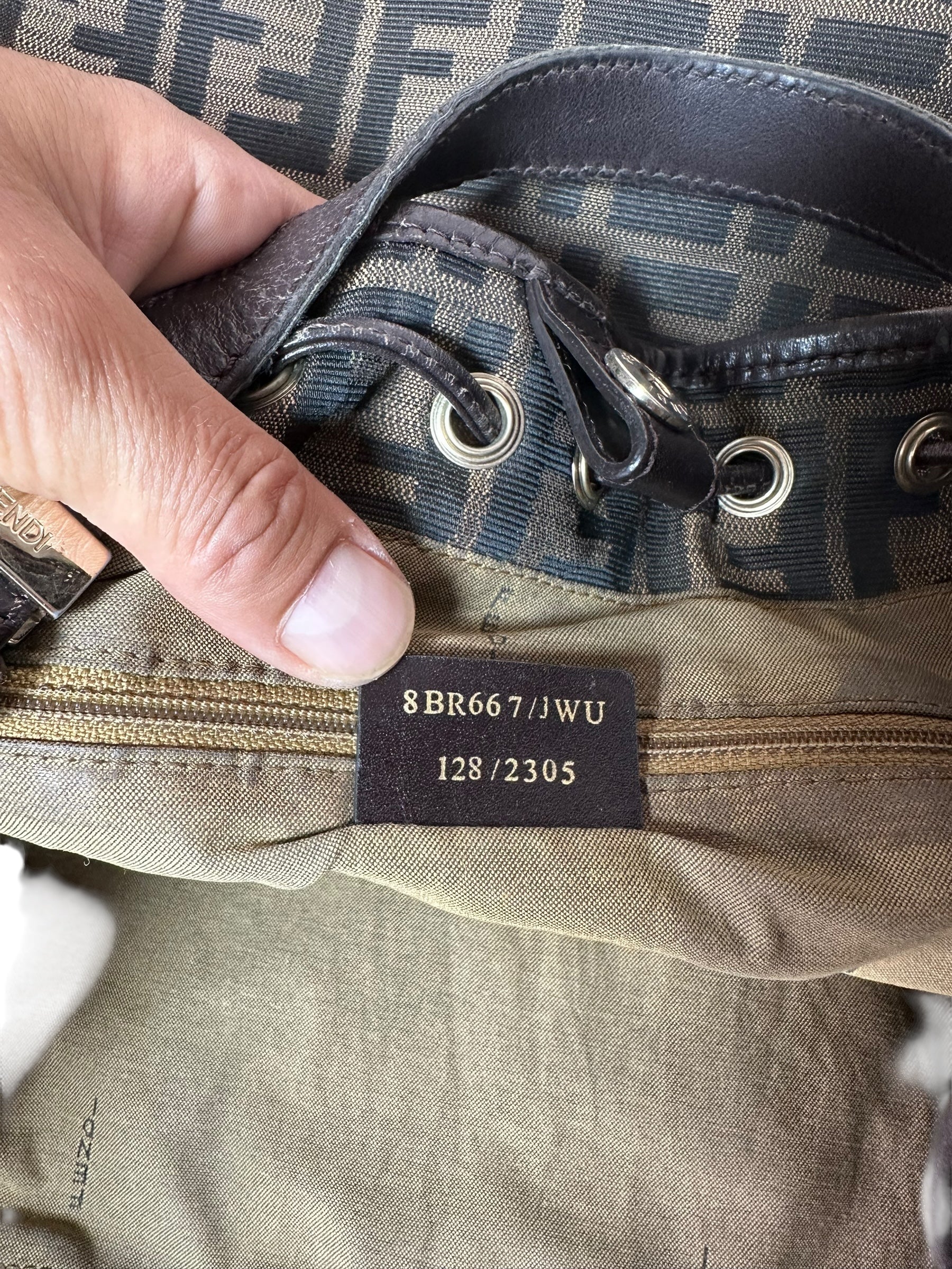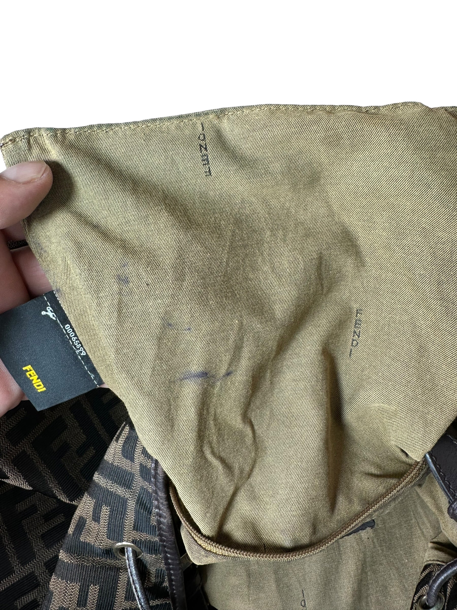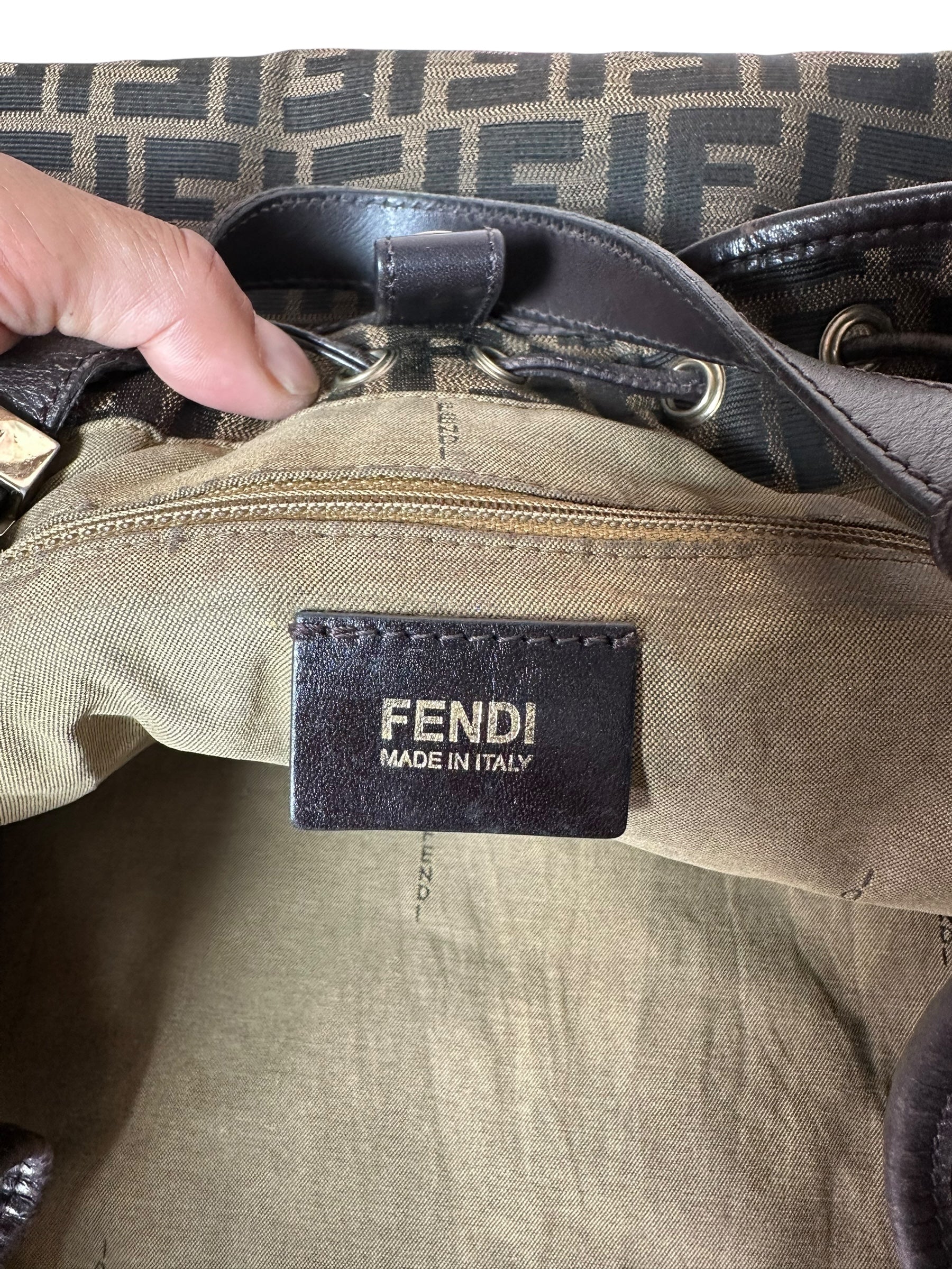 • Interno: foderato in tessuto con logo Fendi ripetuto, tasca interna con zip e etichetta in pelle “FENDI Made in Italy” con codice seriale.