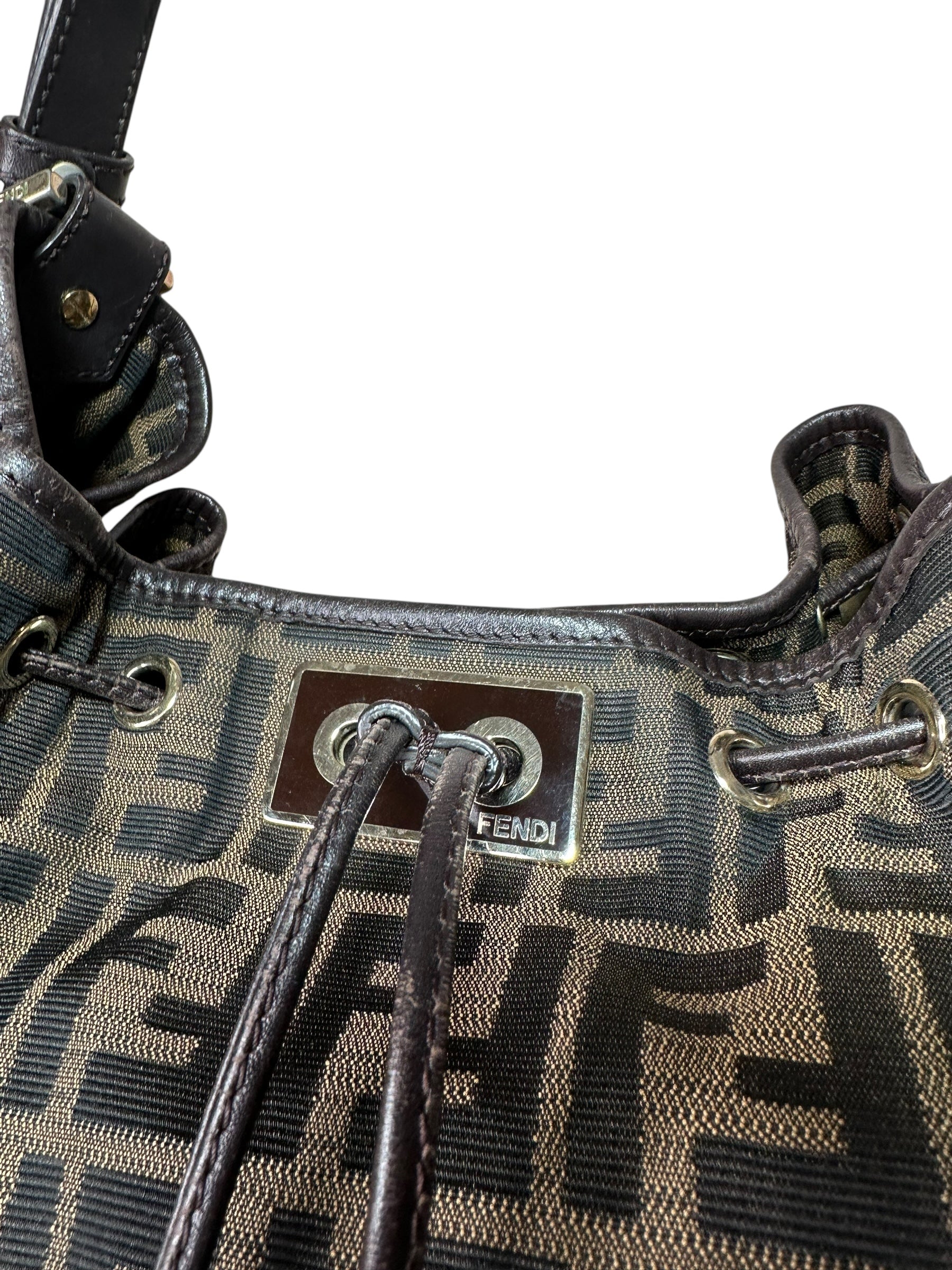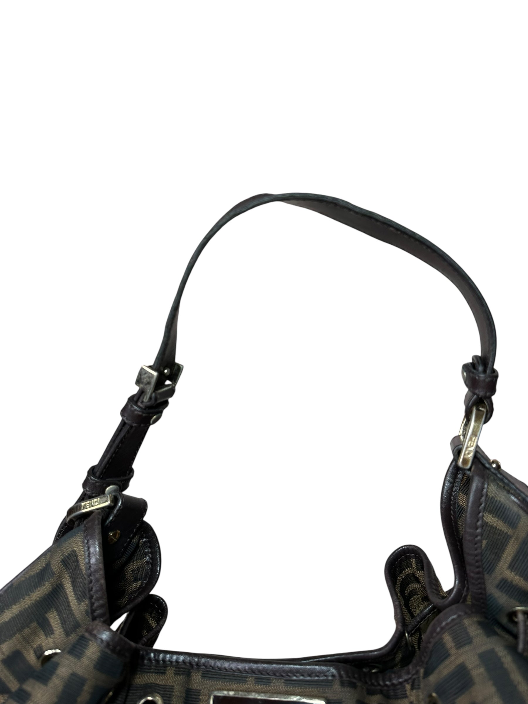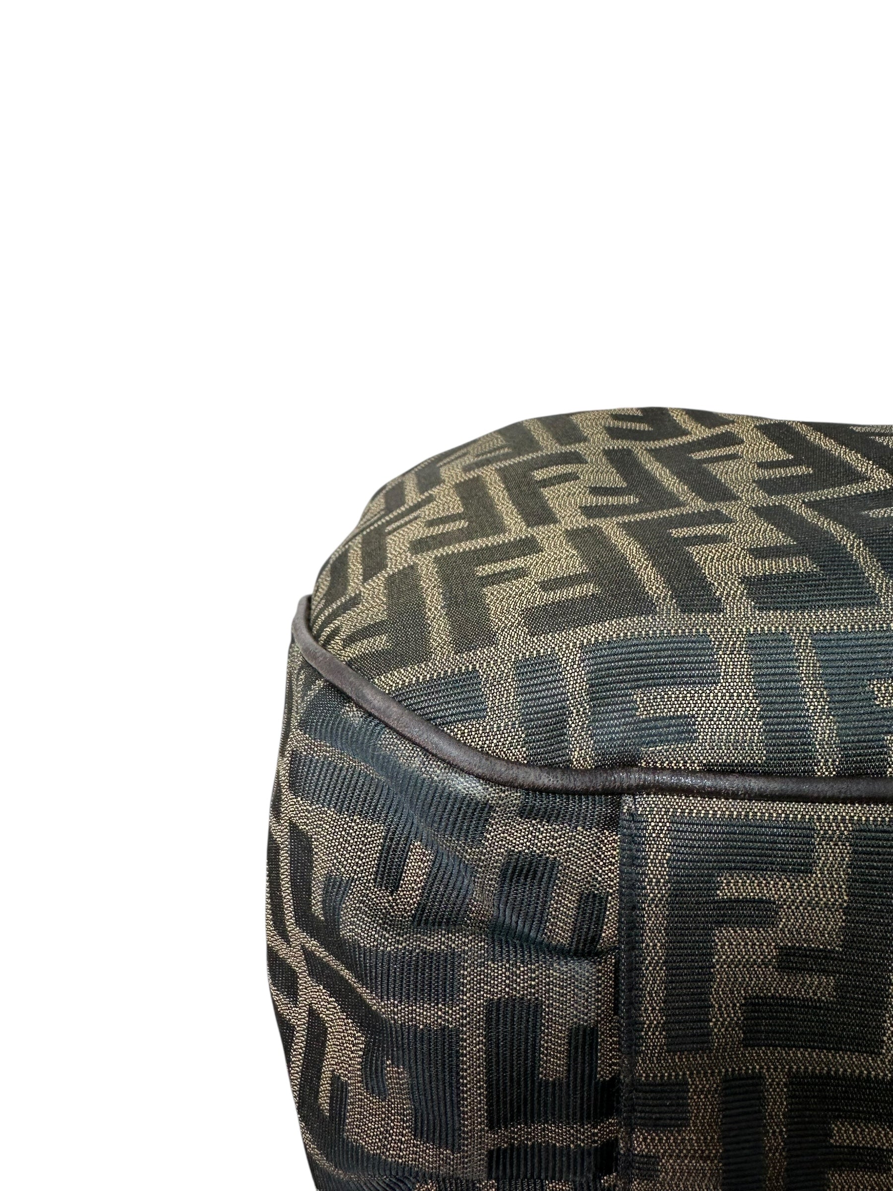 • Materiali: tela jacquard monogram FF, inserti e profili in pelle marrone scuro, dettagli metallici dorati.
