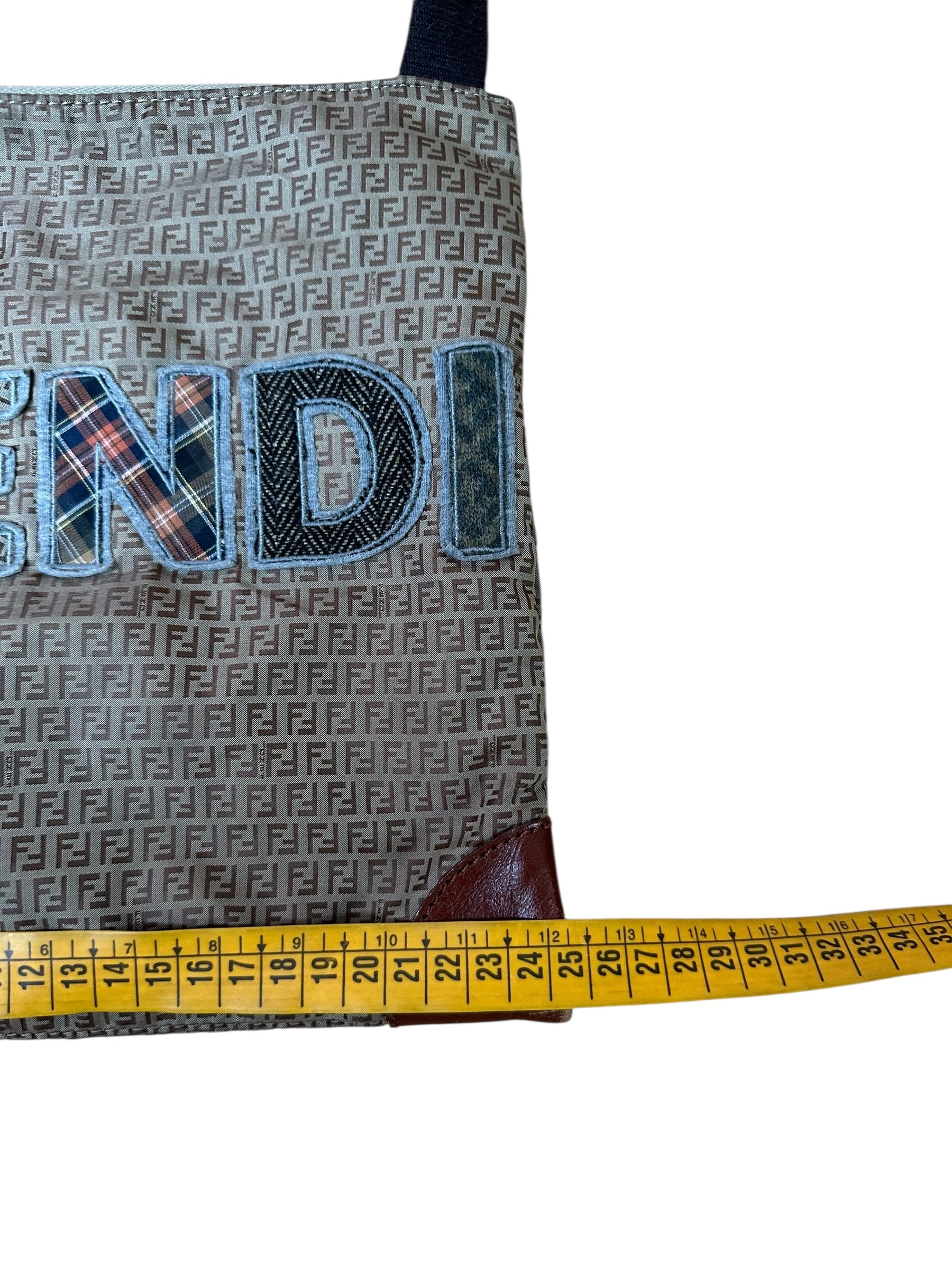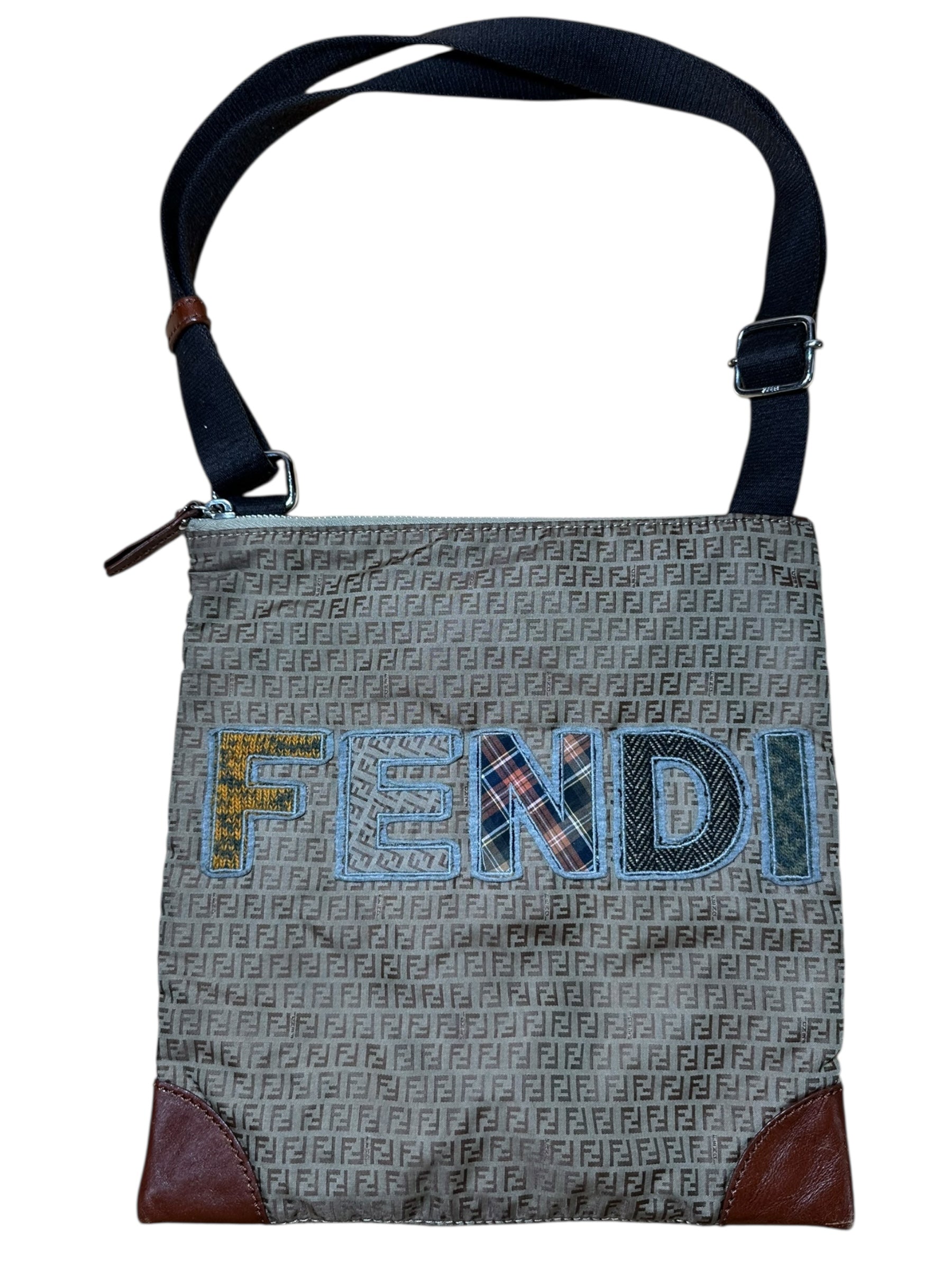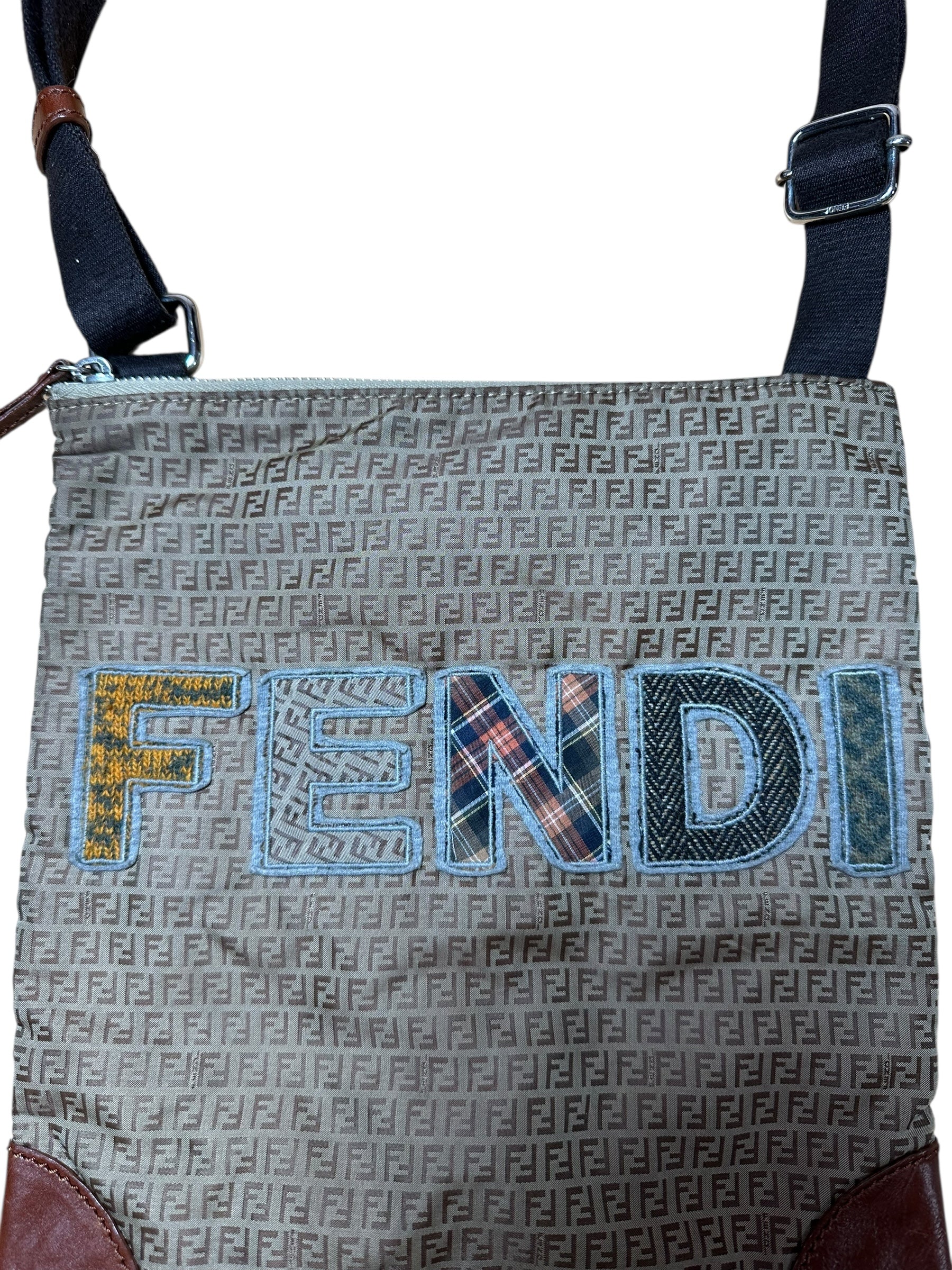 Borsa a tracolla Fendi vintage in classica tela Zucchino marrone con logo “FENDI” applicato in patchwork di tessuti a contrasto, tra cui denim, lana tartan e pied-de-poule. Il design è arricchito da angoli rinforzati in pelle marrone e da una tracolla in tessuto regolabile con inserti in pelle. Chiusura superiore con zip e interno foderato in tessuto, dotato di tasca con zip e cartellino in pelle con marchio e codice seriale (8BT184-GTA).