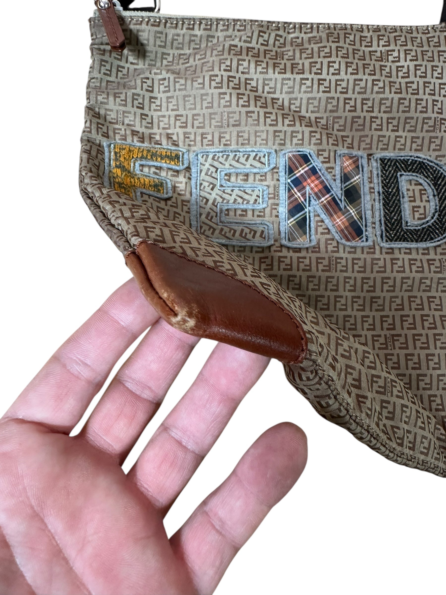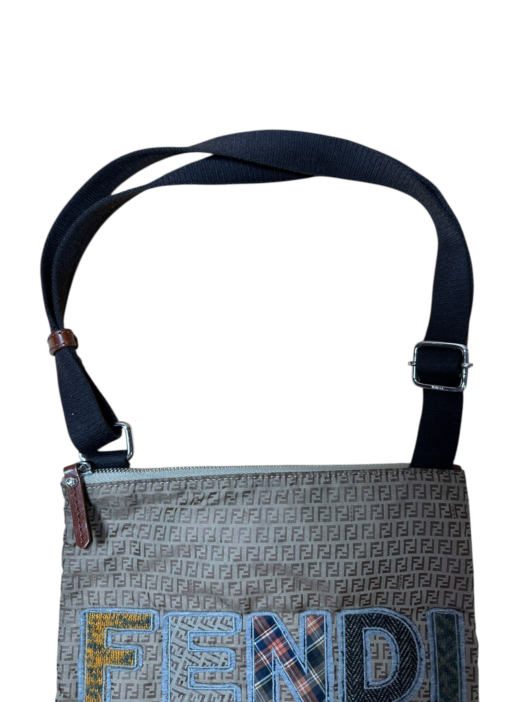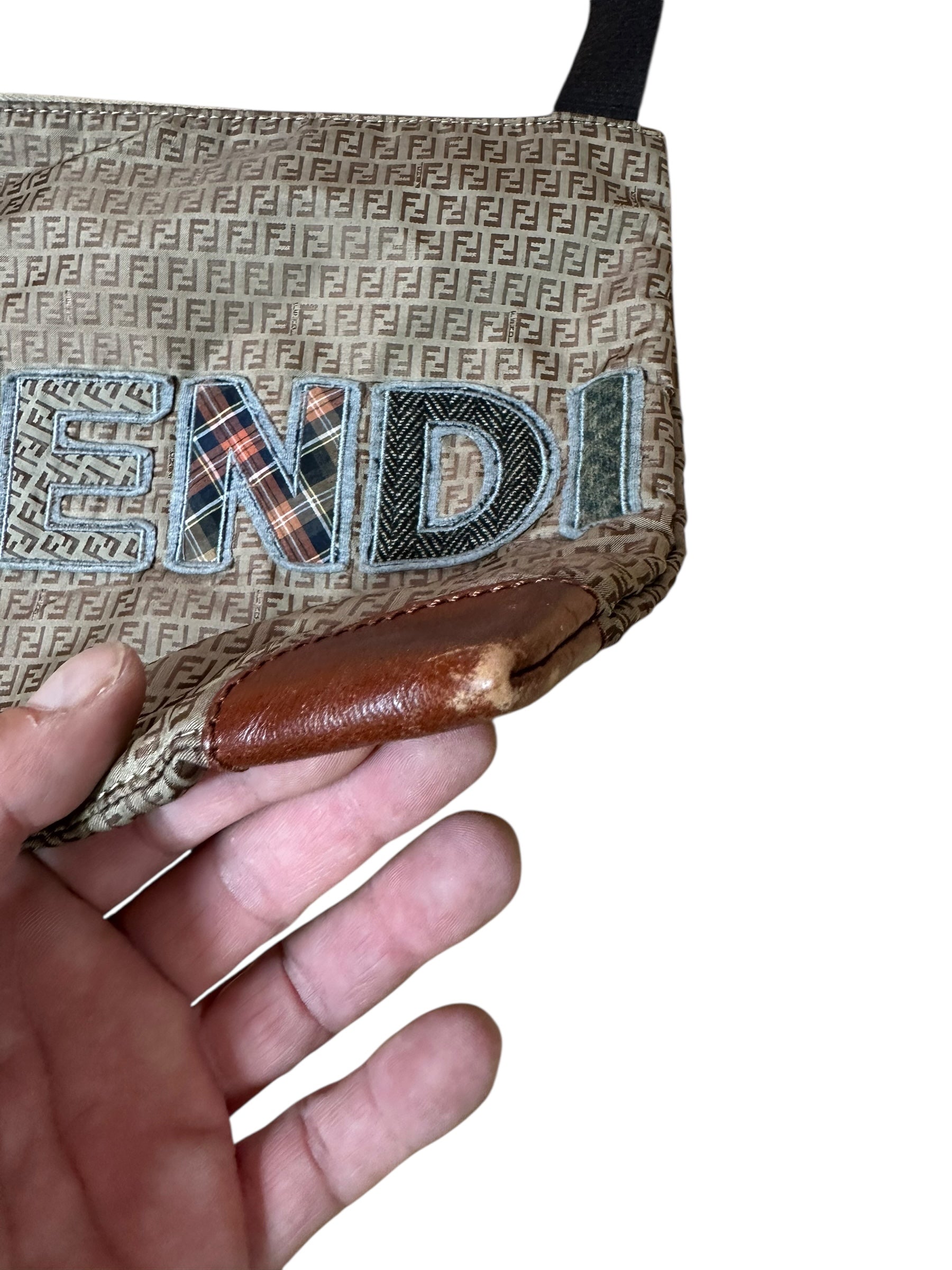Borsa a tracolla Fendi vintage in classica tela Zucchino marrone con logo “FENDI” applicato in patchwork di tessuti a contrasto, tra cui denim, lana tartan e pied-de-poule. Il design è arricchito da angoli rinforzati in pelle marrone e da una tracolla in tessuto regolabile con inserti in pelle. Chiusura superiore con zip e interno foderato in tessuto, dotato di tasca con zip e cartellino in pelle con marchio e codice seriale (8BT184-GTA).