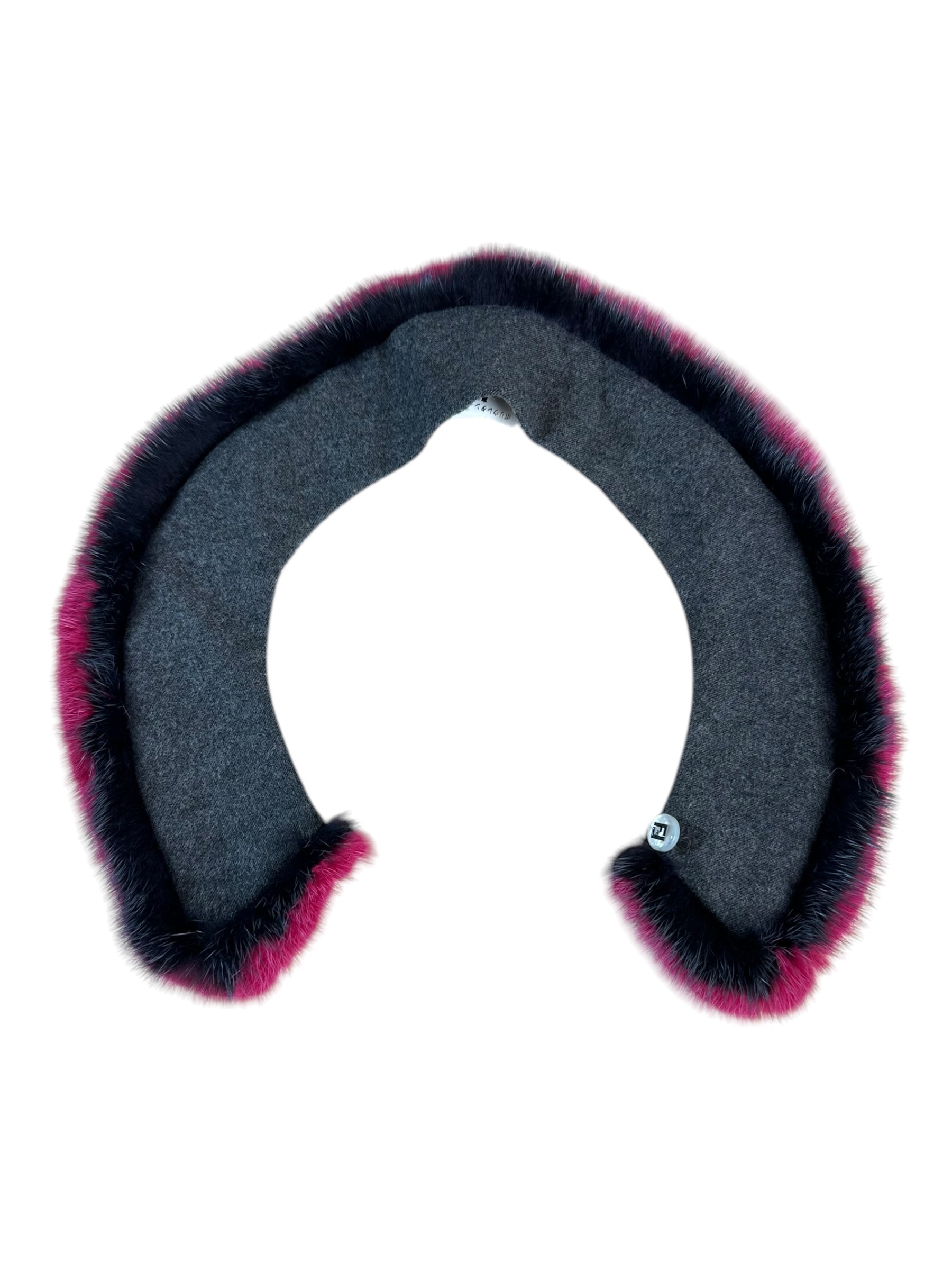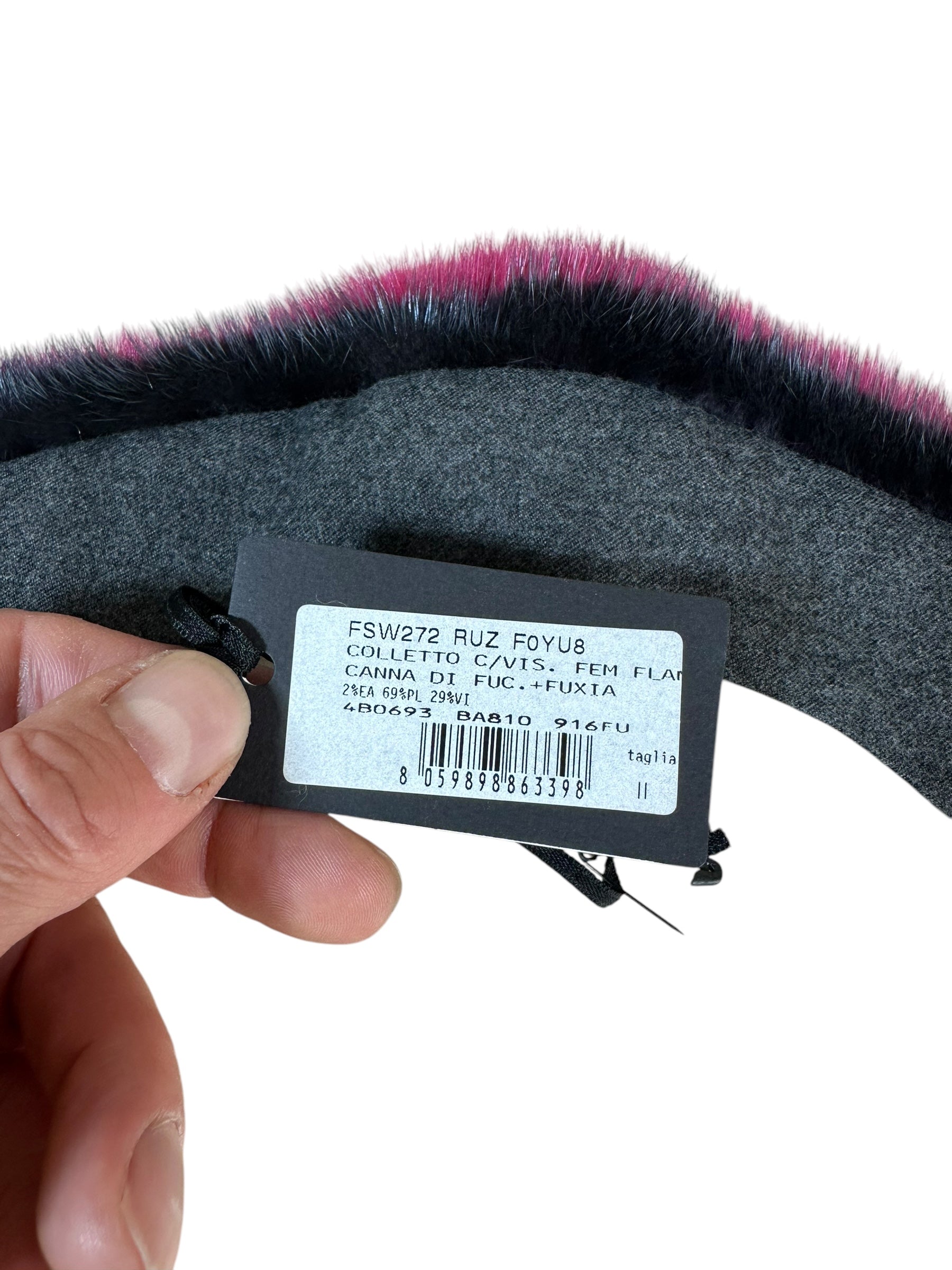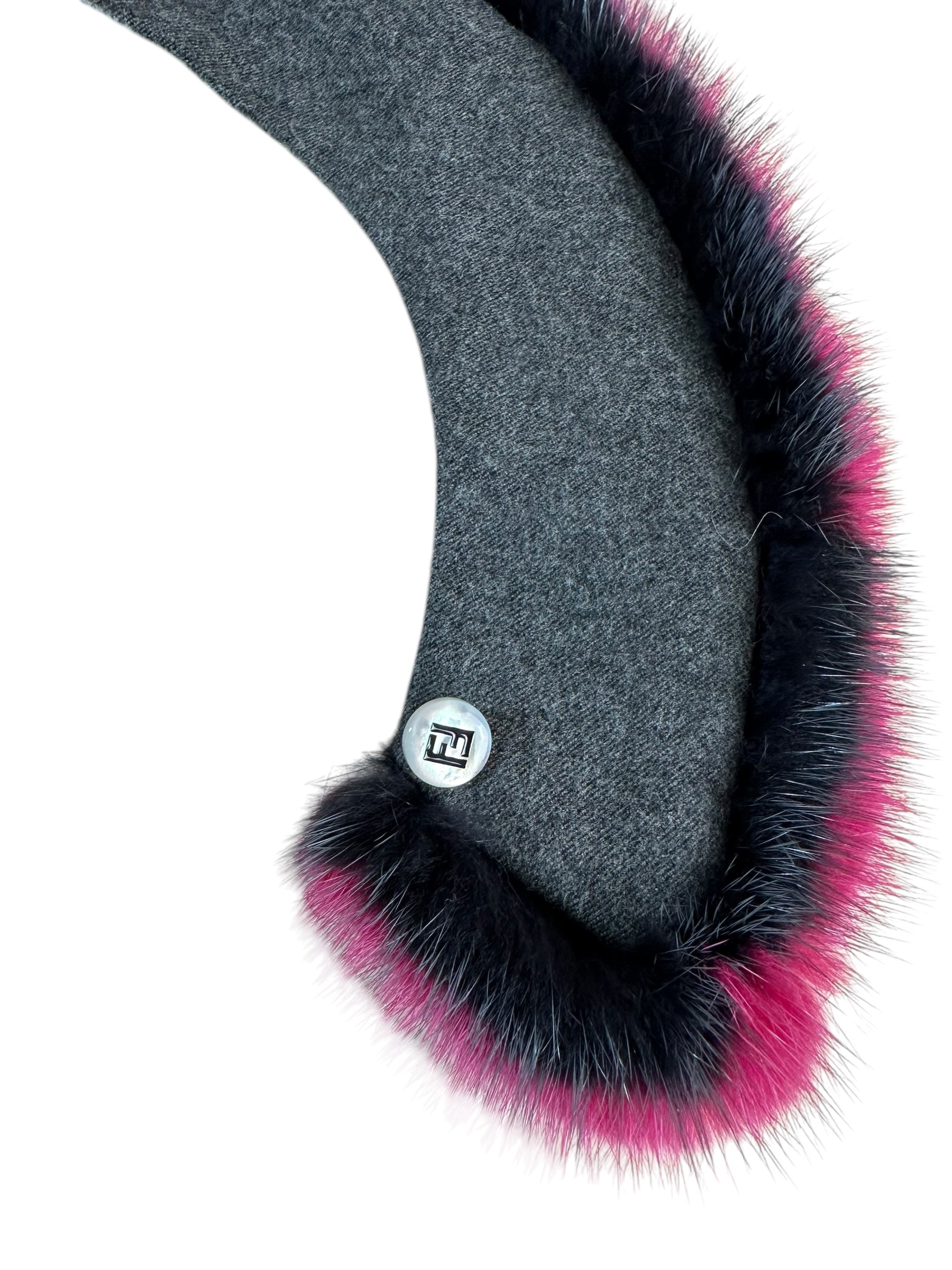 Fendi colletto in visone, è un accessorio sofisticato che combina materiali di alta qualità e design contemporaneo. È realizzato in tessuto grigio scuro con un bordo in visone pregiato, che aggiunge un tocco di lusso e morbidezza. Il bordo in visone presenta una colorazione a contrasto, alternando il nero con accenti di rosa intenso, creando un effetto visivo accattivante e moderno.