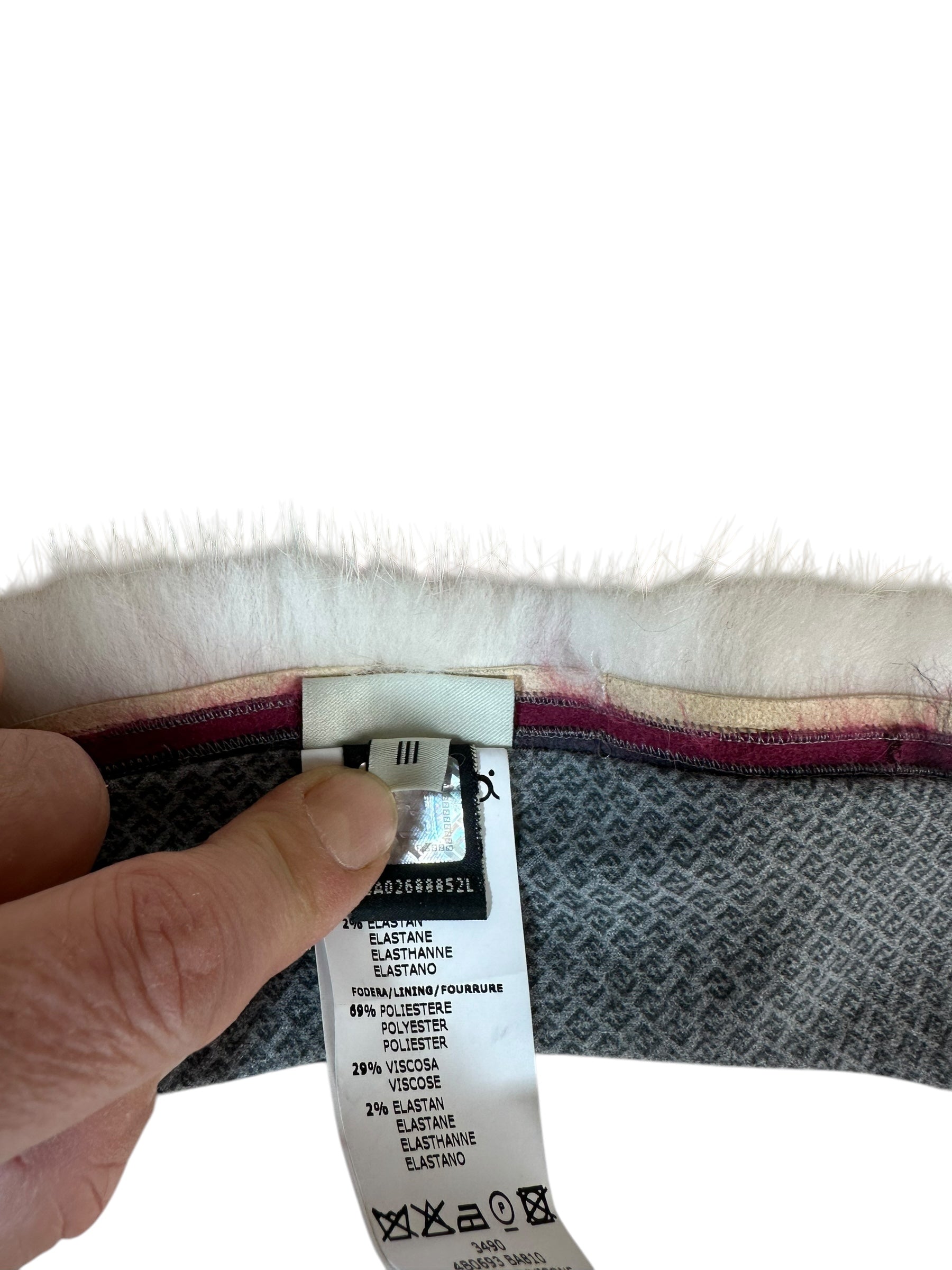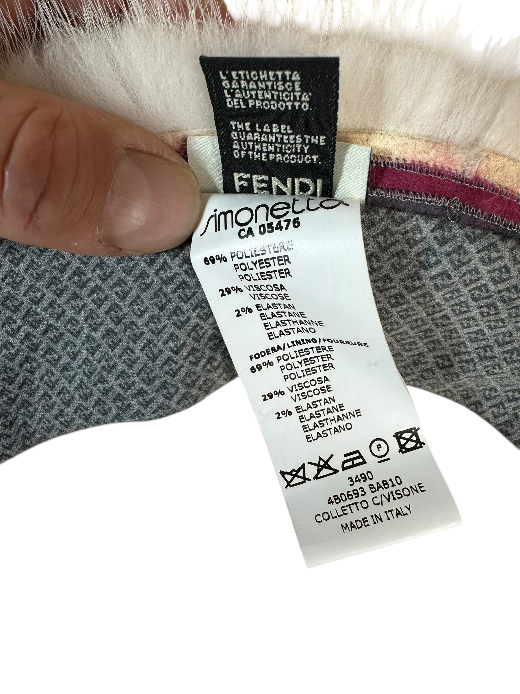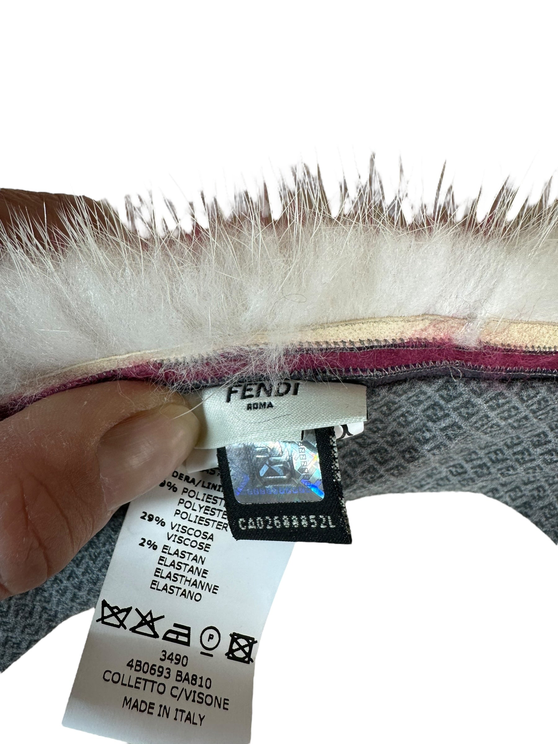 Fendi colletto in visone, è un accessorio sofisticato che combina materiali di alta qualità e design contemporaneo. È realizzato in tessuto grigio scuro con un bordo in visone pregiato, che aggiunge un tocco di lusso e morbidezza. Il bordo in visone presenta una colorazione a contrasto, alternando il nero con accenti di rosa intenso, creando un effetto visivo accattivante e moderno.