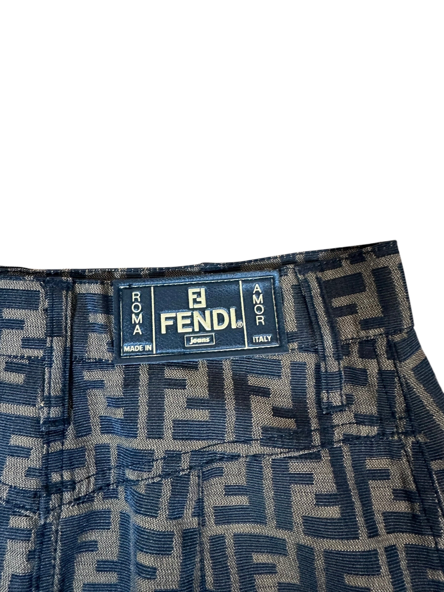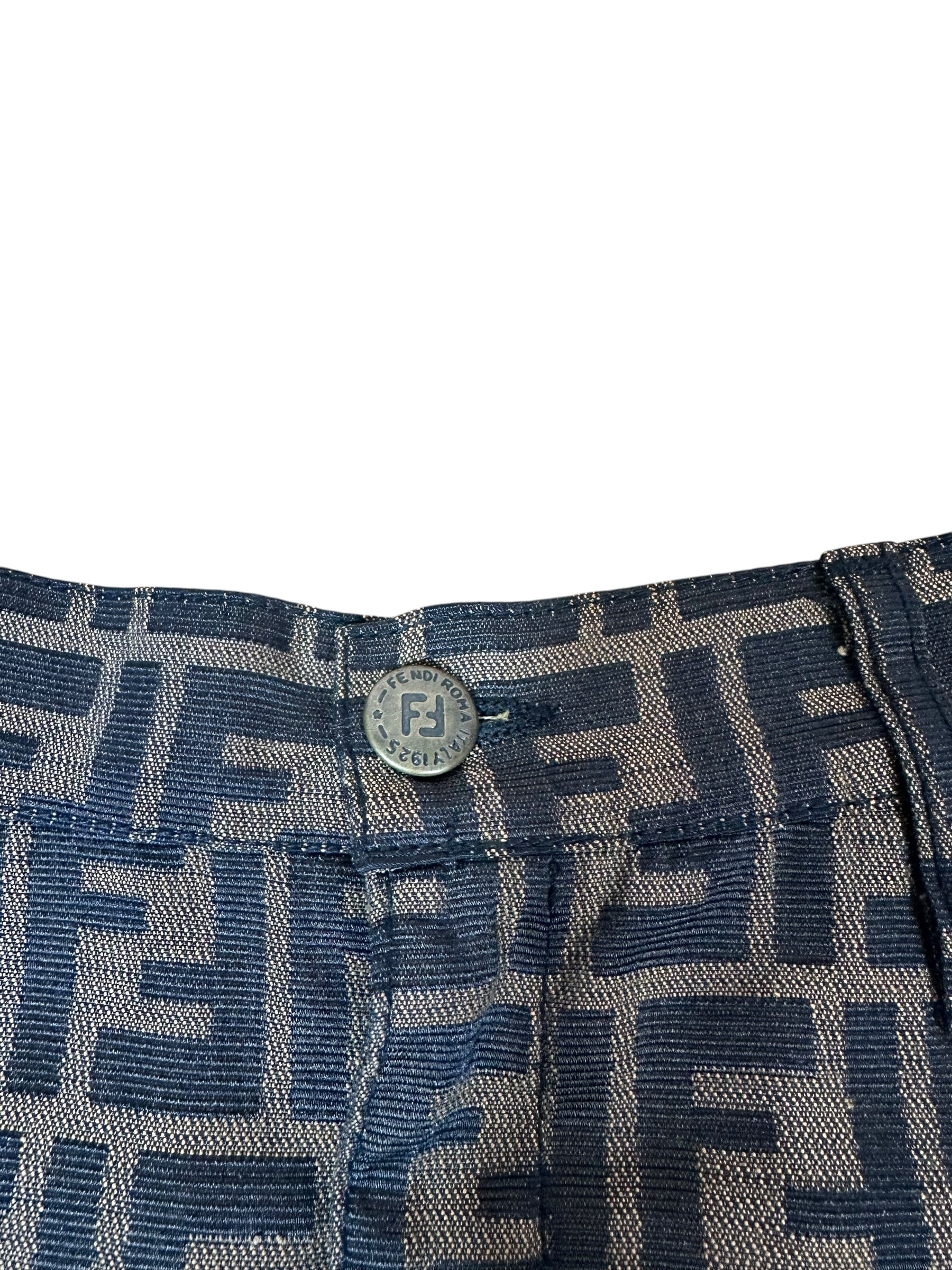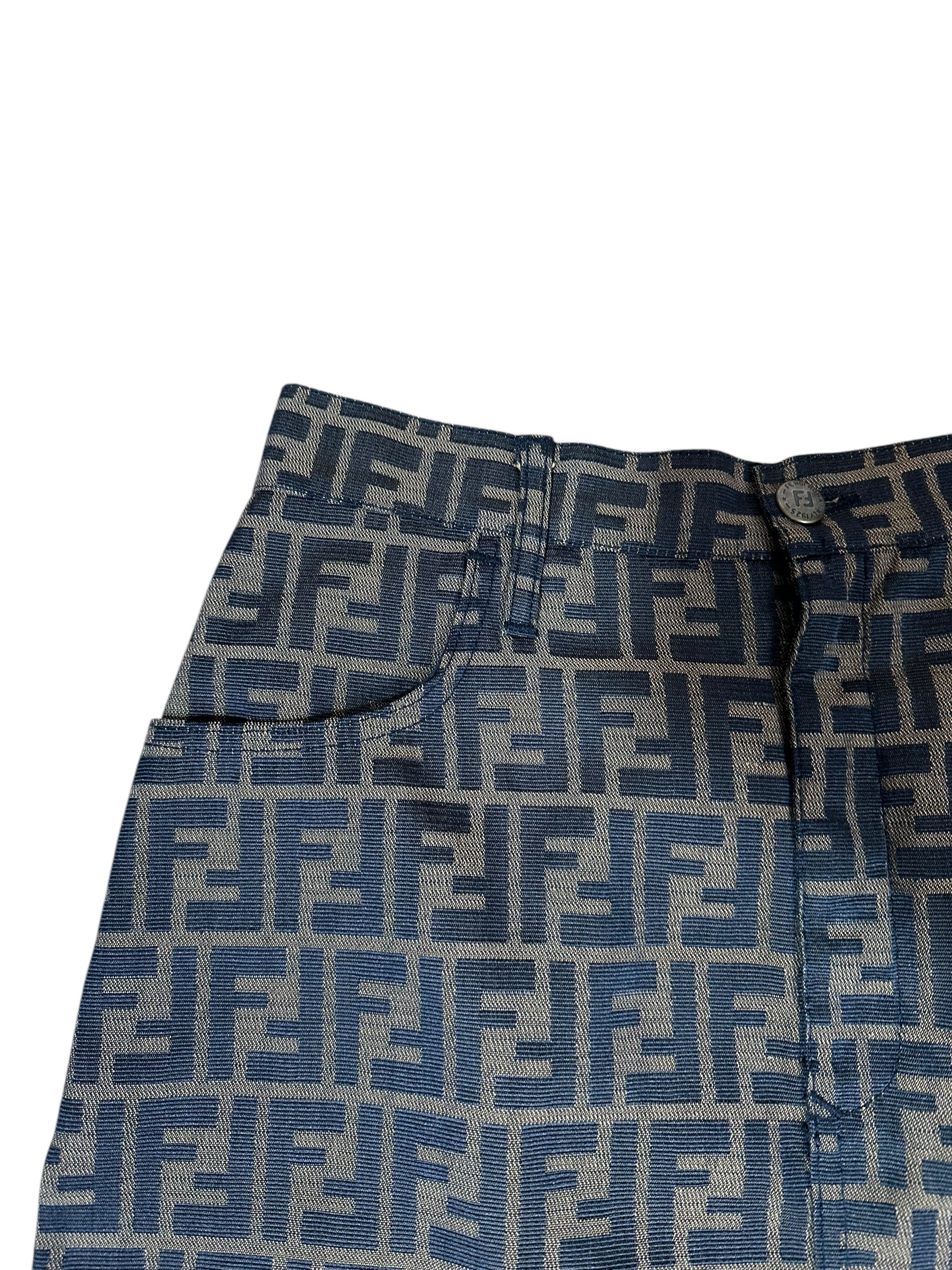 • Materiale: Denim jacquard di alta qualità con motivo monogram FF all-over, tonalità blu e beige.