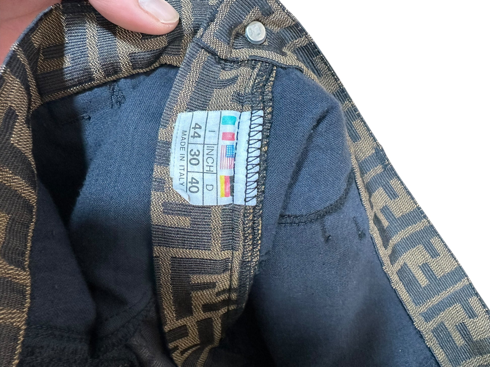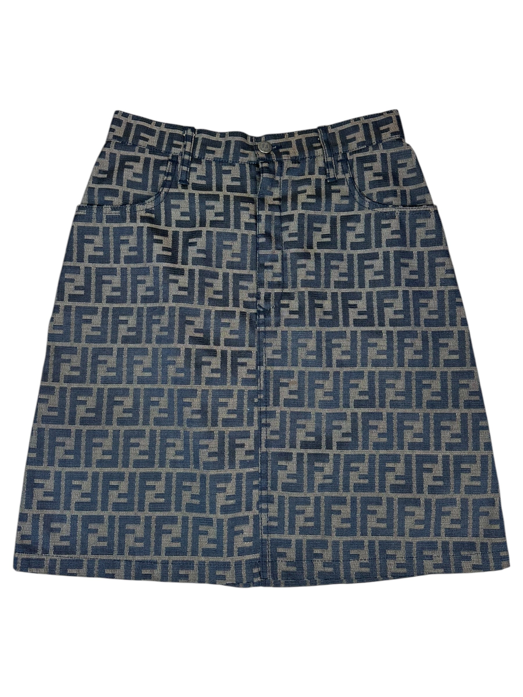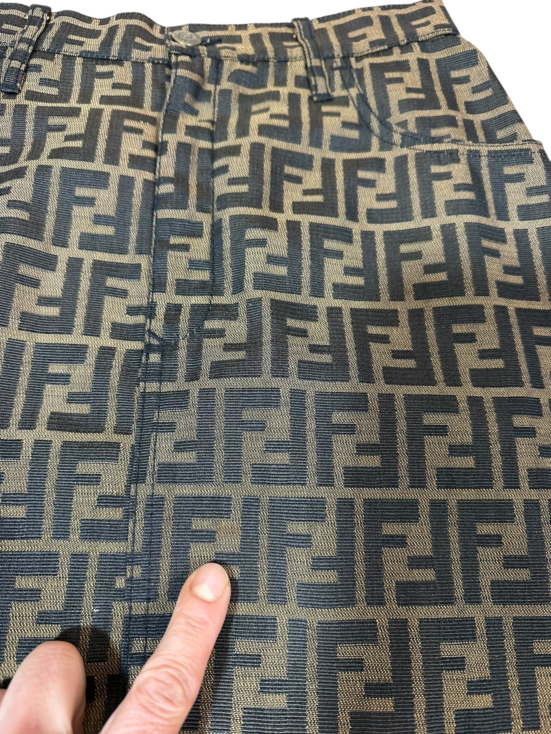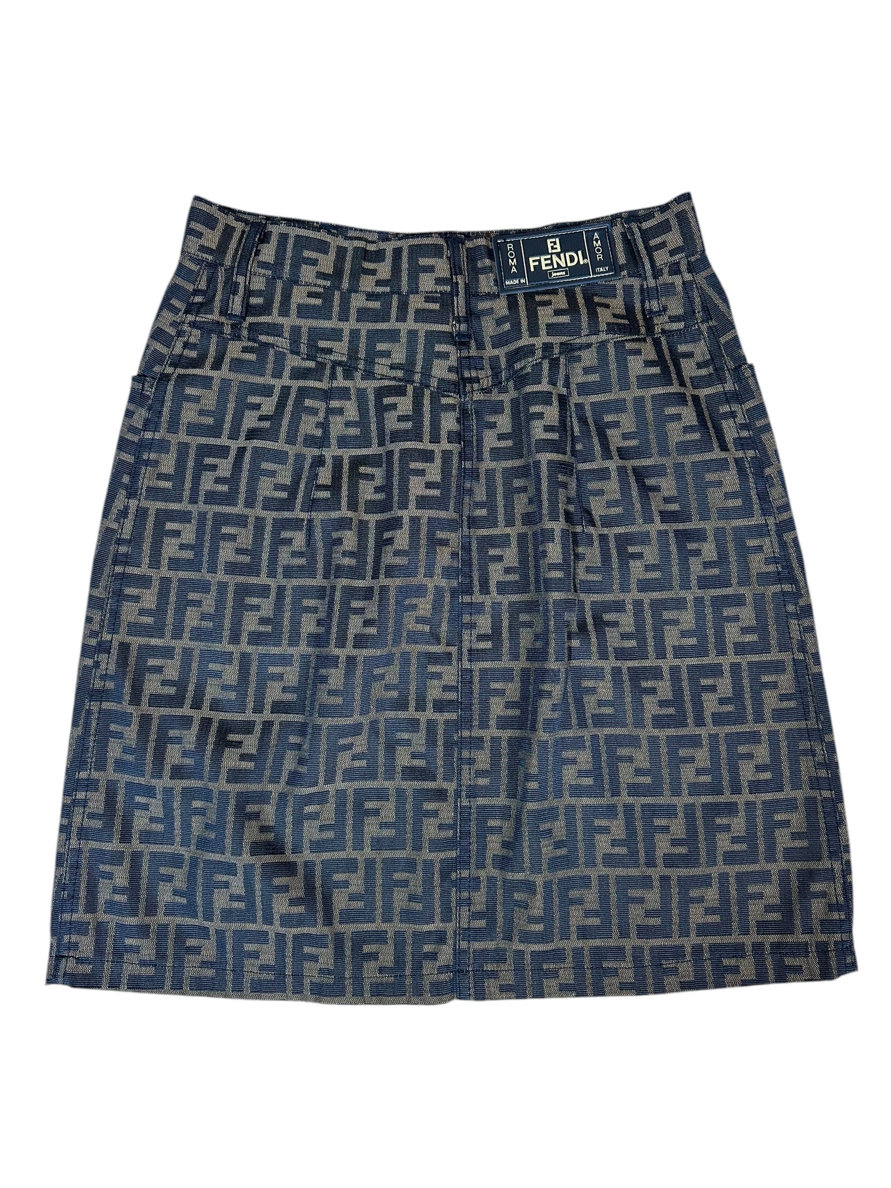 • Materiale: Denim jacquard di alta qualità con motivo monogram FF all-over, tonalità blu e beige.