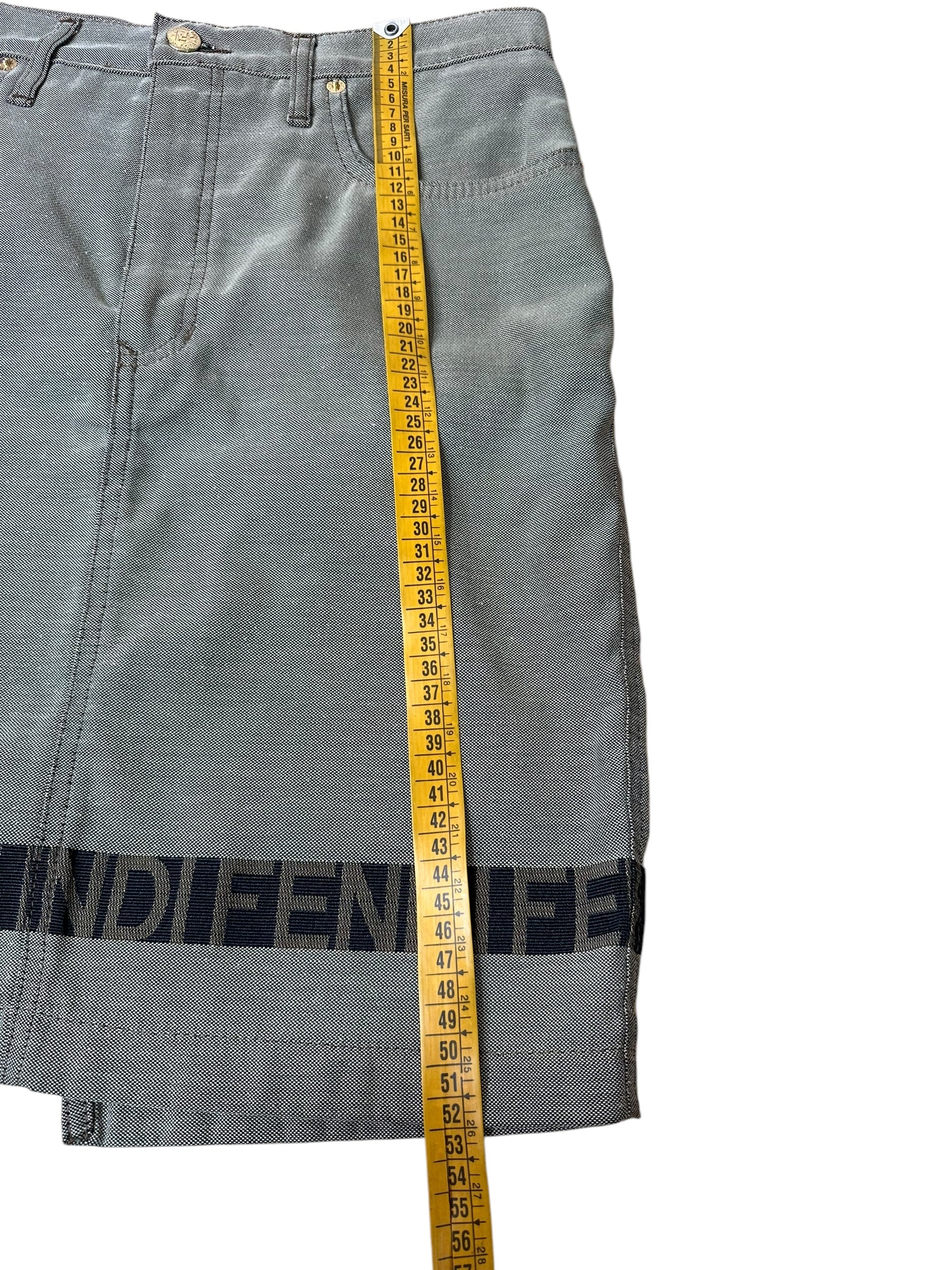 Dal design pulito ma distintivo, questa gonna Fendi Jeans incarna lo stile anni ’90 della maison romana, con una linea dritta e strutturata che valorizza la figura. Realizzata in resistente denim di cotone, presenta una nuance sabbia chiaro con effetto puntinato, impreziosita dal logo “FENDI” ripetuto a fascia nera sul fondo, che corre lungo tutto l’orlo anteriore e posteriore.