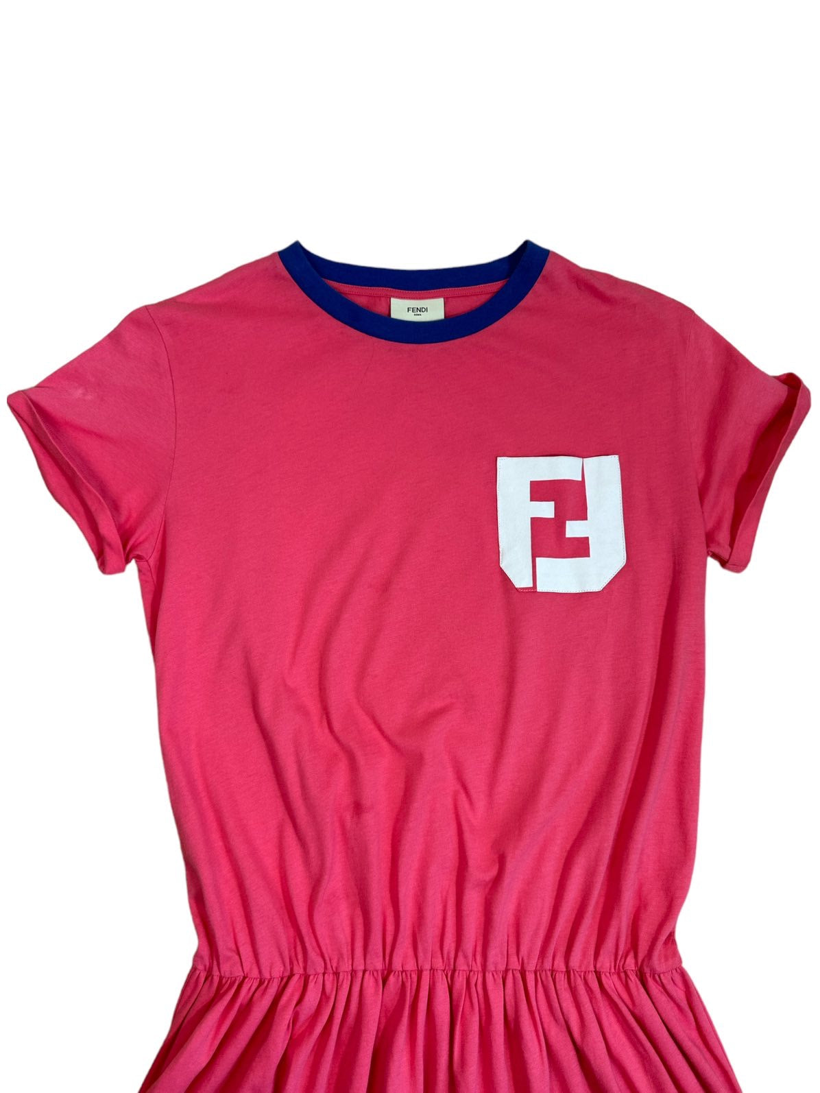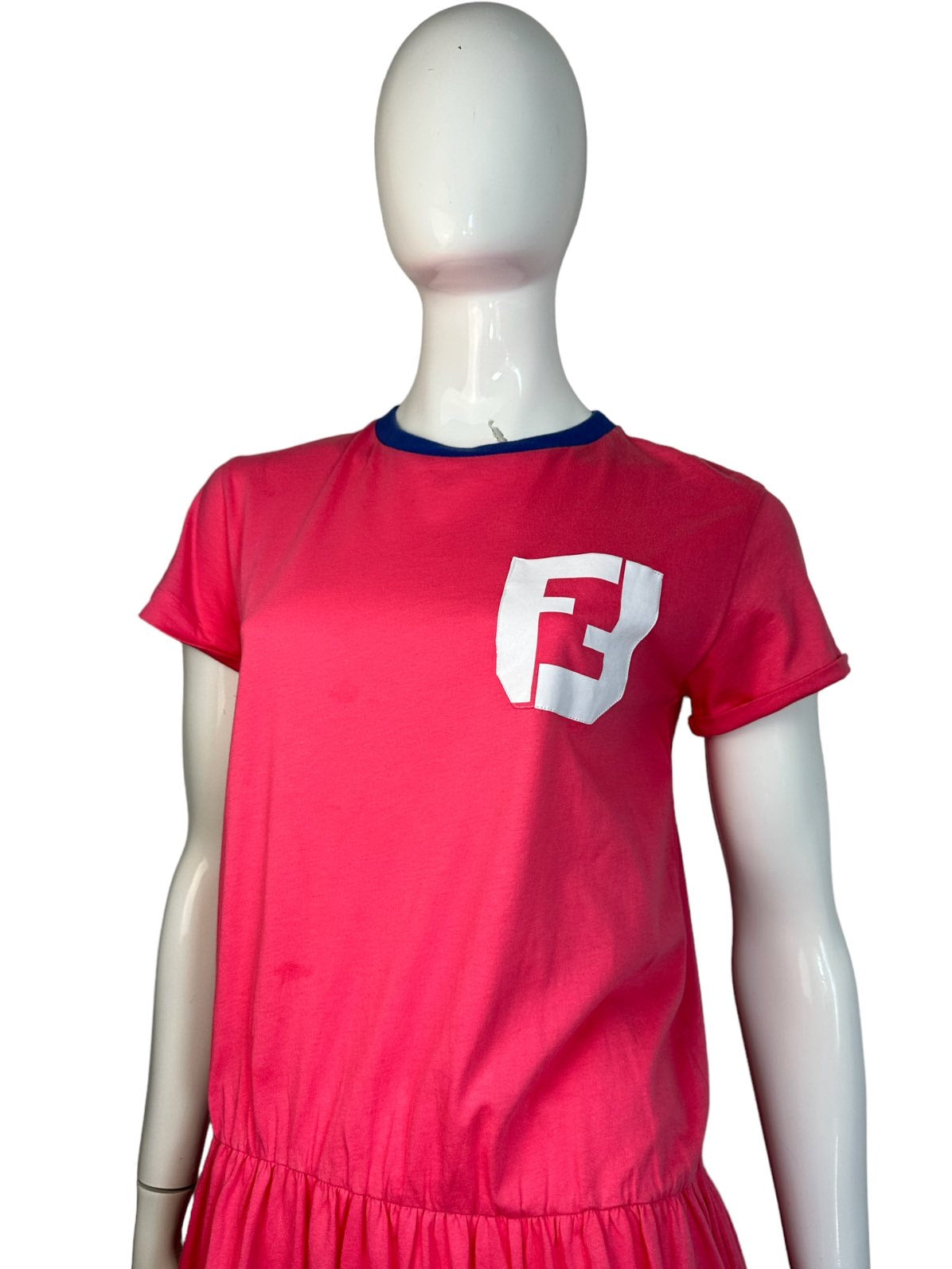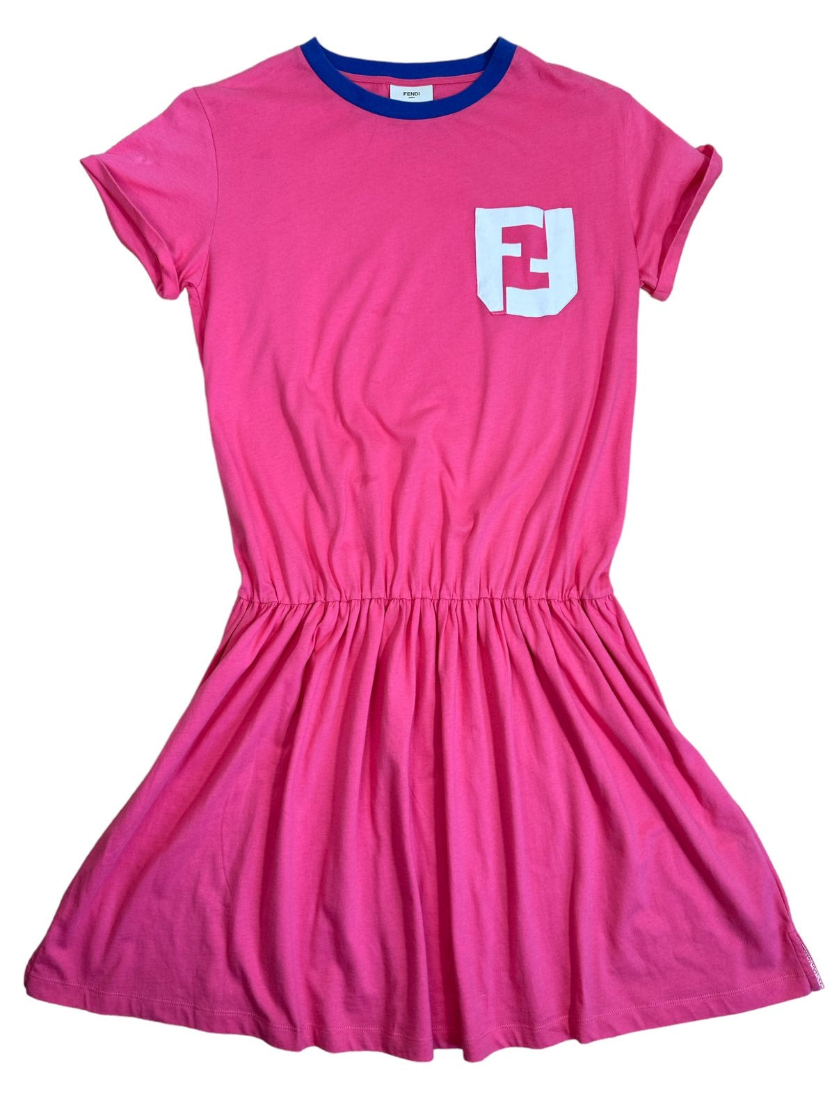 Fendi Mini abito vintage a maniche corte con logo all’altezza del petto, gonna a ruota con elastico sui fianchi. Presenta dei piccolo aloni impercettibili in tre punti (vedi foto). Riporta la taglia 12 anni ma veste una taglia S.