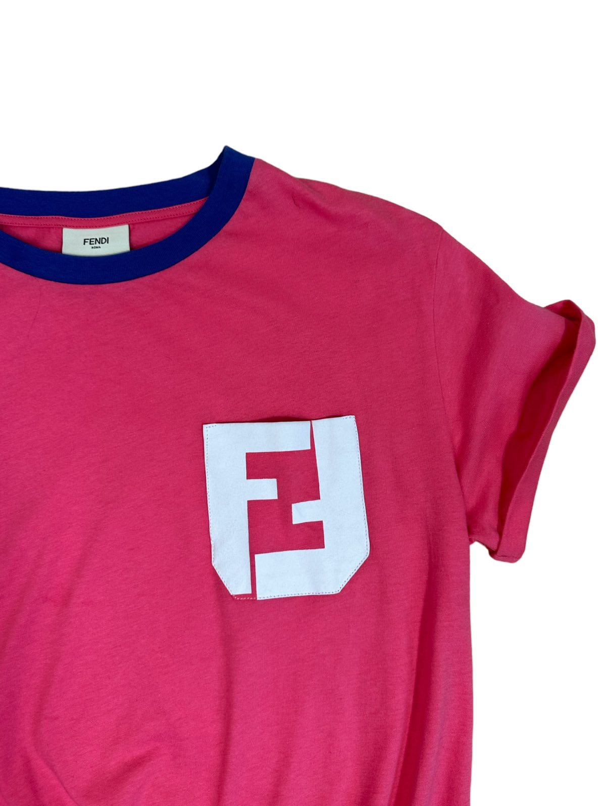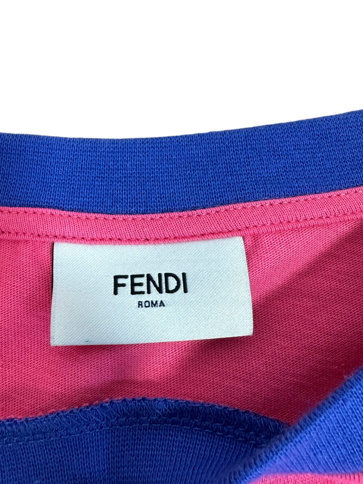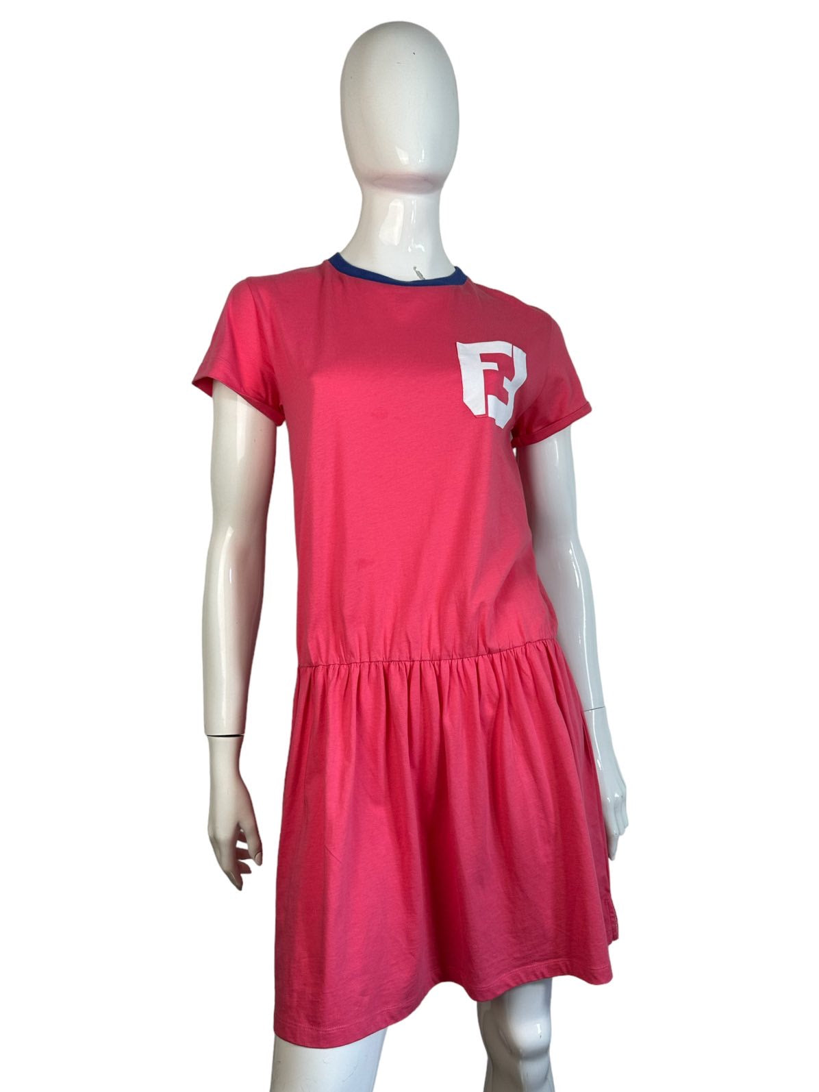 Fendi Mini abito vintage a maniche corte con logo all’altezza del petto, gonna a ruota con elastico sui fianchi. Presenta dei piccolo aloni impercettibili in tre punti (vedi foto). Riporta la taglia 12 anni ma veste una taglia S.