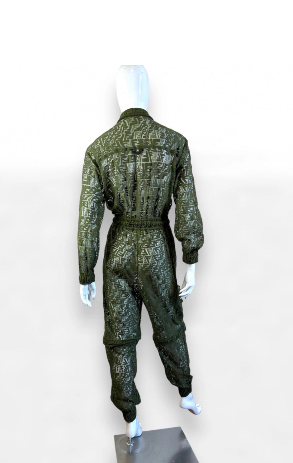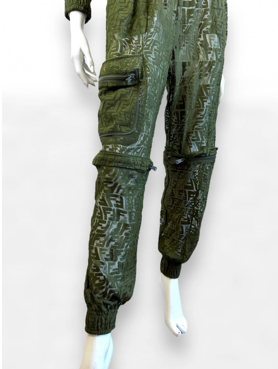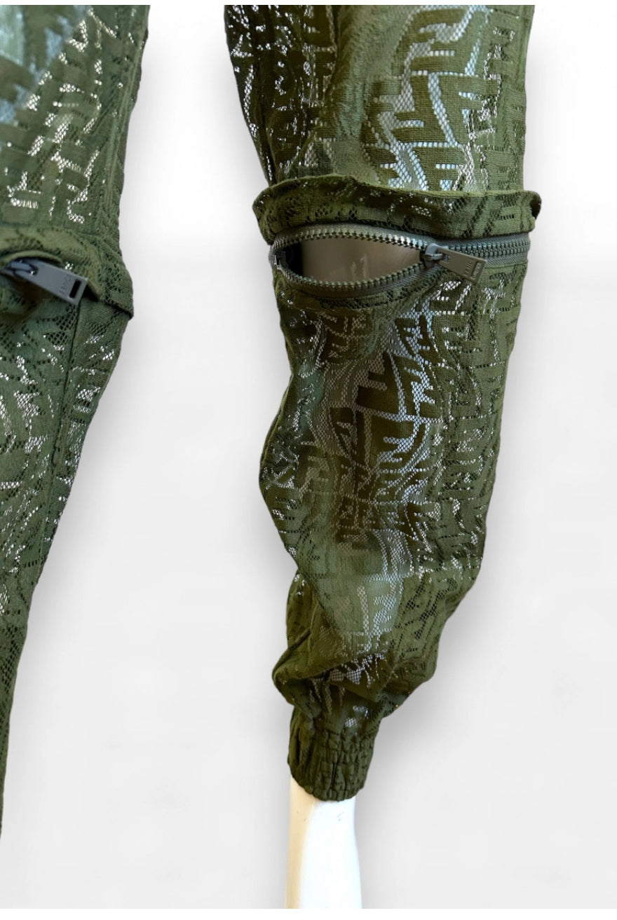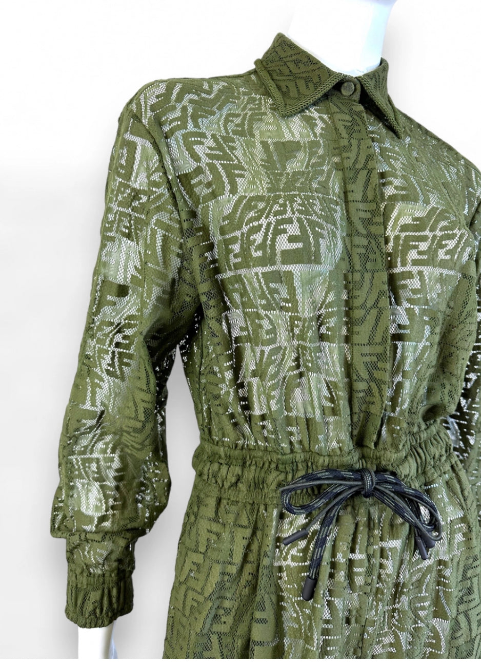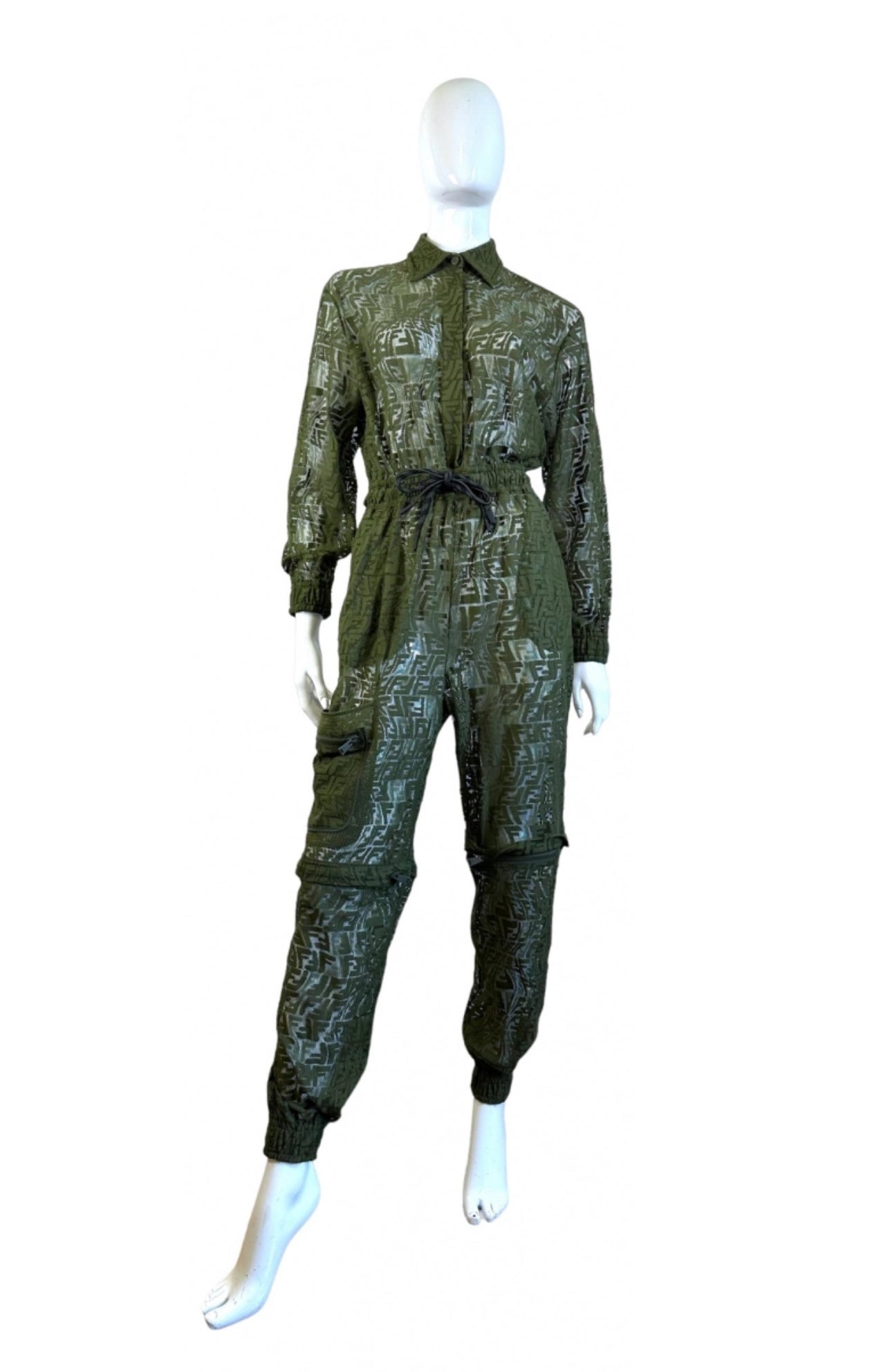 Iconica e di forte impatto visivo, questa tuta Fendi unisce estetica sportiva e raffinatezza sartoriale. Realizzata in pizzo tecnico trasparente verde oliva con motivo FF Vertigo all-over, presenta un design a maniche lunghe, chiusura frontale con bottoni coperti e coulisse regolabile in vita per valorizzare la silhouette. I pantaloni cargo sono arricchiti da tasche con zip e da un originale dettaglio removibile sulle gambe, che consente di trasformare la tuta in versione bermuda.