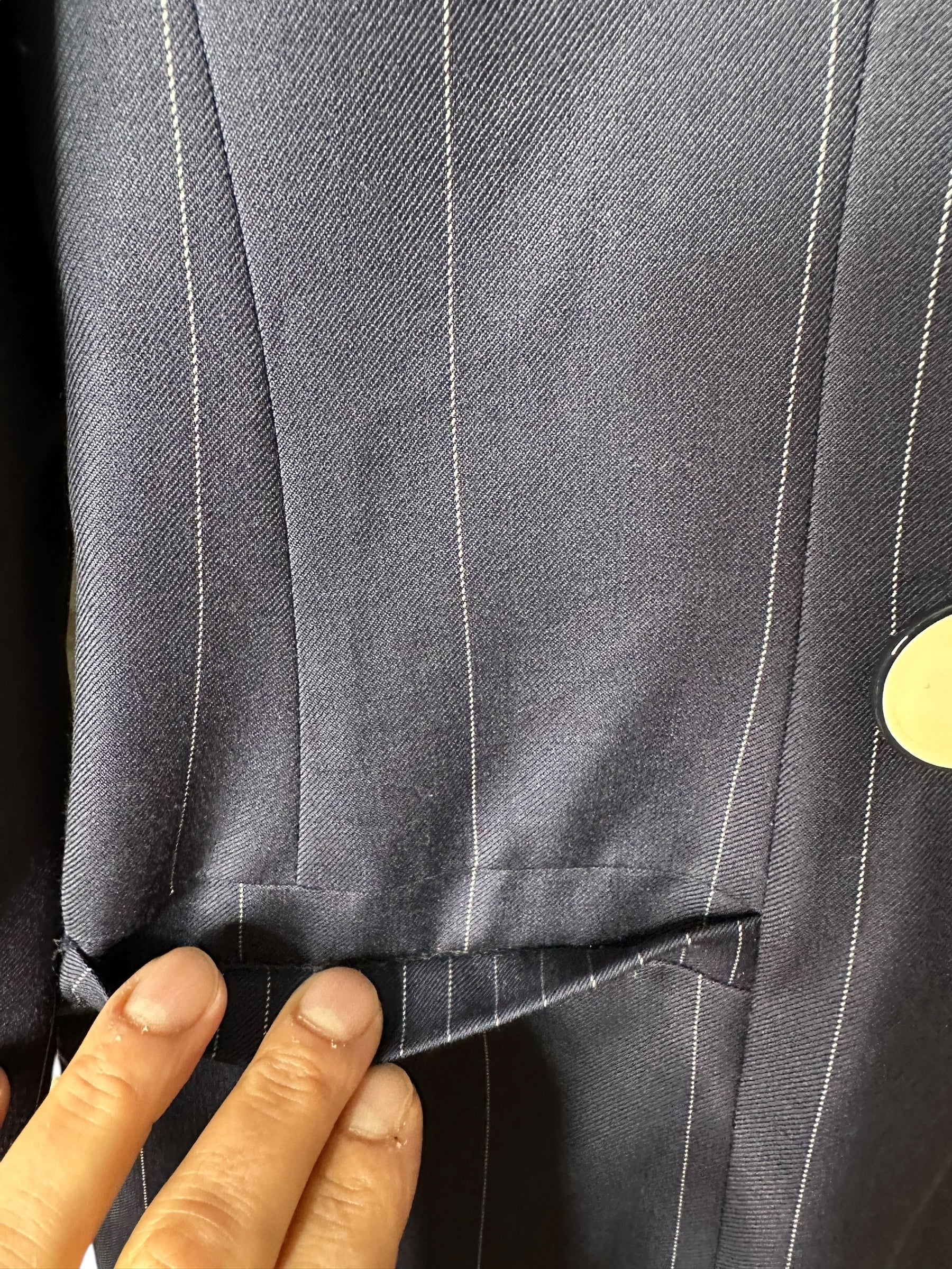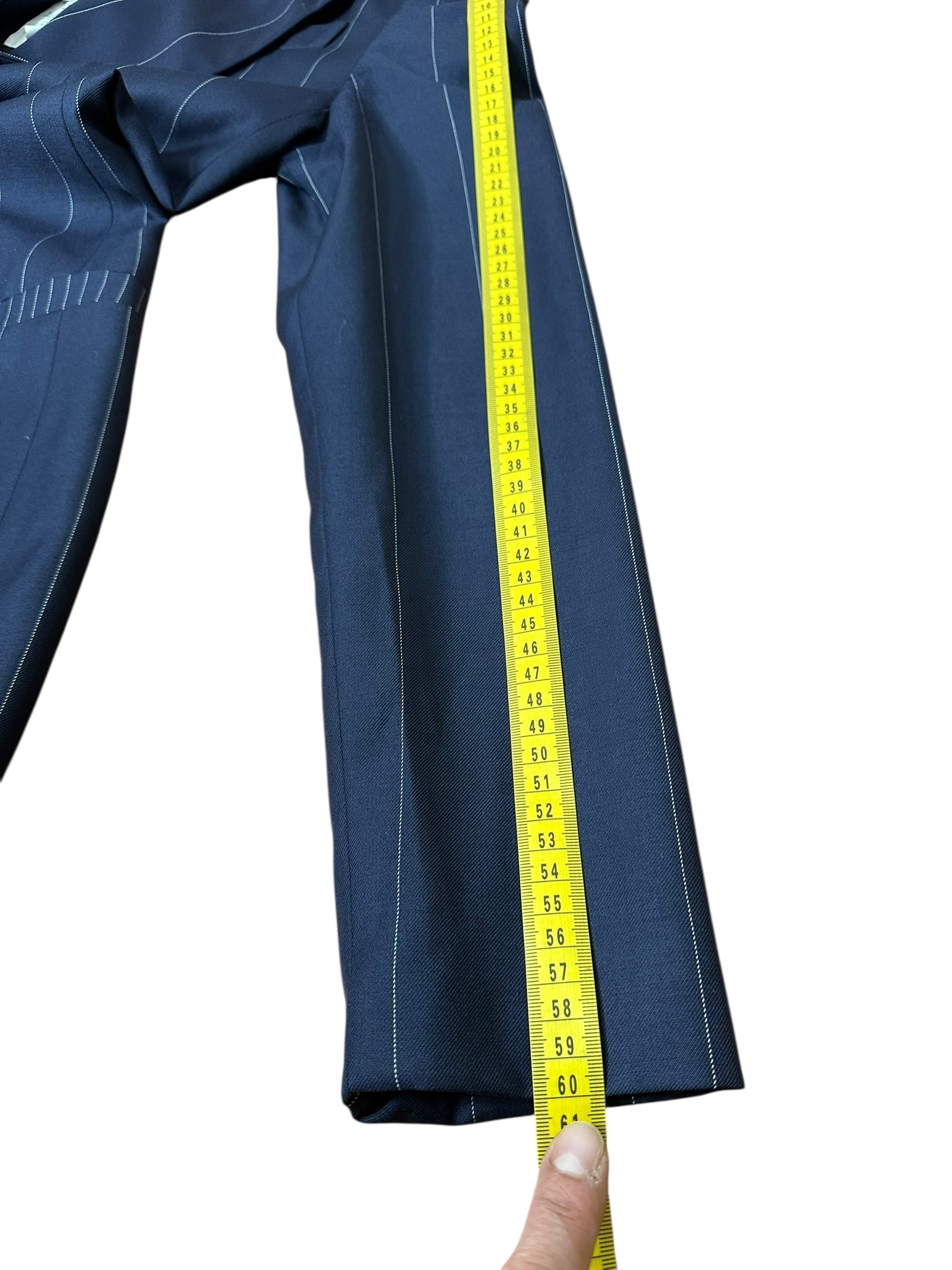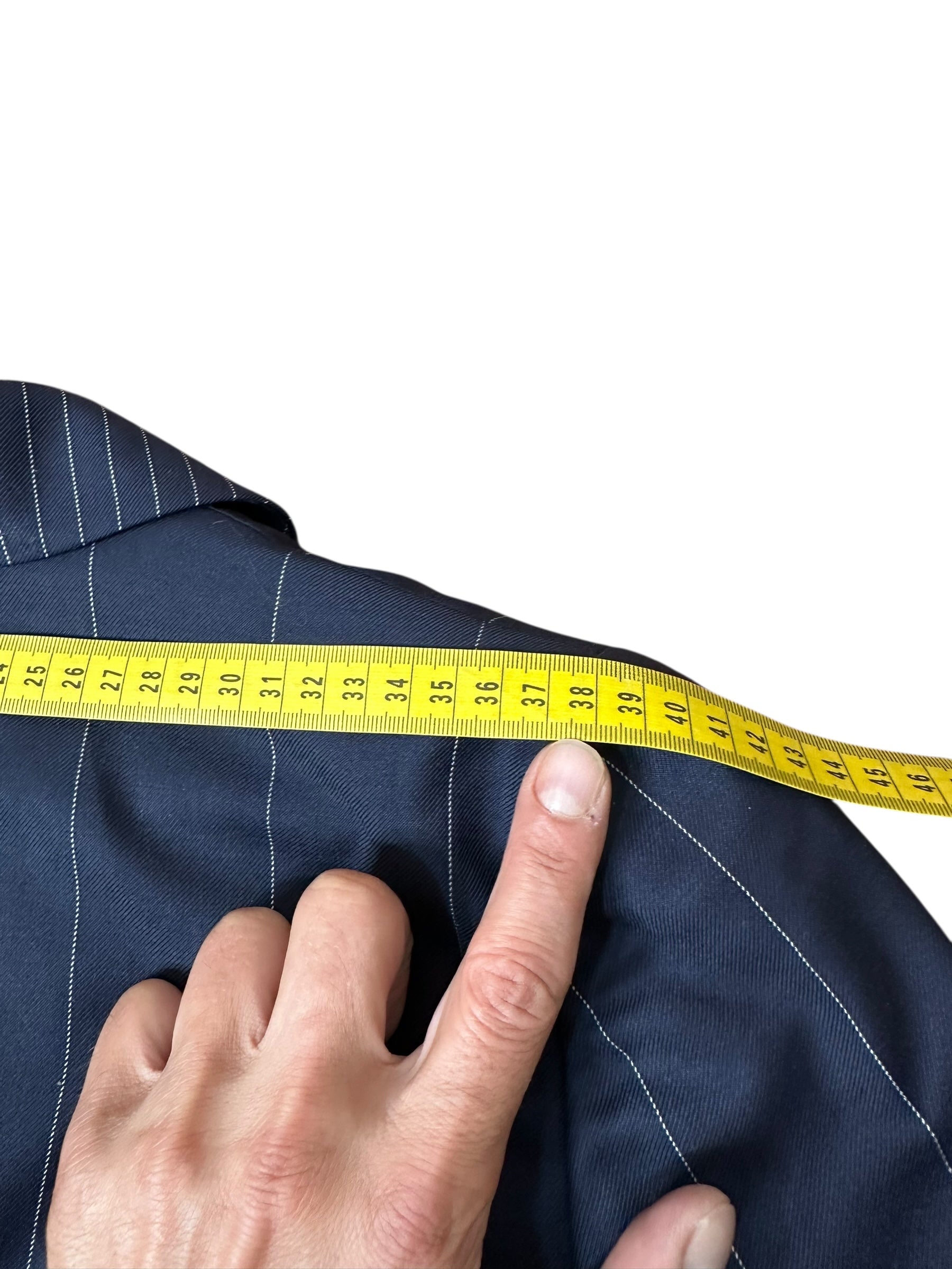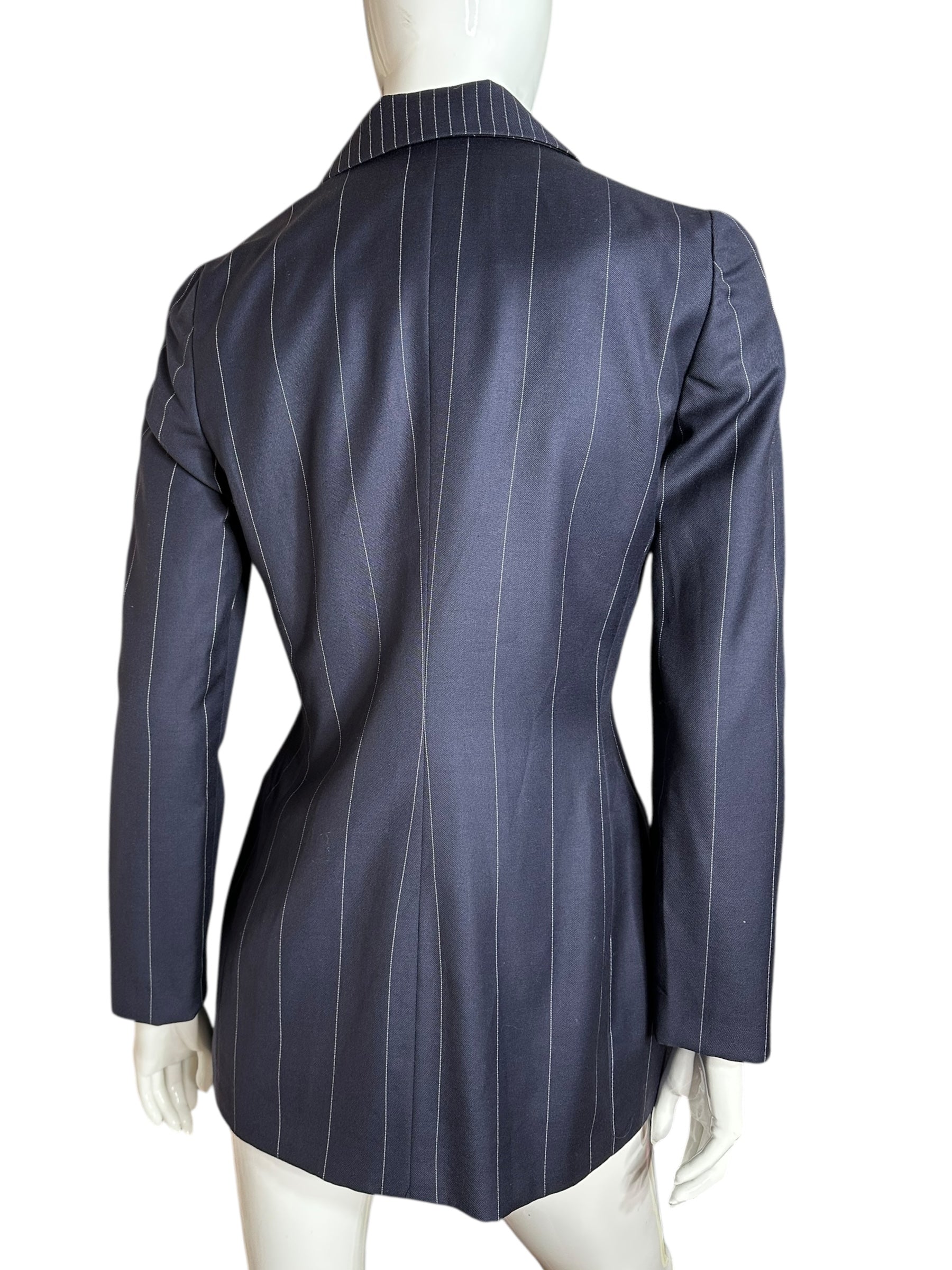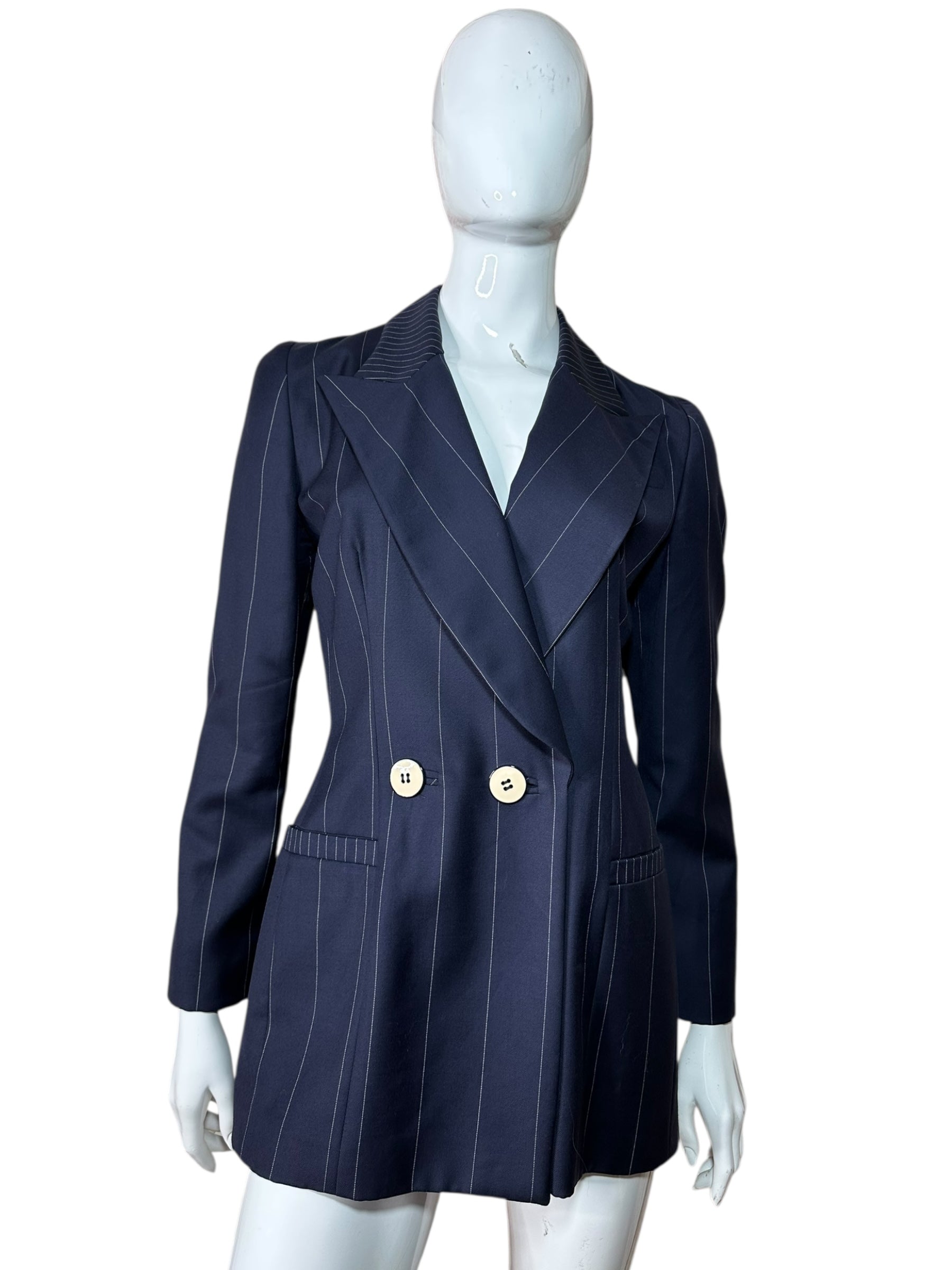 Elegante blazer doppiopetto vintage Gai Mattiolo, realizzato in Italia in pura lana vergine con motivo gessato su fondo blu navy. Il design presenta una linea leggermente sfiancata che valorizza la silhouette, rever ampio a lancia con righe a contrasto sul colletto, spalle strutturate e chiusura frontale doppiopetto con due bottoni grandi color avorio.