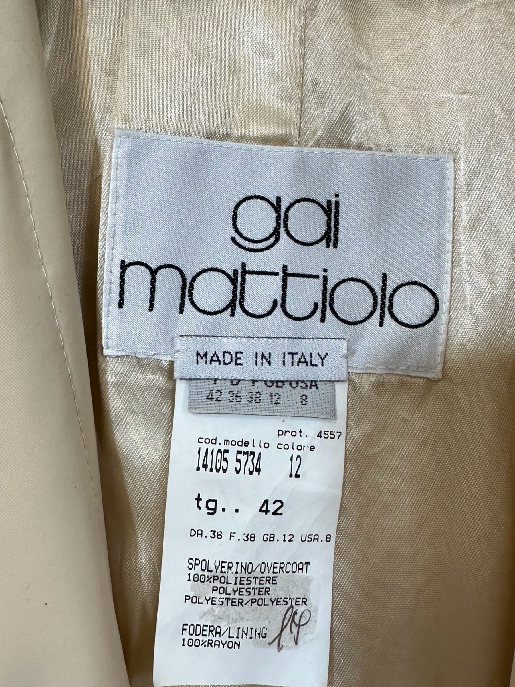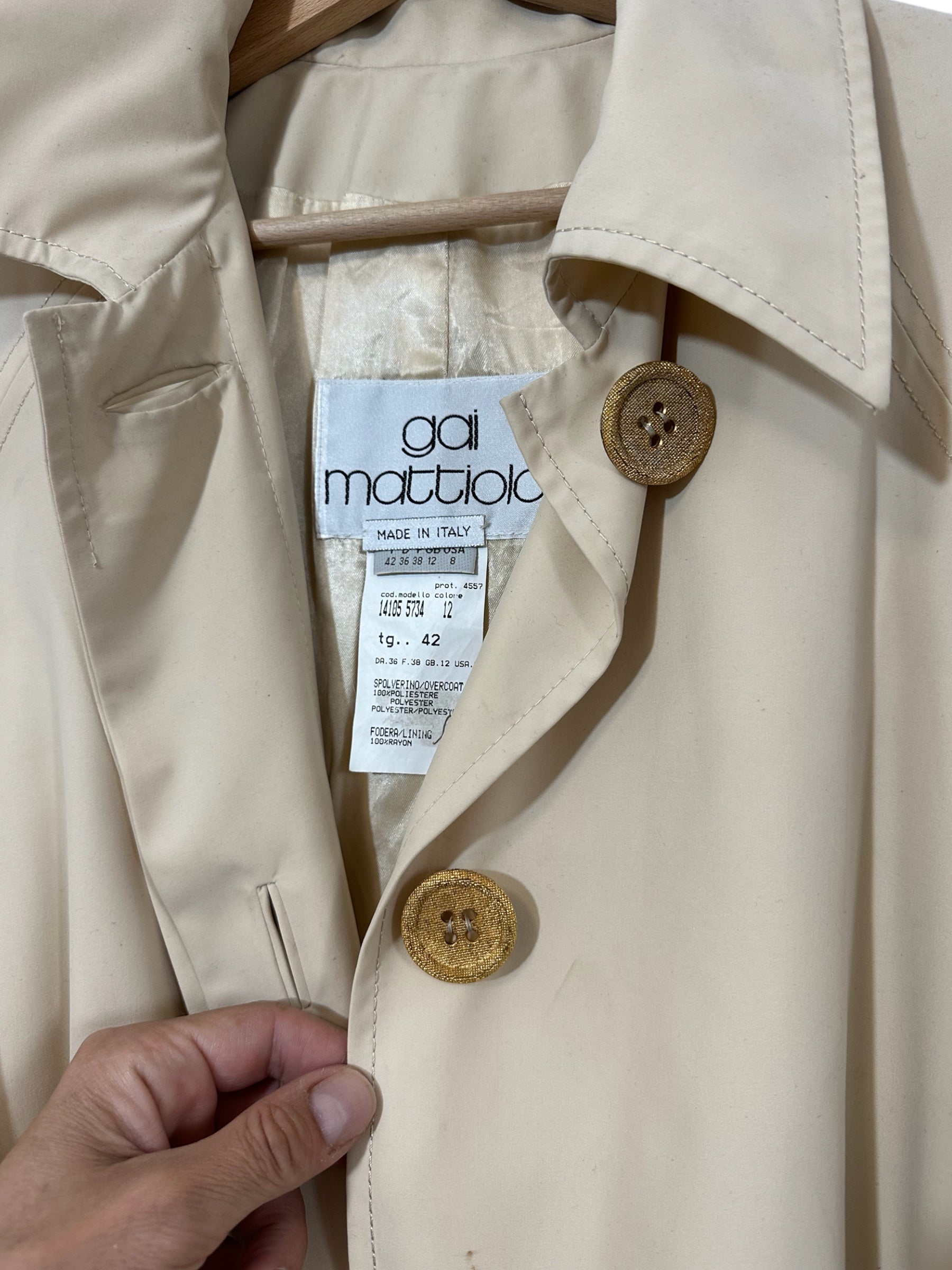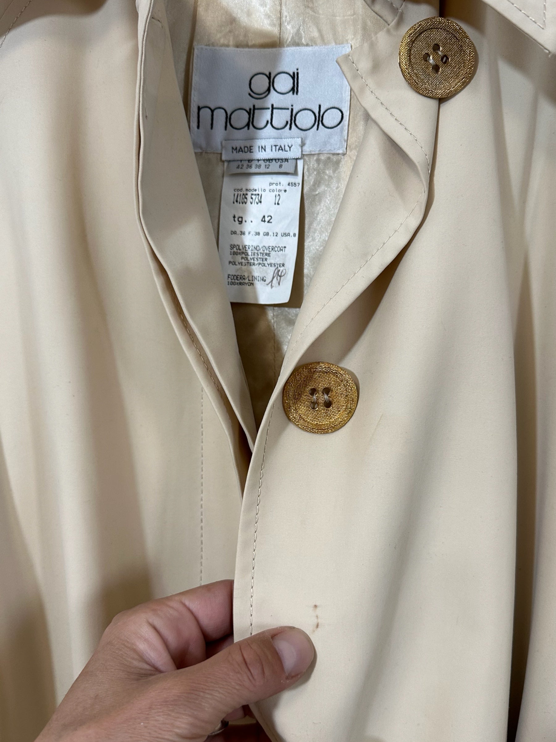 Gai Mattiolo spolverino in poliestere color avorio a maniche lunghe con cuciture a vista, tasche laterali e cintura in vita. Bottoni in metallo dorato zigrinato. Piccolo segno di usura all’interno della chiusura. Tg. 42 misure in foto.