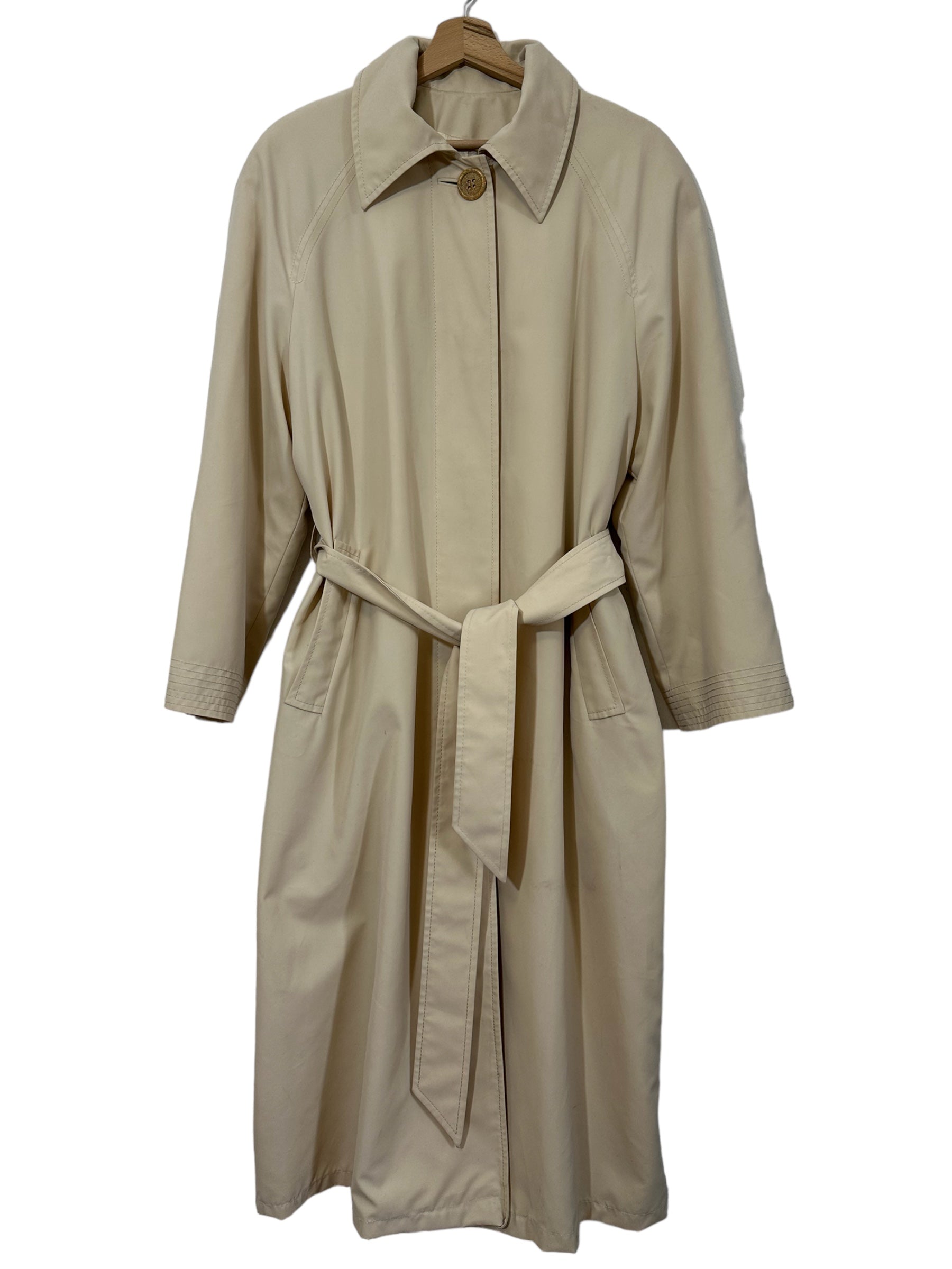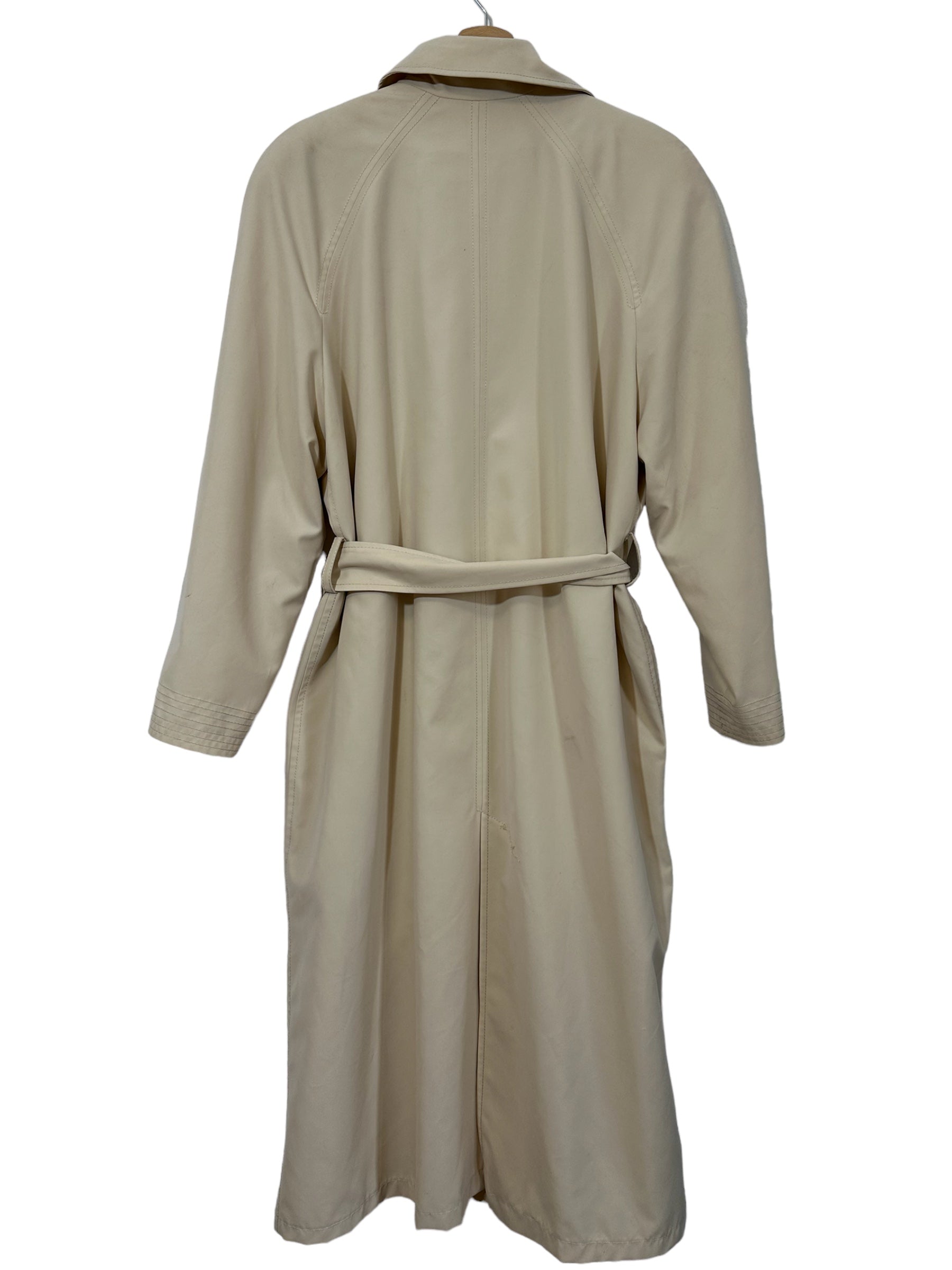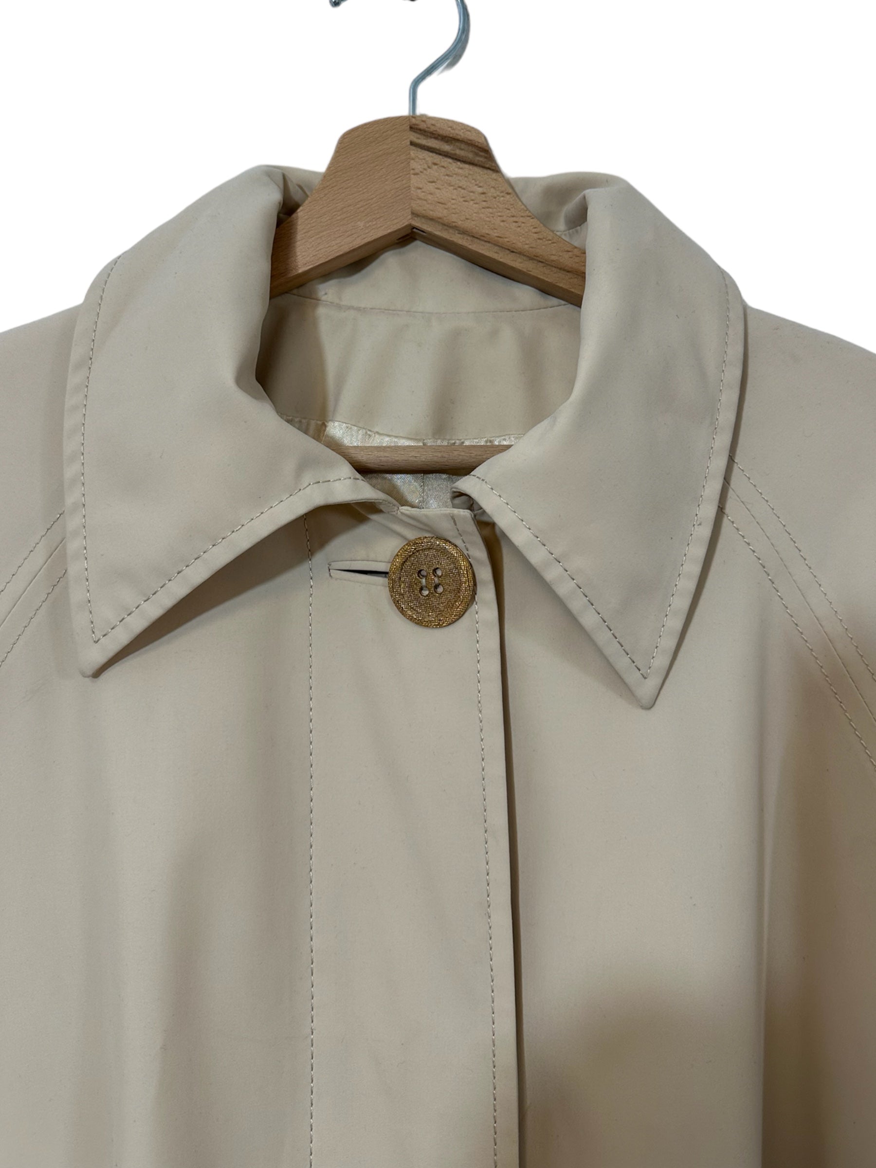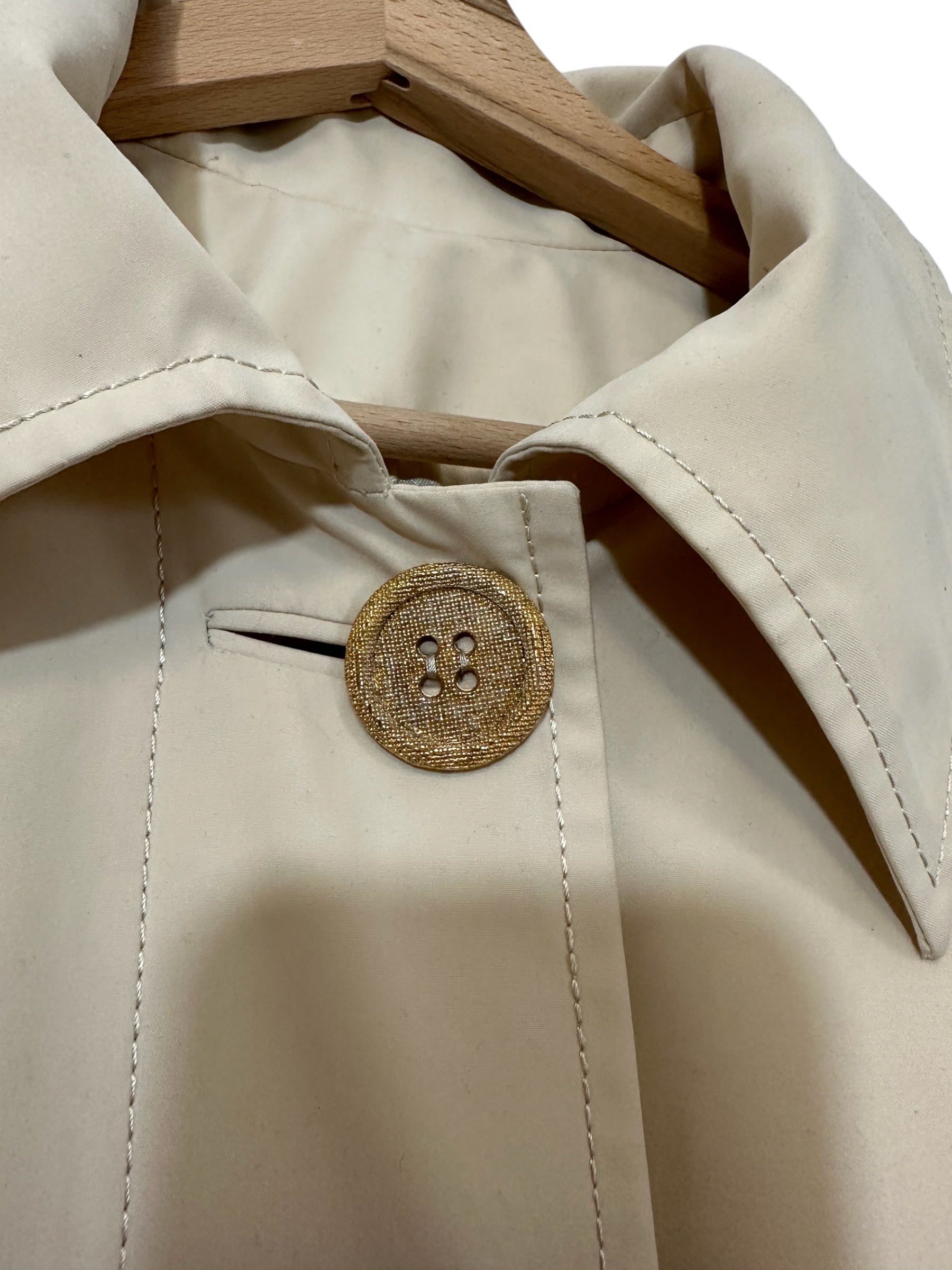 Gai Mattiolo spolverino in poliestere color avorio a maniche lunghe con cuciture a vista, tasche laterali e cintura in vita. Bottoni in metallo dorato zigrinato. Piccolo segno di usura all’interno della chiusura. Tg. 42 misure in foto.