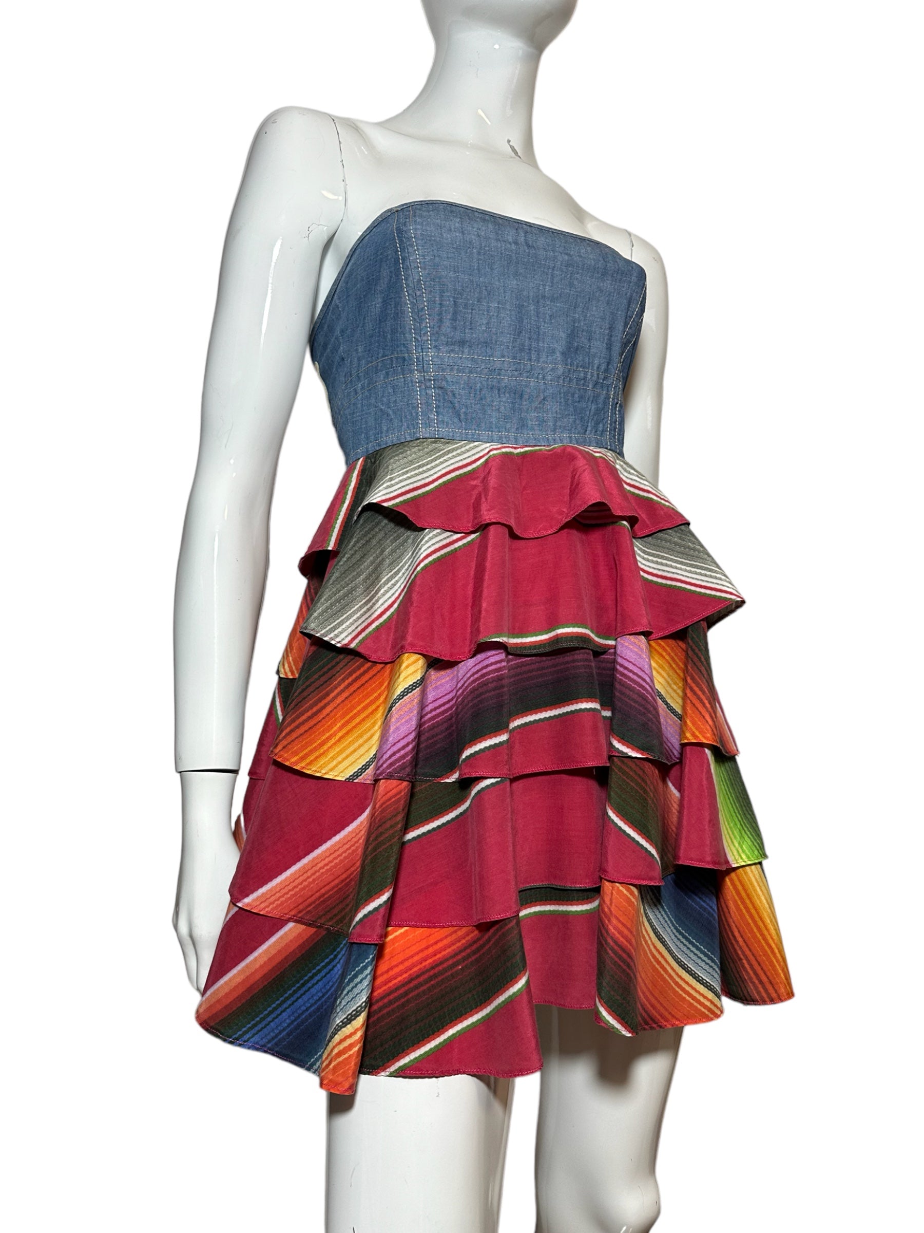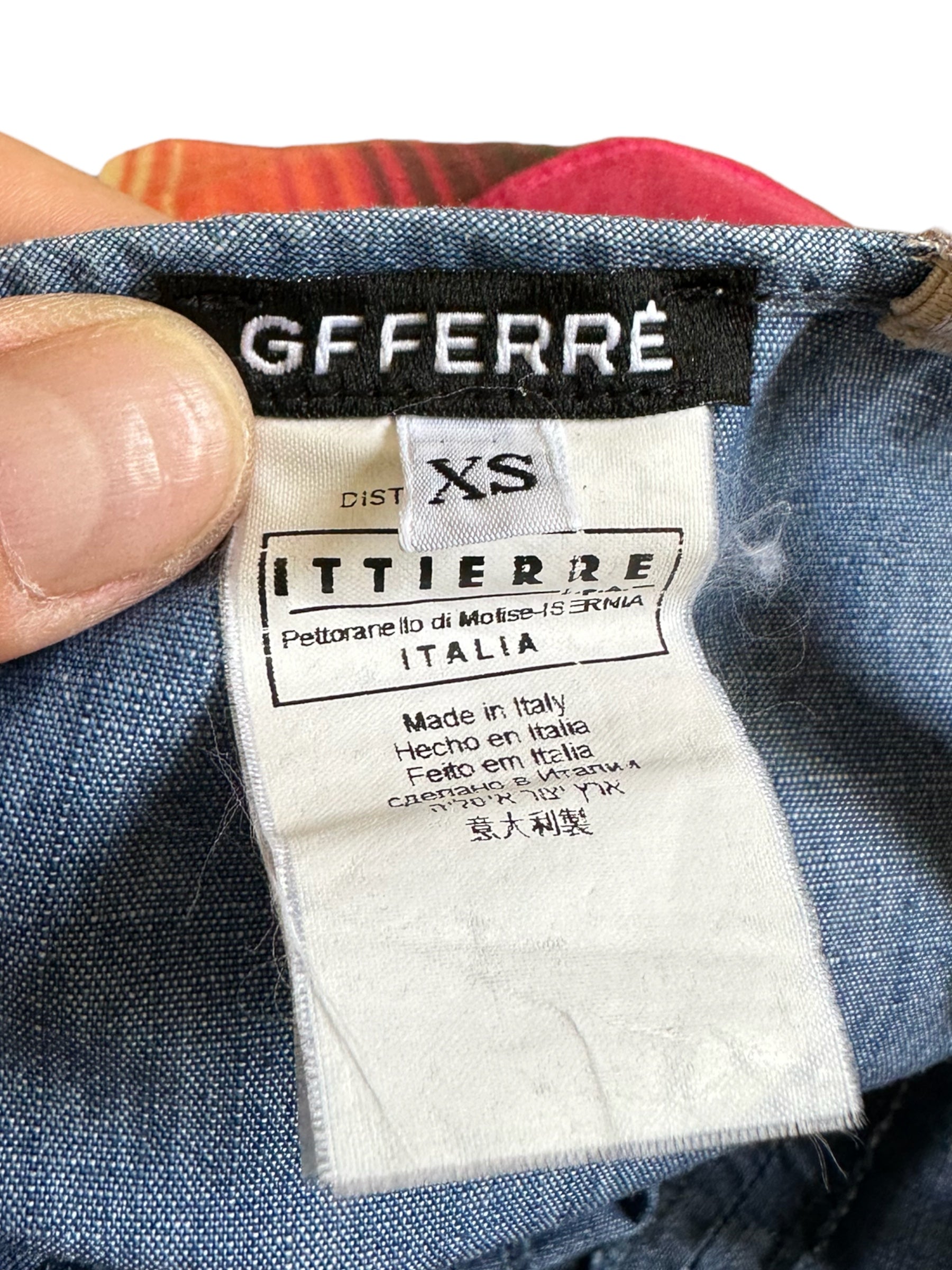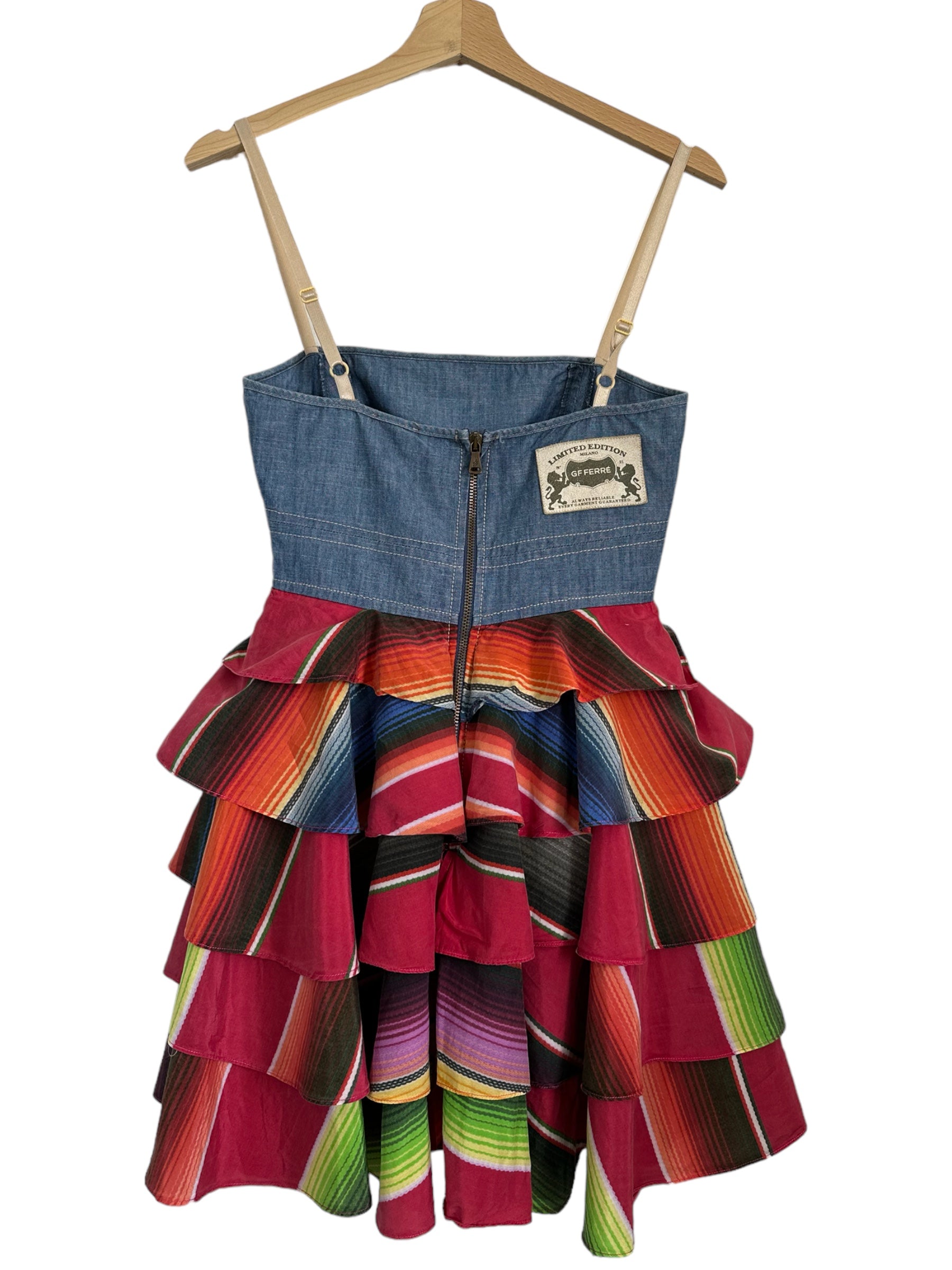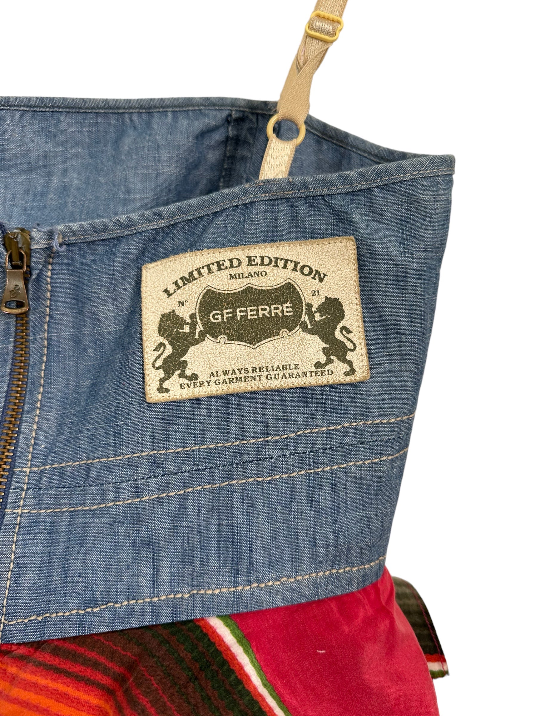 Gf Ferrè mini jumping vintage in cotone color denim con balze in seta multicolr applicate che vanno a formare la forma di un abito. Chiusura a zip sul retro. Tg. XS