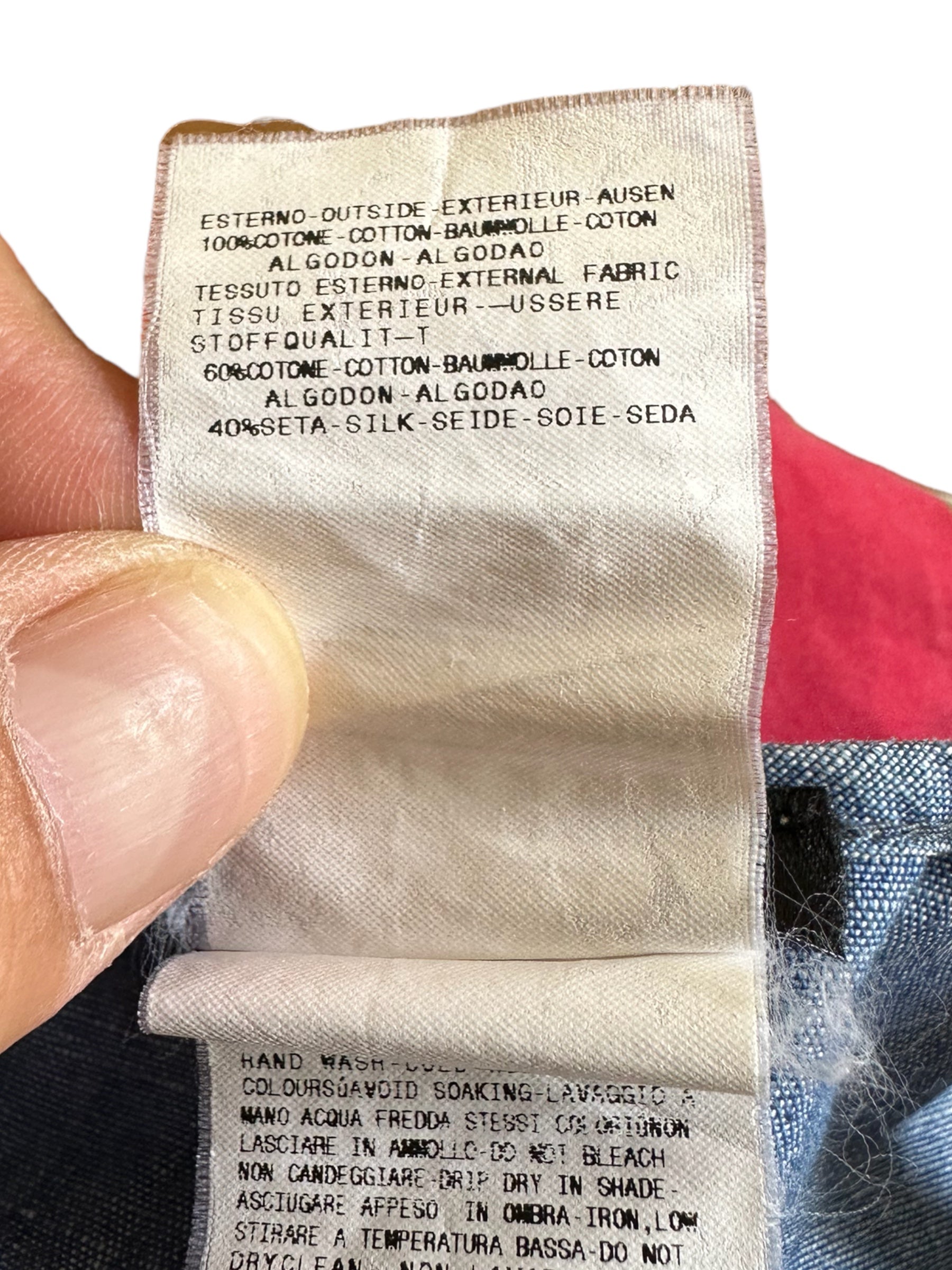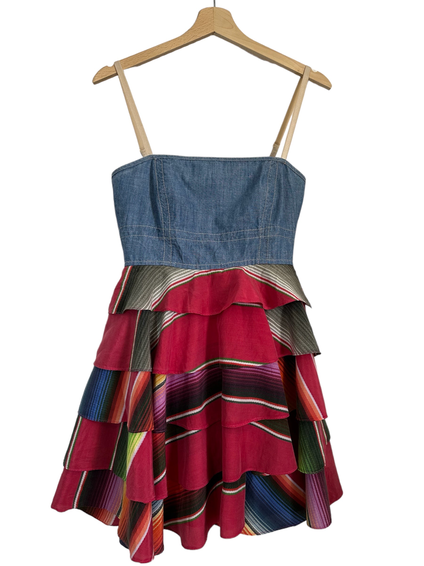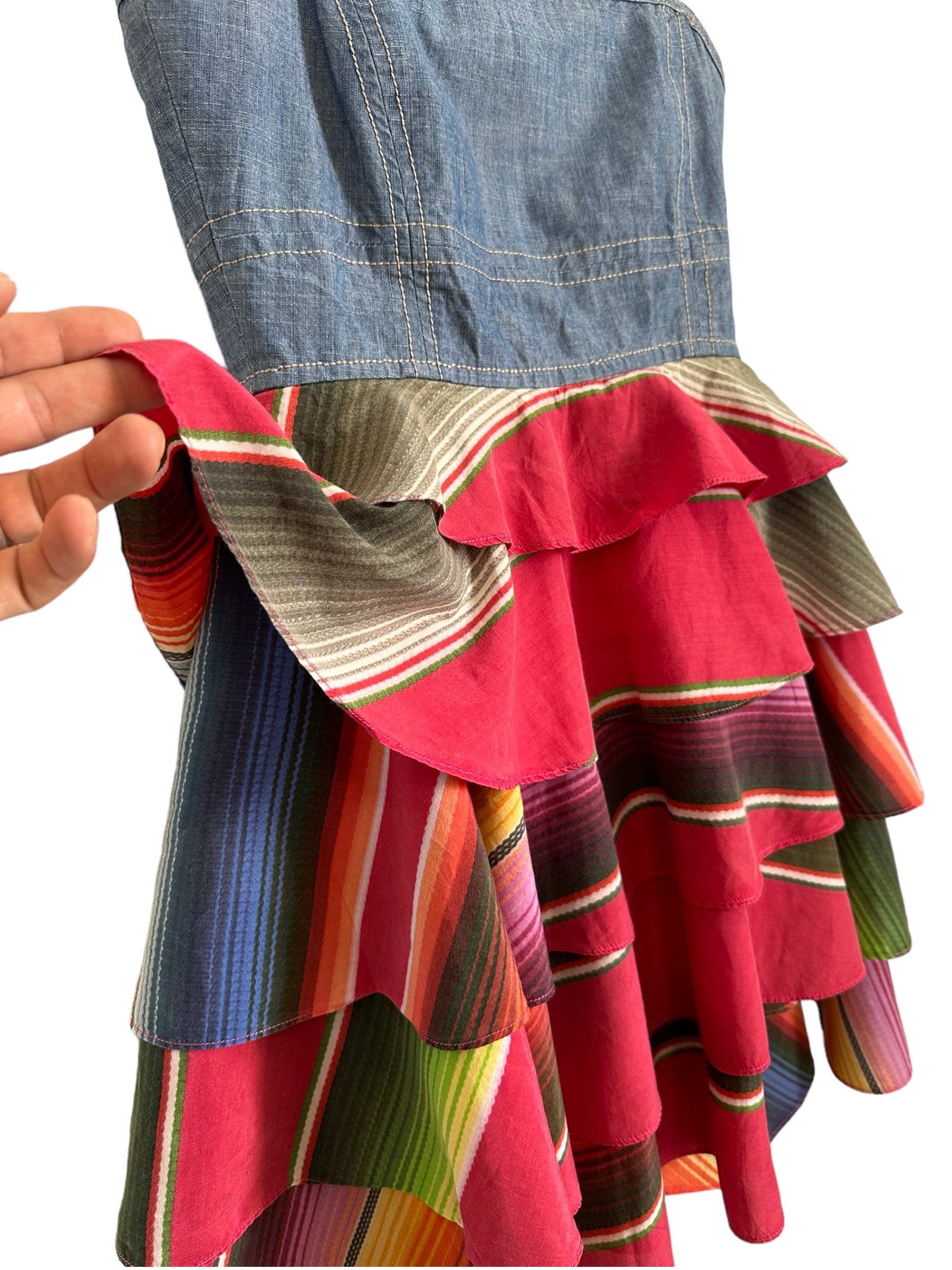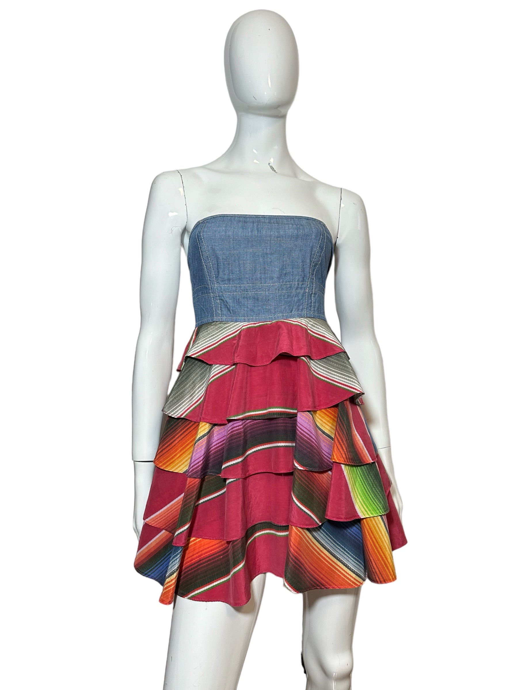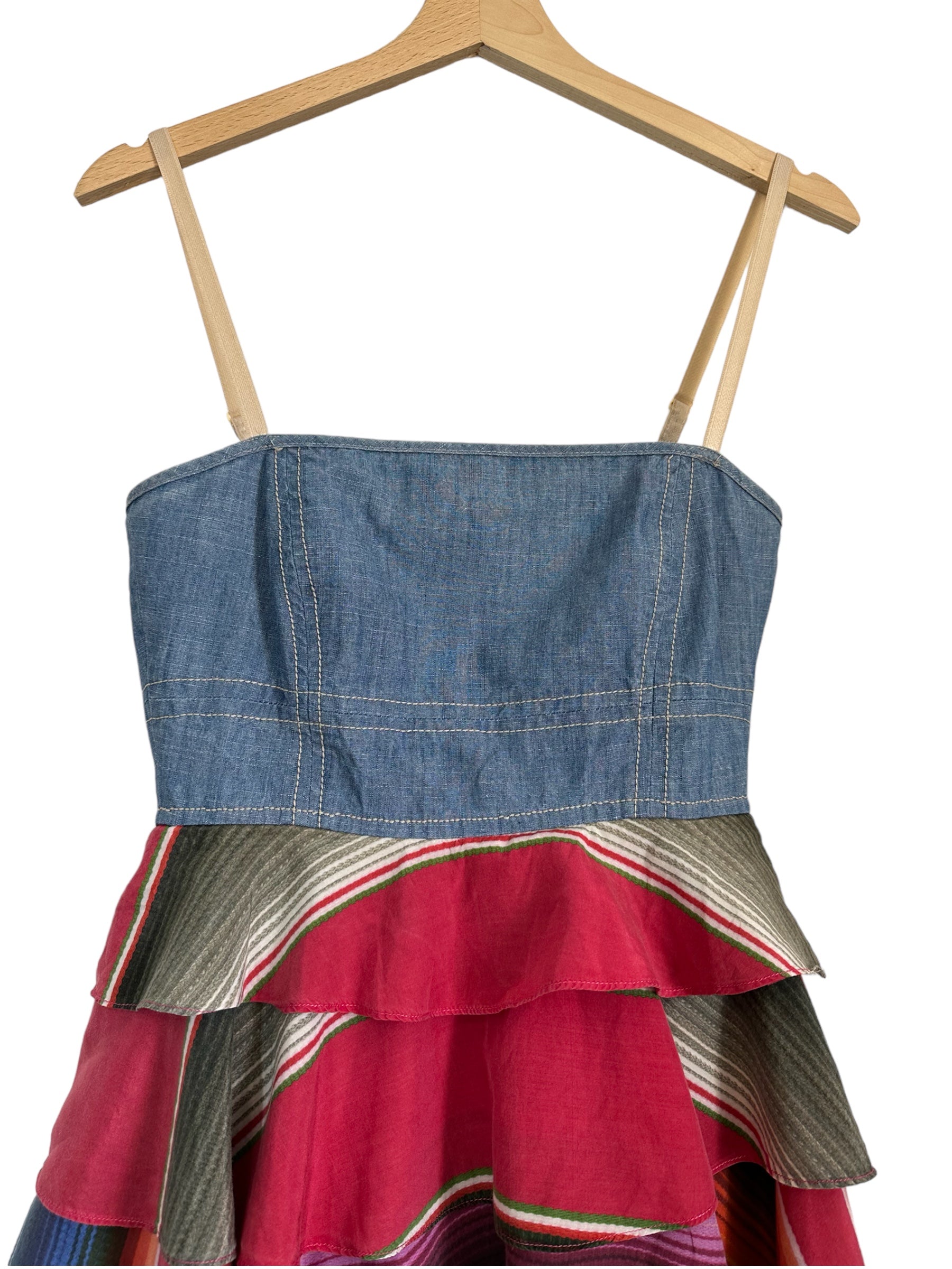 Gf Ferrè mini jumping vintage in cotone color denim con balze in seta multicolr applicate che vanno a formare la forma di un abito. Chiusura a zip sul retro. Tg. XS
