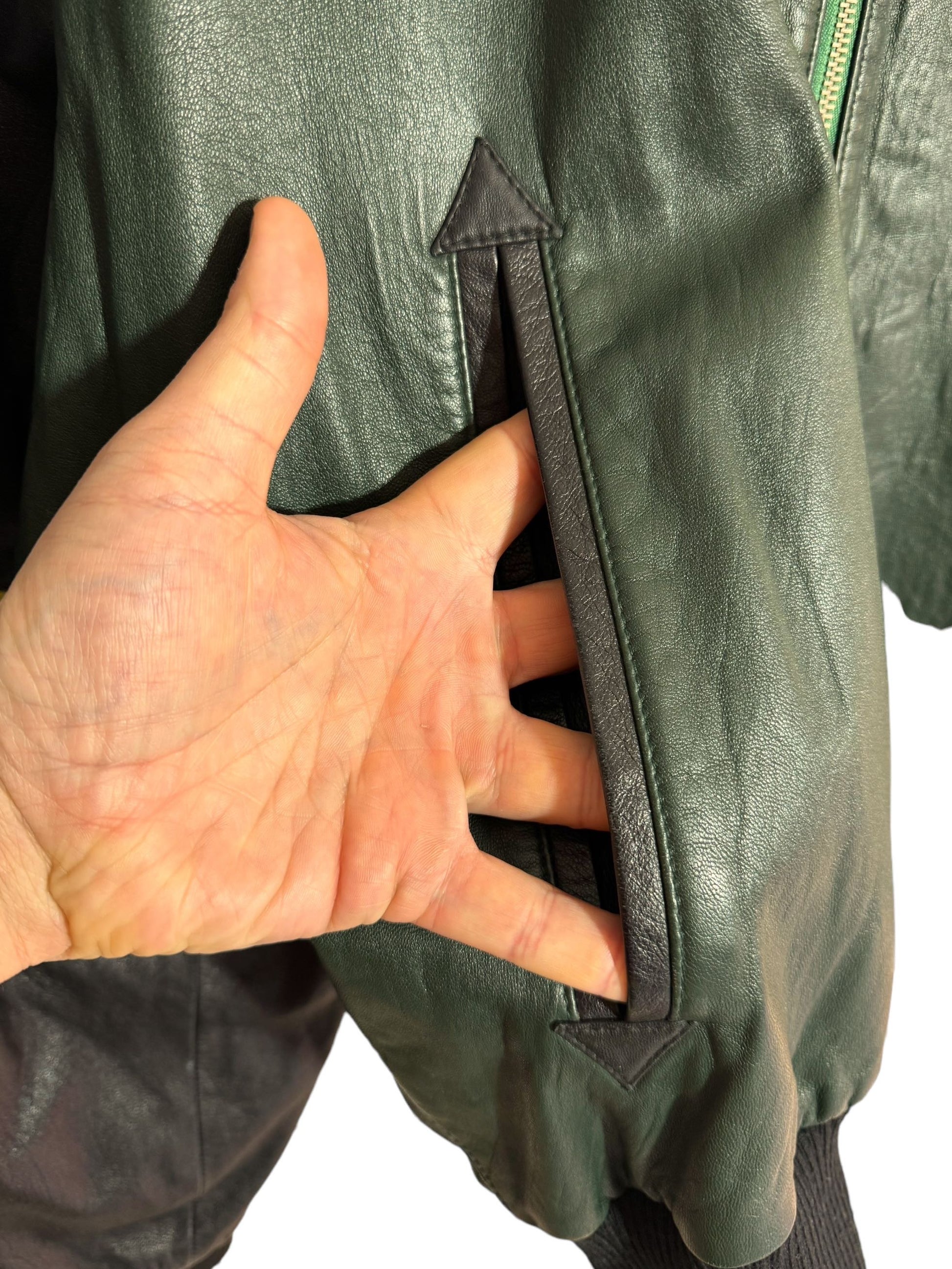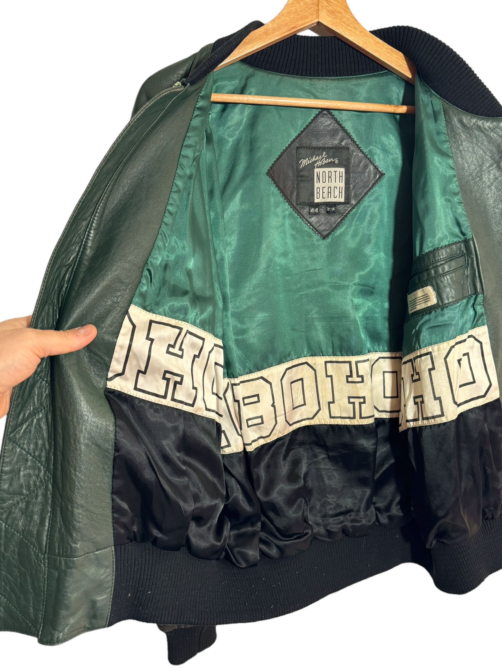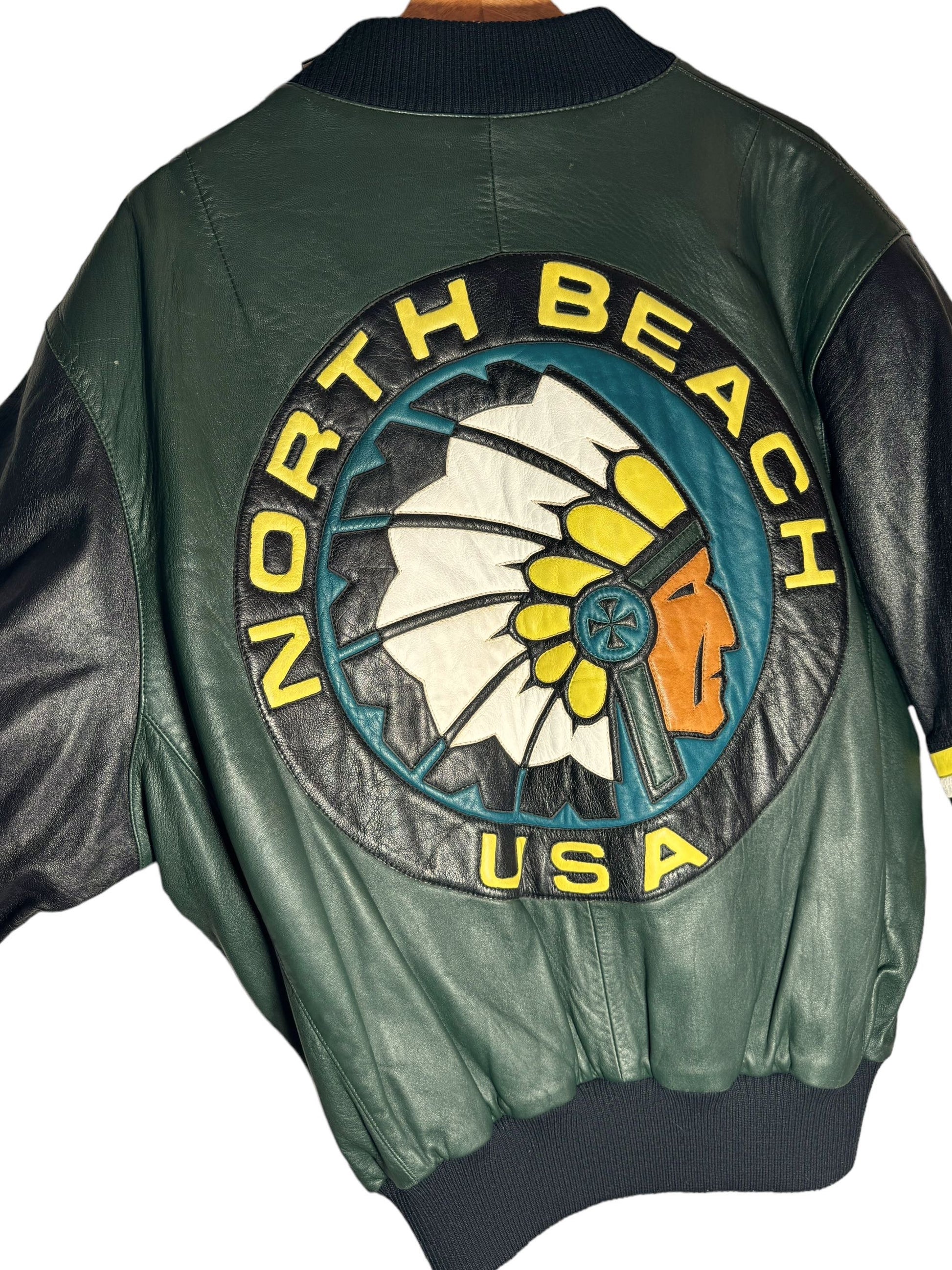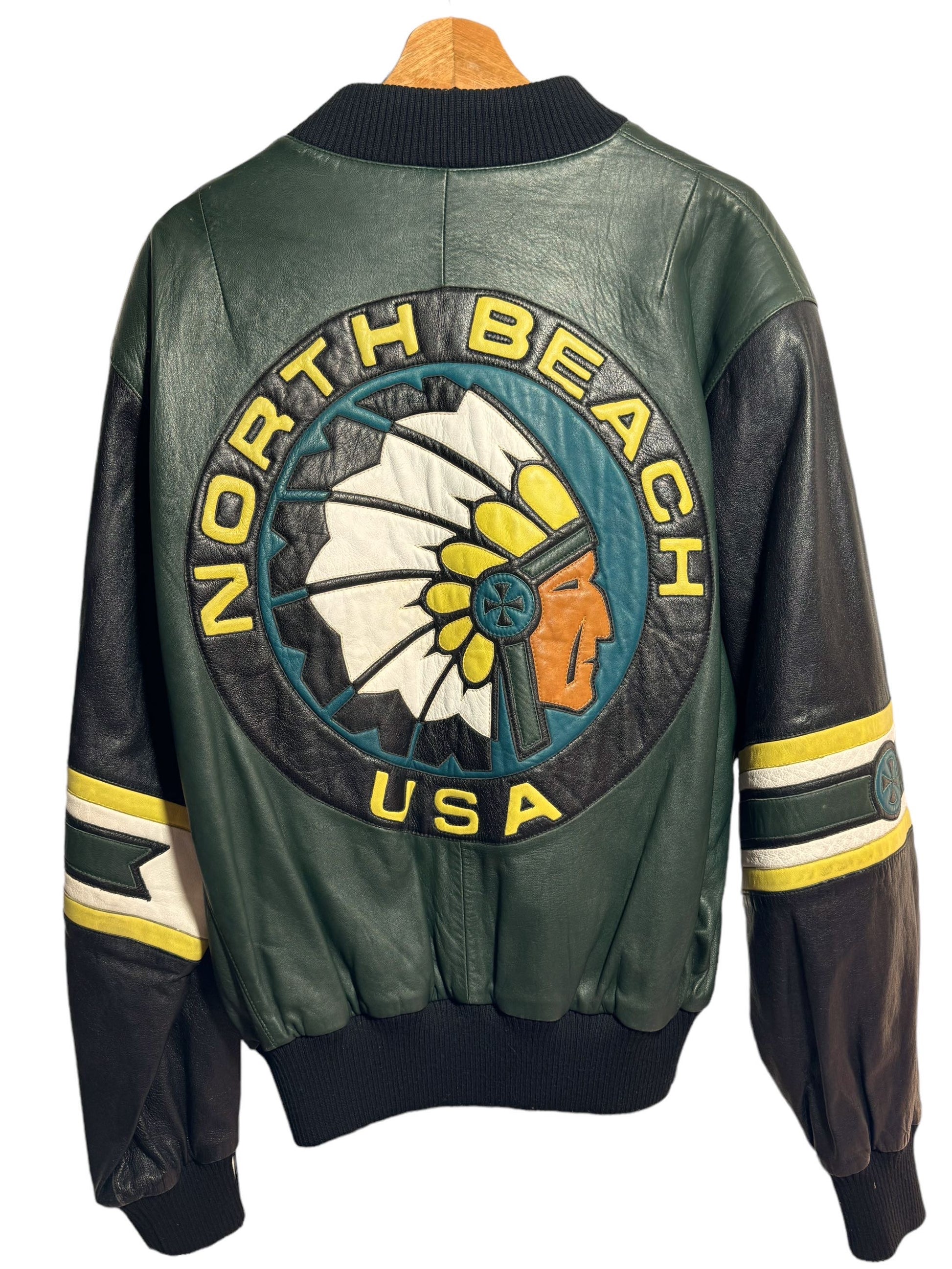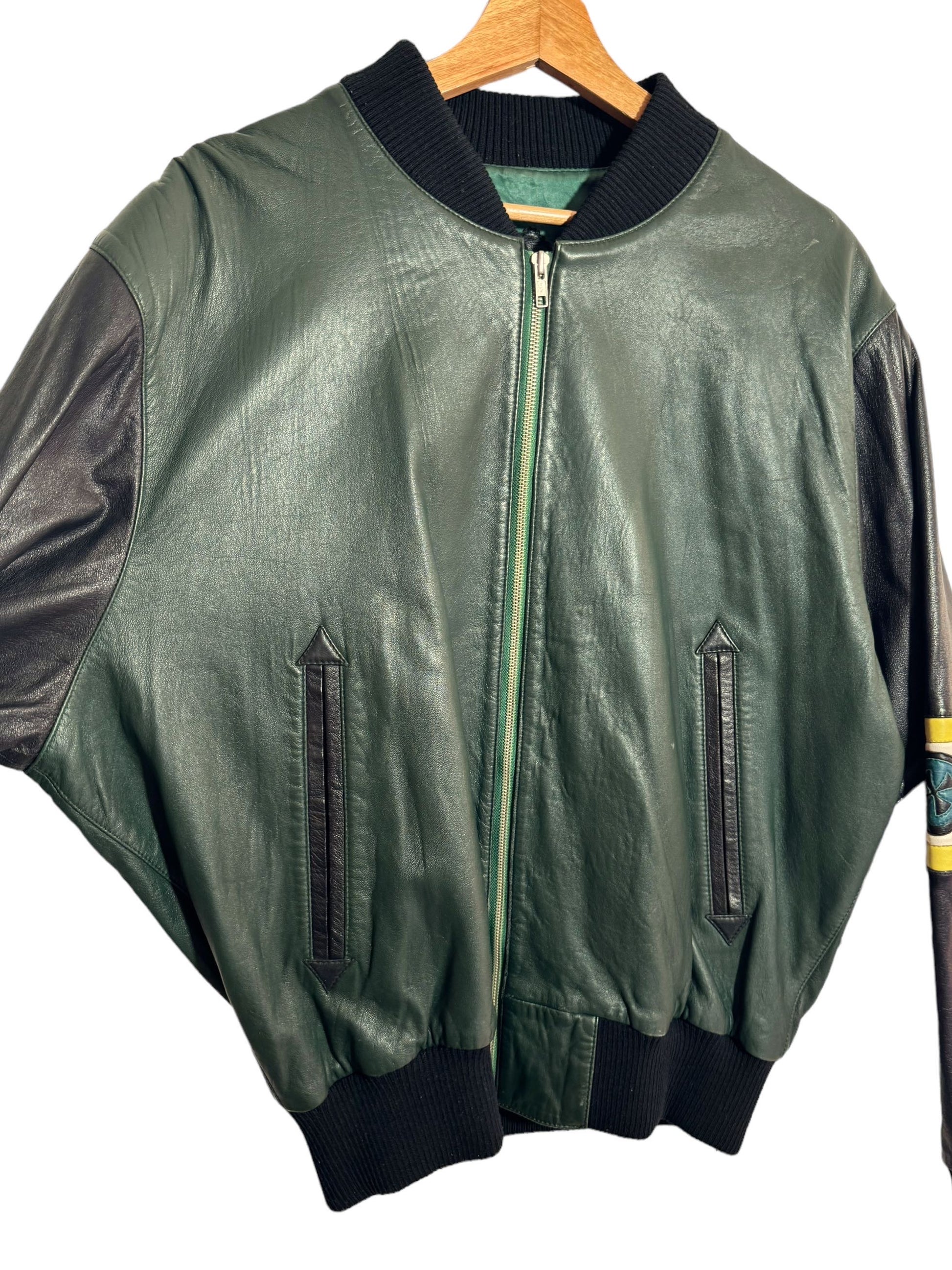 Giacca a bomber in pelle americana vintage Michael Hoban a tema indiani d’America. Taglia 44, veste una L oversize.