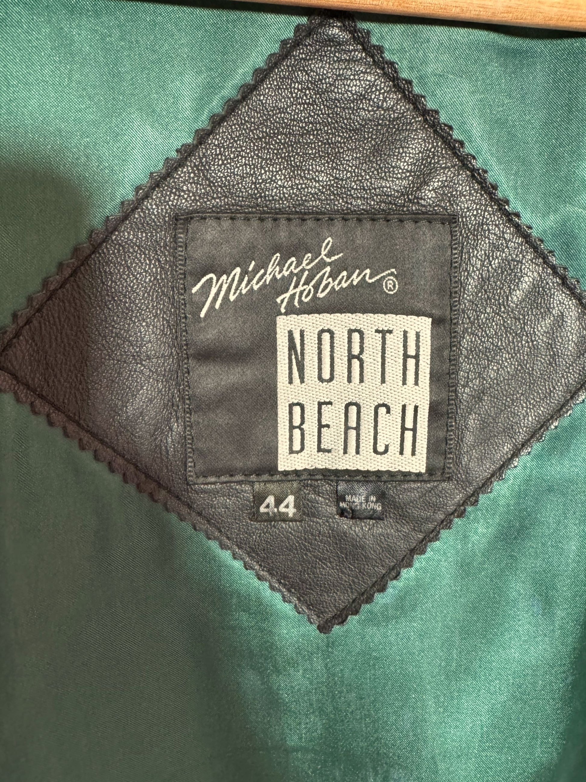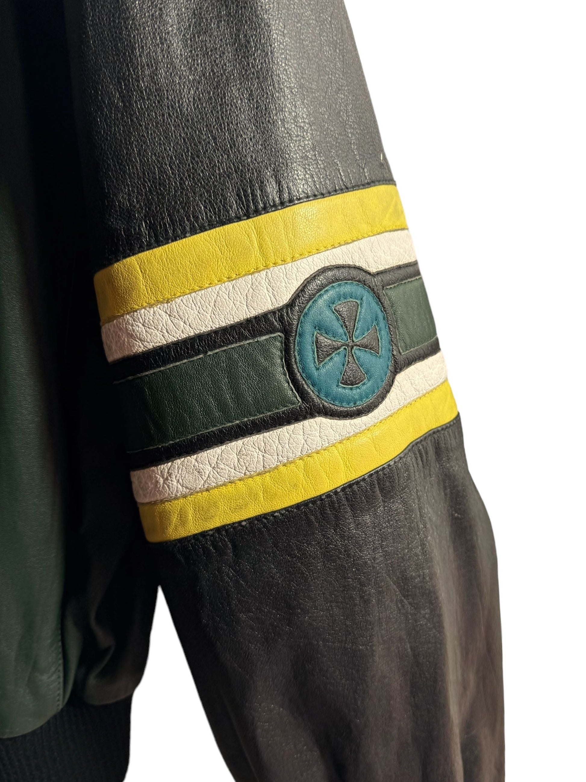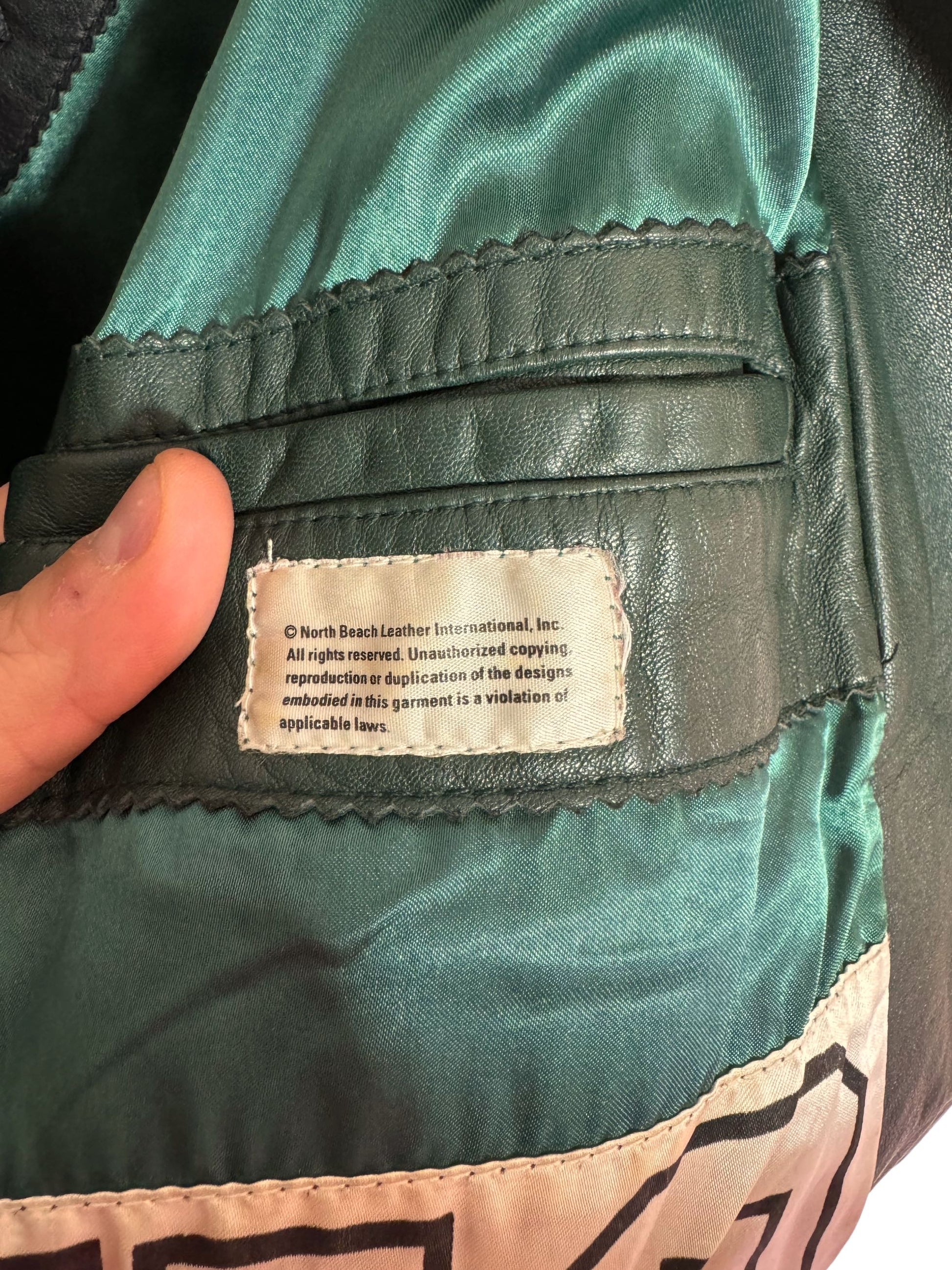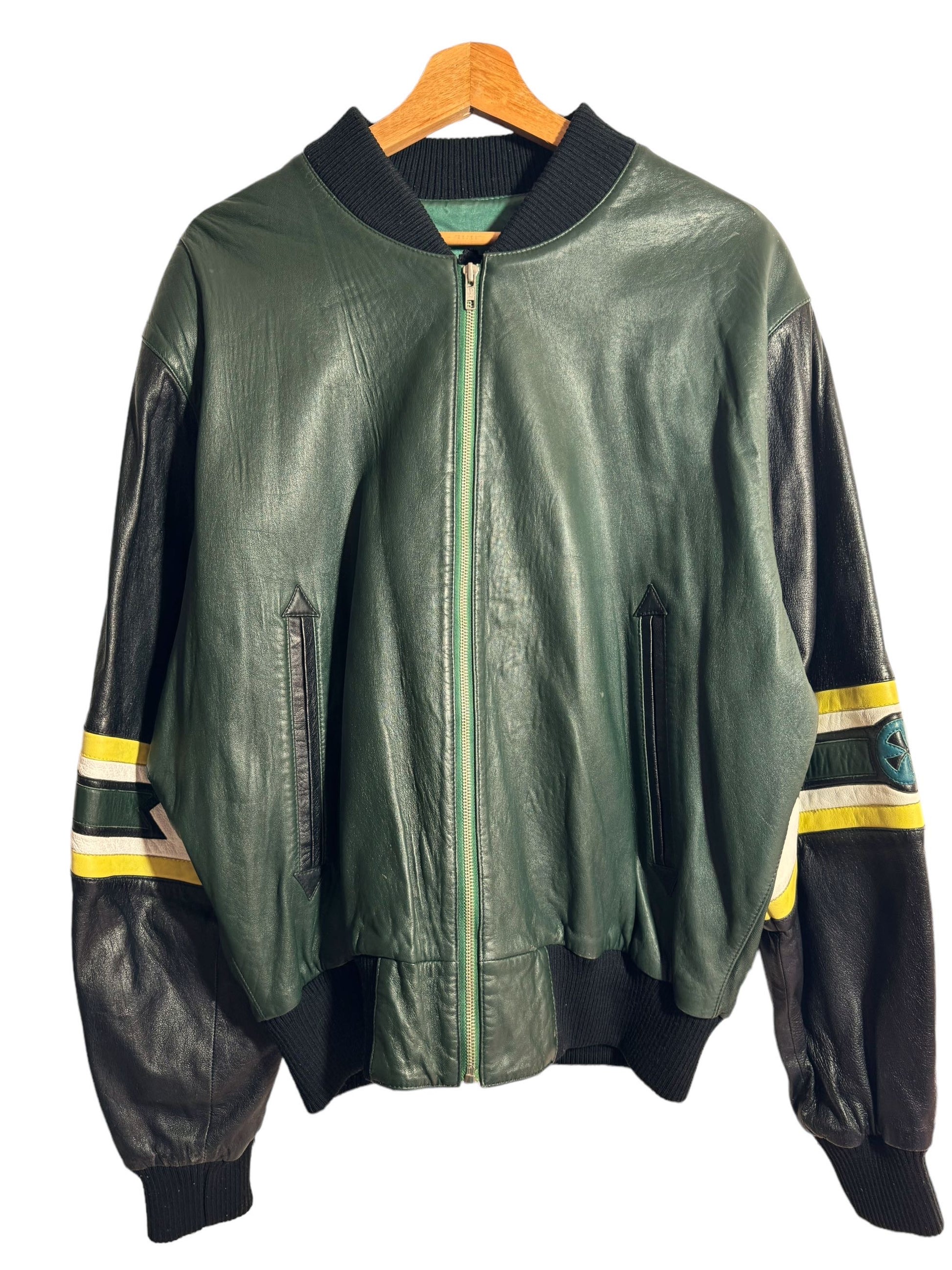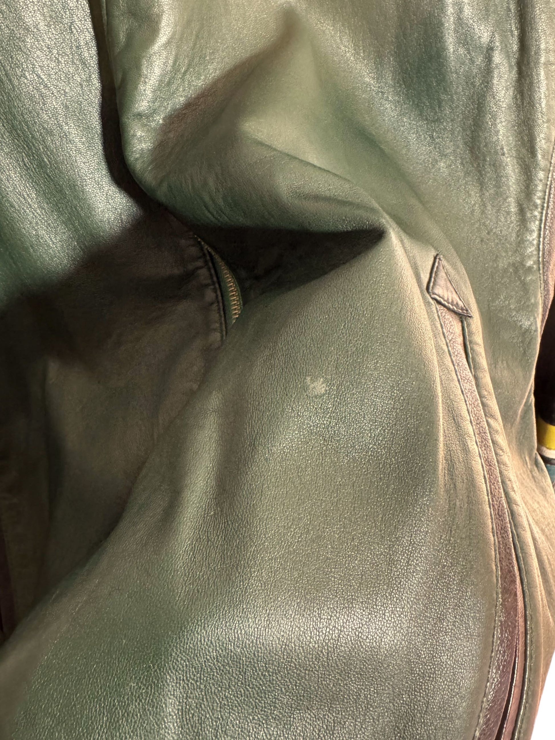 Giacca a bomber in pelle americana vintage Michael Hoban a tema indiani d’America. Taglia 44, veste una L oversize.