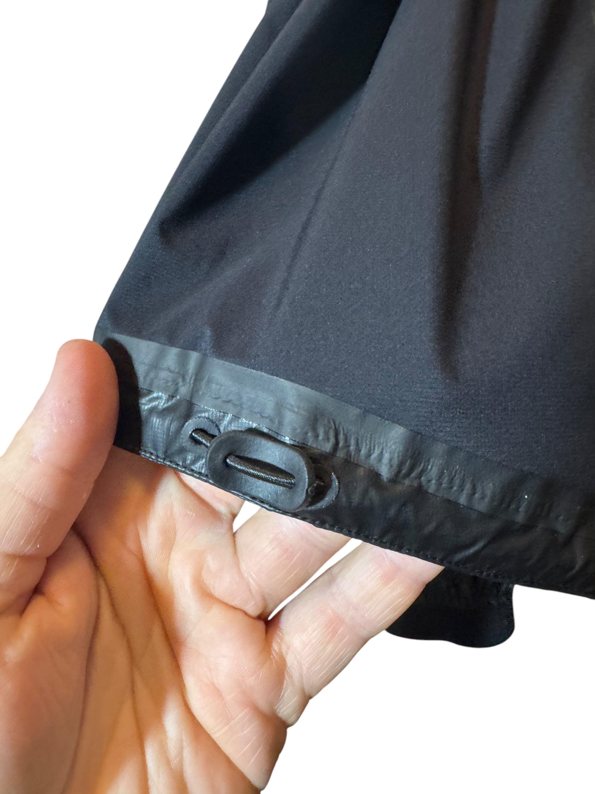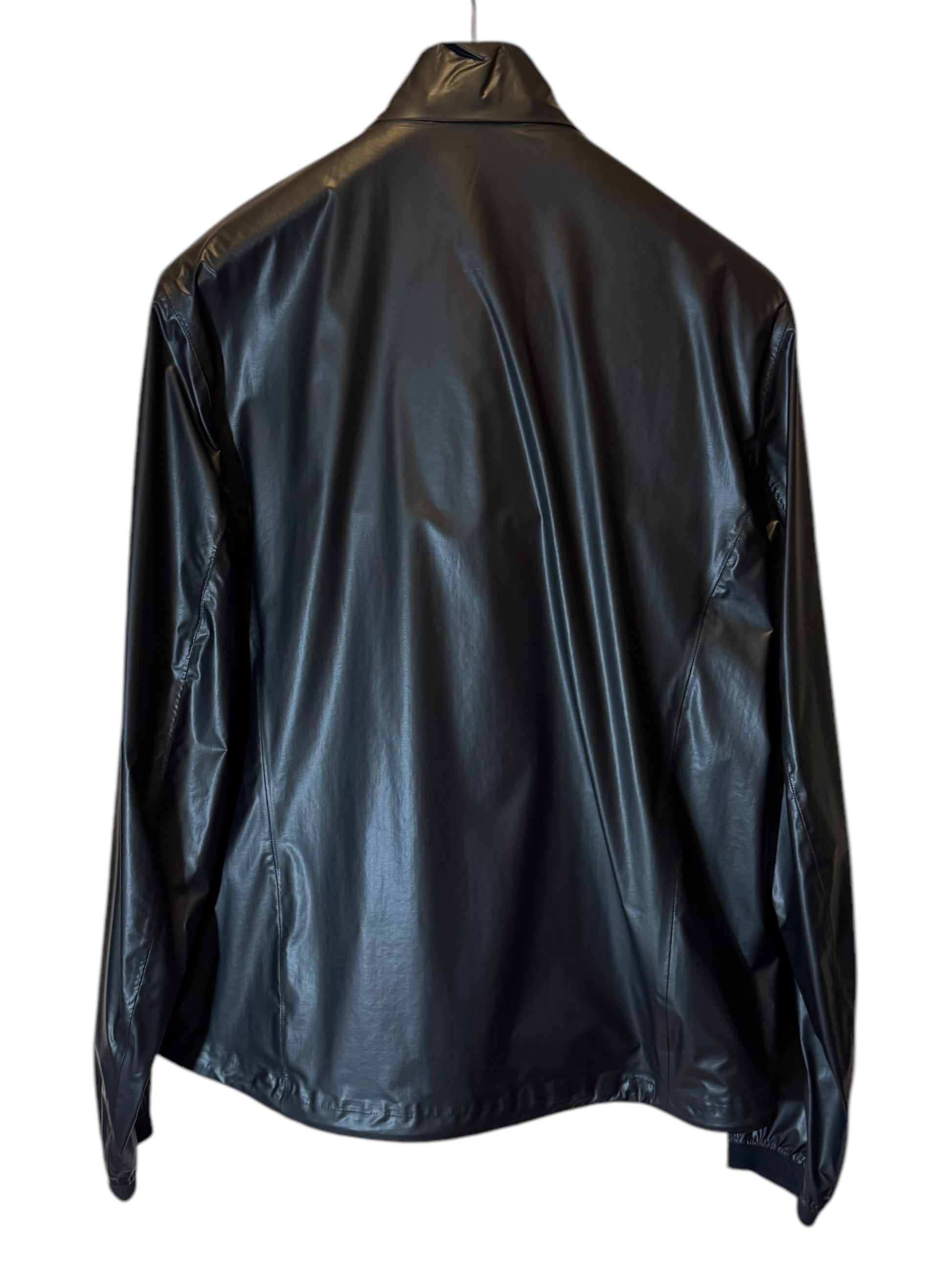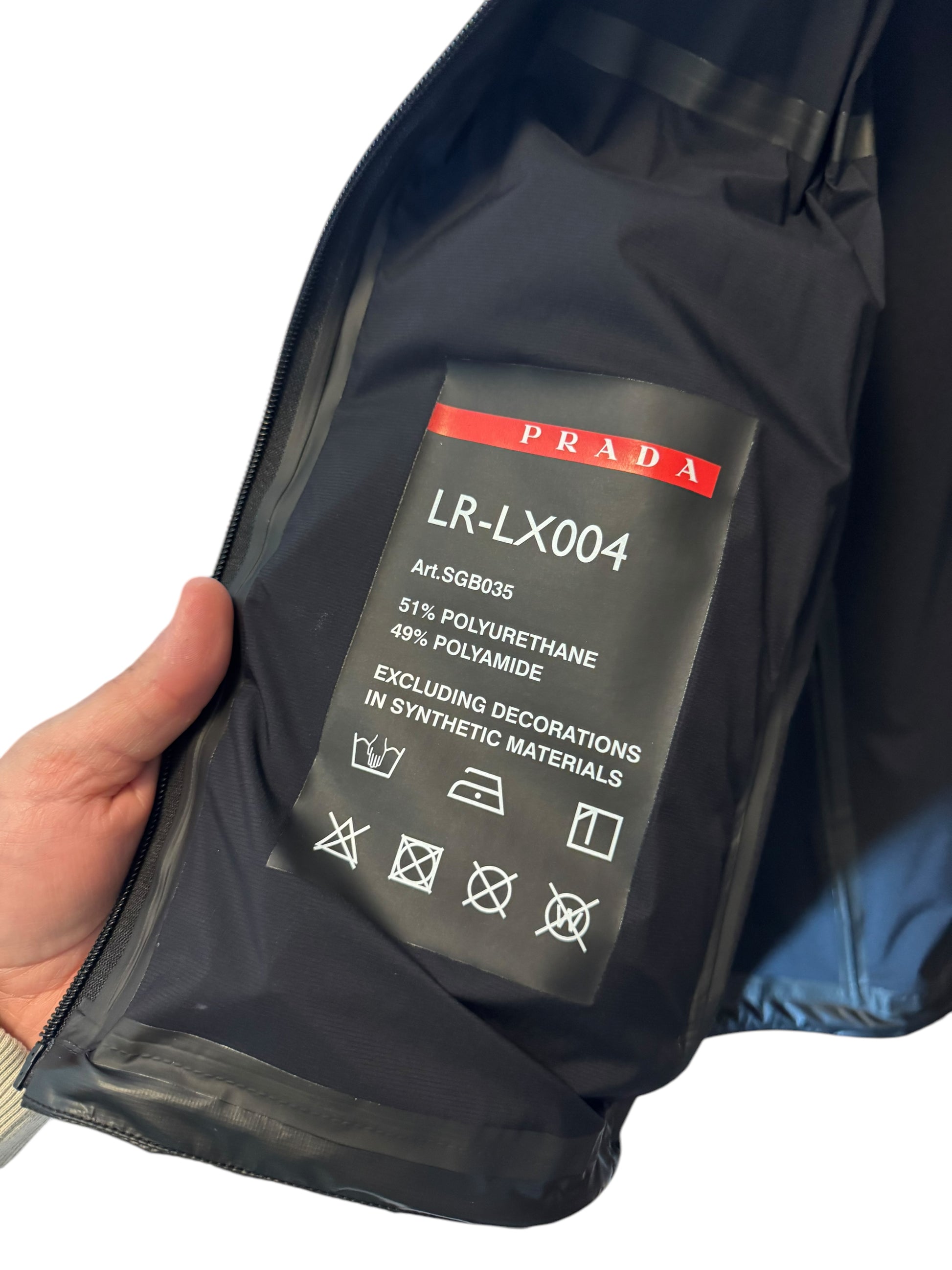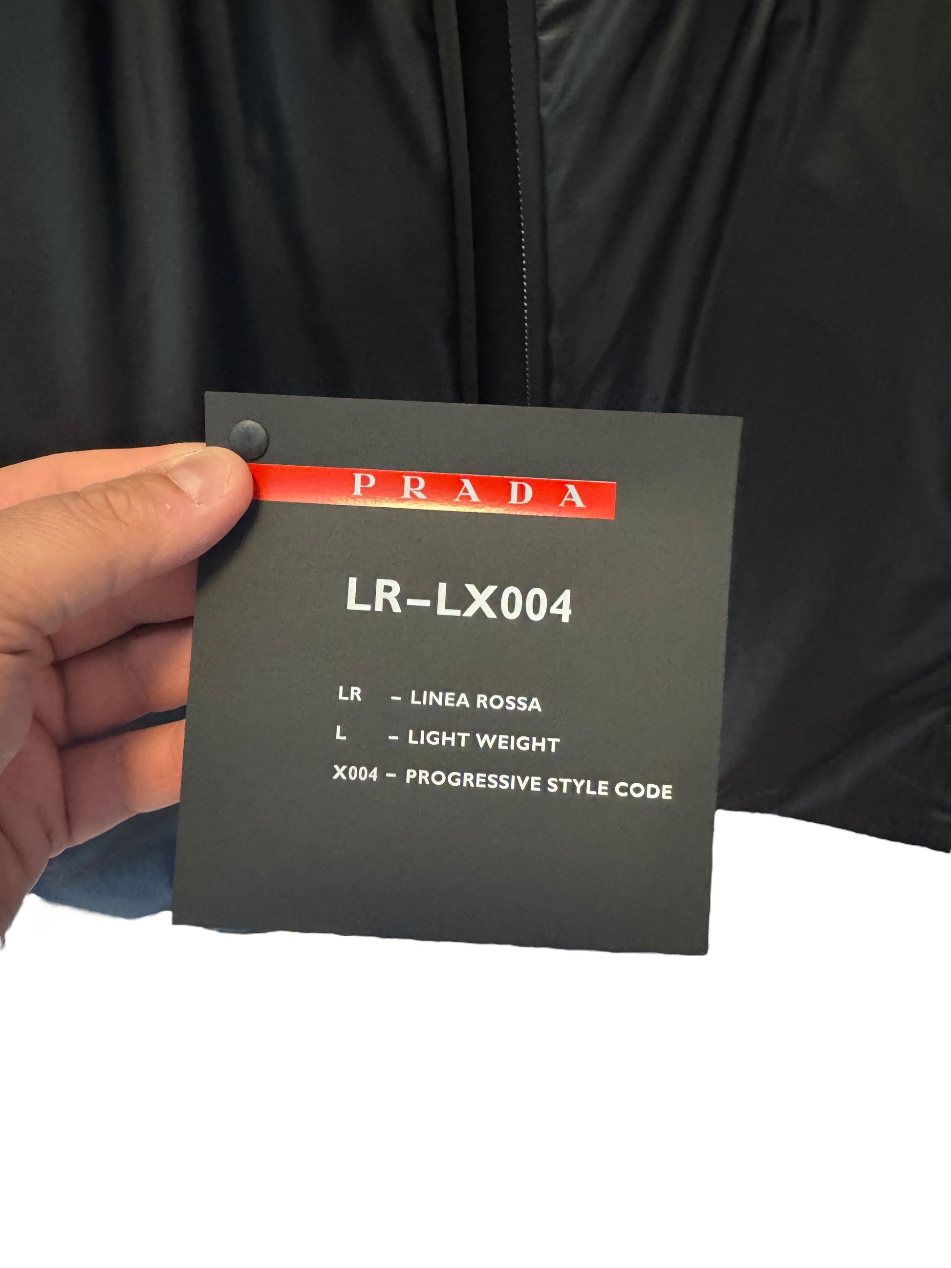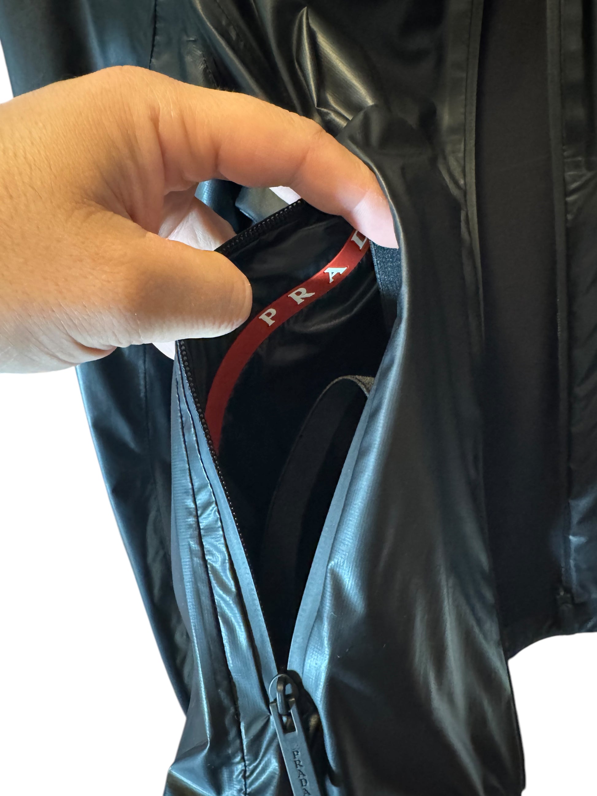 Giacca originale Prada Linea Rossa LR-LX004 da uomo, taglia 50 (corrispondente a una L). Articolo codice SGB035, colore nero, realizzato in tessuto tecnico nylon accoppiato (51% poliuretano, 49% poliammide).