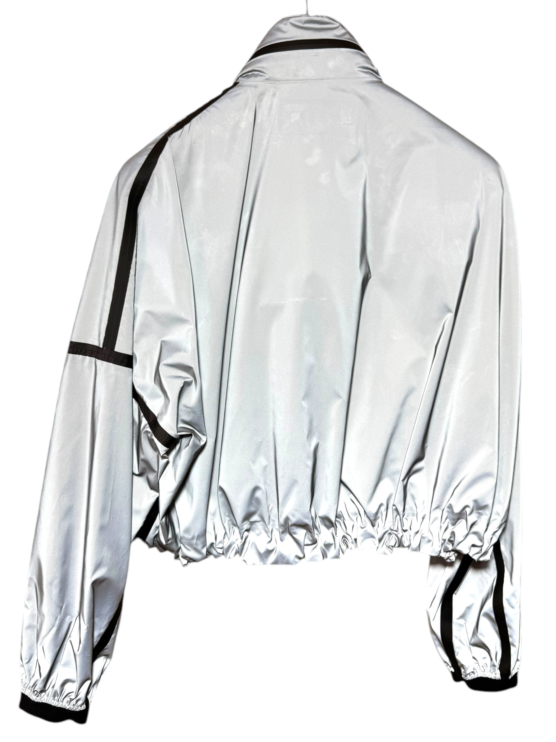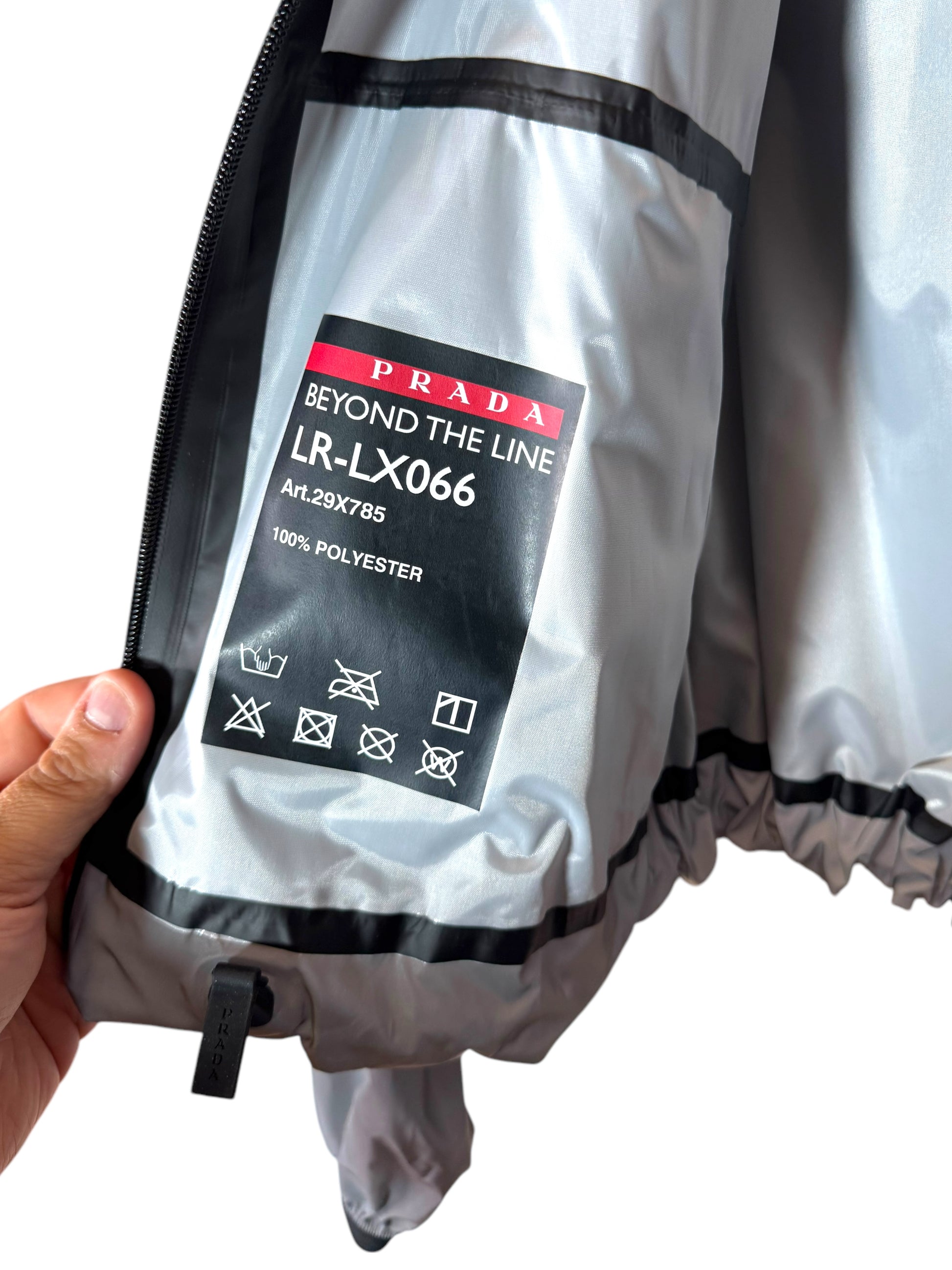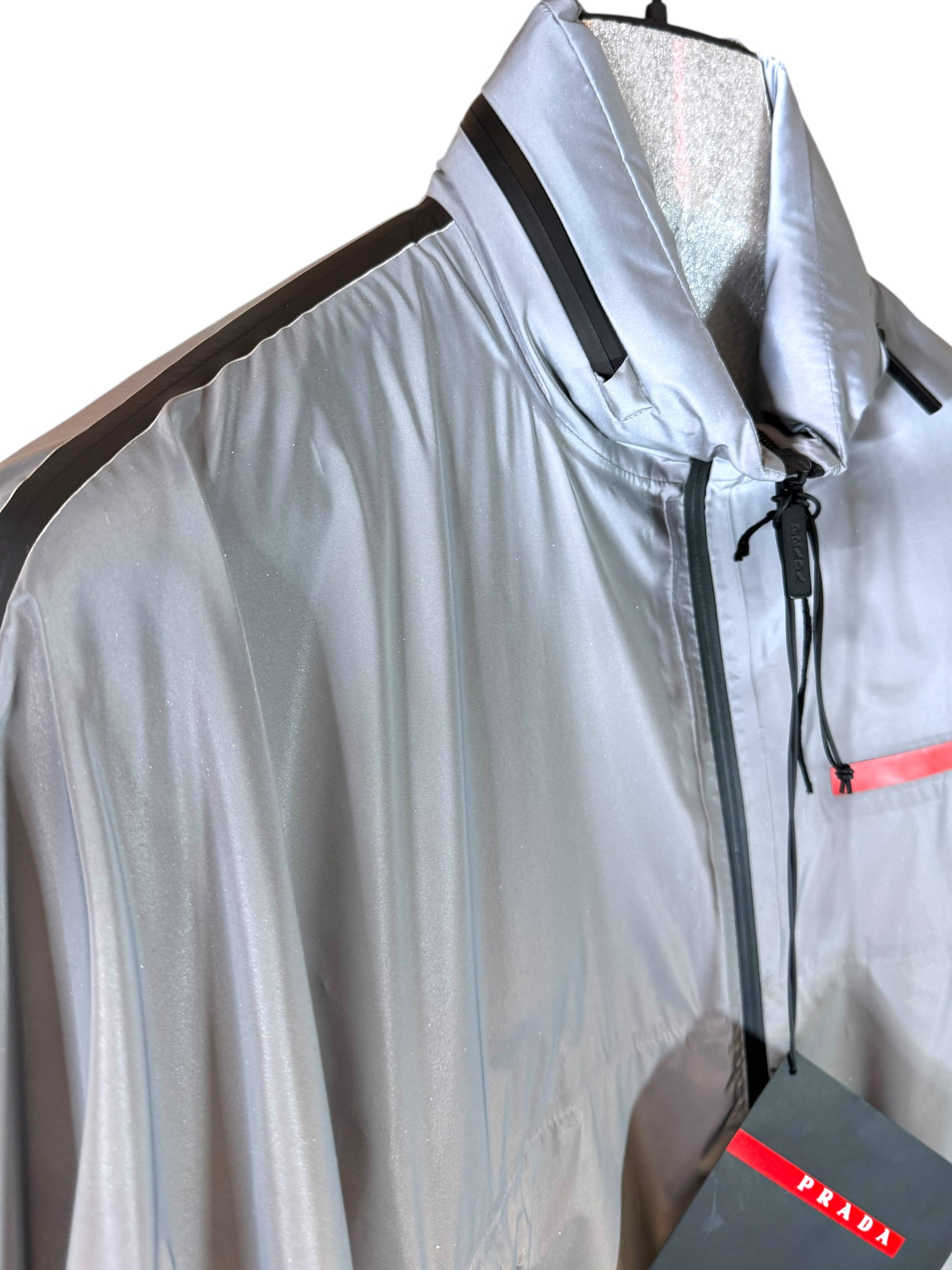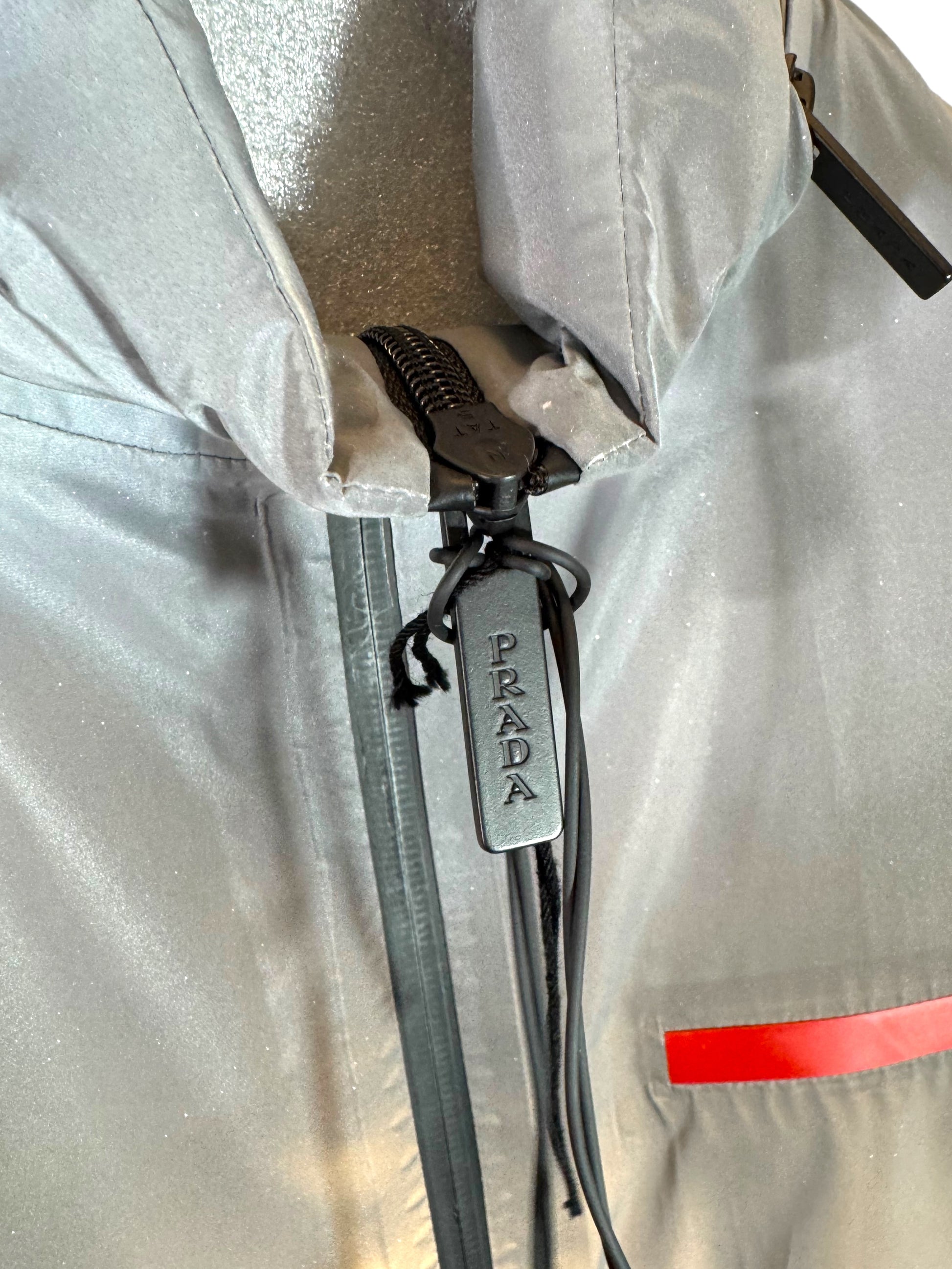 In vendita esclusiva giacca originale Prada Linea Rossa modello LR-LX066 appartenente alla collezione “Beyond the Line”. Capo tecnico e leggero, realizzato in nylon riflettente con micro-sfere di vetro che brillano alla luce. Taglia L.