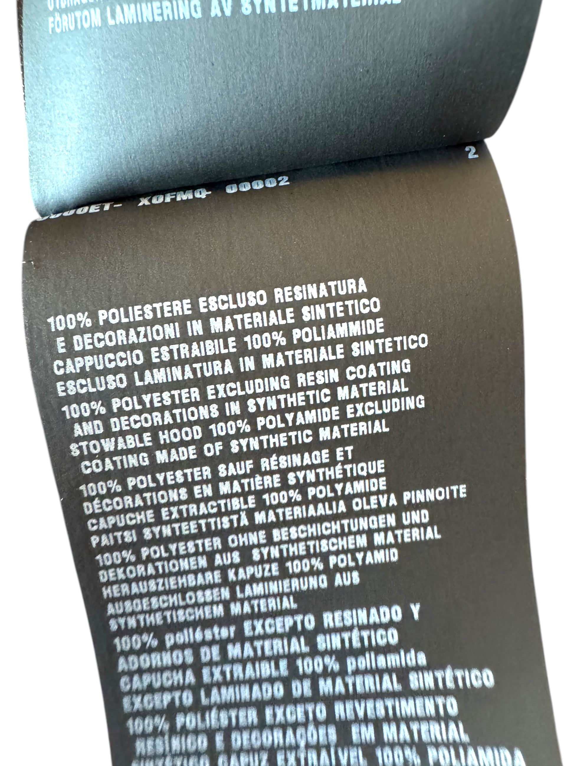 - Tessuto: 100% poliestere con cappuccio removibile in poliammide