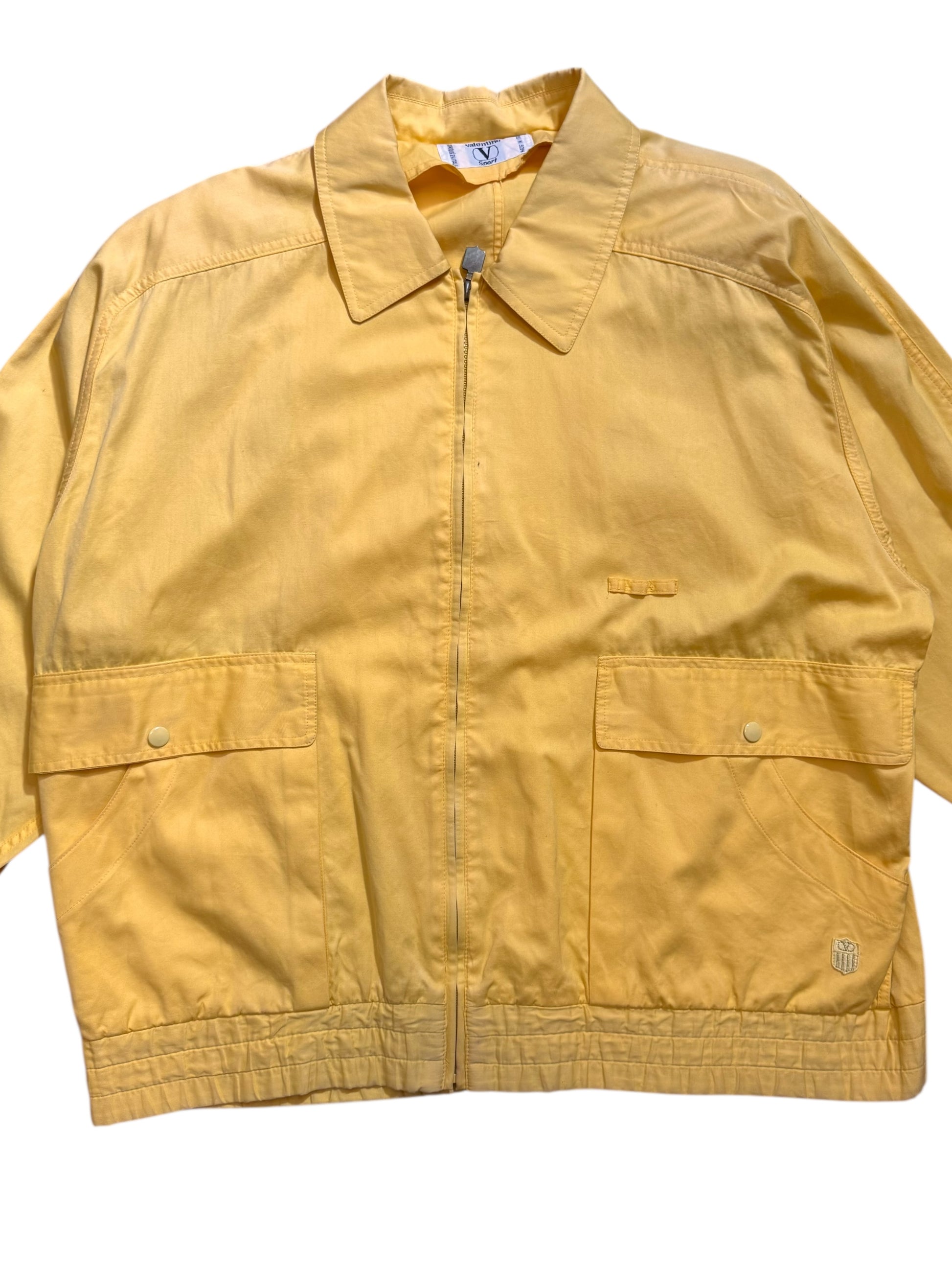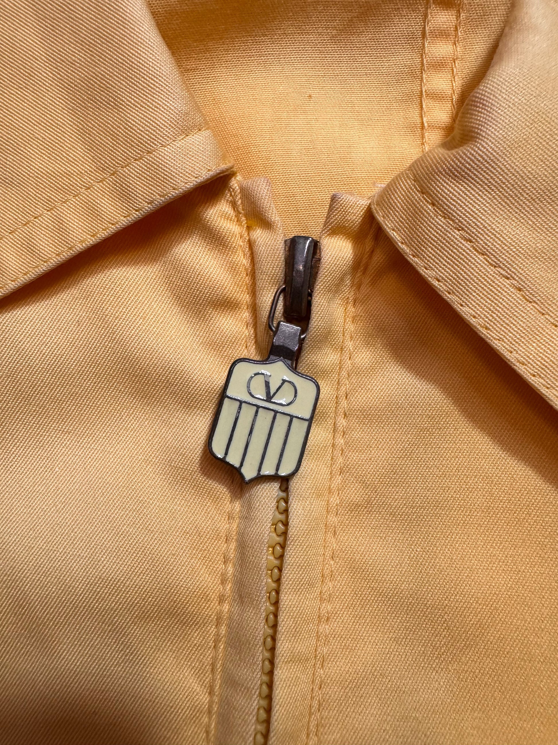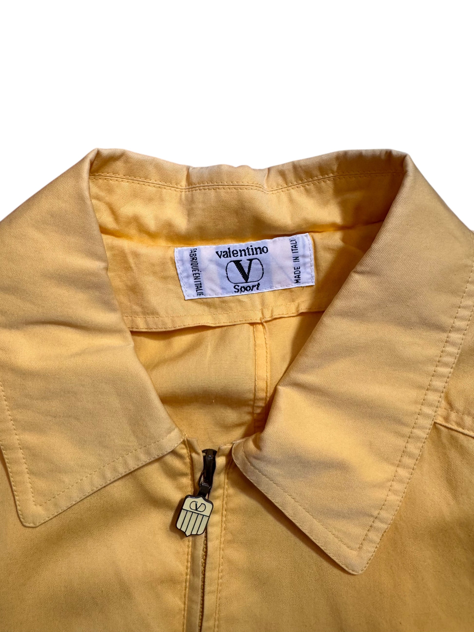 Giacca Valentino Sport da uomo, colore giallo senape, realizzata in Italia. Modello leggero in 100% cotone, con chiusura frontale a zip, colletto classico e tasche frontali con patta e bottone automatico. Dettagli iconici Valentino, tra cui zip personalizzata e stemma ricamato sul petto. Capo di qualità, tipico della linea sportiva vintage del brand.