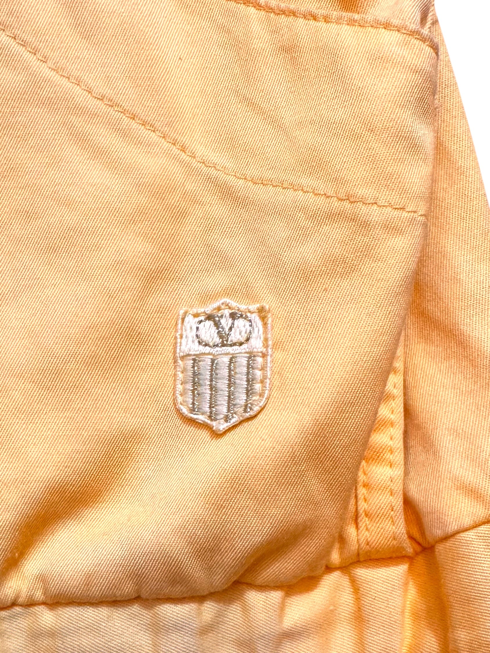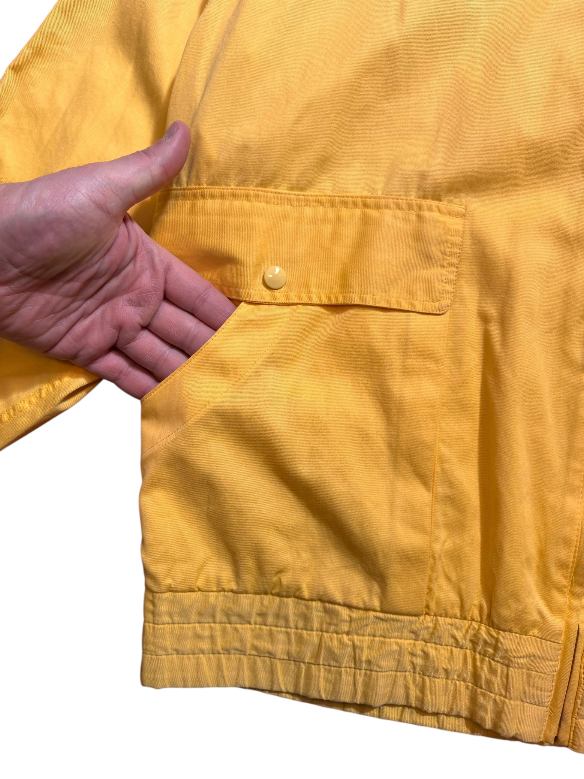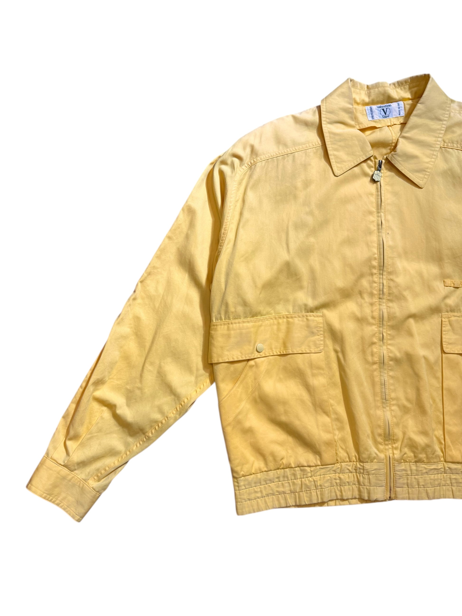 Giacca Valentino Sport da uomo, colore giallo senape, realizzata in Italia. Modello leggero in 100% cotone, con chiusura frontale a zip, colletto classico e tasche frontali con patta e bottone automatico. Dettagli iconici Valentino, tra cui zip personalizzata e stemma ricamato sul petto. Capo di qualità, tipico della linea sportiva vintage del brand.