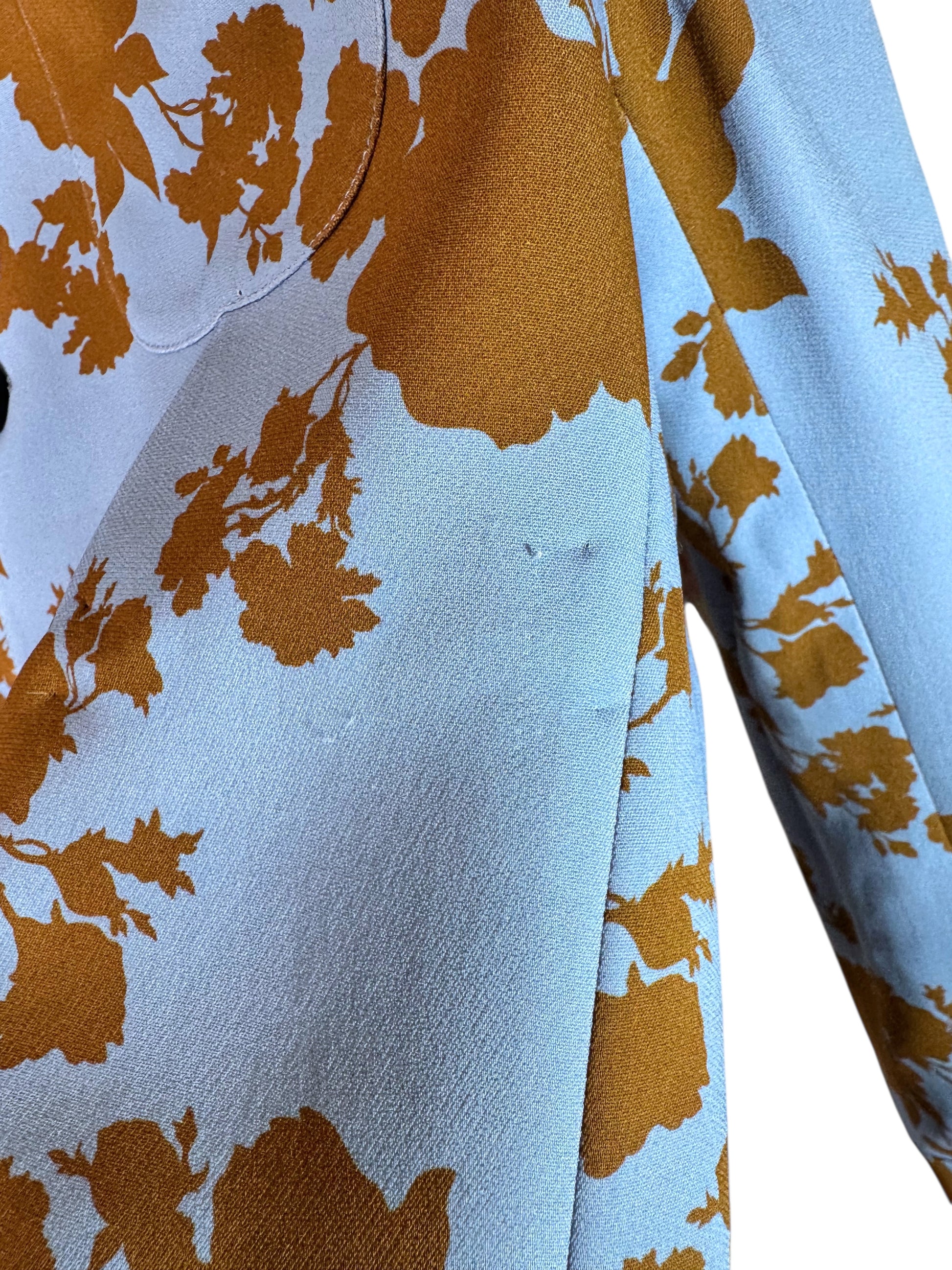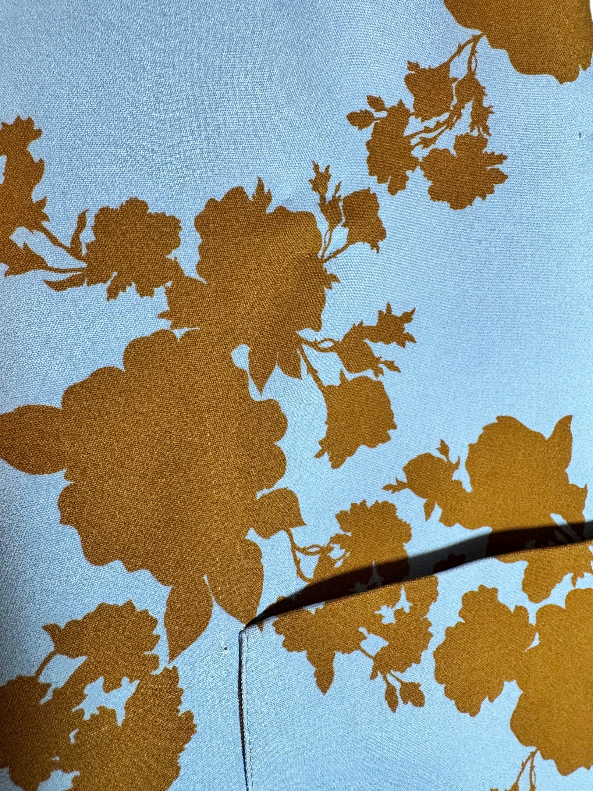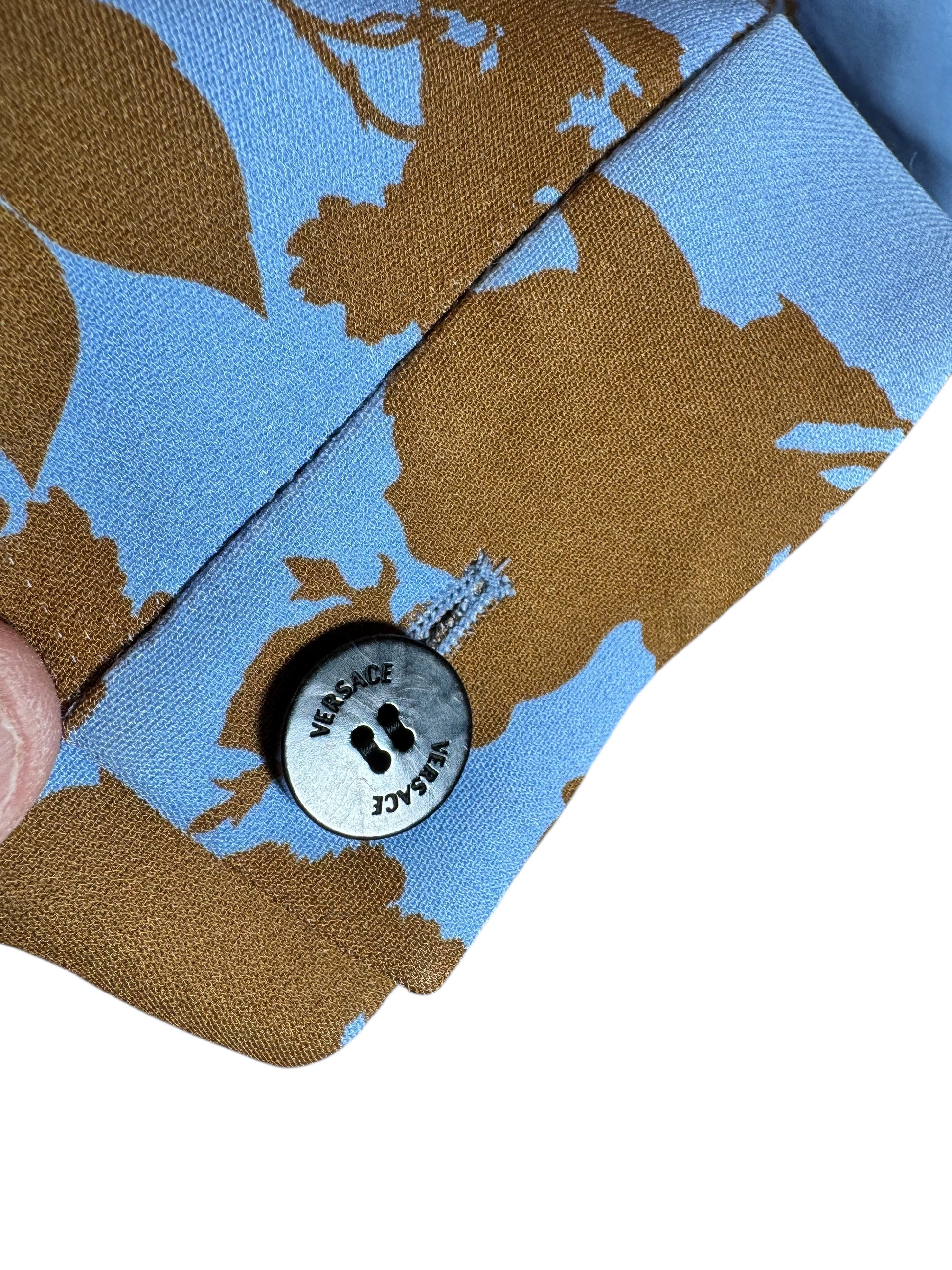 Giacca Versace Made in Italy dal design elegante e contemporaneo, caratterizzata da una base azzurra con stampa floreale color caramello a contrasto. Realizzata in tessuto morbido e fluido con fodera interna in raso. Presenta chiusura frontale con bottoni, tasche laterali a filetto e taschino sul petto con patch in pelle “VERSACE”. Bottoni neri con logo inciso.