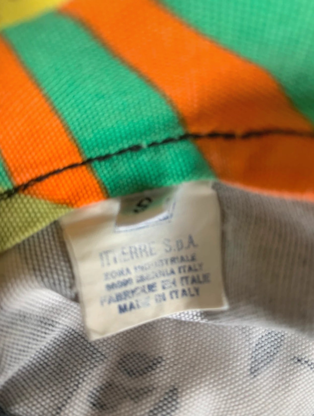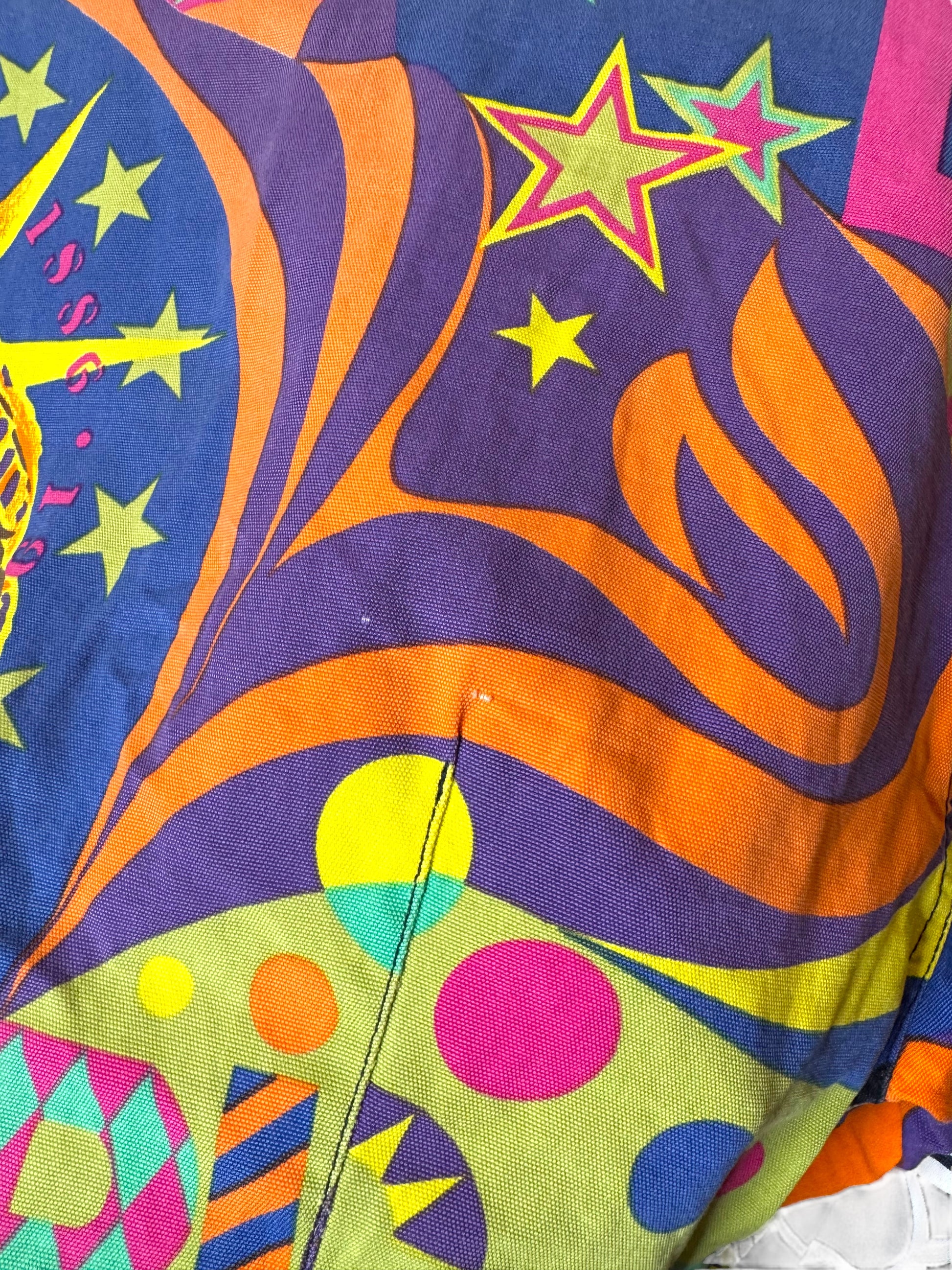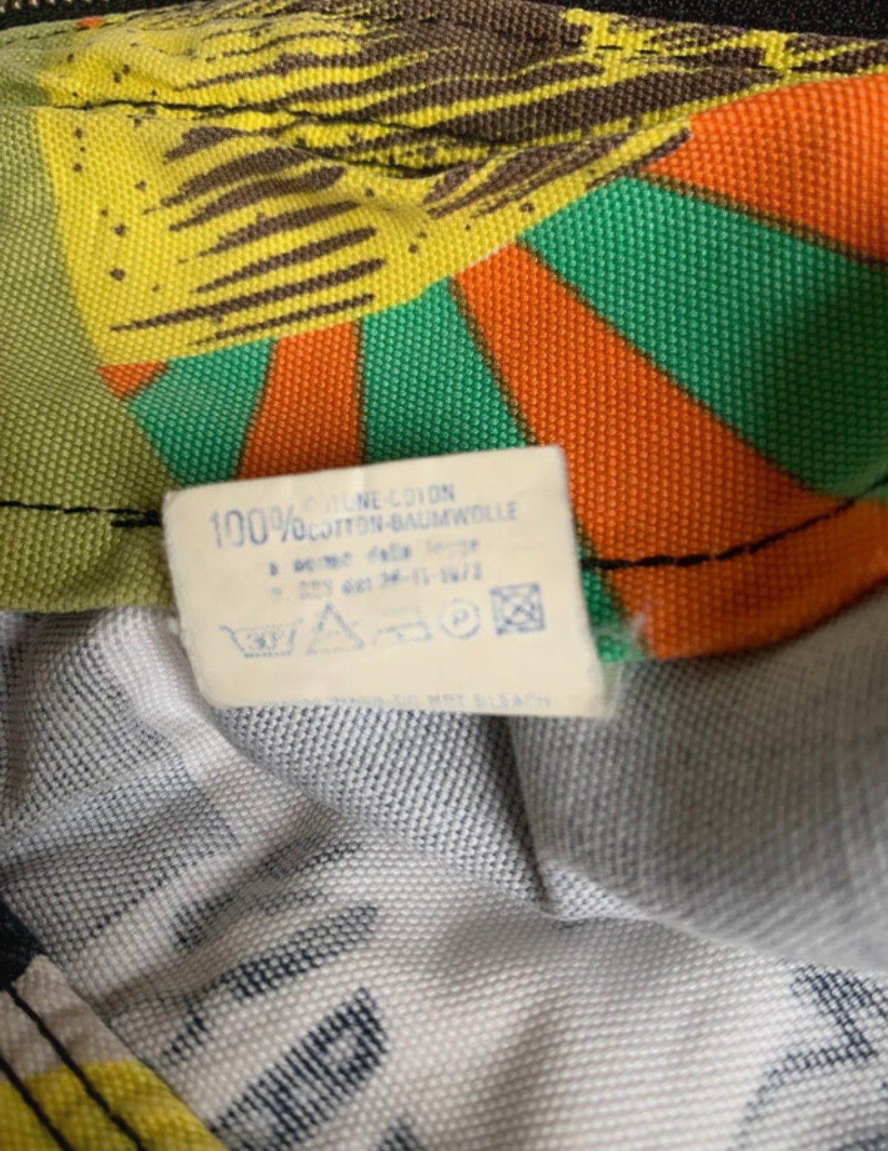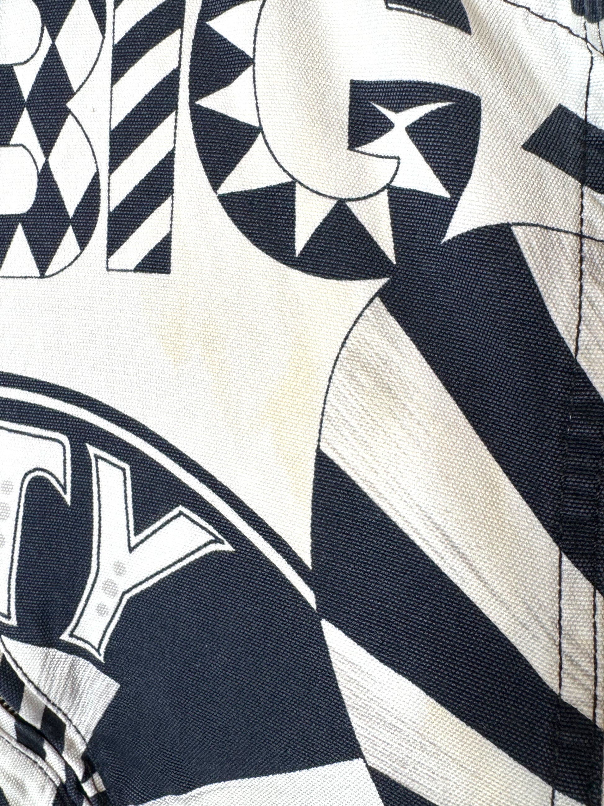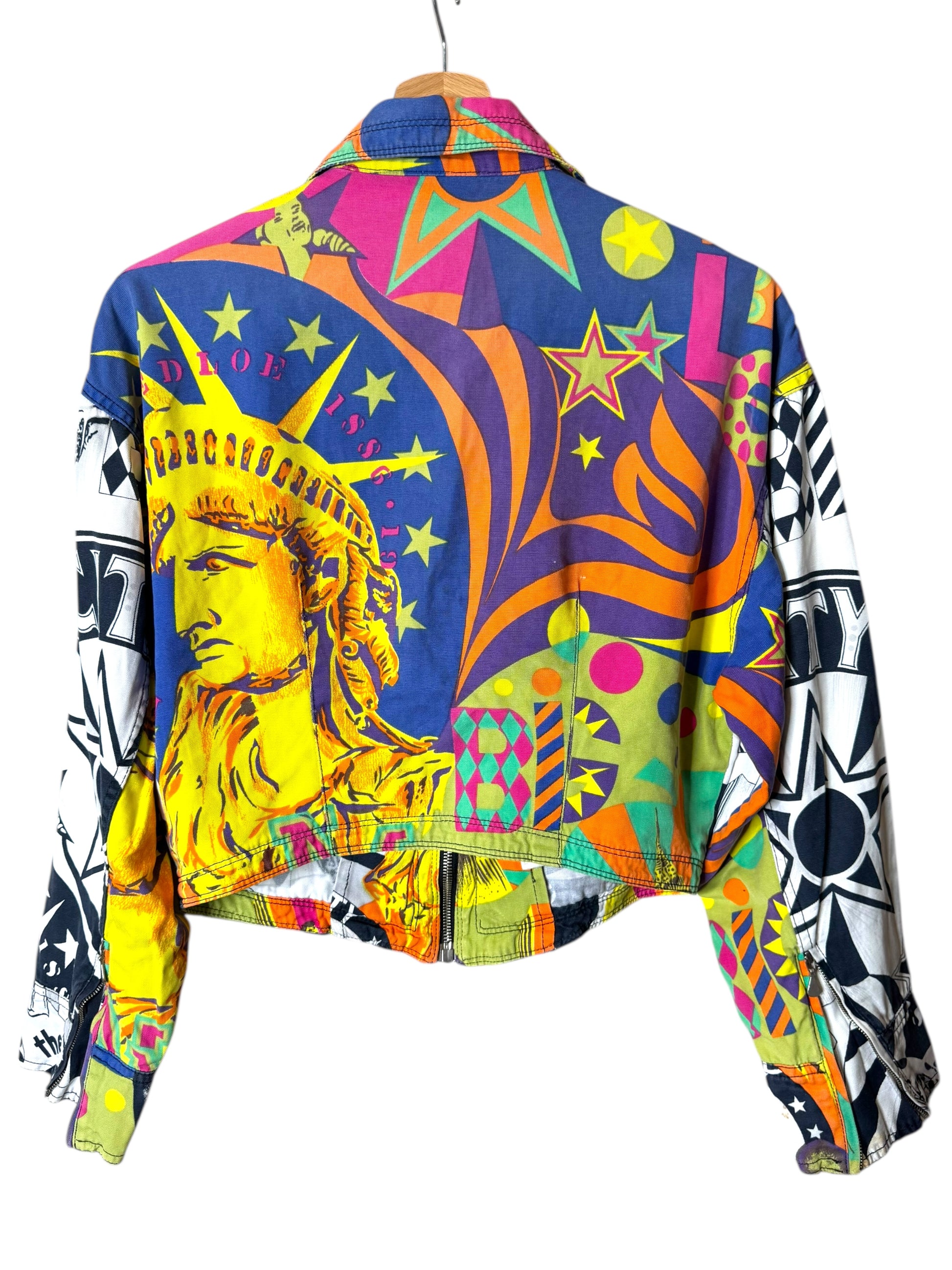 Rara giacca vintage Versace Jeans Couture anni ‘90 con grafica “New York City” e Statua della Libertà, realizzata in Italia. Un pezzo iconico d’archivio con stampa all-over in stile pop-art, dai colori forti e dal forte impatto visivo. Il taglio è cropped, con spalle molto larghe e maniche corte, tipico del design anni ’90.