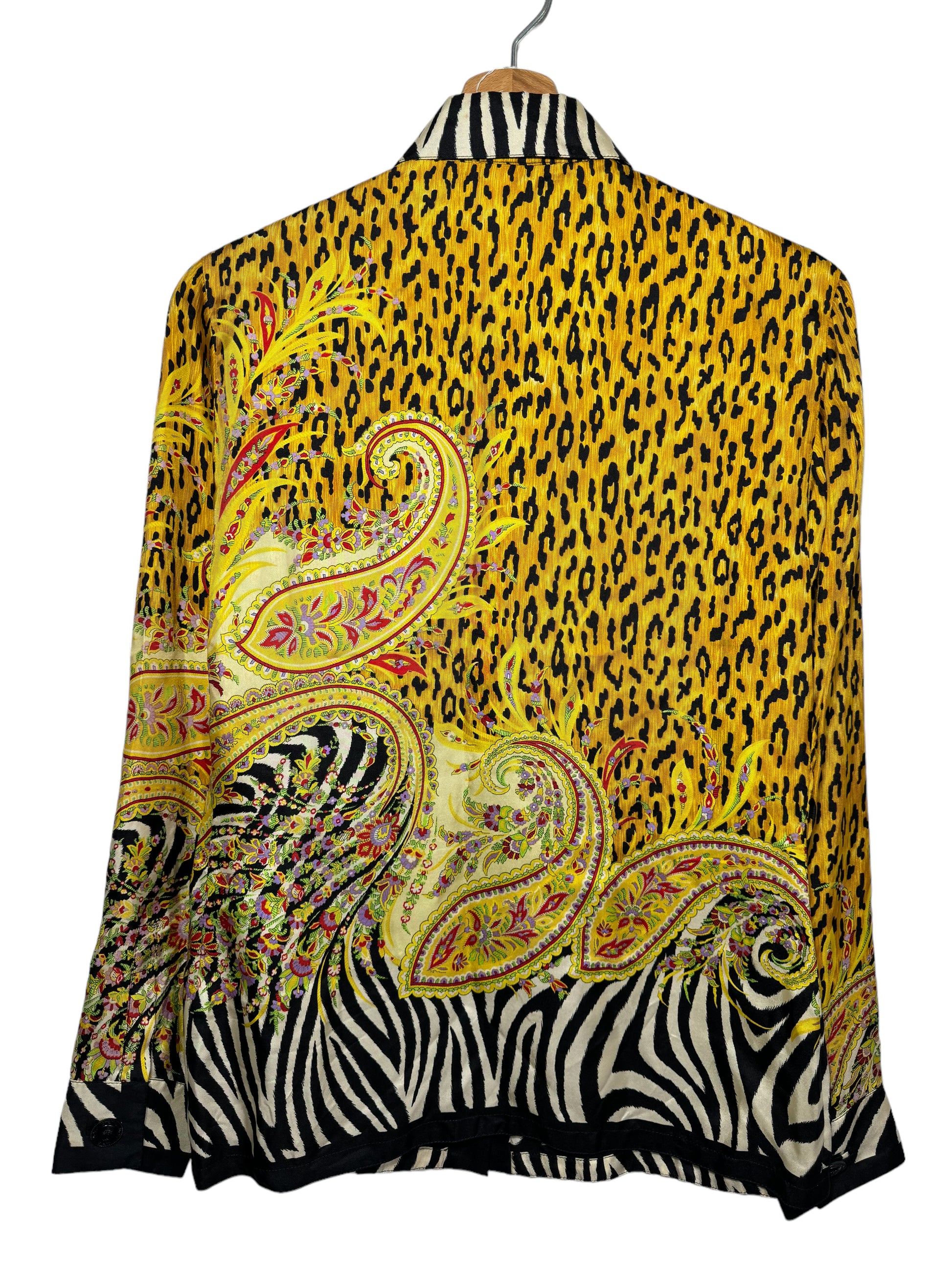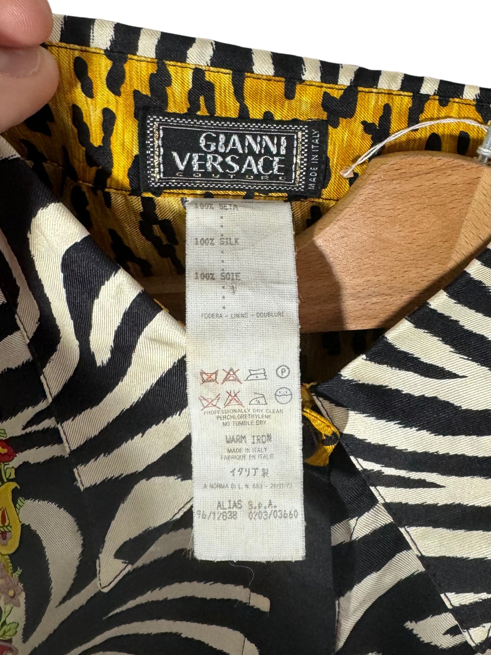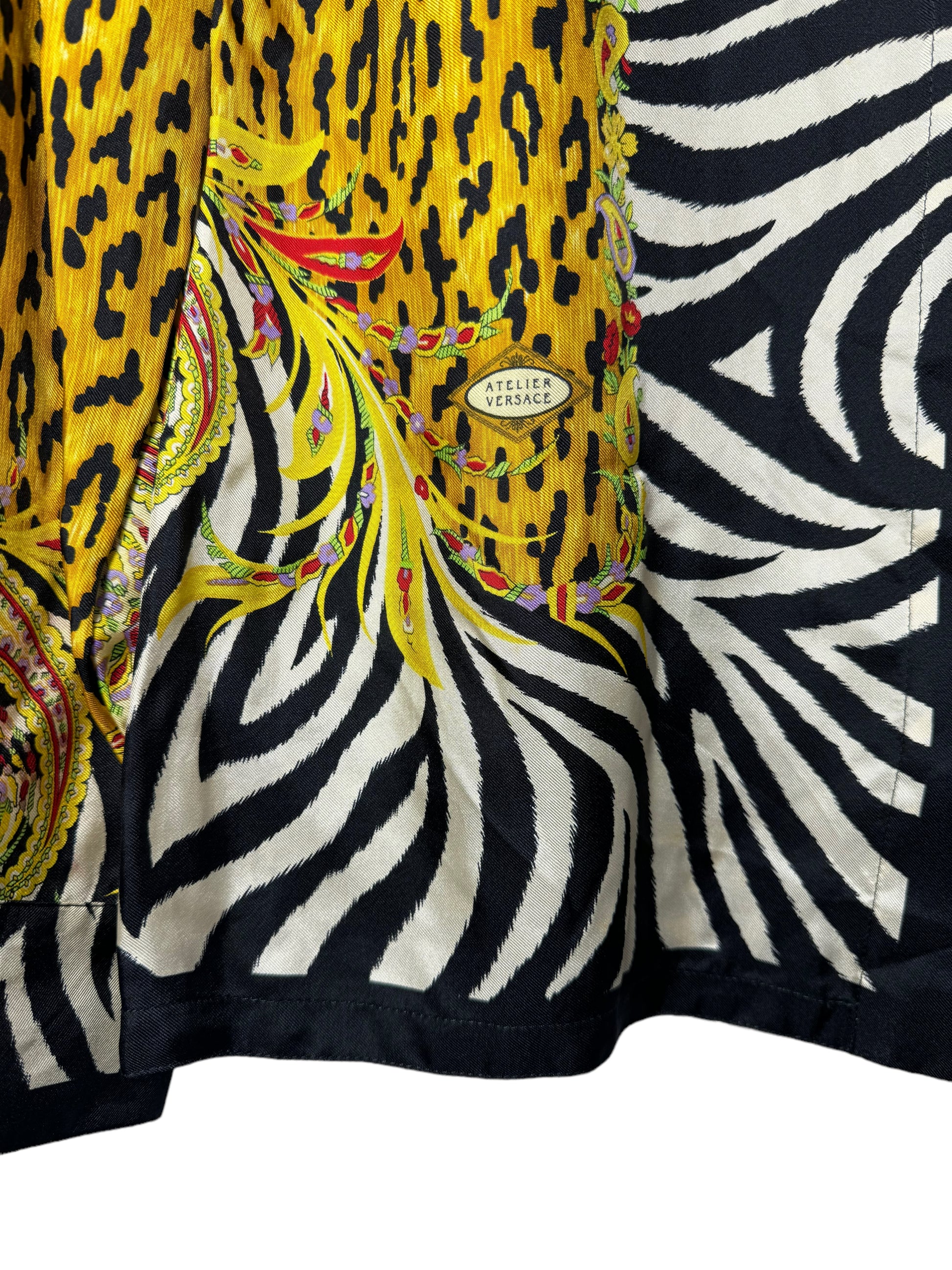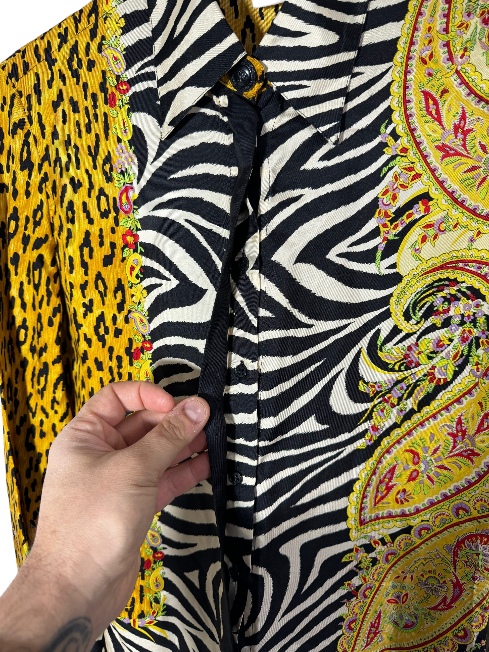 Gianni Versace camicia in seta, vintage anni 90s. Stampa animalier zebra e leopardo con decorazioni paisleys.