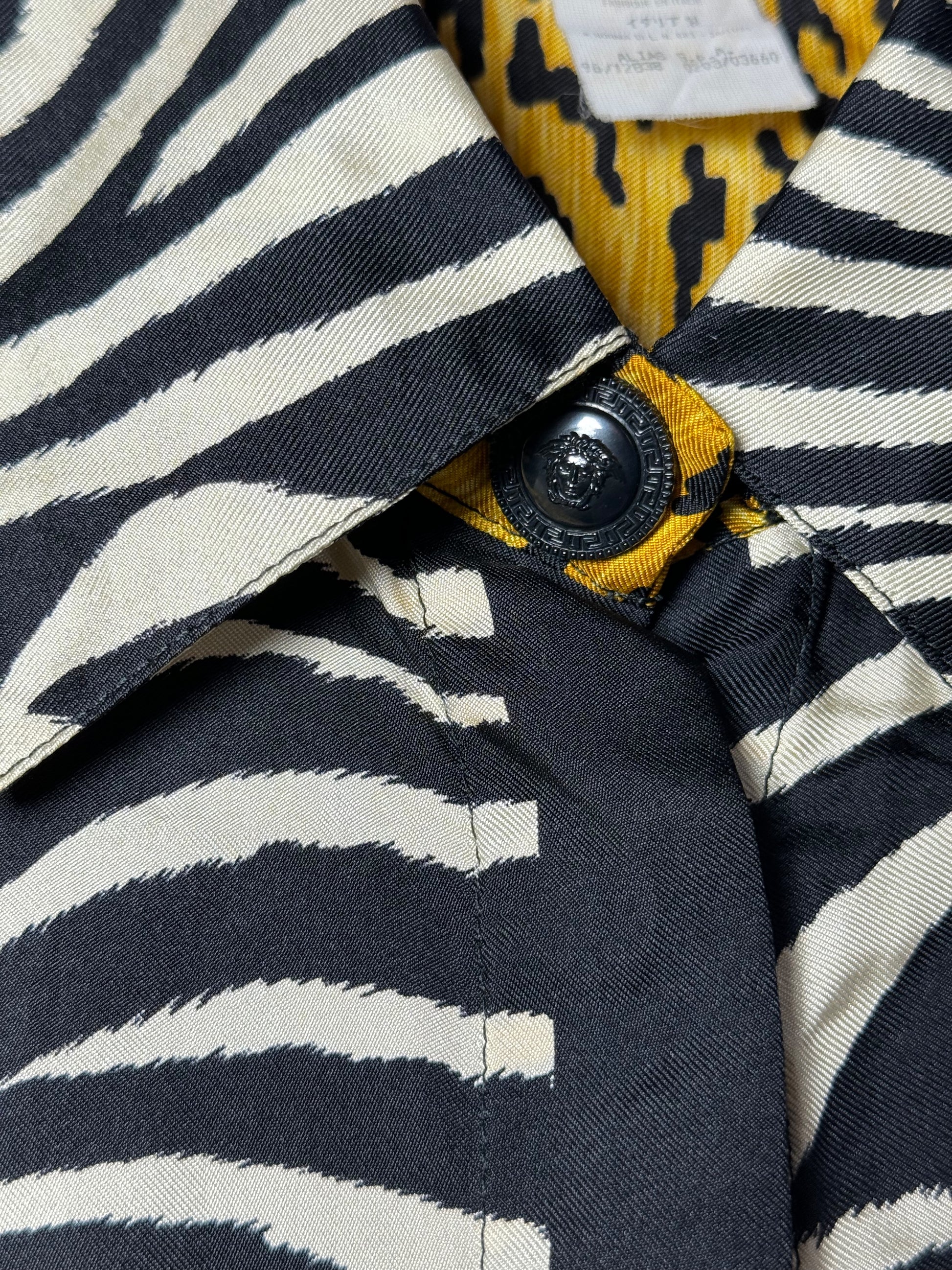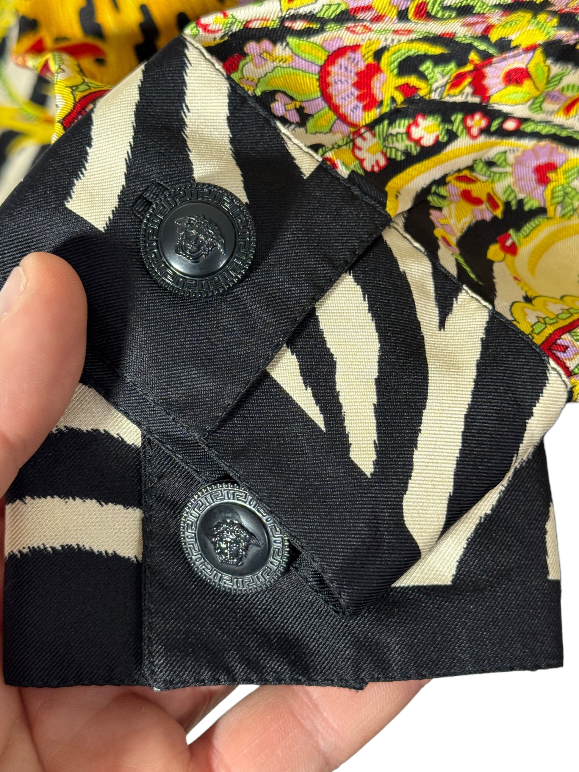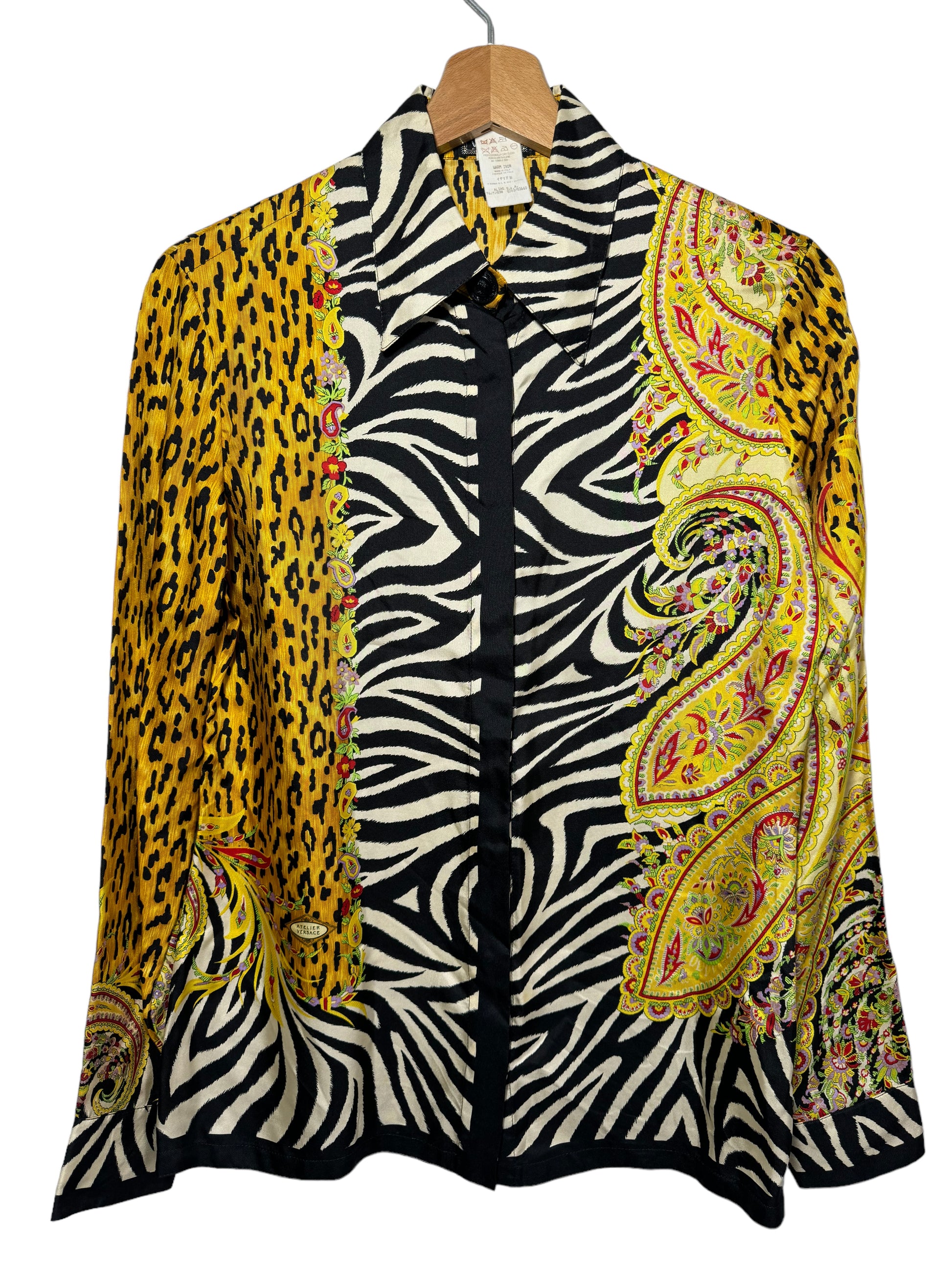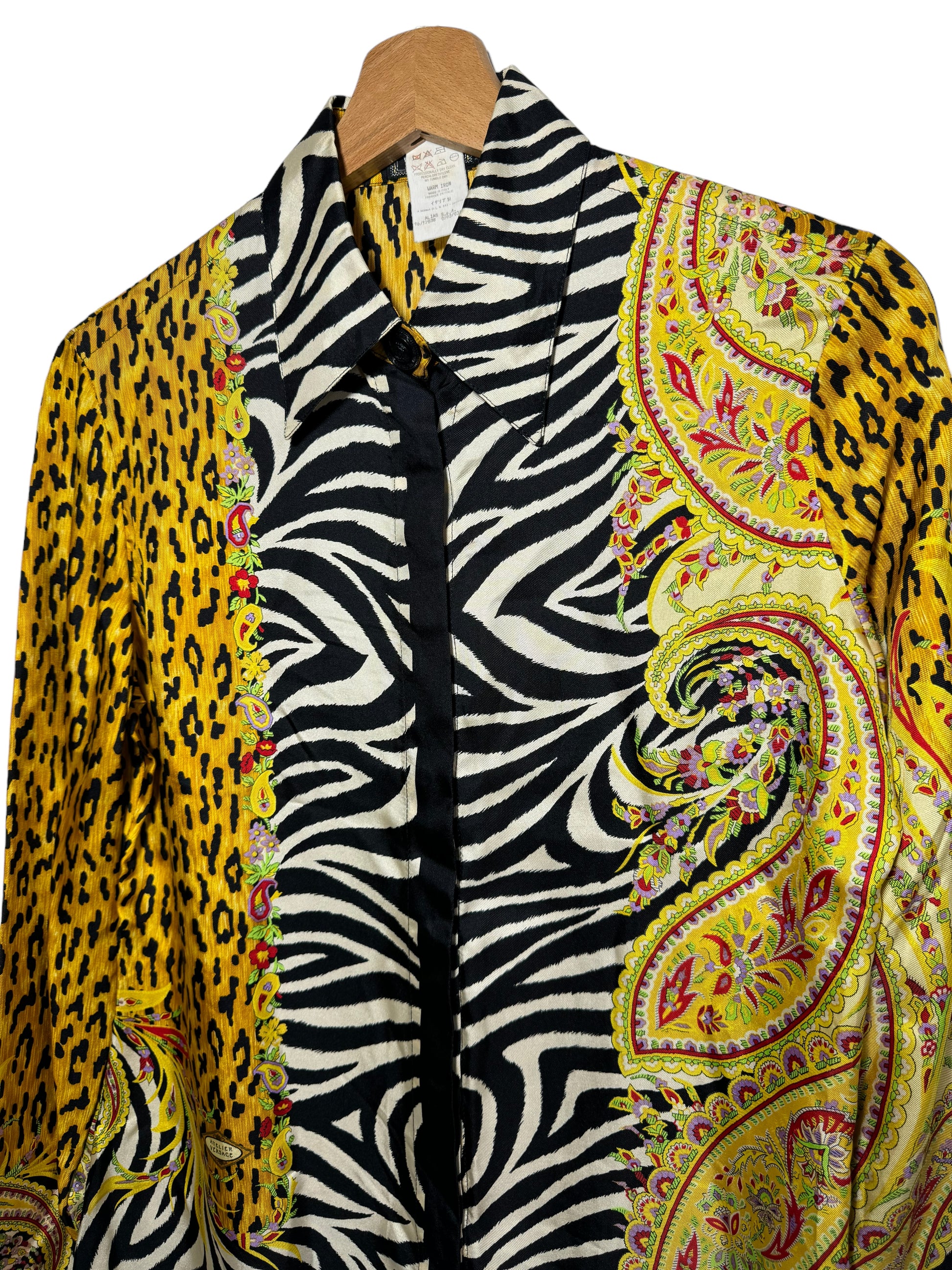 Gianni Versace camicia in seta, vintage anni 90s. Stampa animalier zebra e leopardo con decorazioni paisleys.
