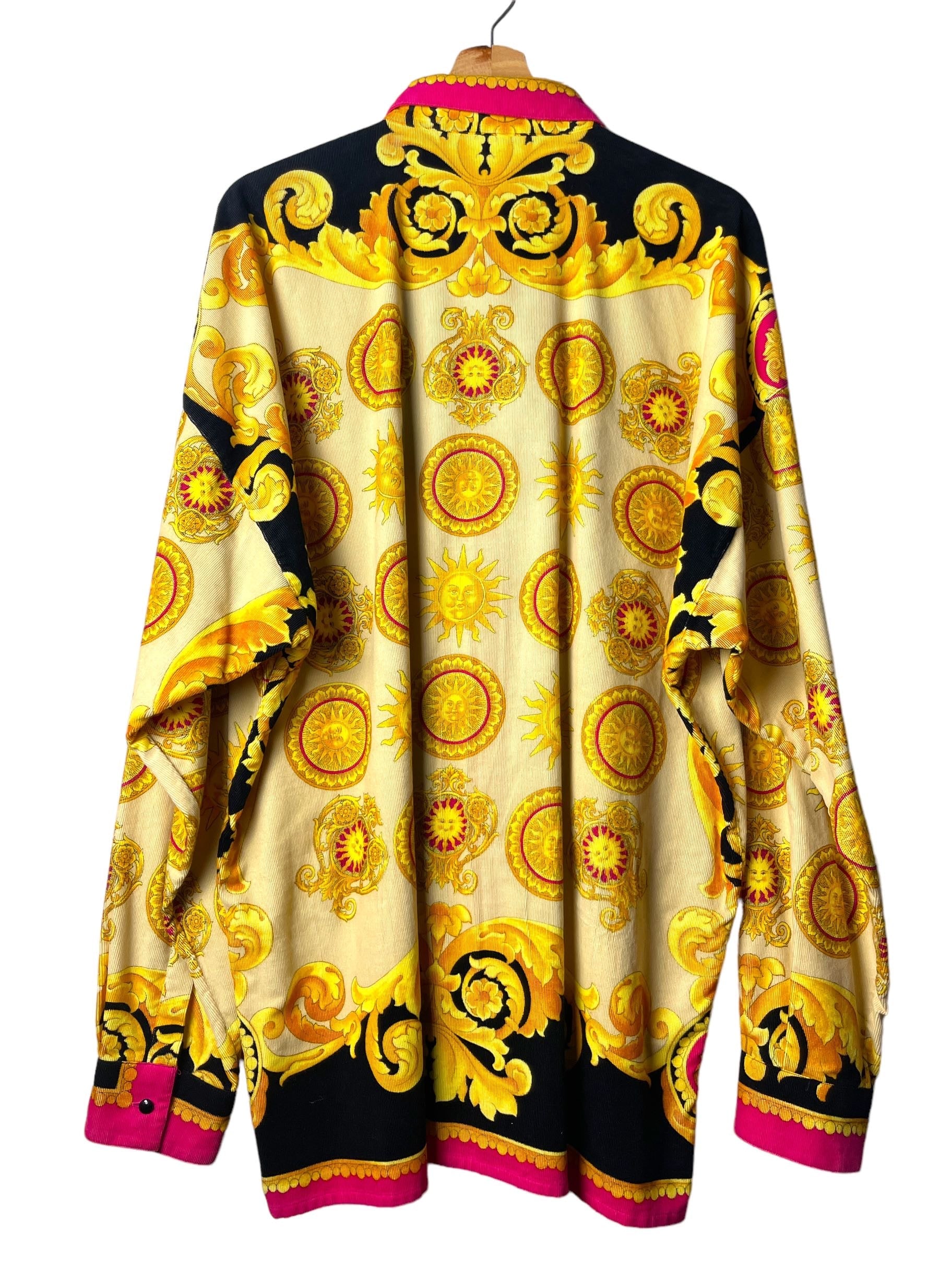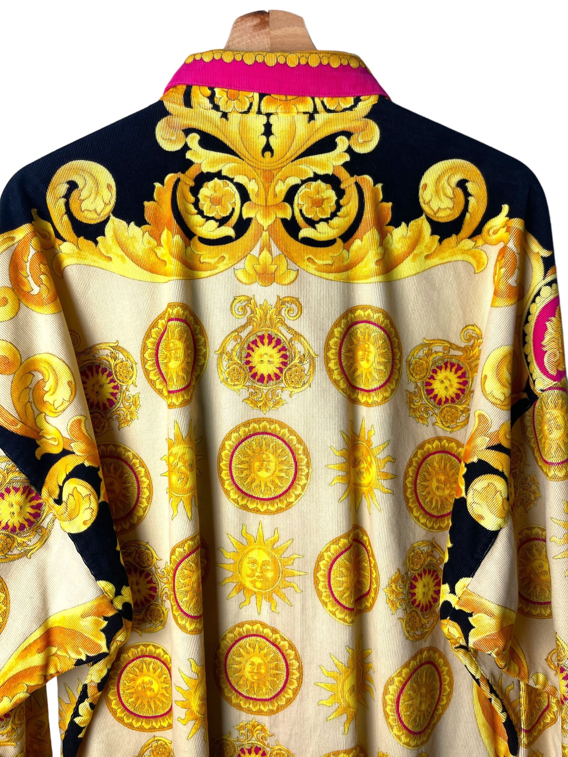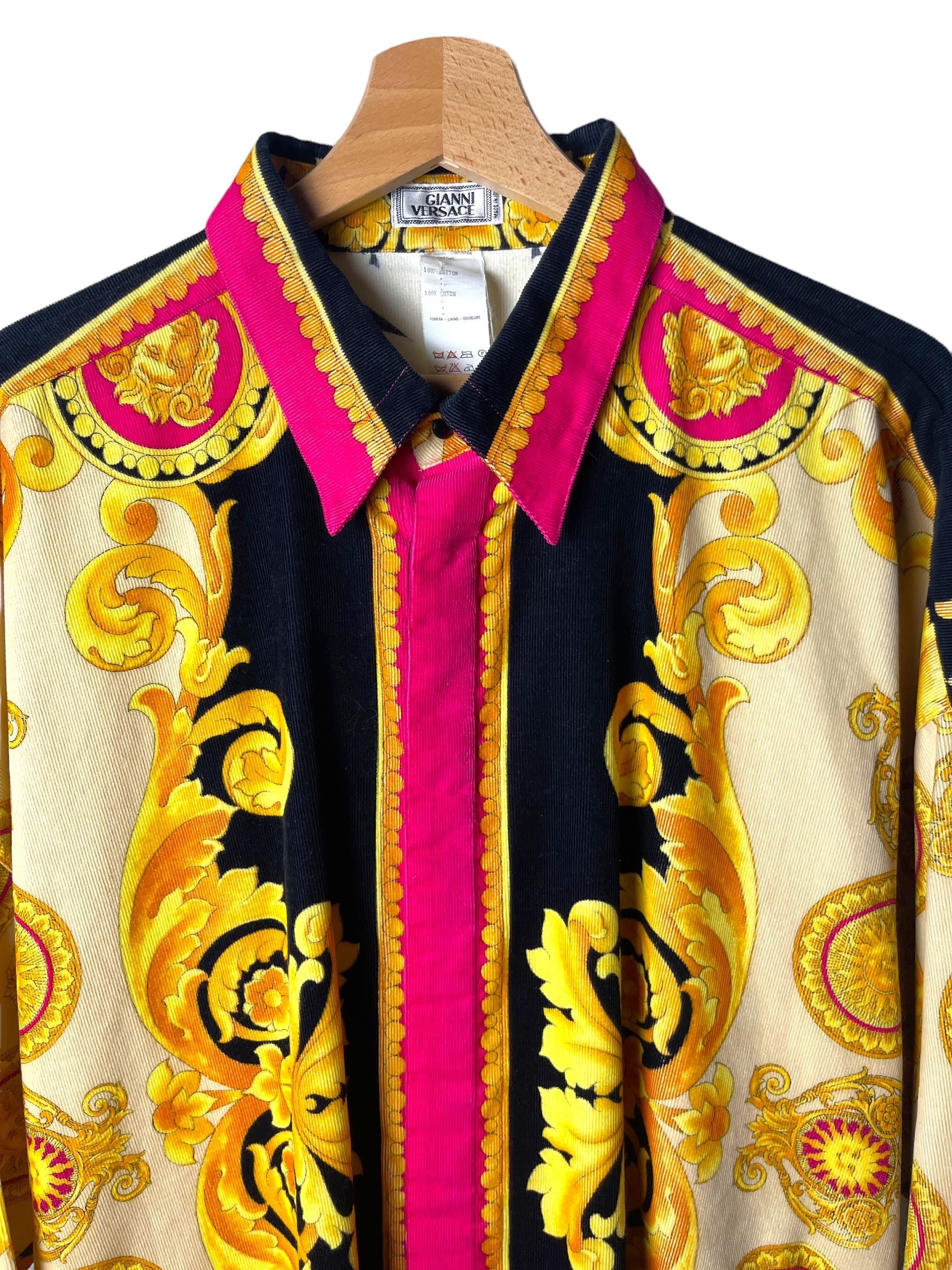 Gianni Versace camicia vintage anni 90s in velluto a costine, con stampa barocca e soli.
